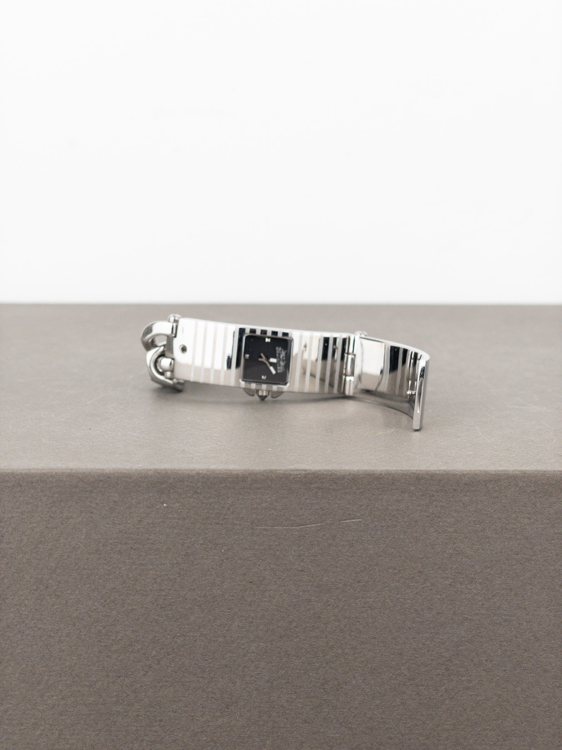 Silver-colored wrist watch with black dial and branded casing, featuring a cuban link bracelet, from the 1990s.
