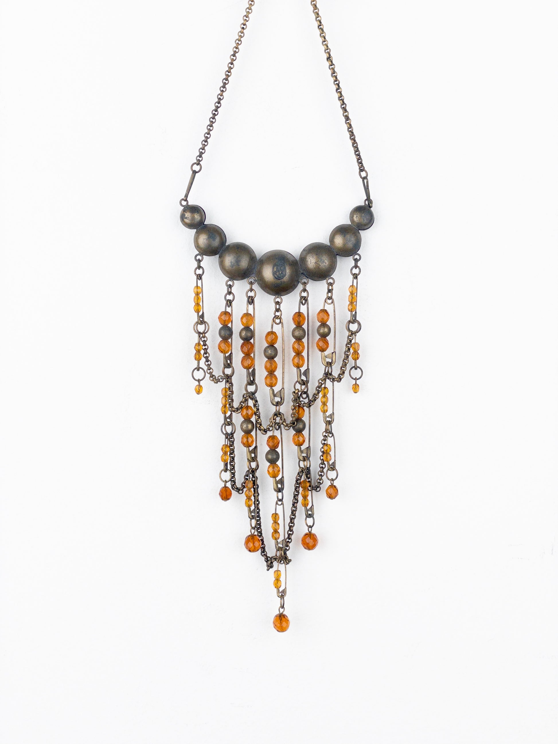 Large collier necklace in an oxidiced copper color, featuring an array of safety pins and geometrically cut beads in amber color, from the 1990s.