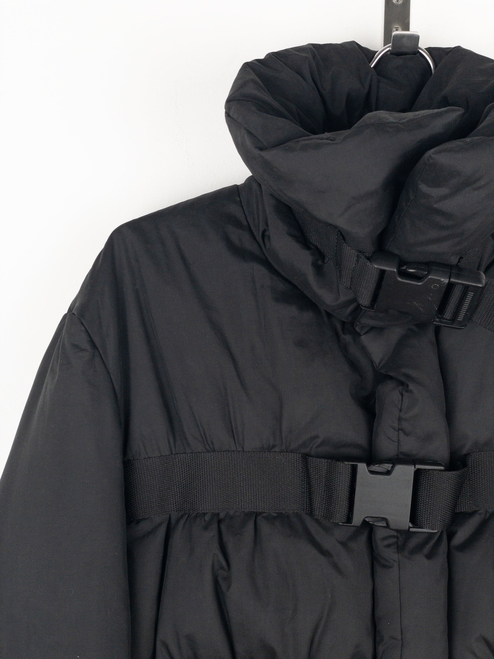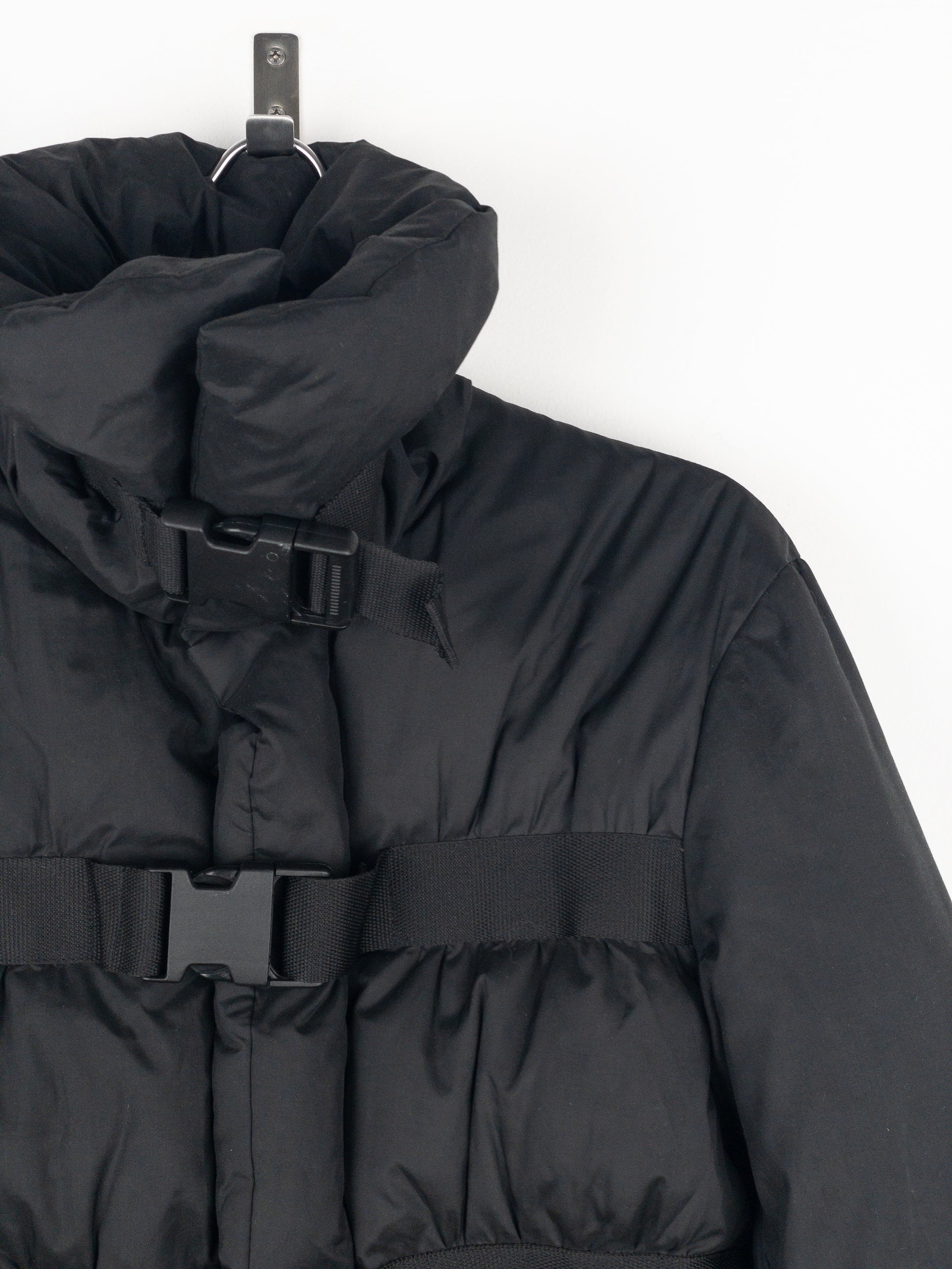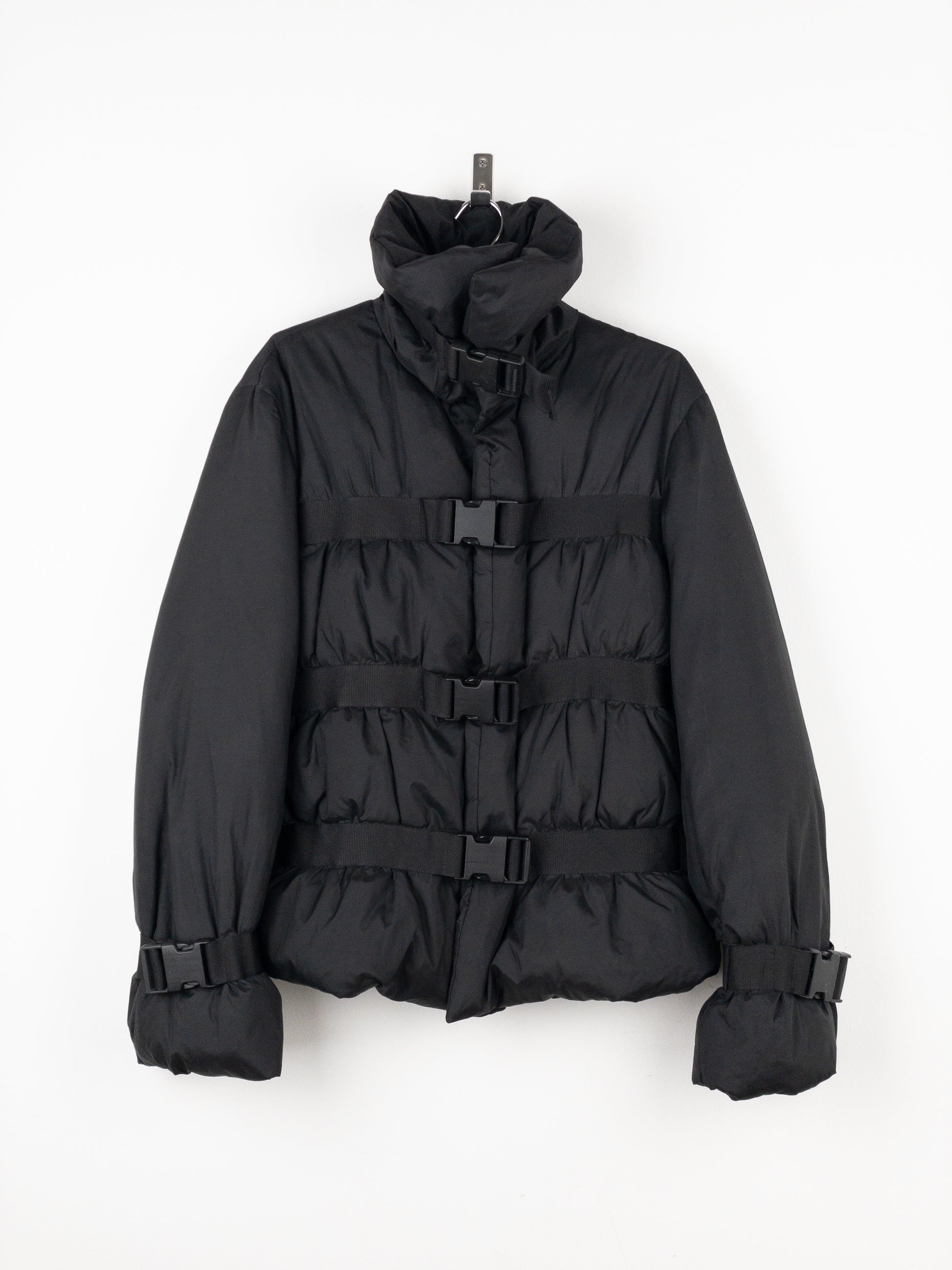 Black puffer jacket with buckled bondage straps around the body, neck, and wrists, creating the look of a straitjacket, from the autumn-winter 2003 collection.