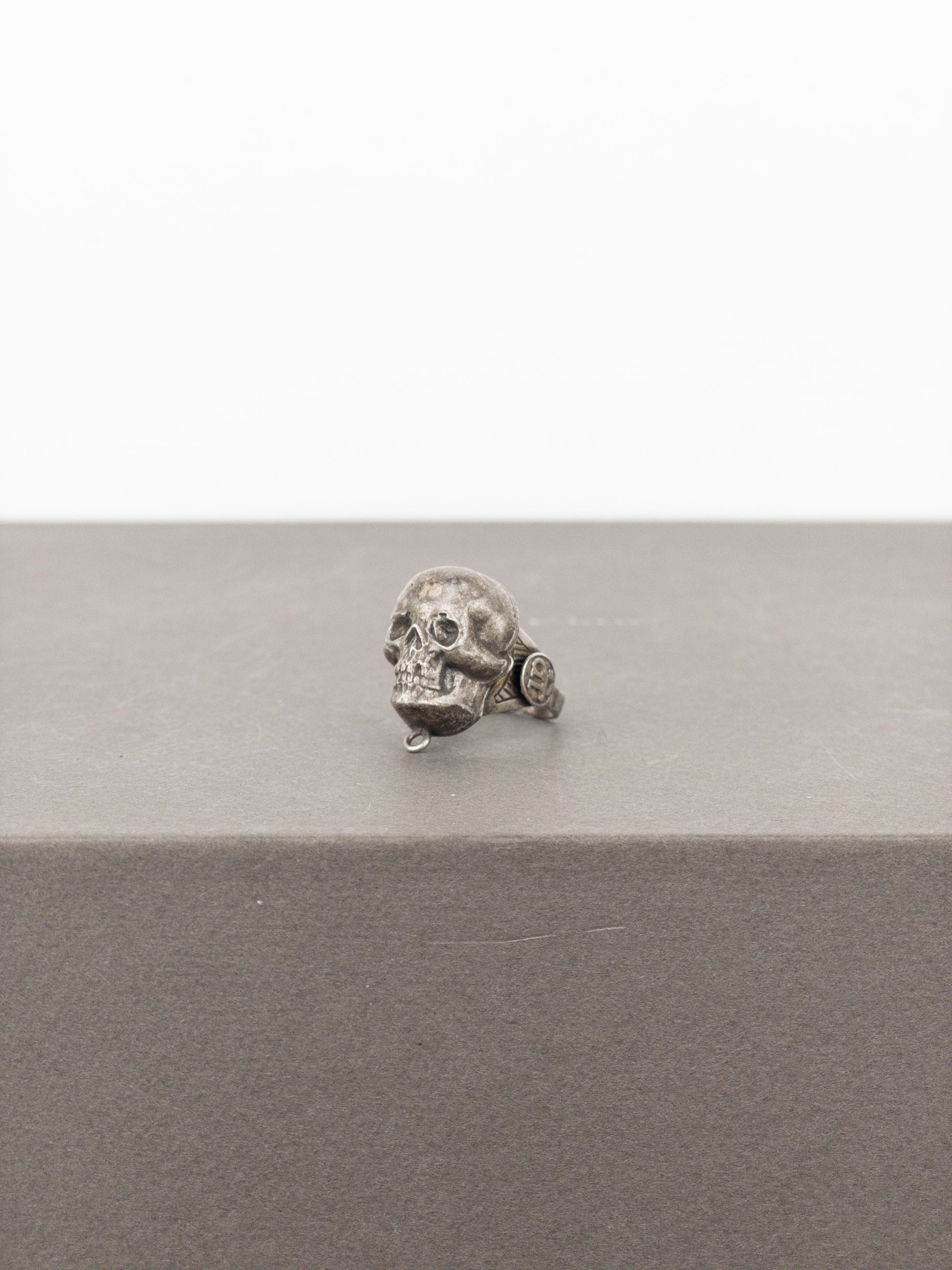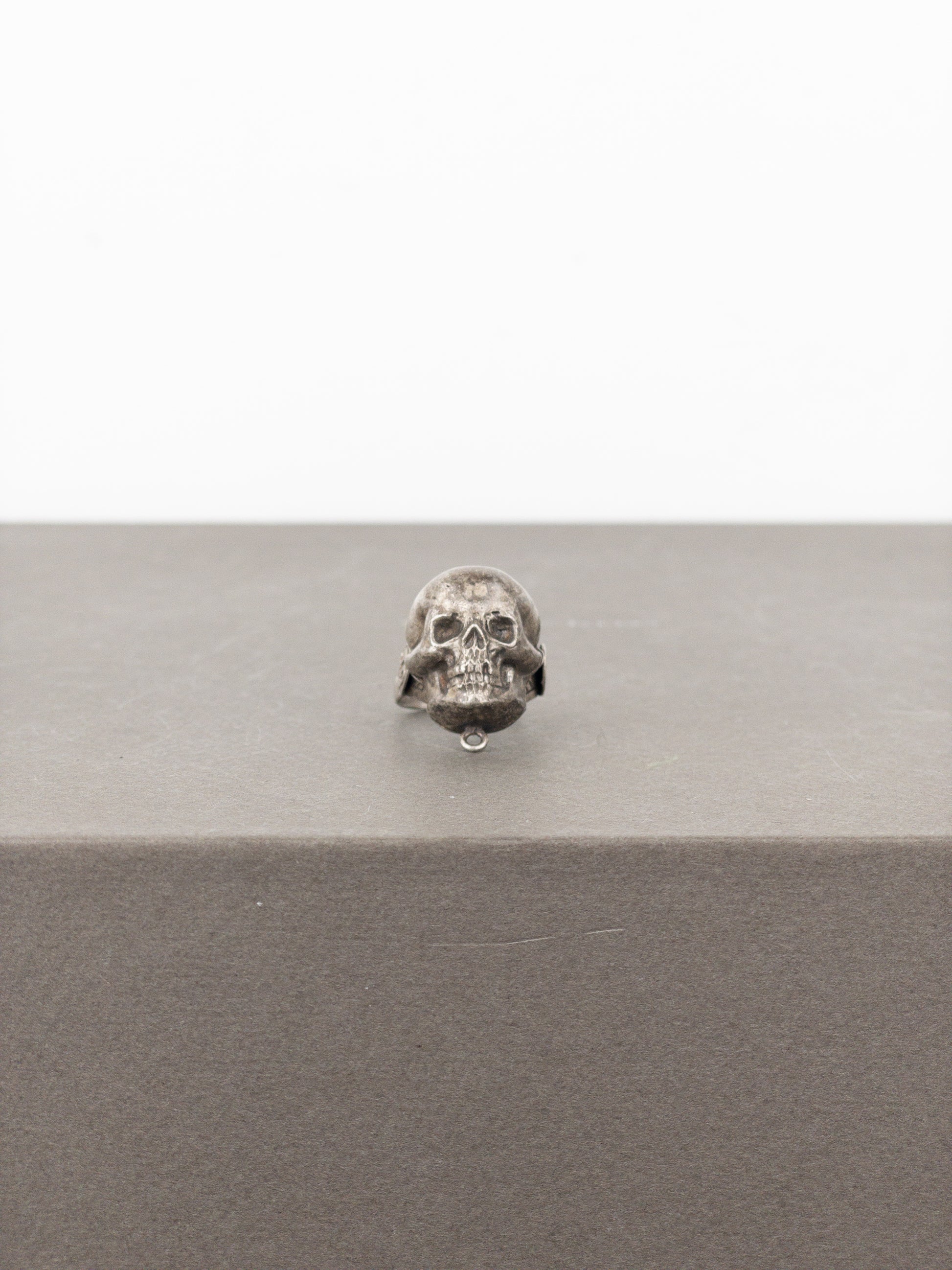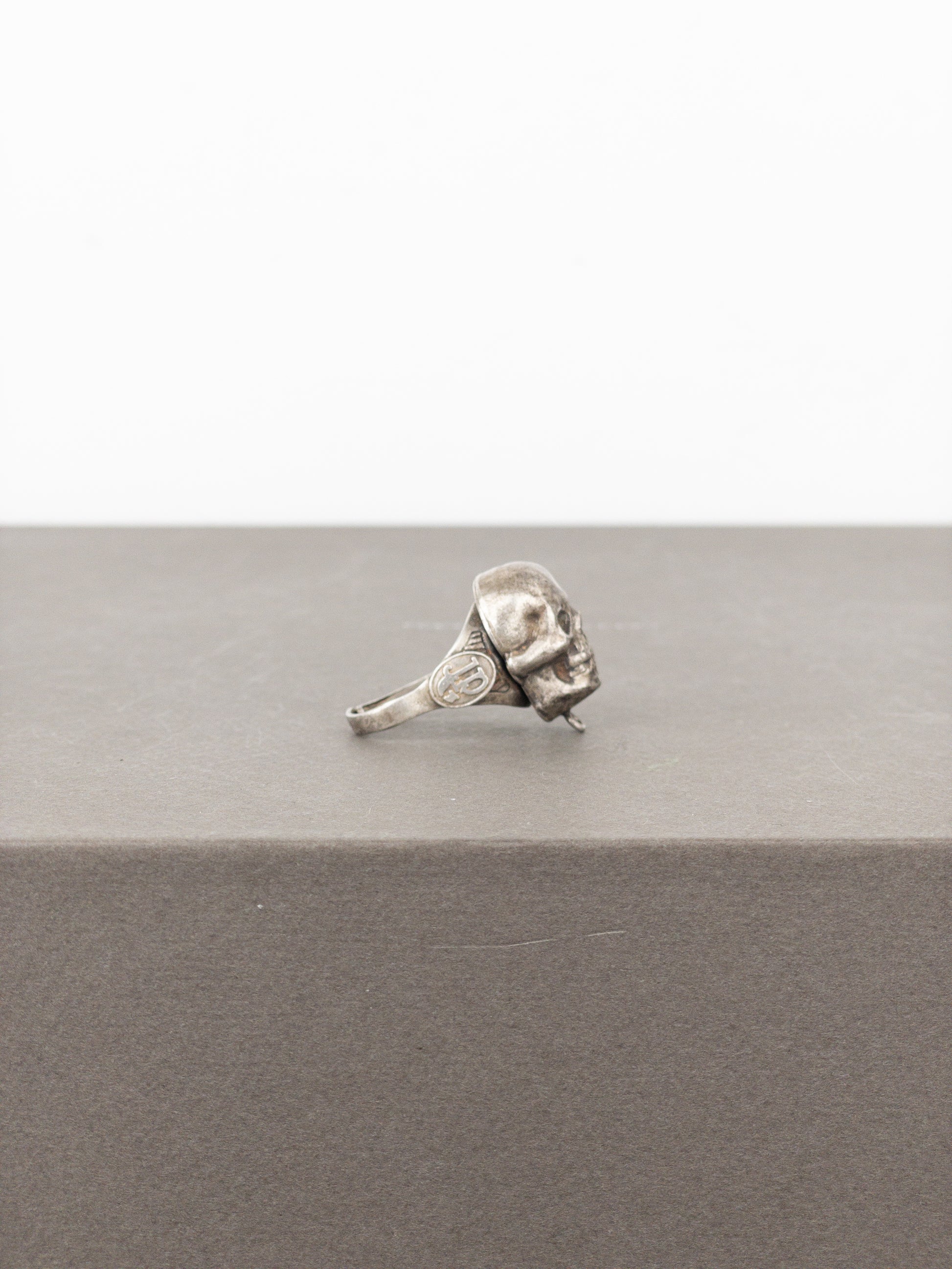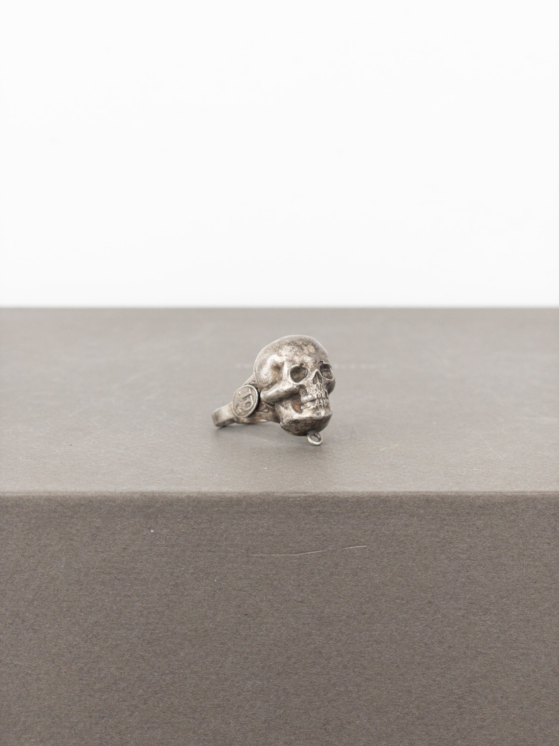 Bronze colored ring with a large 3D skull motif and logos on both sides, from the autumn-winter 1994 collection.