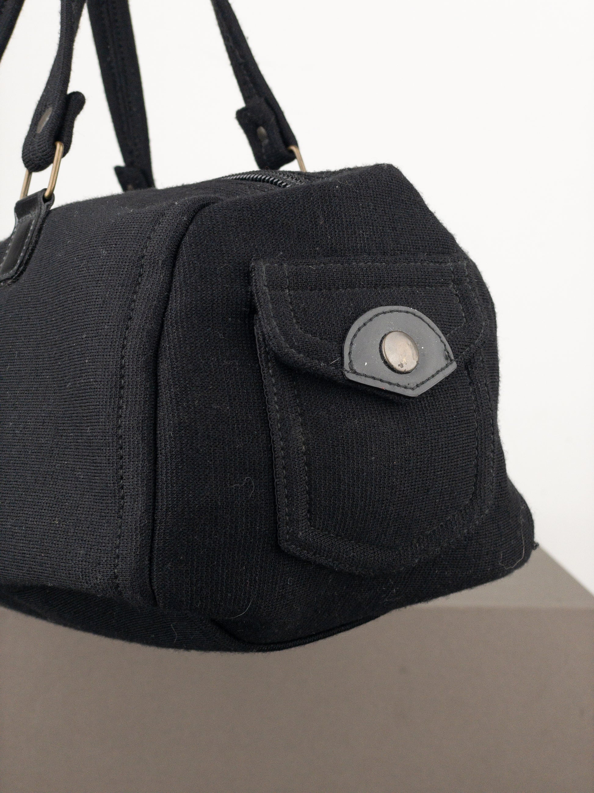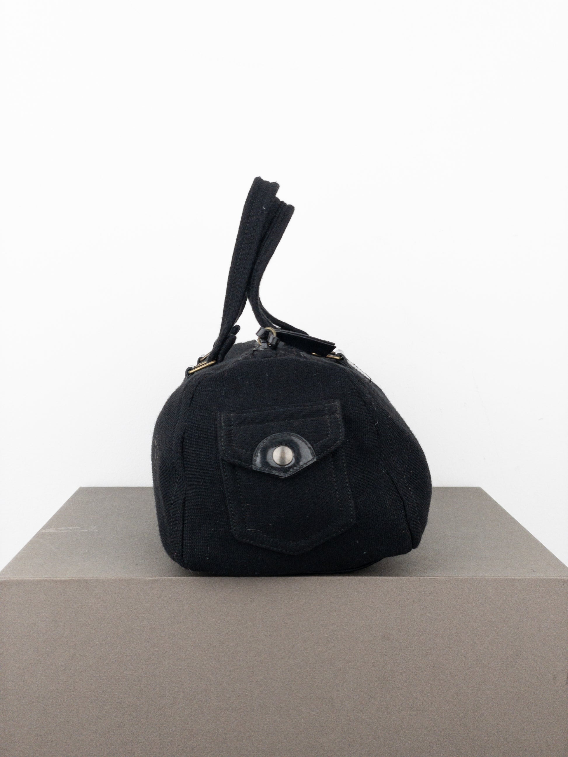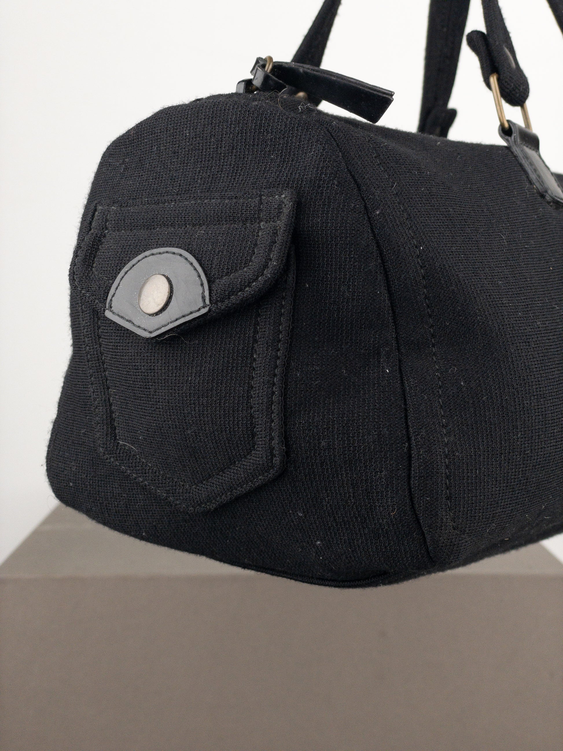 Boxy east-west baguette handbag in black canvas with bronze-colored hardware and patent leather details, featuring a small cargo pocket in the front, from the 2000s.