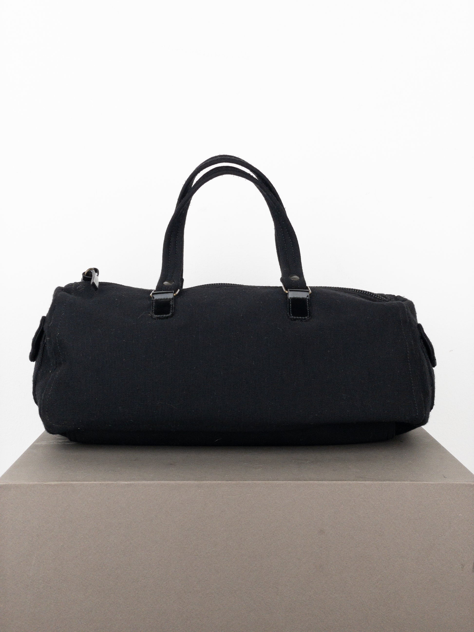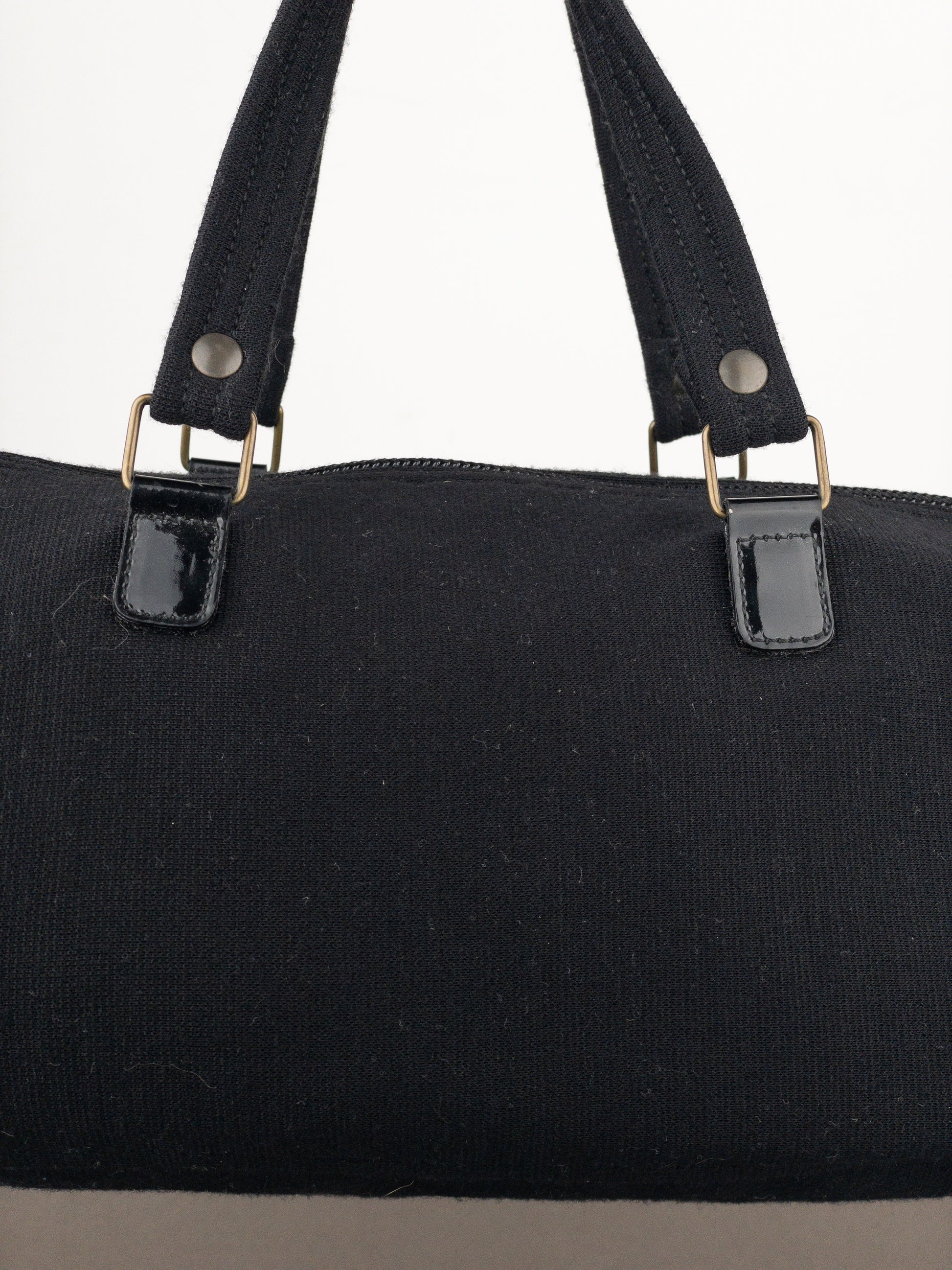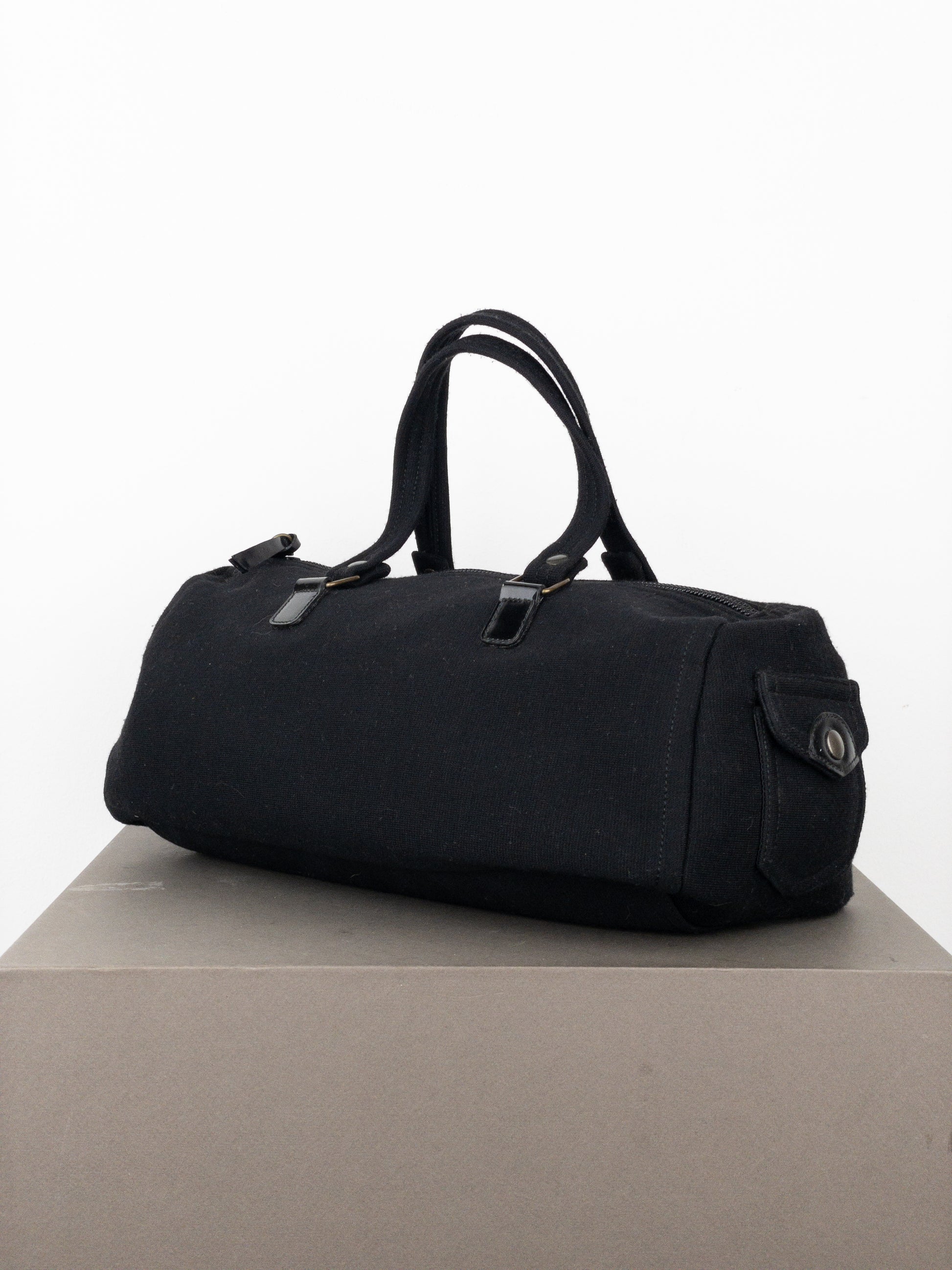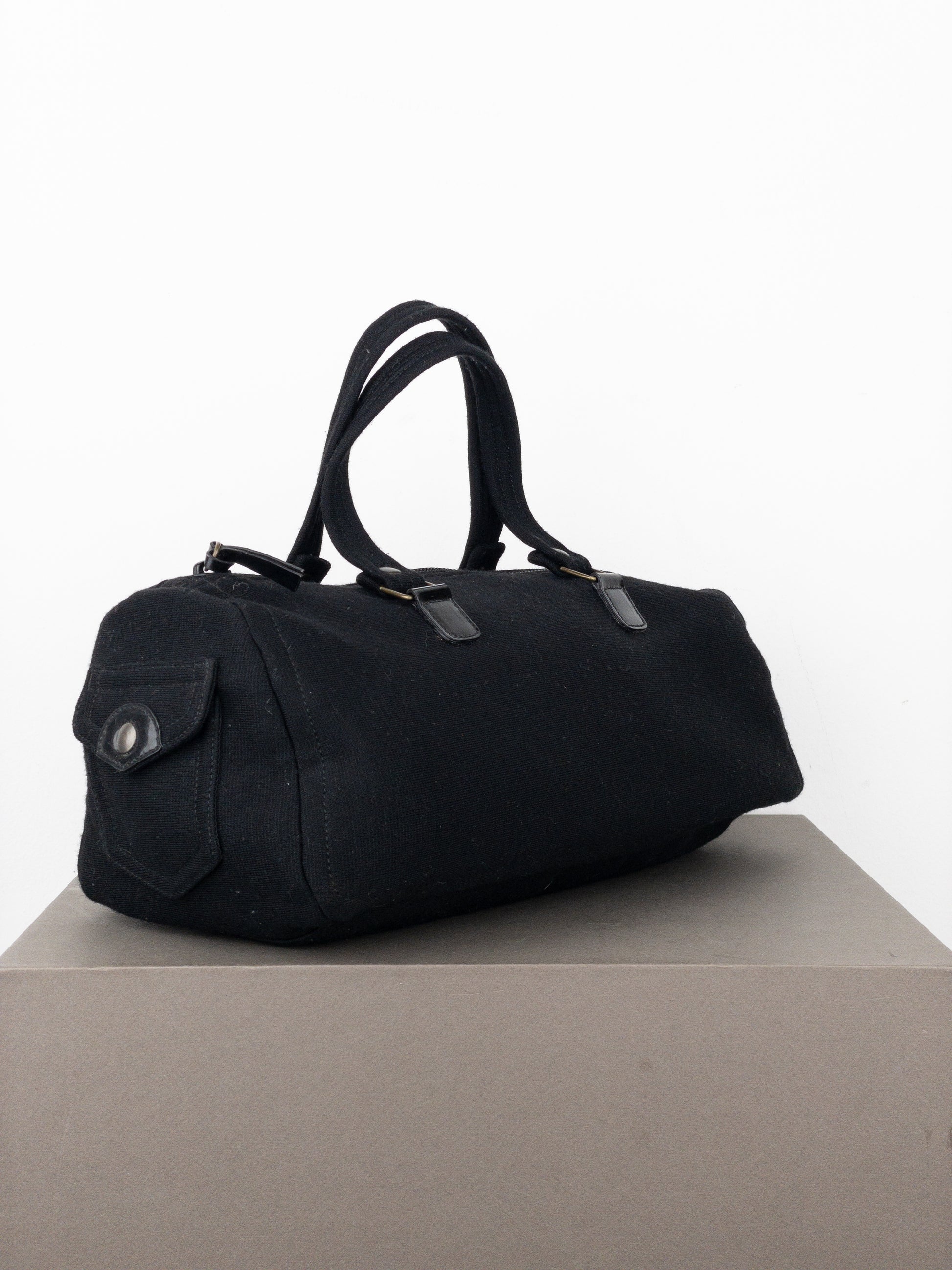Boxy east-west baguette handbag in black canvas with bronze-colored hardware and patent leather details, featuring a small cargo pocket in the front, from the 2000s.