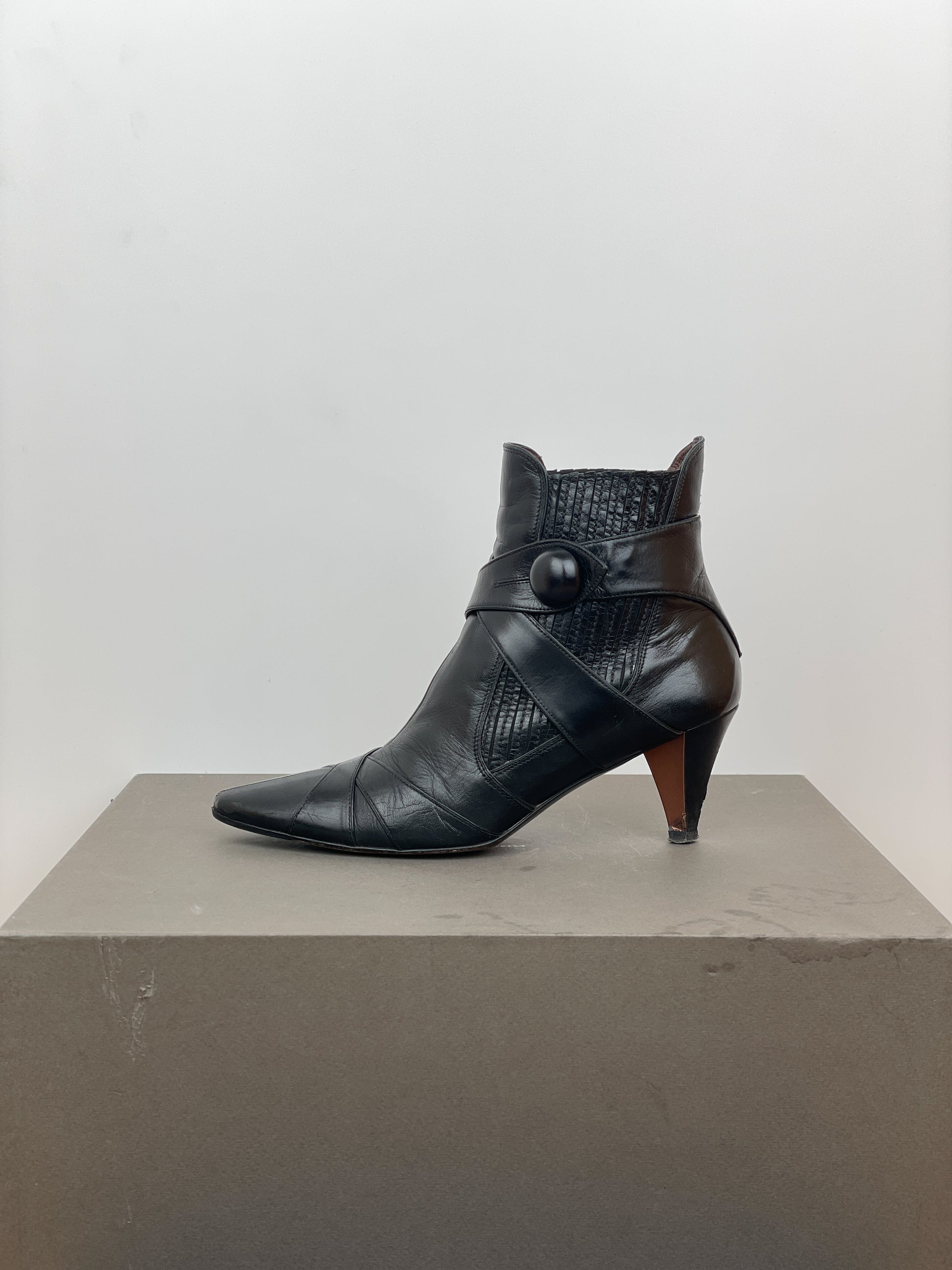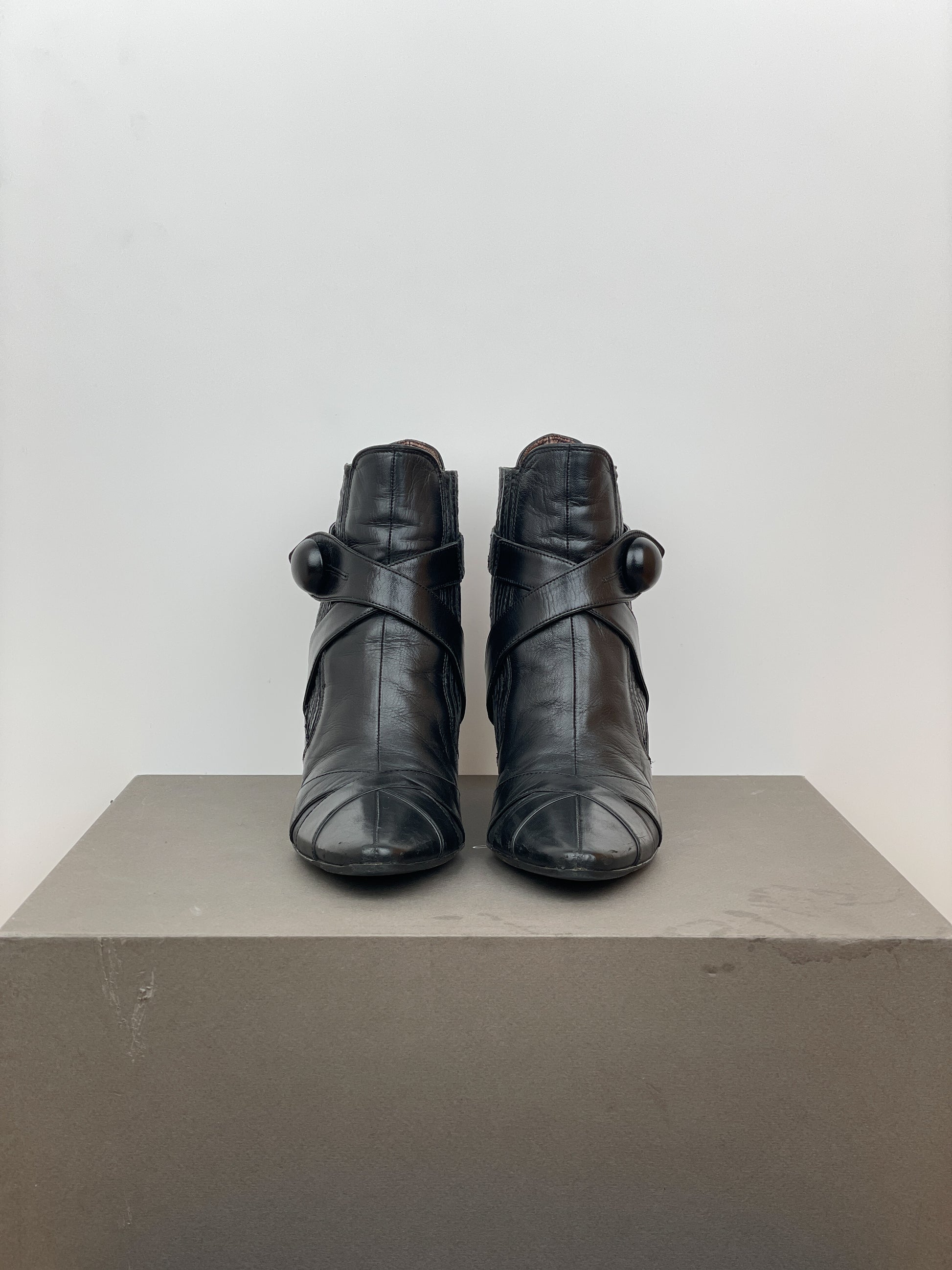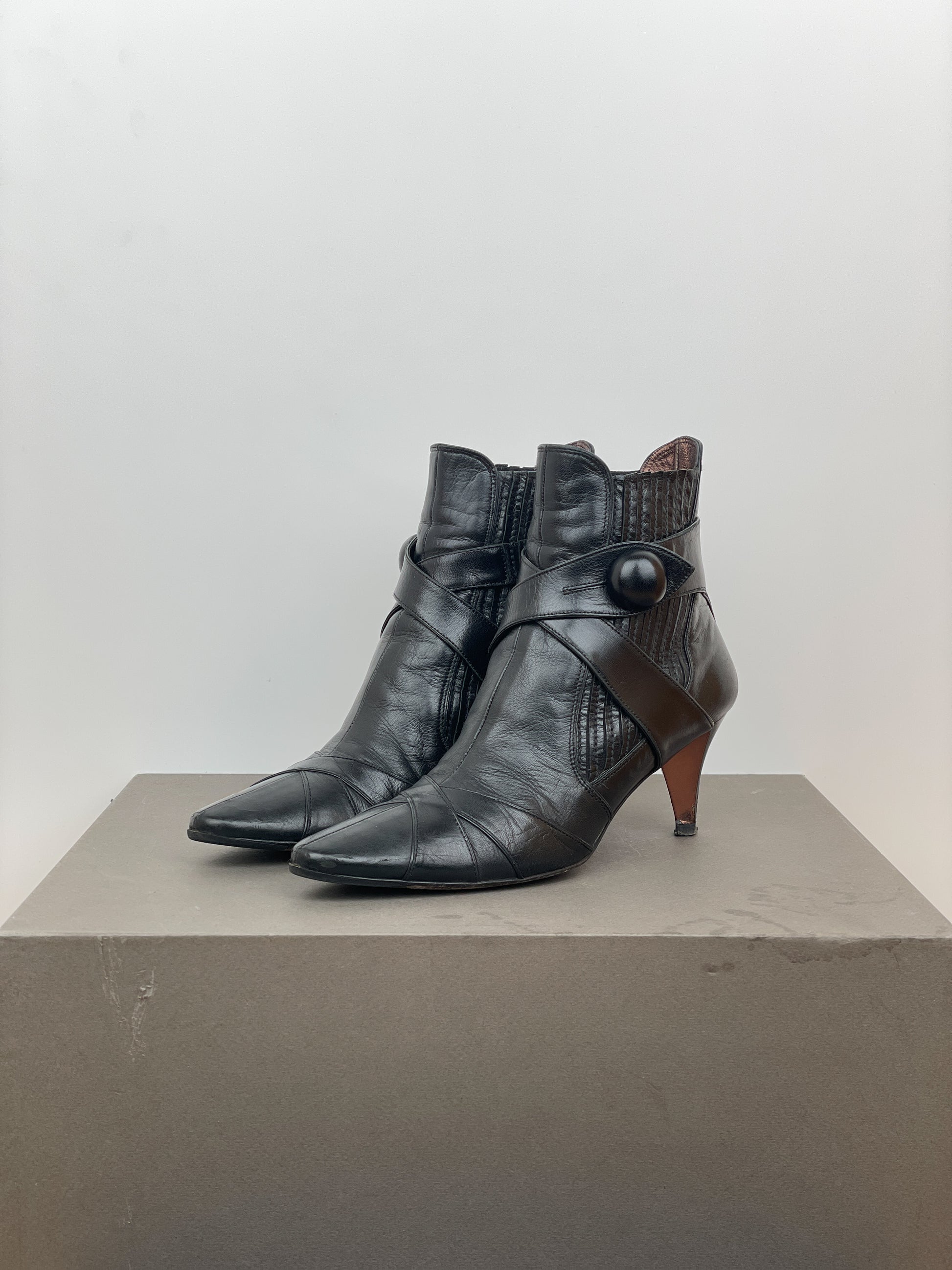 Black leather ankle heel boots with biker strap details and a button closure at the ankle, featuring a kitten heel and ribbed elastic chelsea boot panels, from the 2000s.