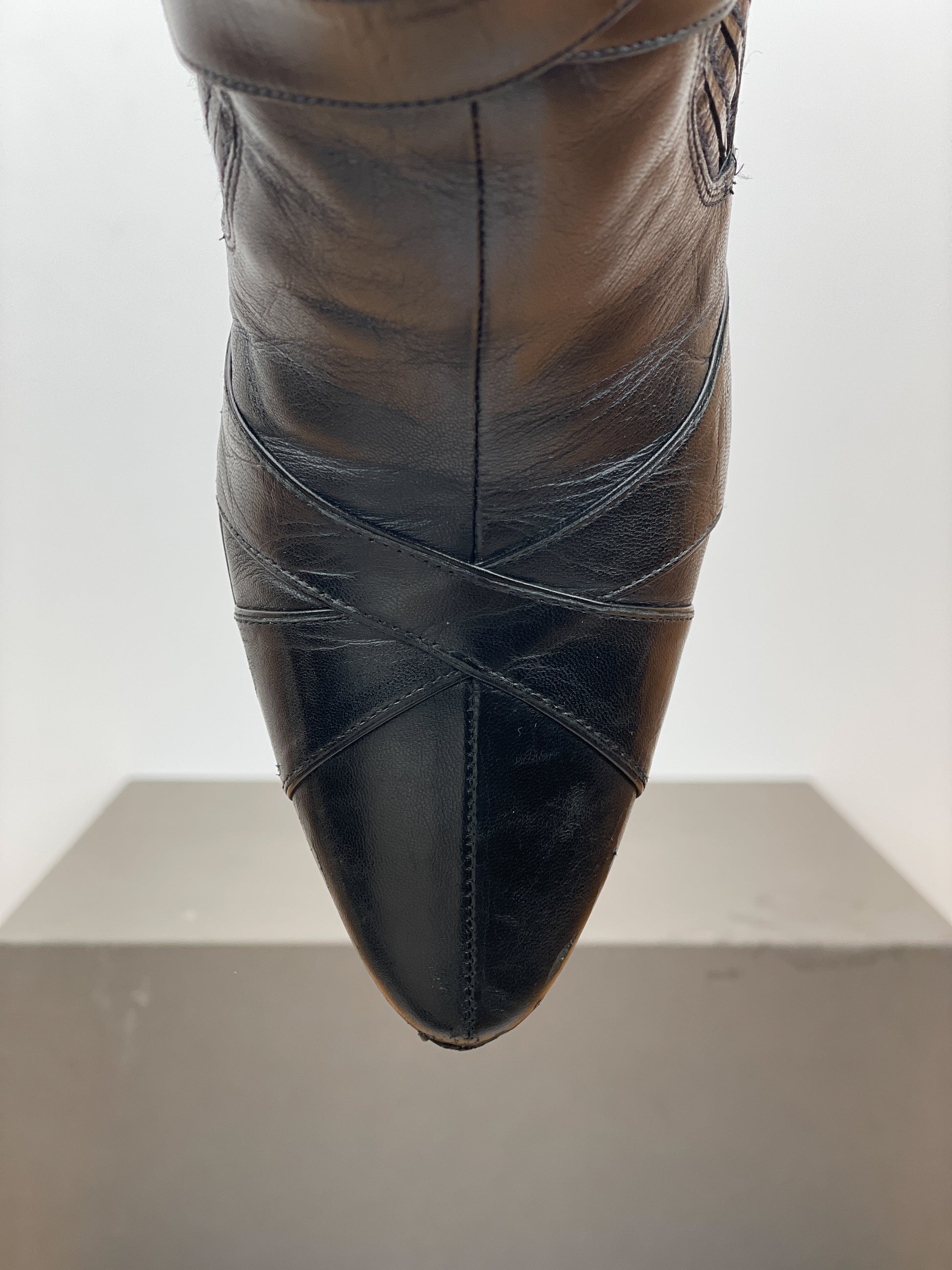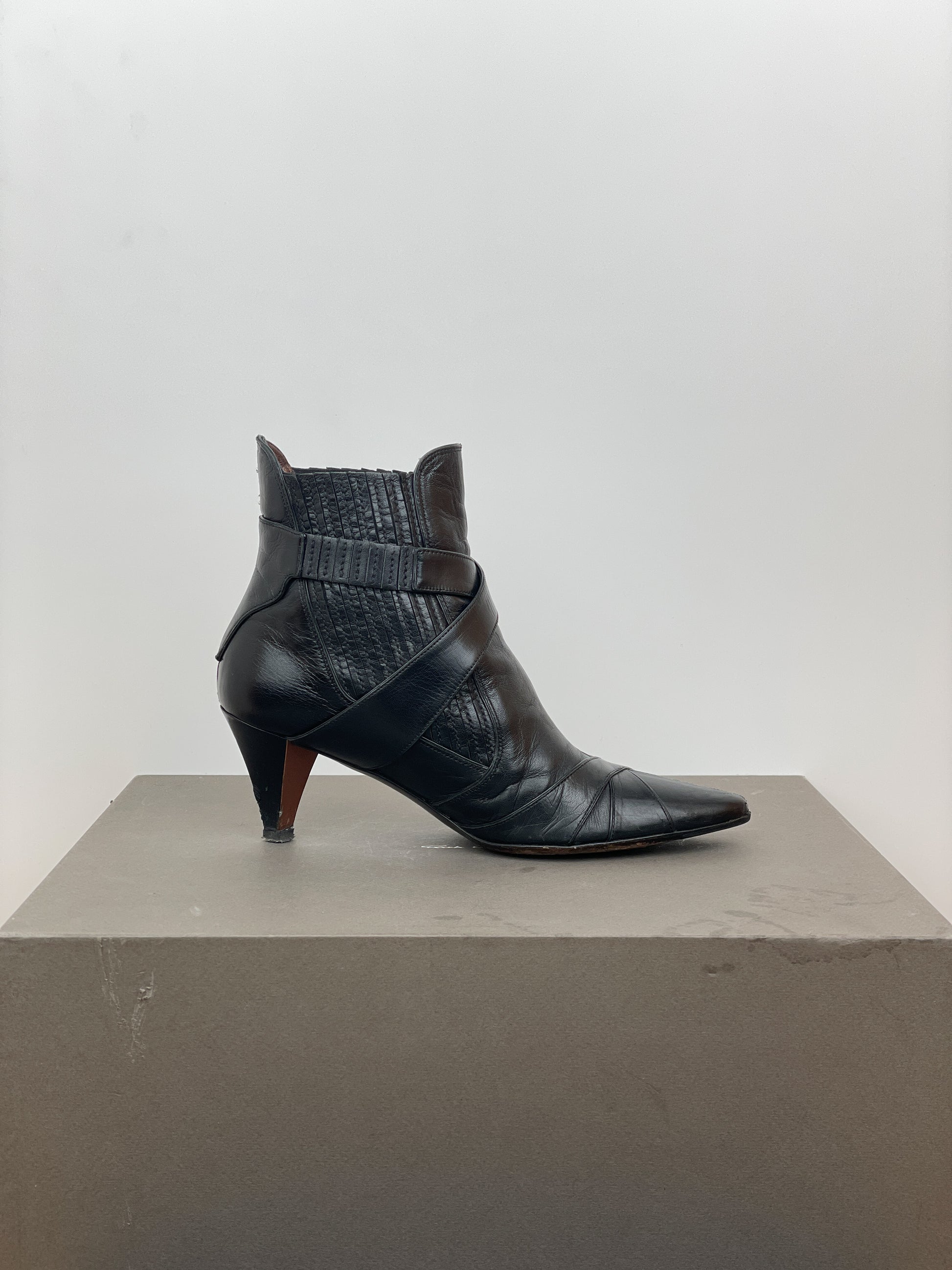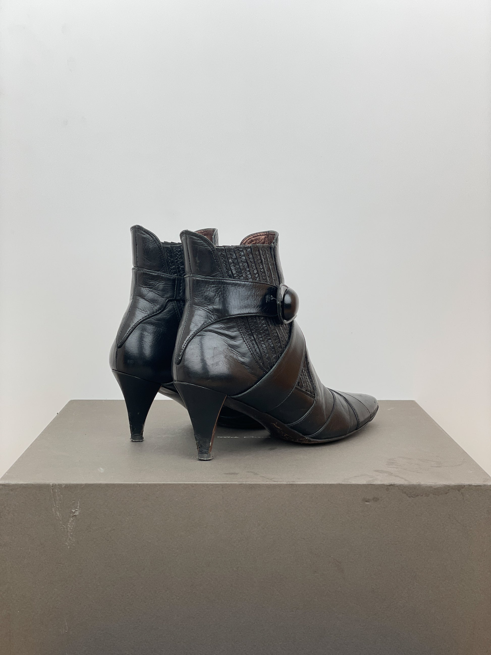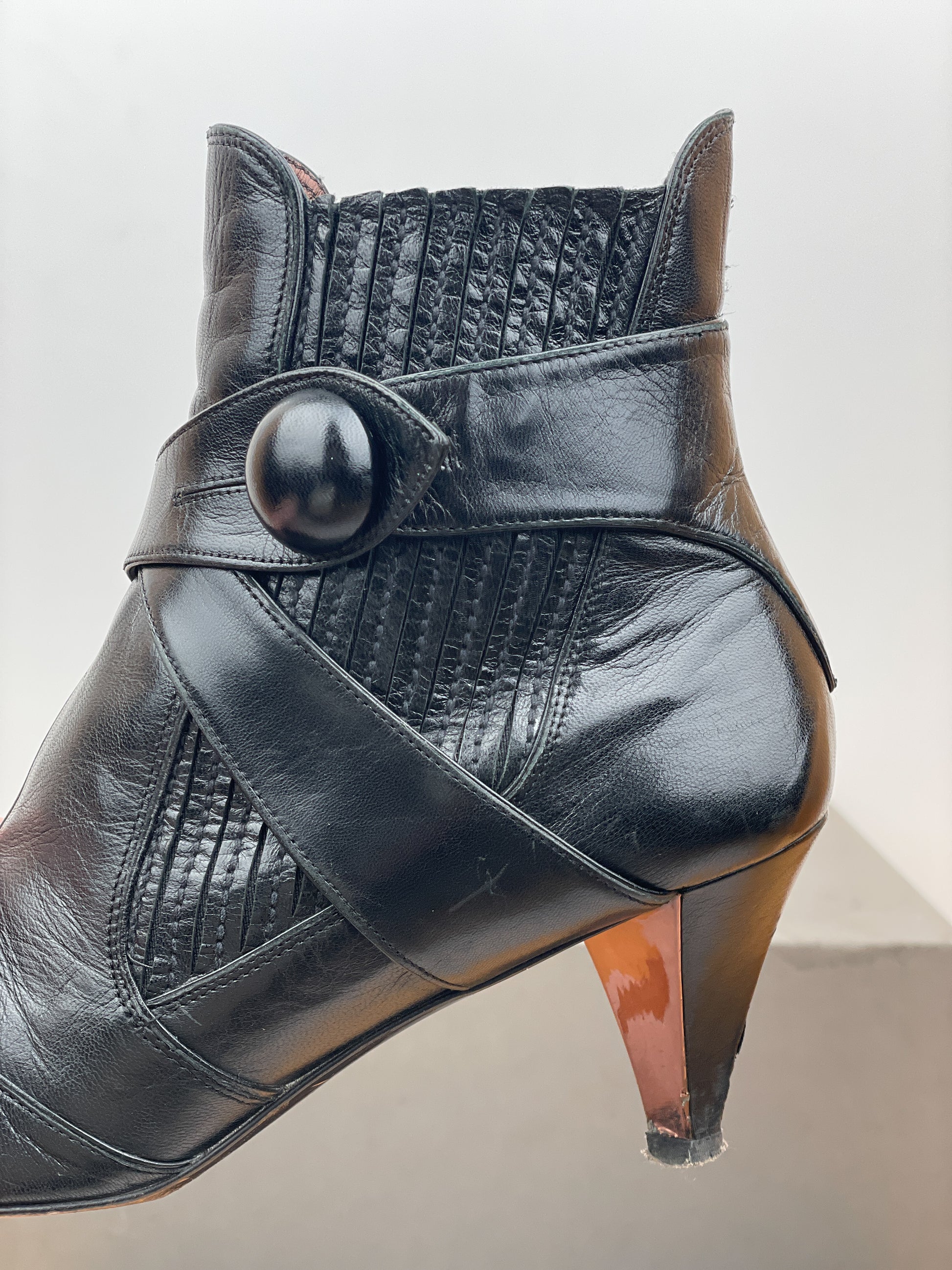 Black leather ankle heel boots with biker strap details and a button closure at the ankle, featuring a kitten heel and ribbed elastic chelsea boot panels, from the 2000s.