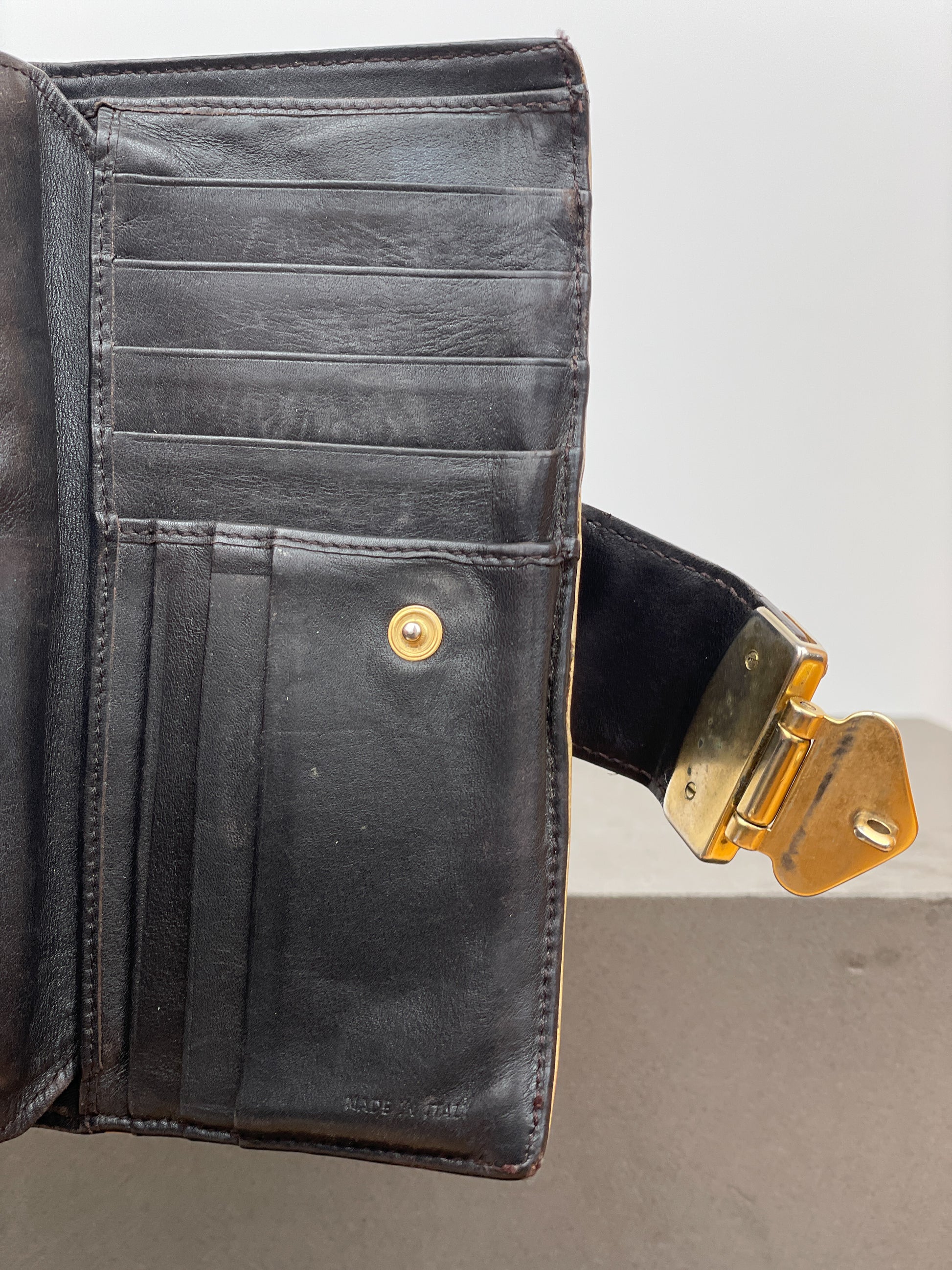 Brown leather purse wallet with imprinted crocodile texture, featuring a large gold-colored clasp lock on the front and zipper around the sides, from the 2000s.