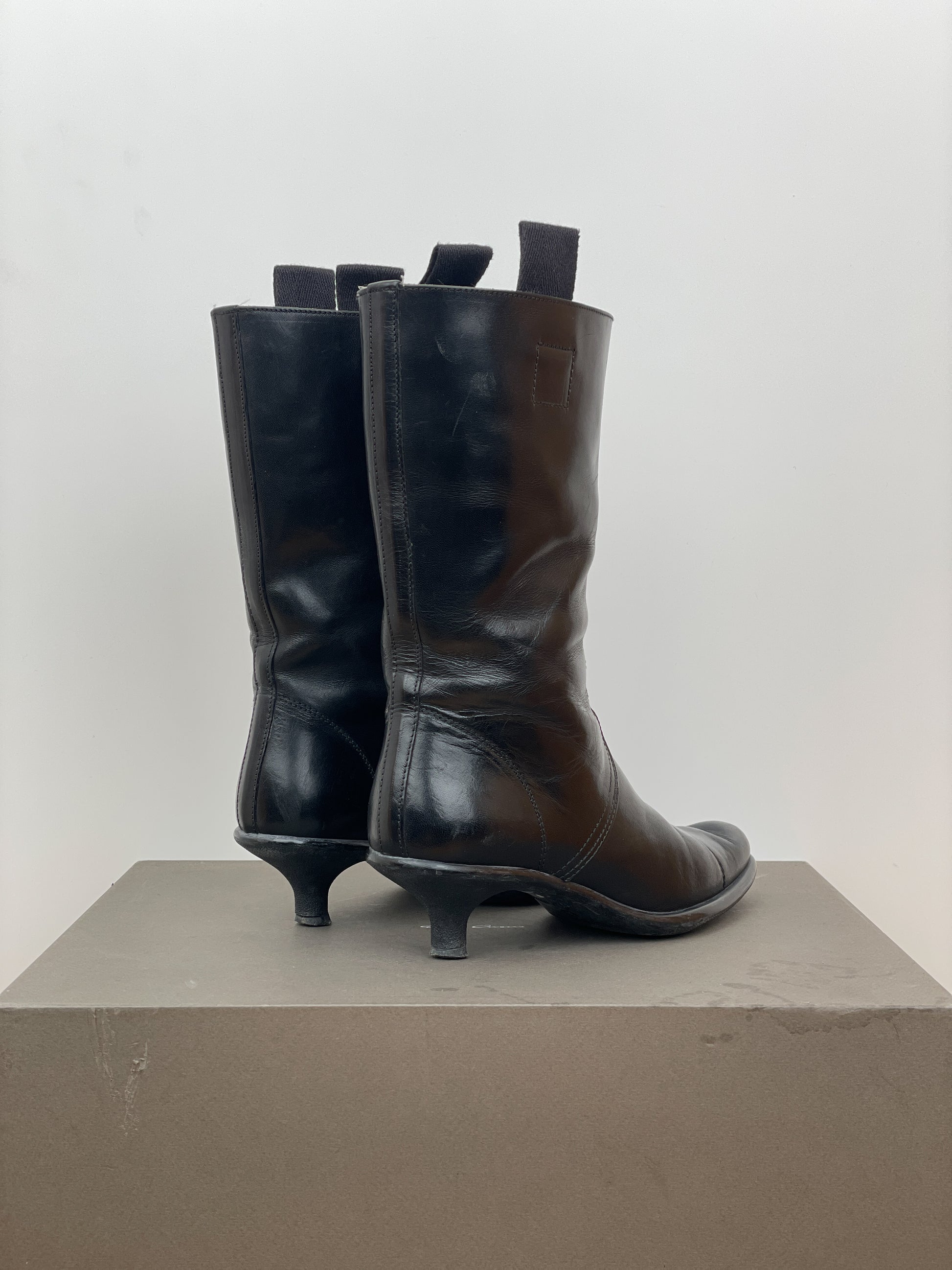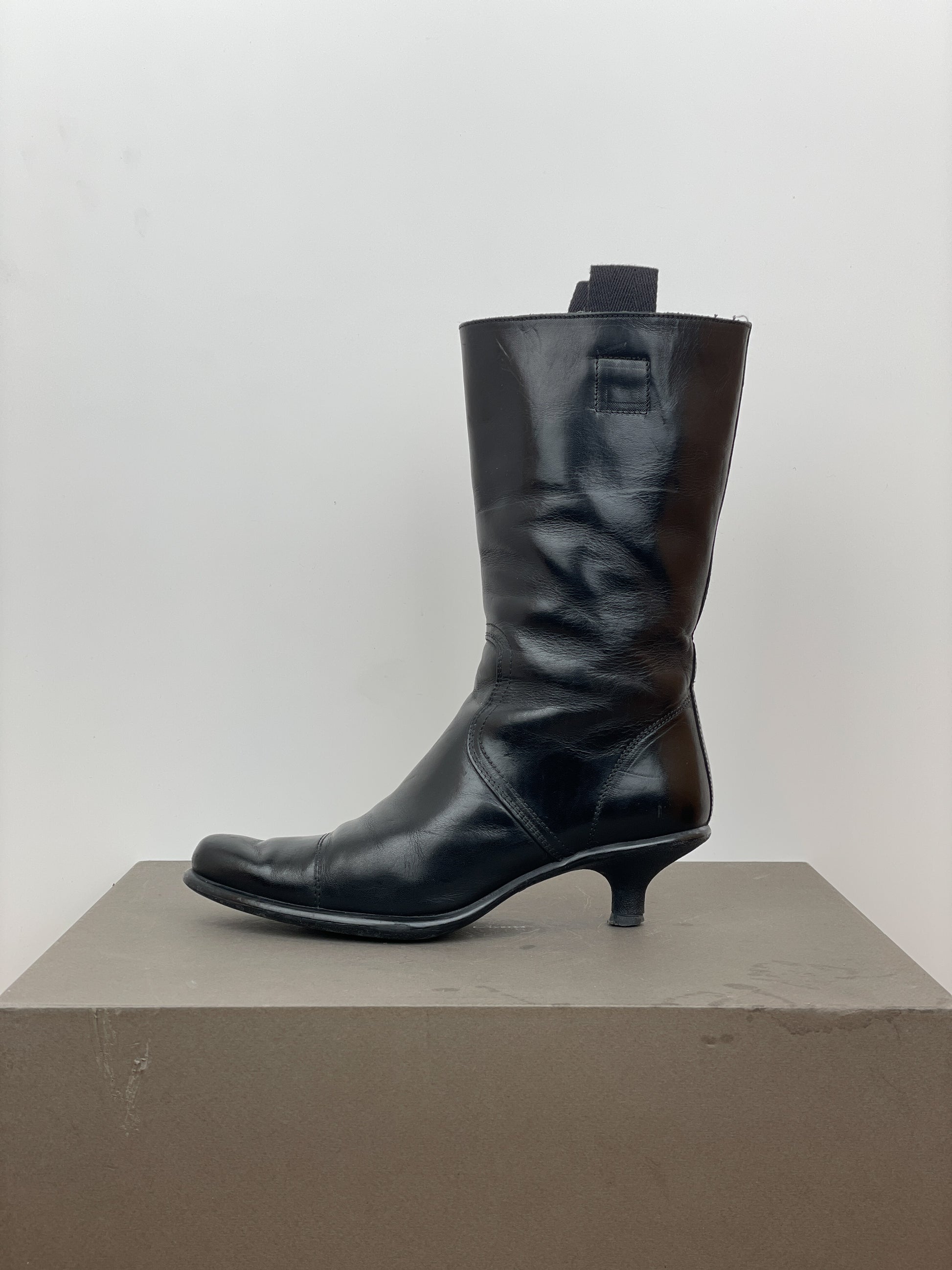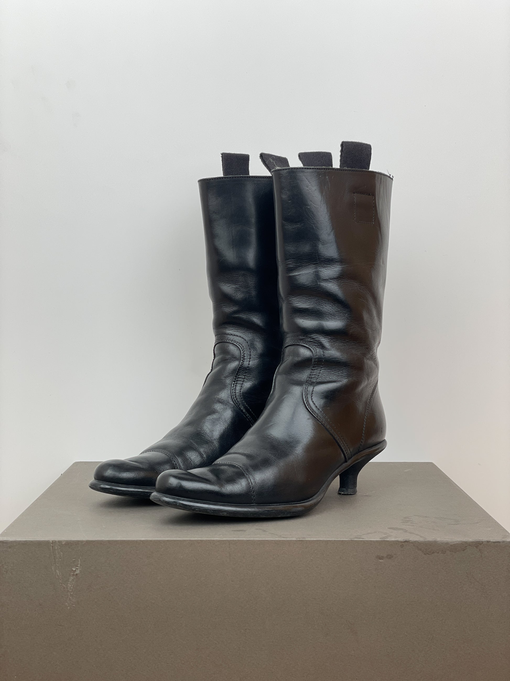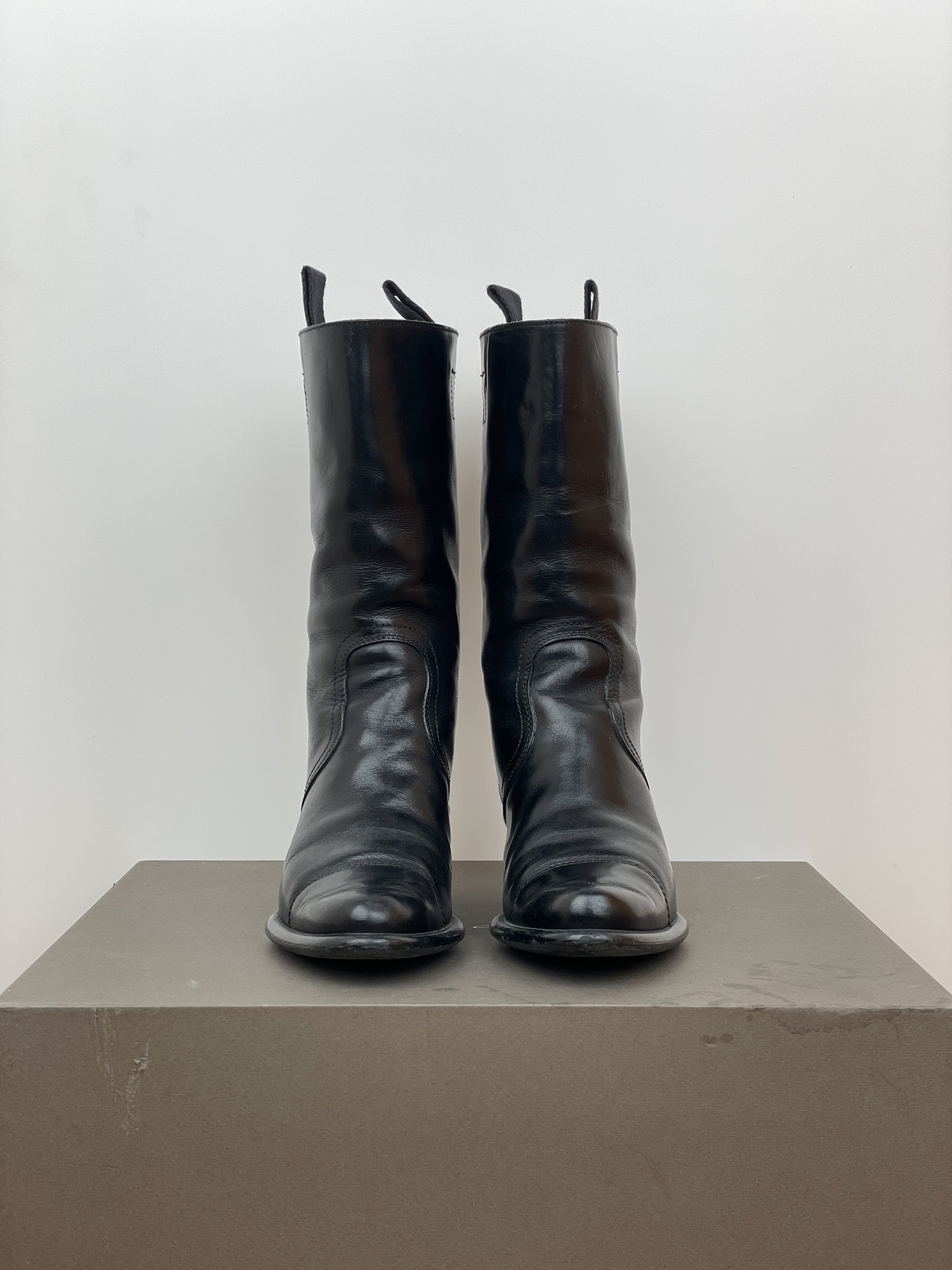 Tall black leather cowboy boots with a kitten heel and pull-on straps at the top of the shaft, from the 2000s.