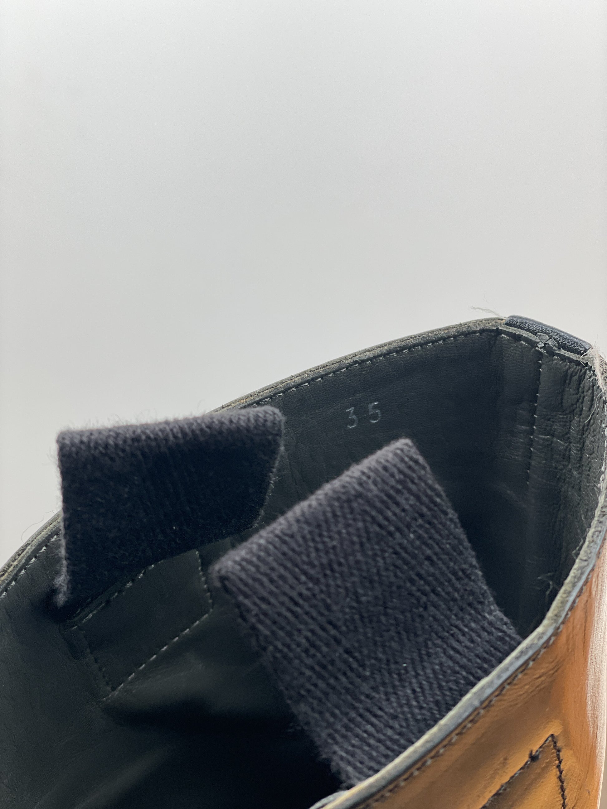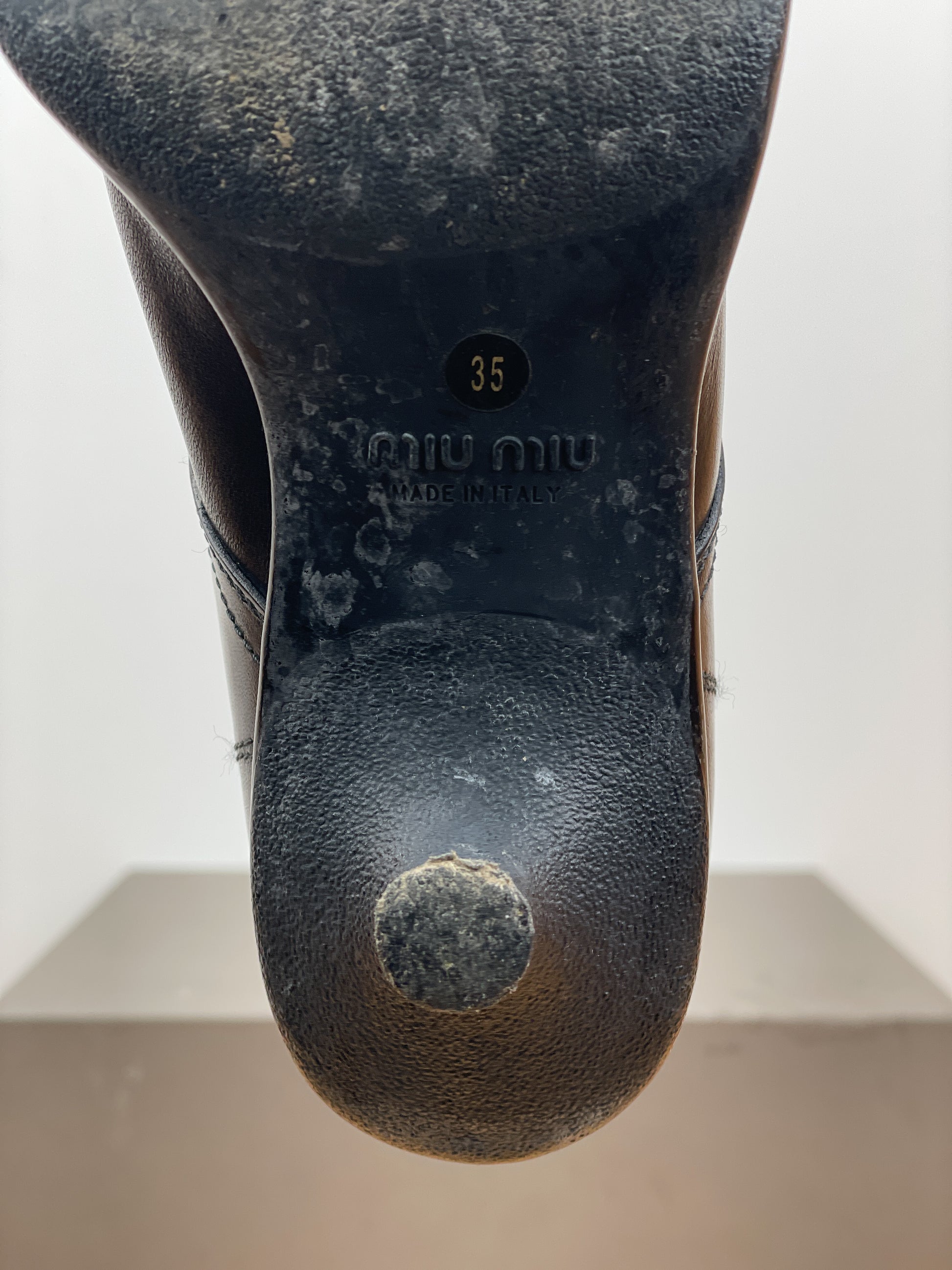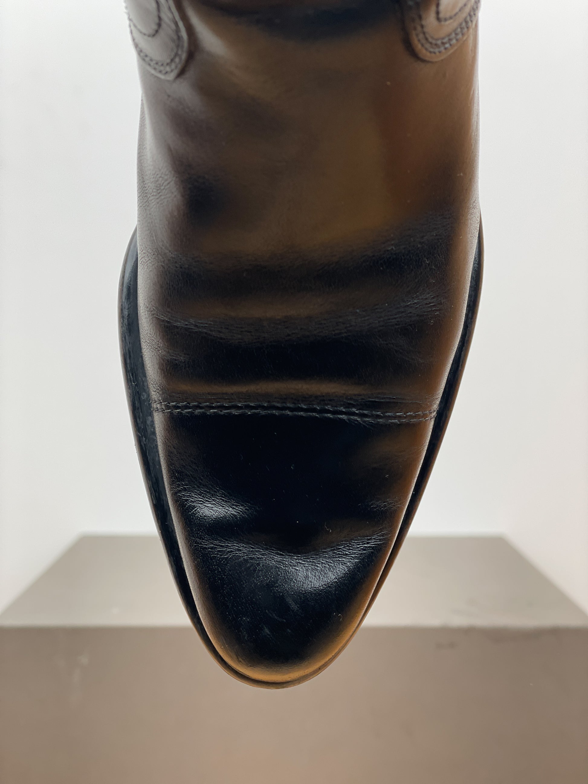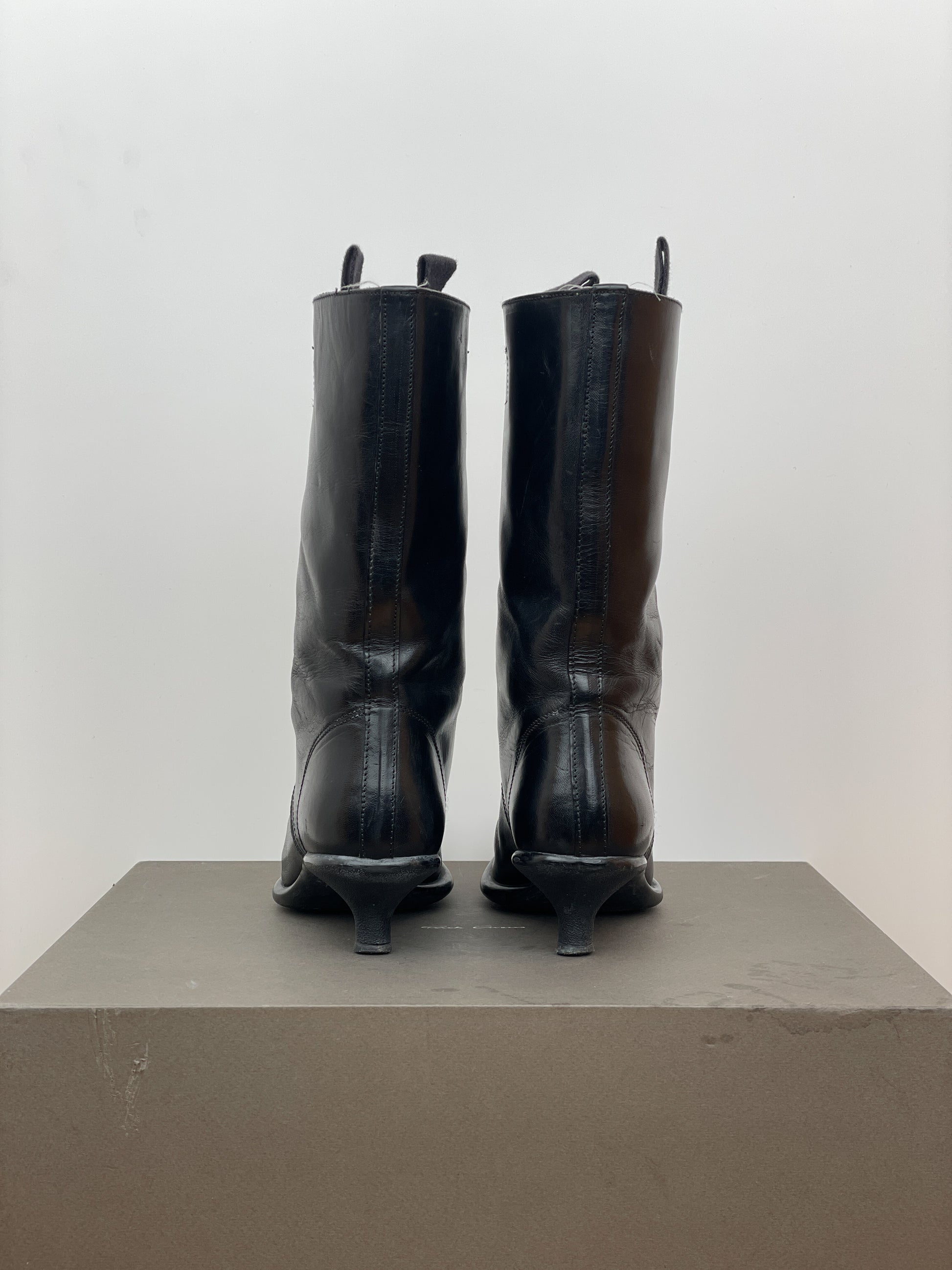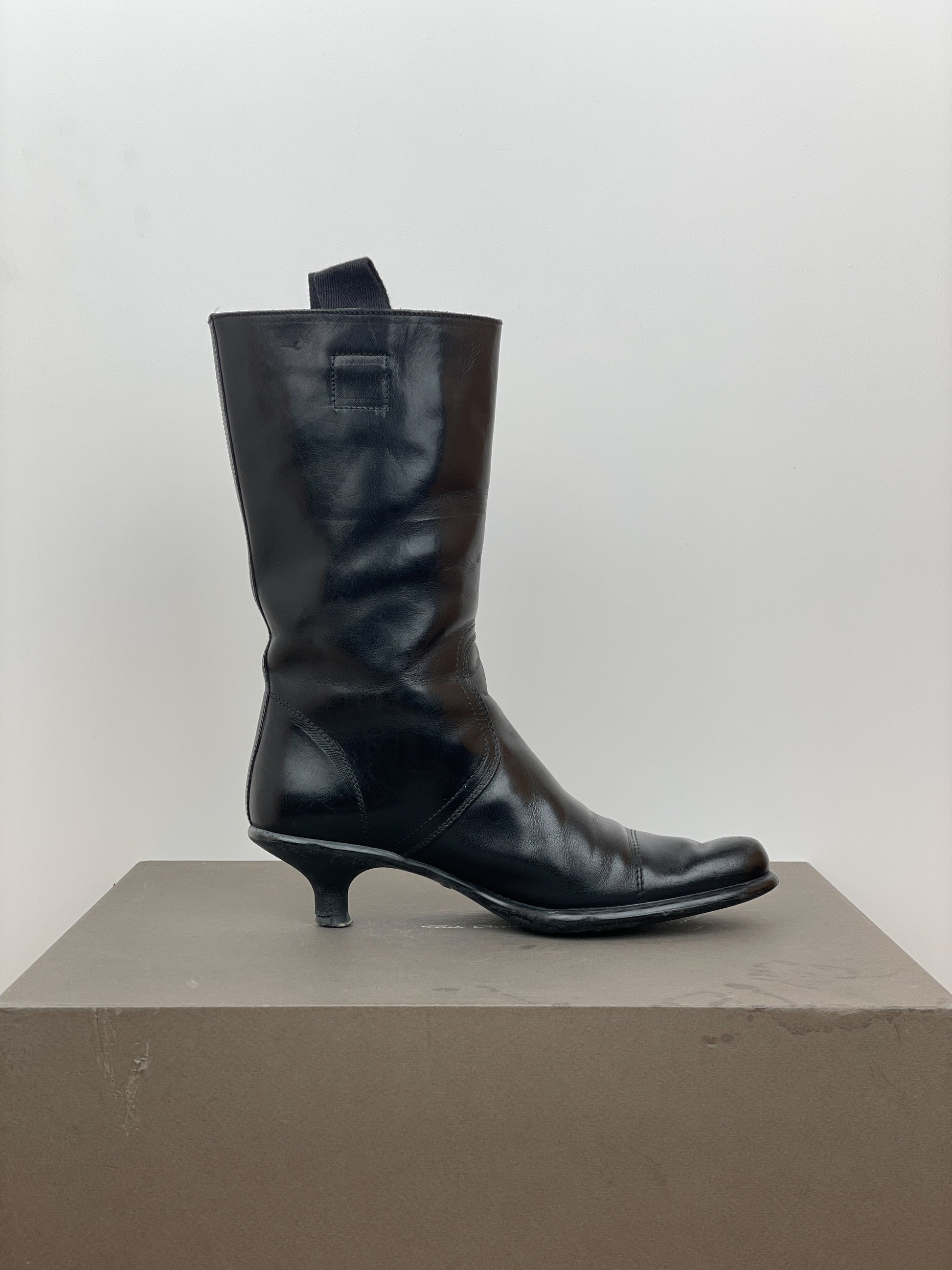 Tall black leather cowboy boots with a kitten heel and pull-on straps at the top of the shaft, from the 2000s.