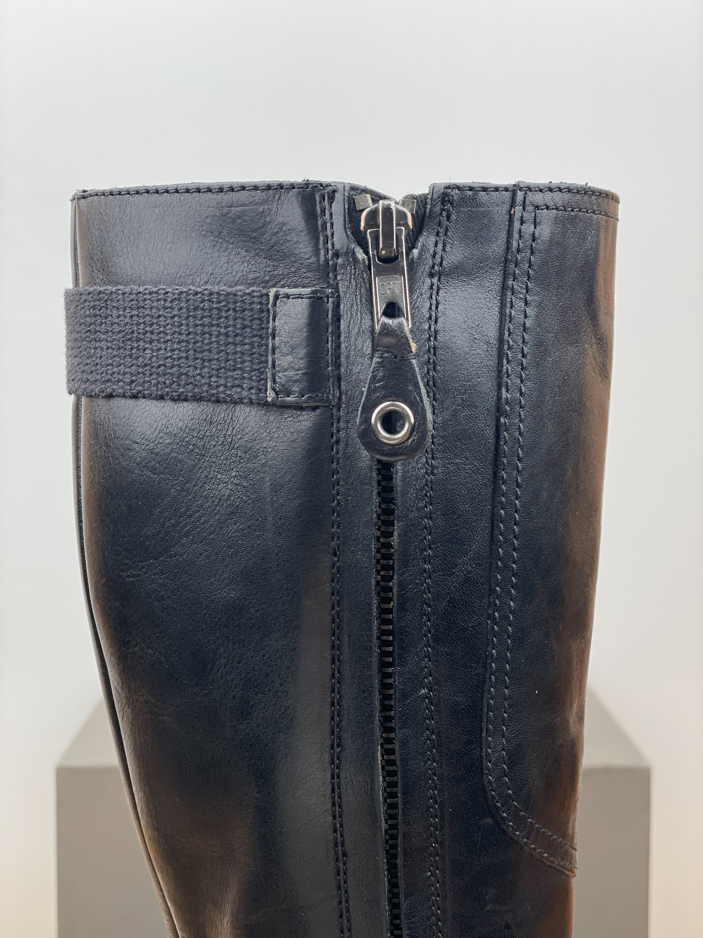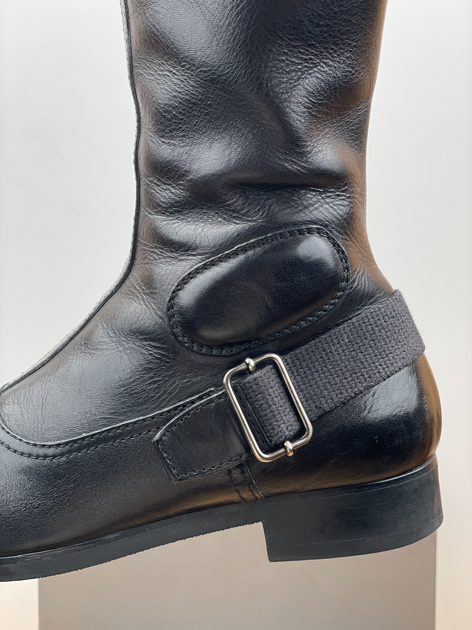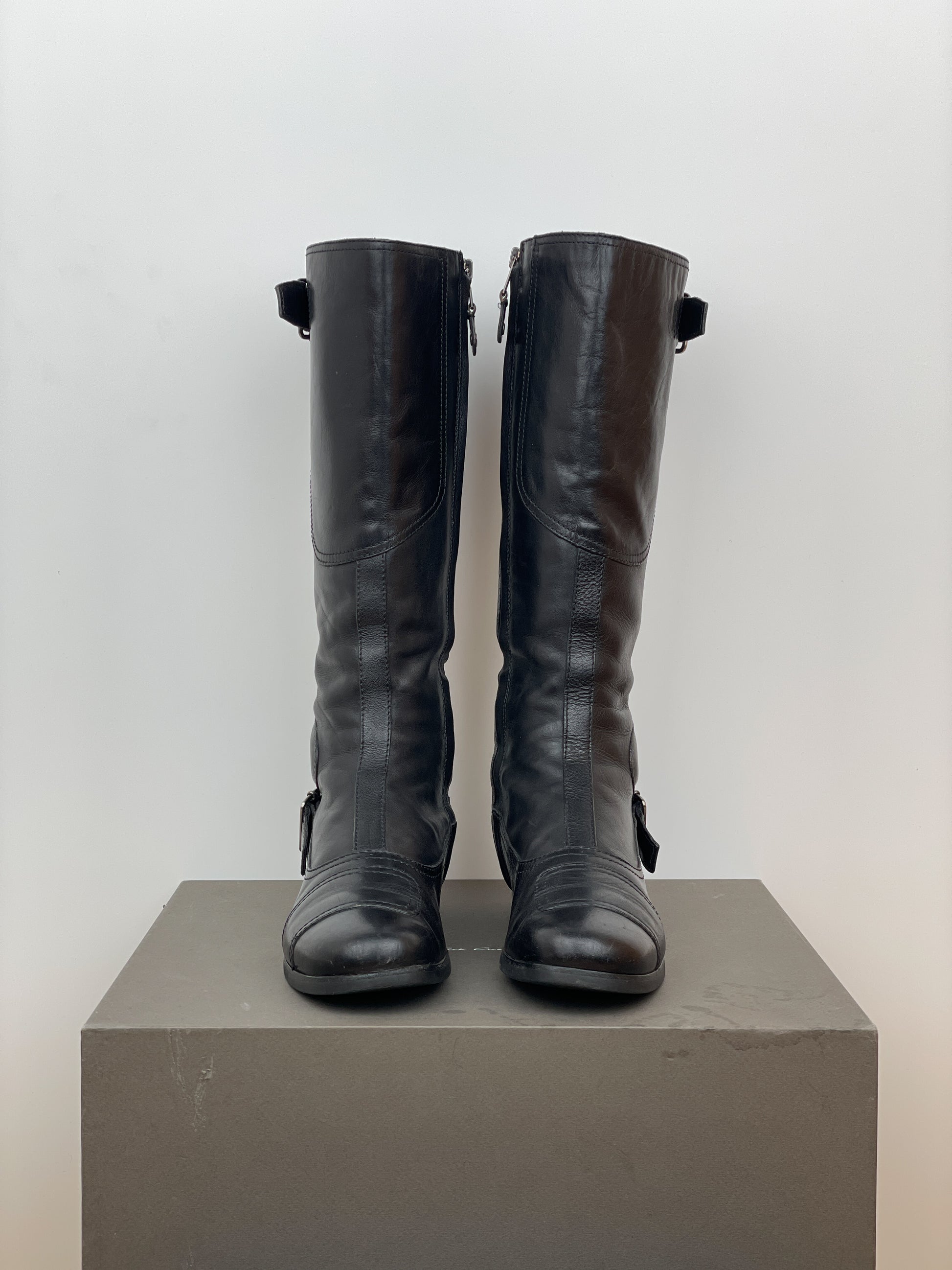Knee-high biker boots in black leather, featuring a reinforced biker strap across the left foot, a zipper along the inside of the shaft, and buckled straps around the heel and the back of the calve, from the 2000s.