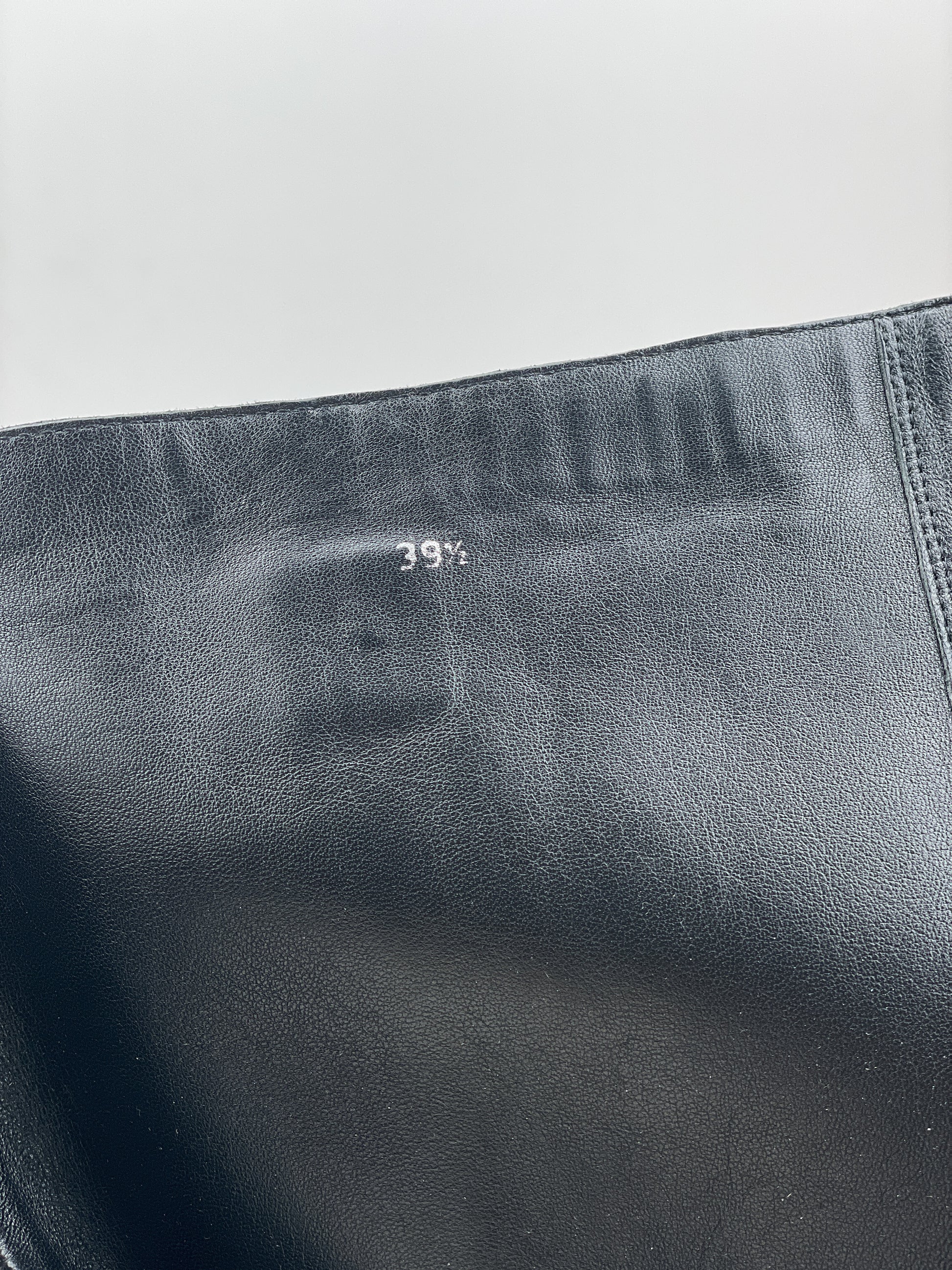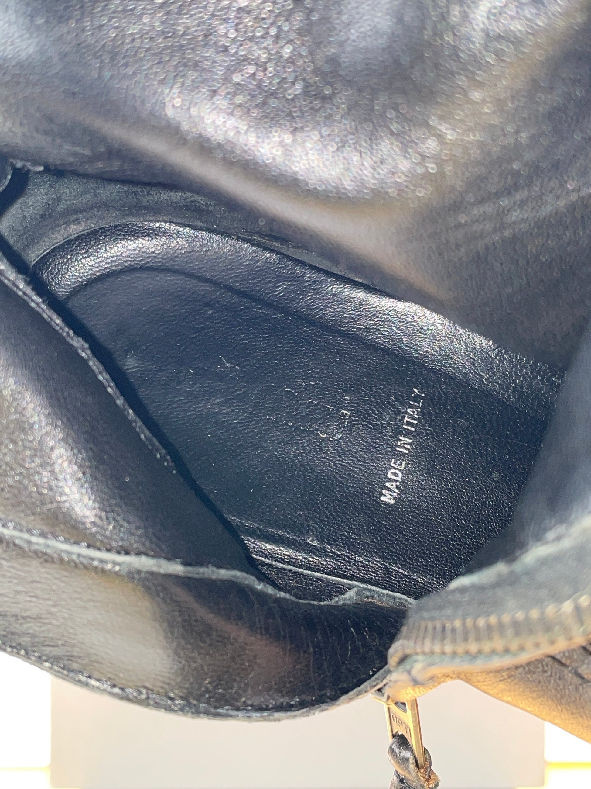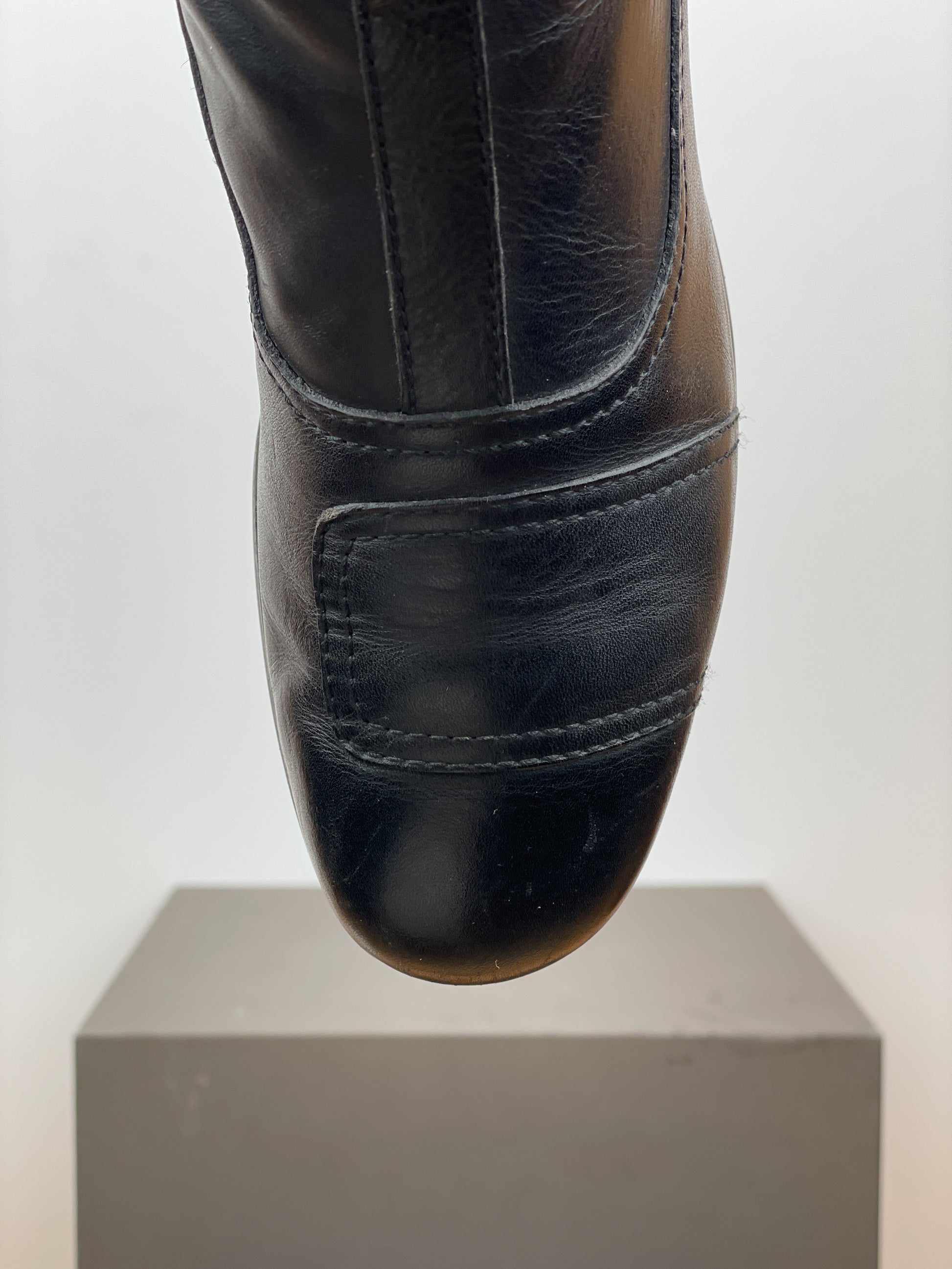 Knee-high biker boots in black leather, featuring a reinforced biker strap across the left foot, a zipper along the inside of the shaft, and buckled straps around the heel and the back of the calve, from the 2000s.