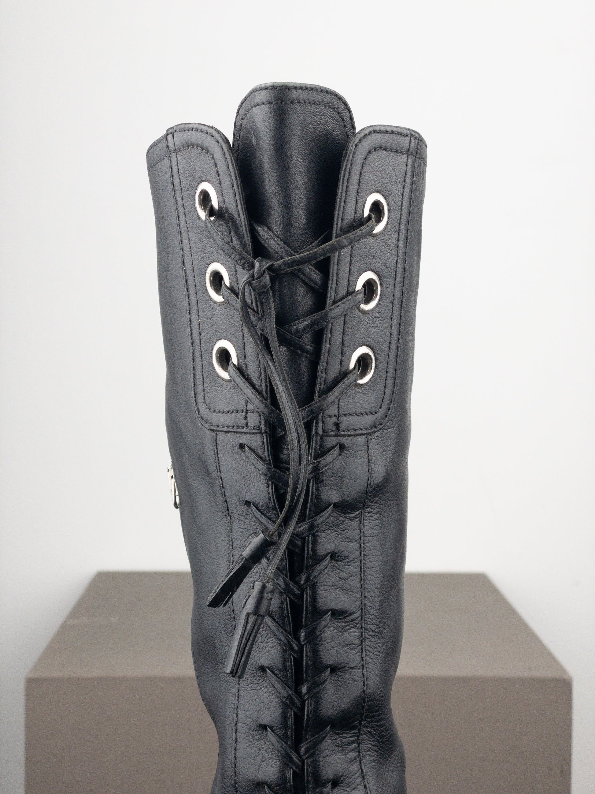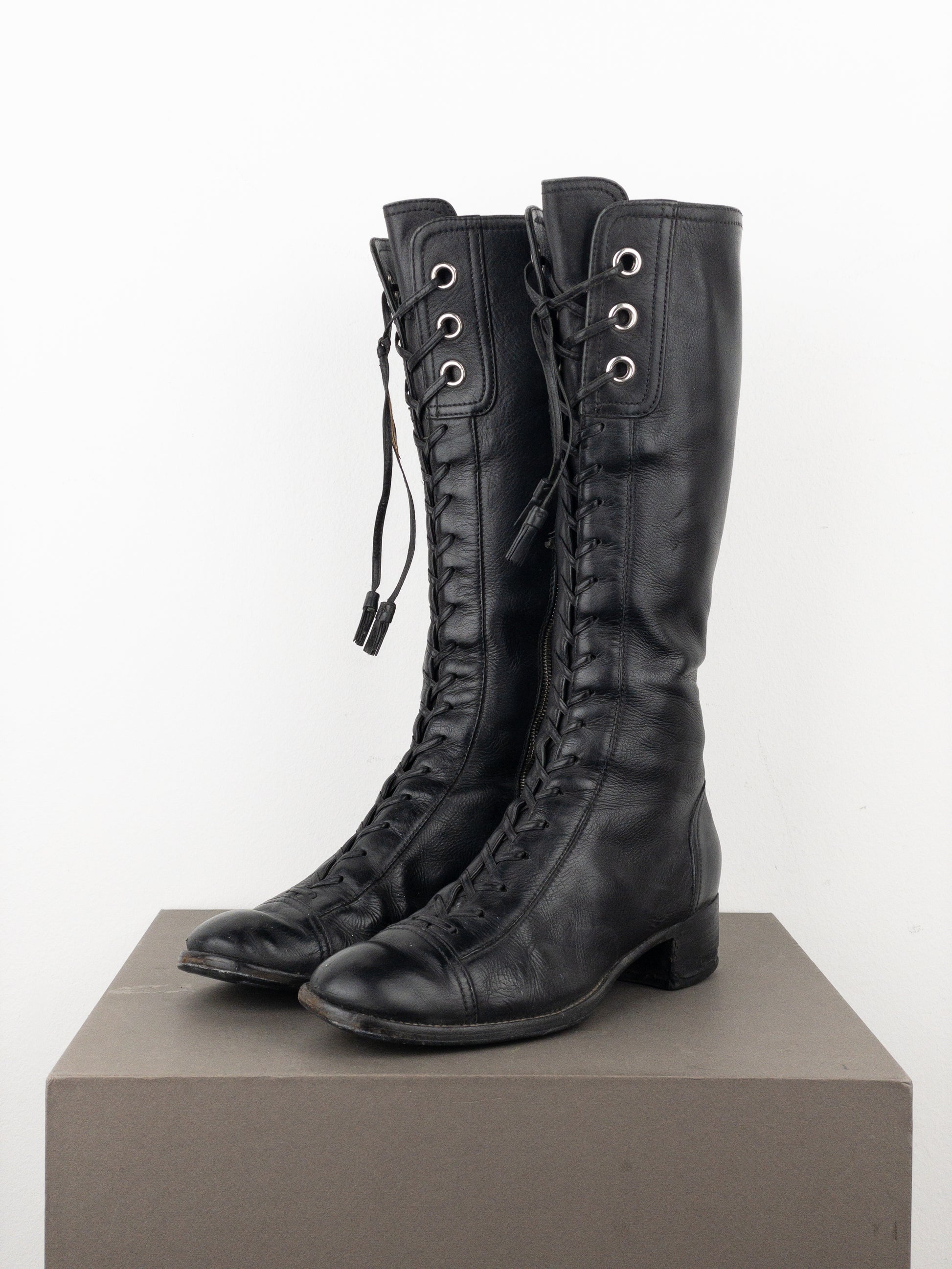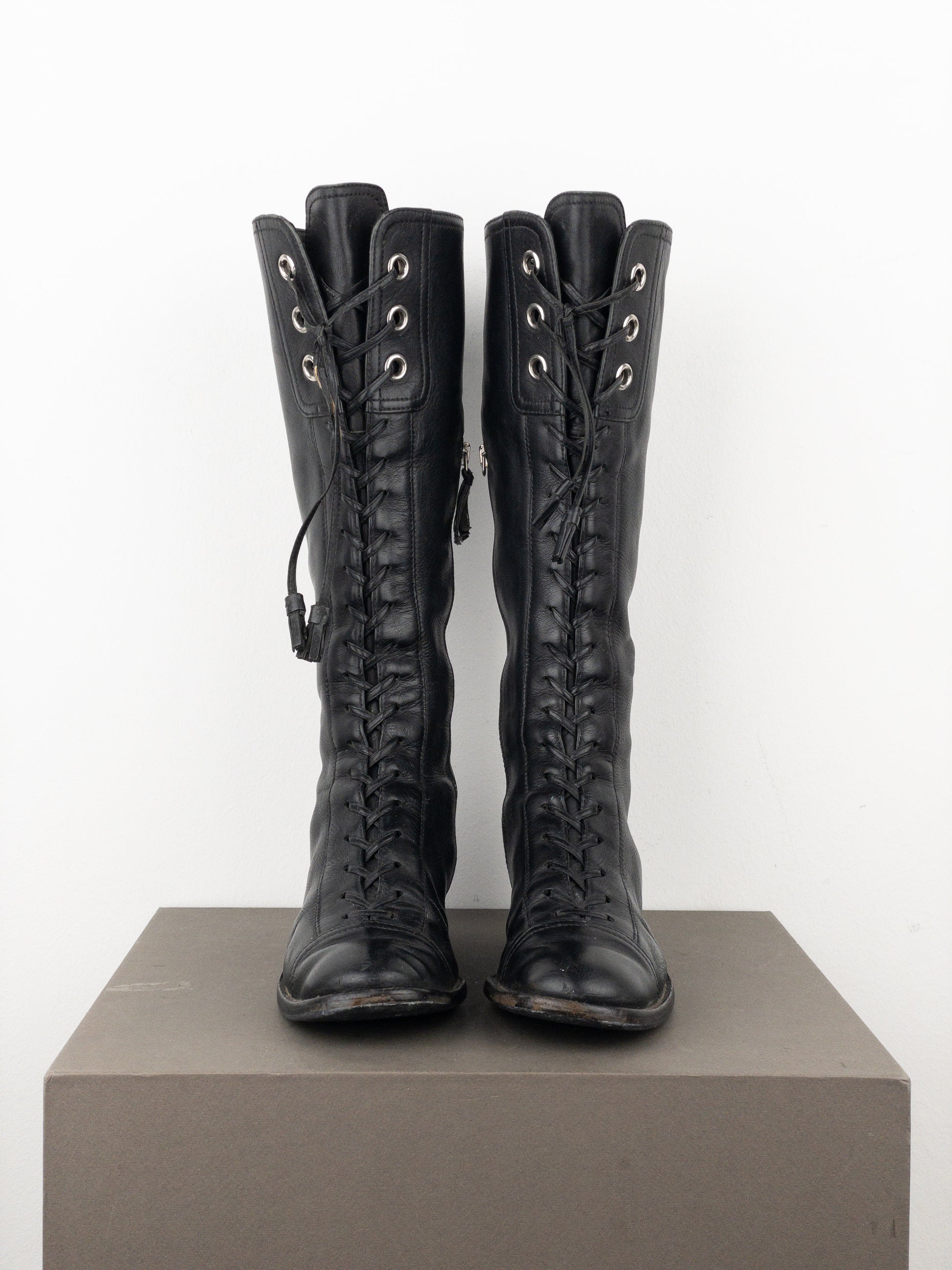 Knee-high black leather lace-up boots with metal eyelets at the top and a zipper on the inside of the shaft, from the 2000s.