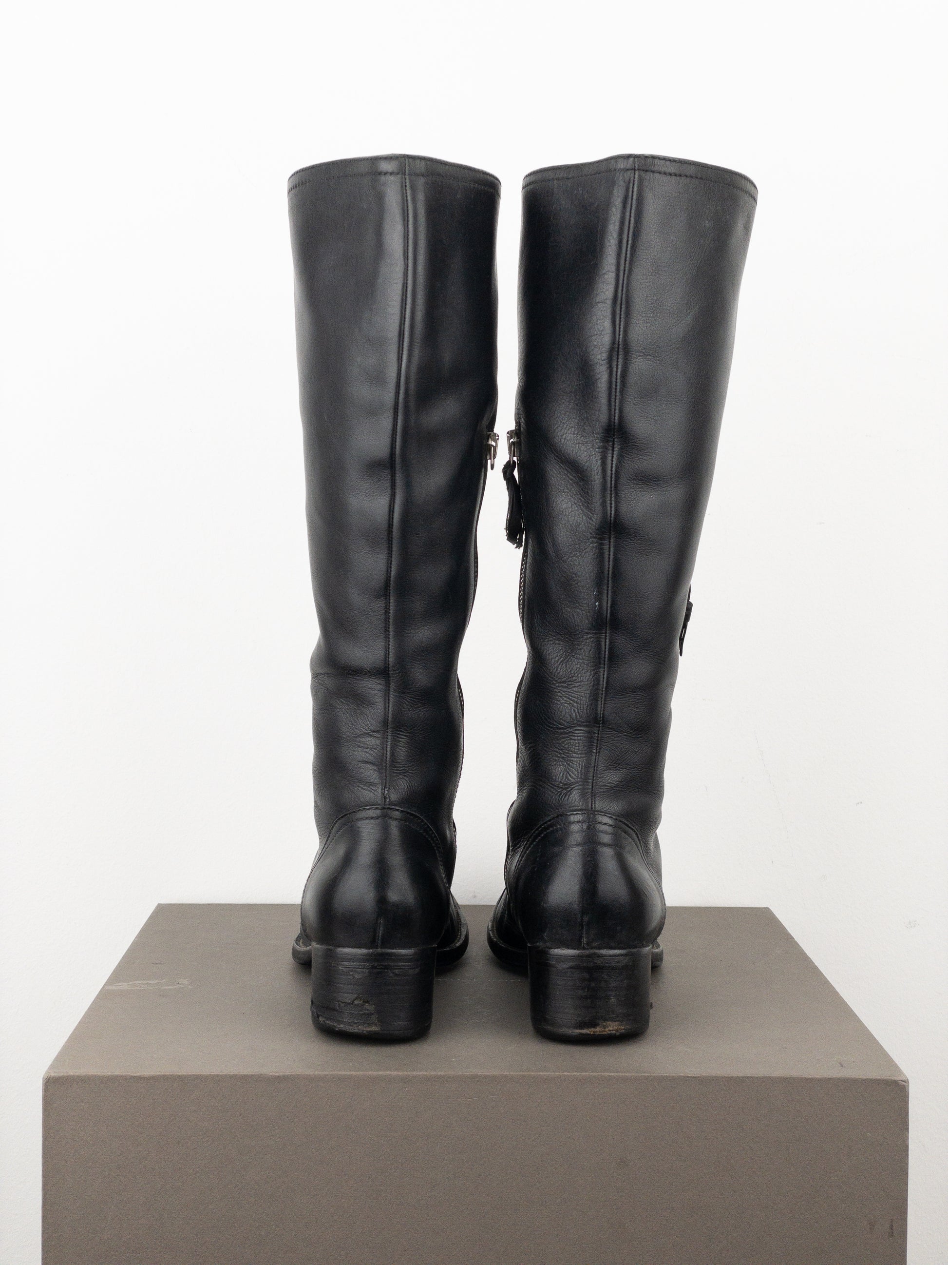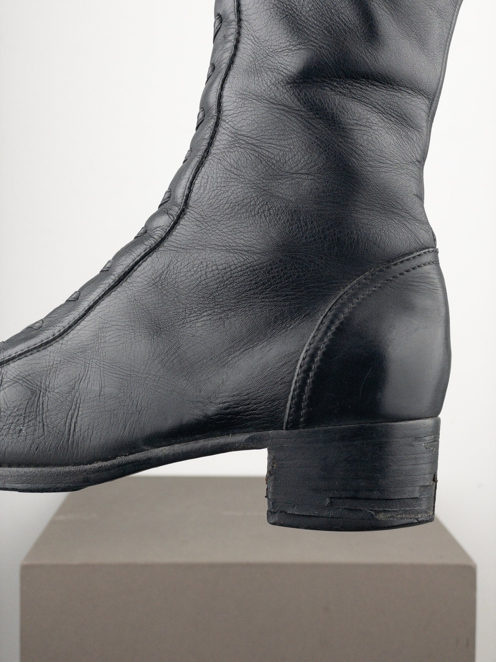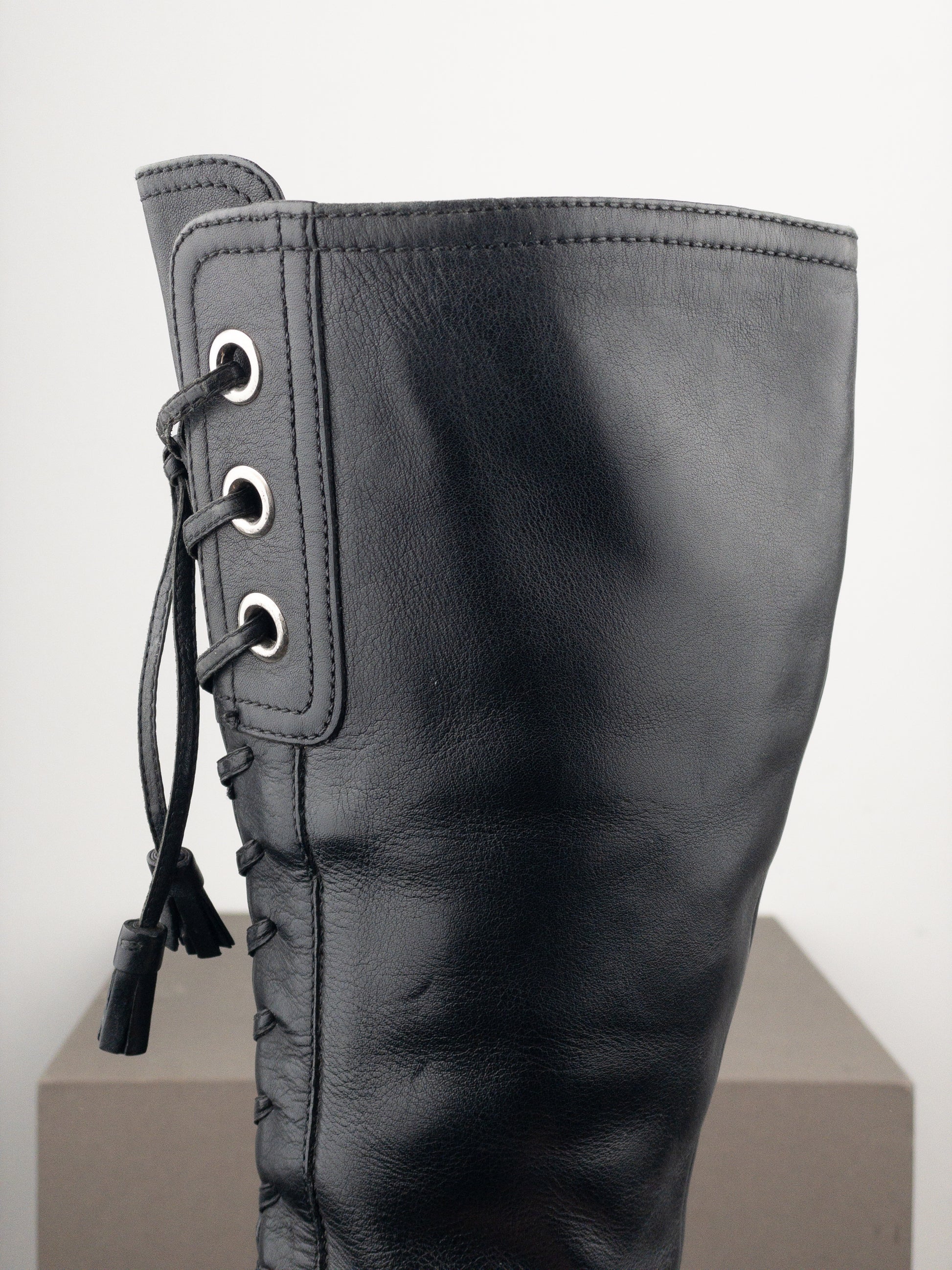 Knee-high black leather lace-up boots with metal eyelets at the top and a zipper on the inside of the shaft, from the 2000s.