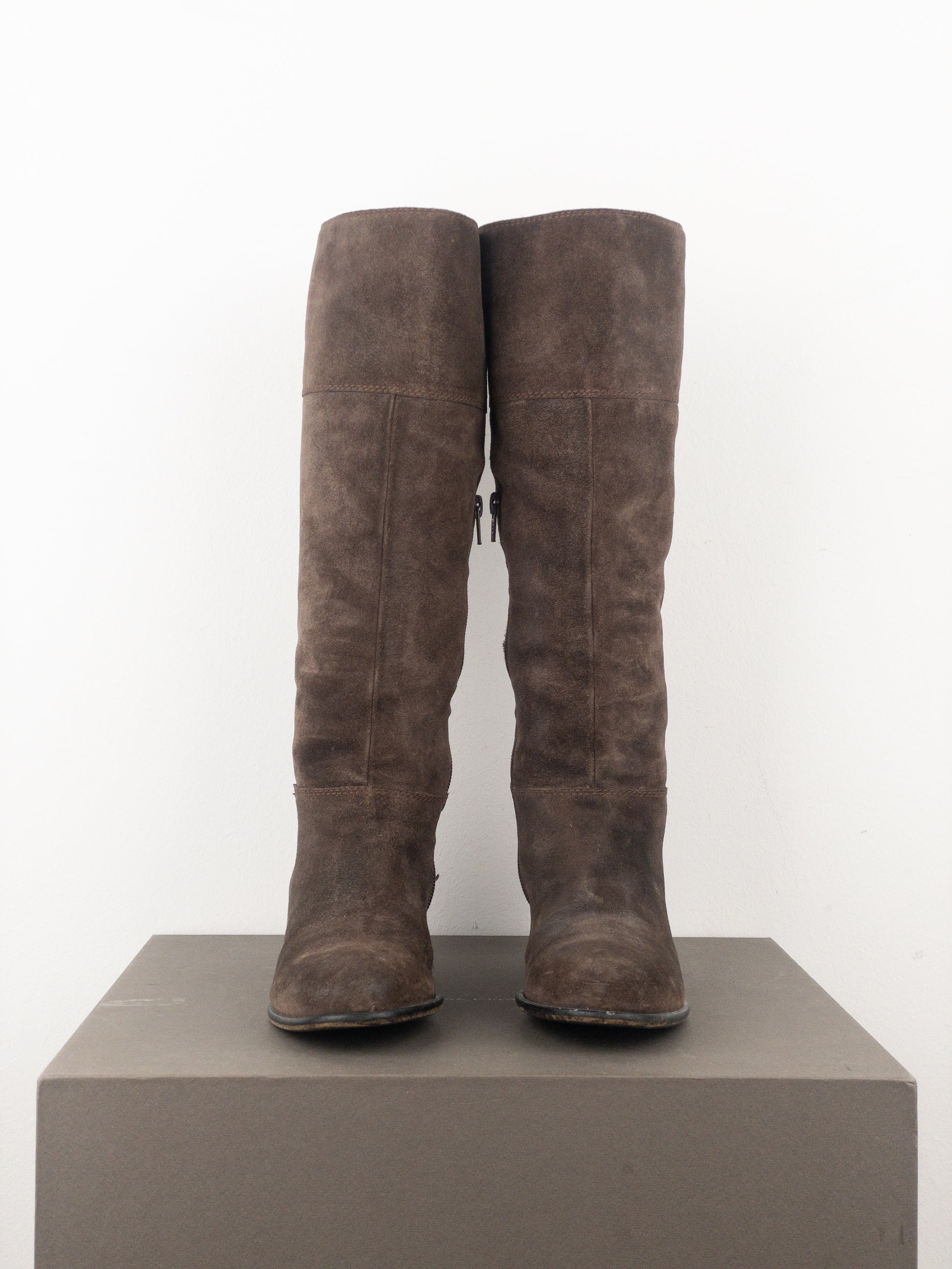 Knee high riding boots in dark-brown suede, featuring a black heel and a zipper on the inside of the shaft, from the 2000s.