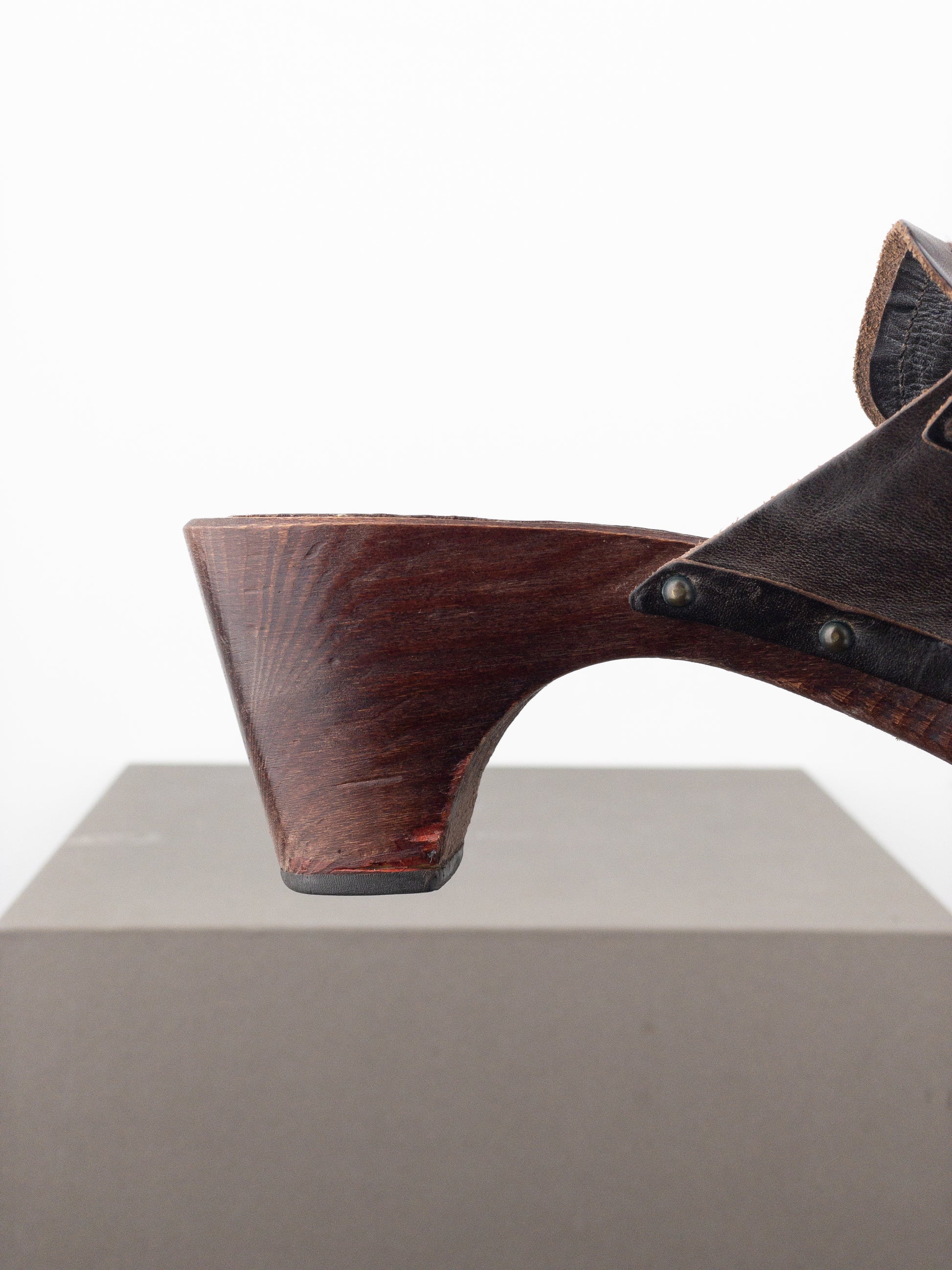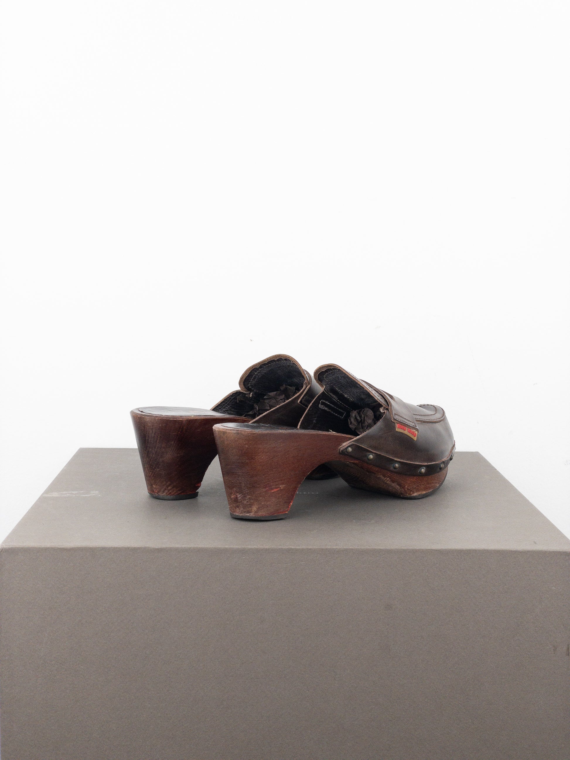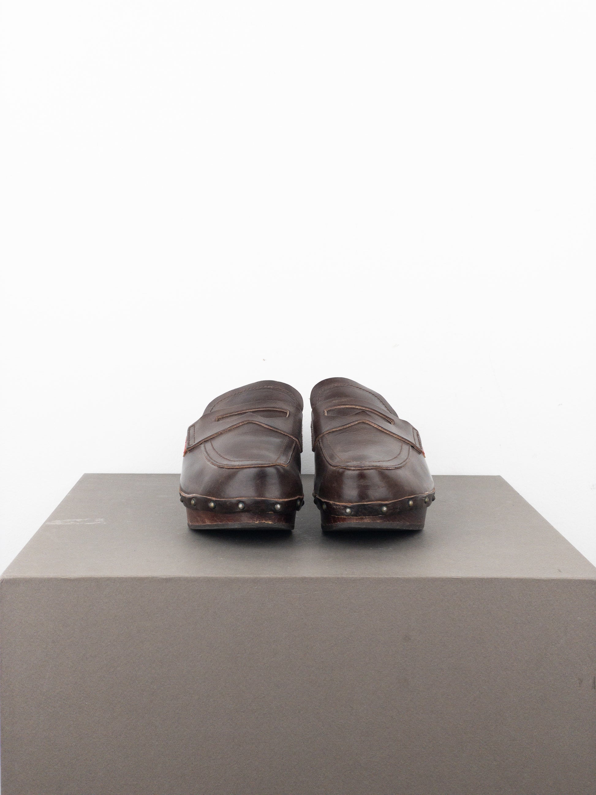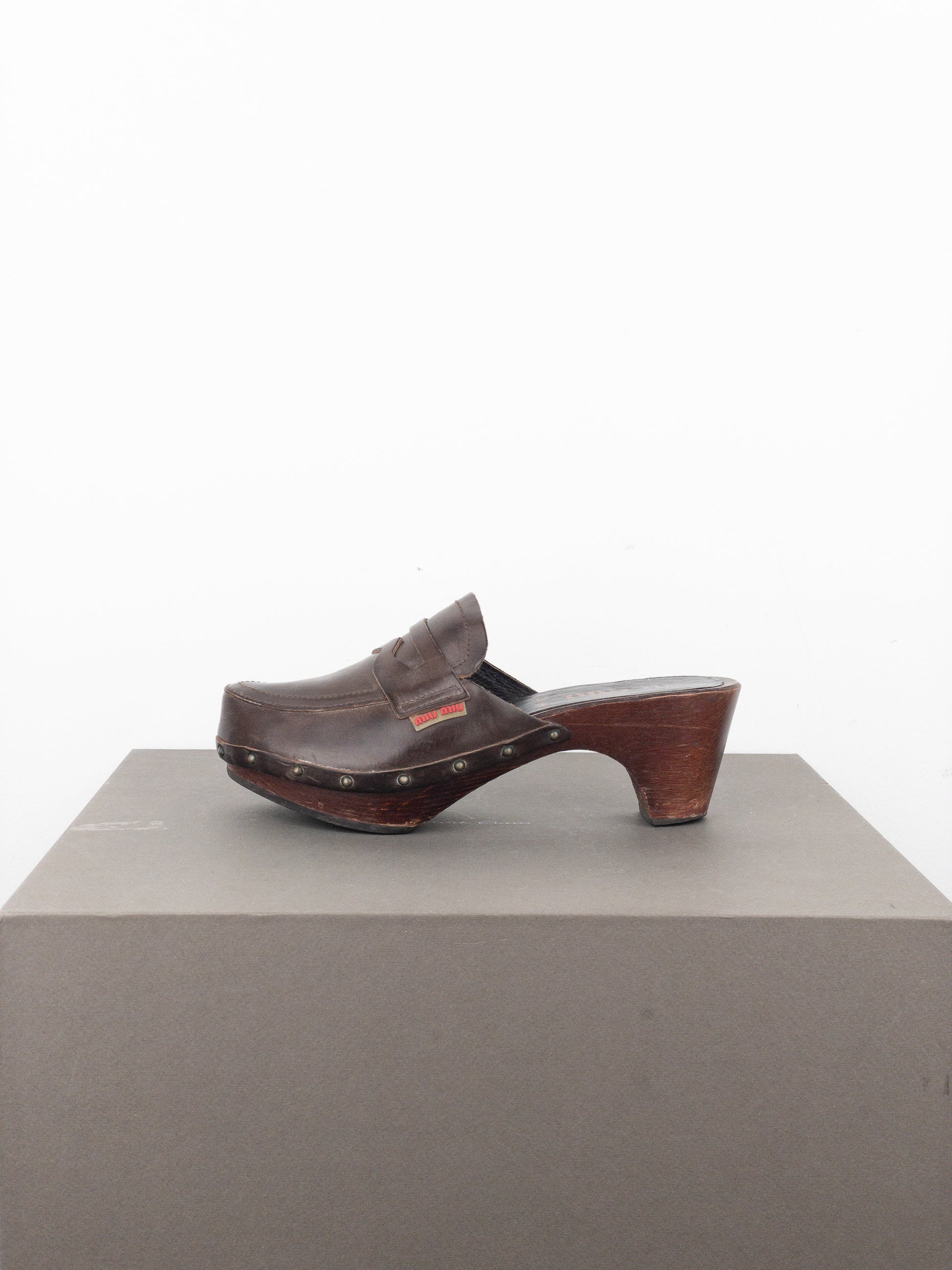 Clog mules with heeled wooden sole and dark brown leather upper reminiscent of penny loafers, from the 2000s.