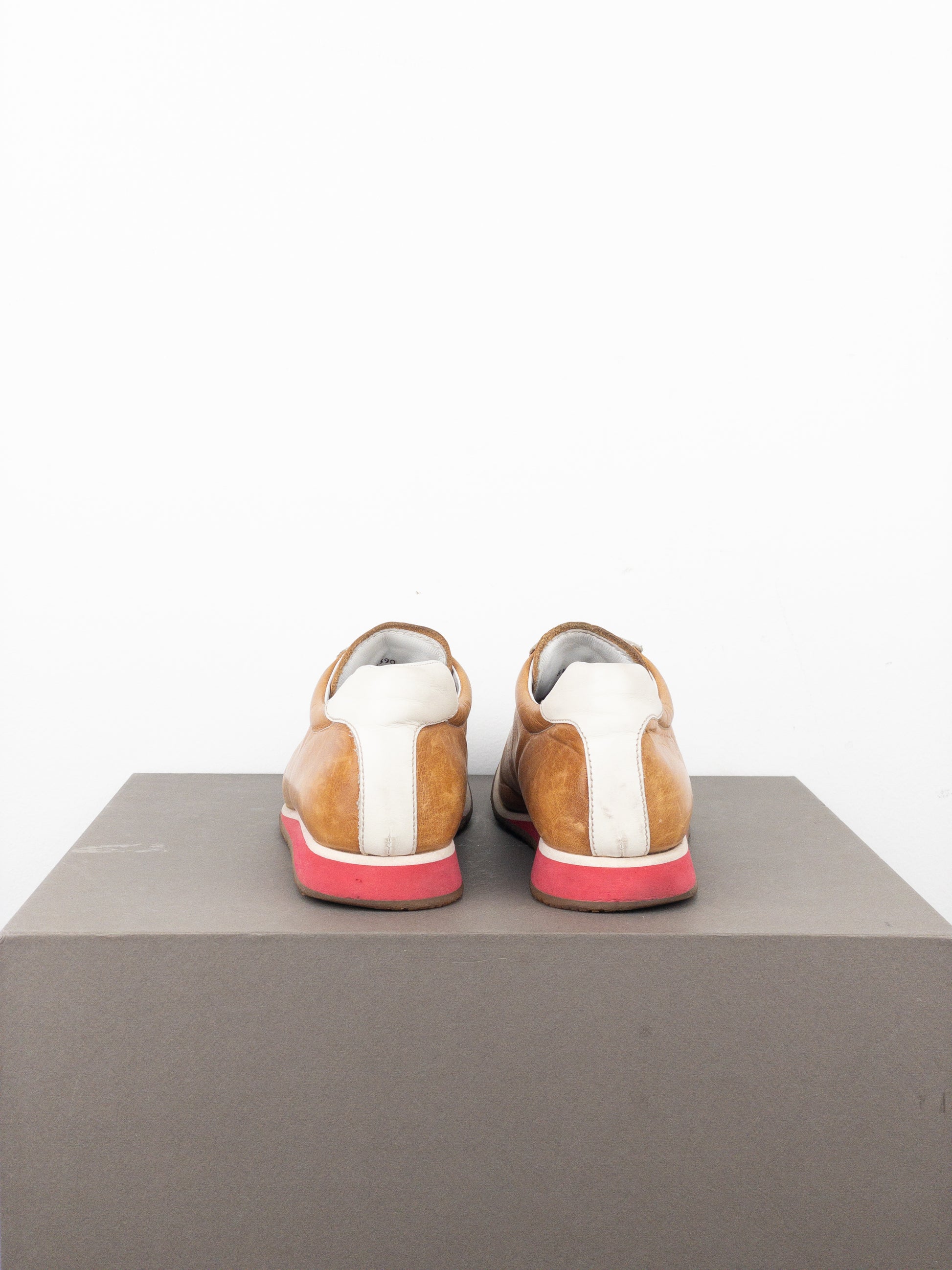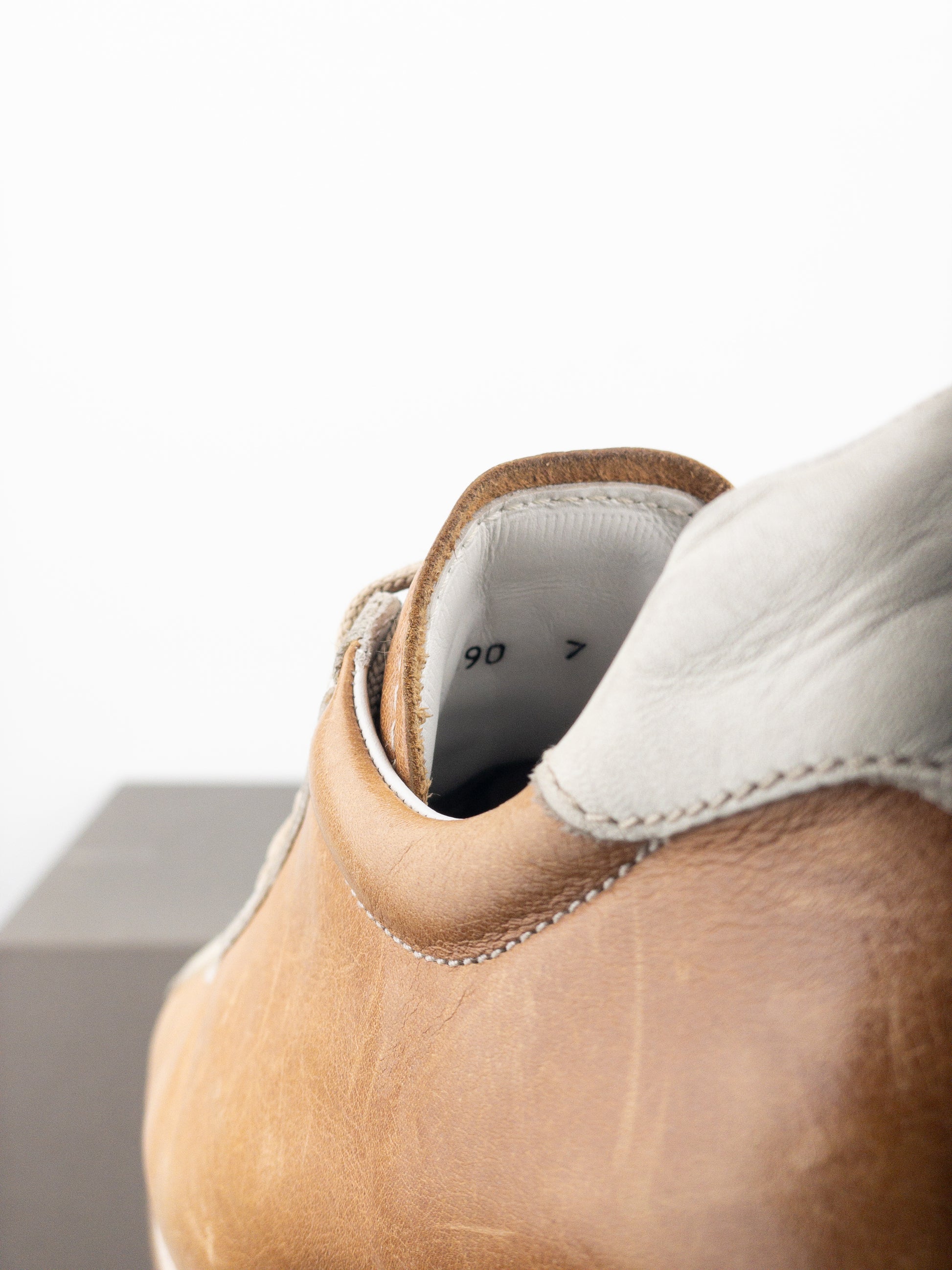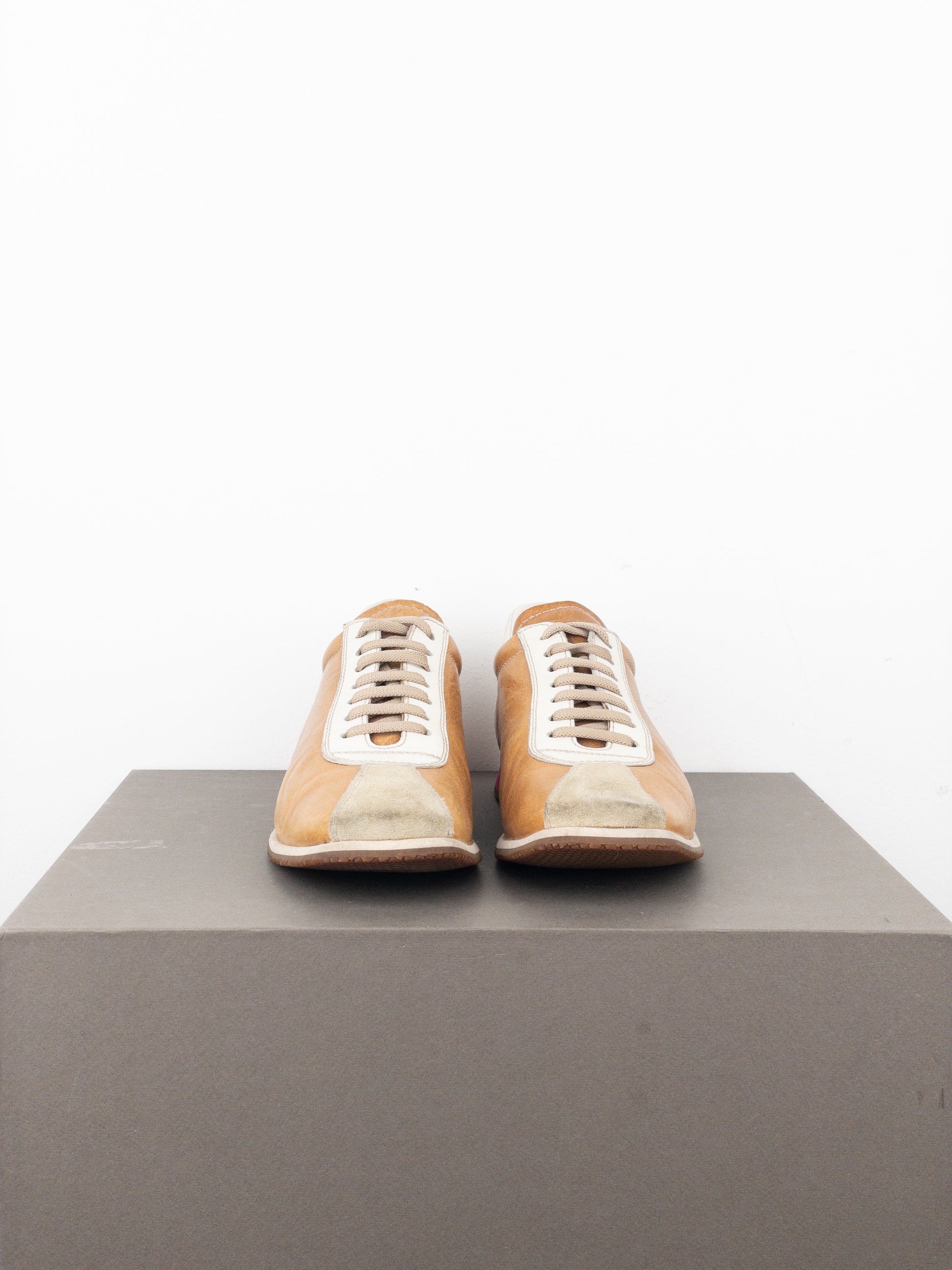 Low top sneakers in light brown and white leather with a suede toecap, featuring a slight square toe and a flat sole reminiscent of vintage running or sprots shoes, from the 2000s.