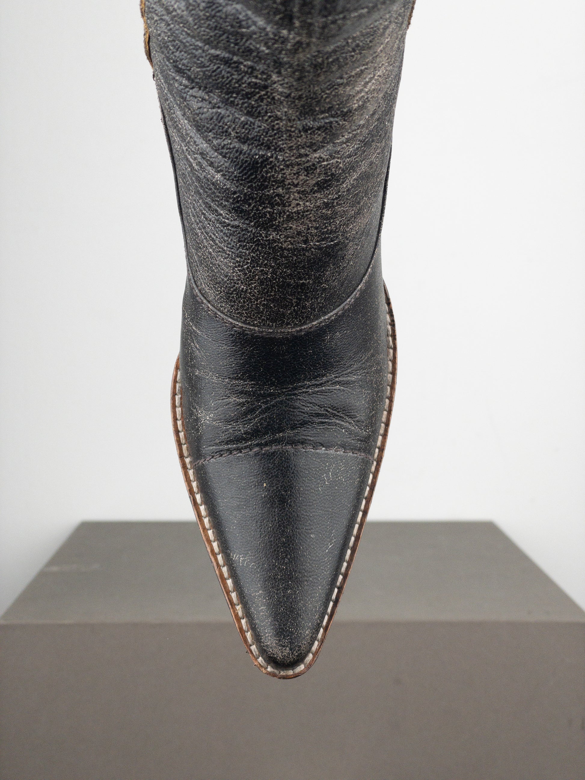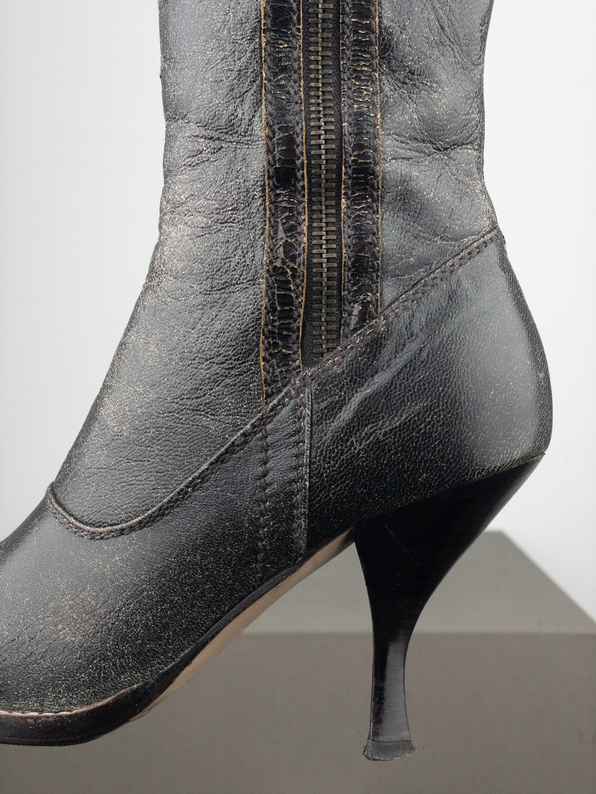 Ankle heel boots in dark brown leather with a cracked finish, featuring a pointed toe and zippers on on the inside and outside of the shaft, from the autumn-winter 2001 collection.