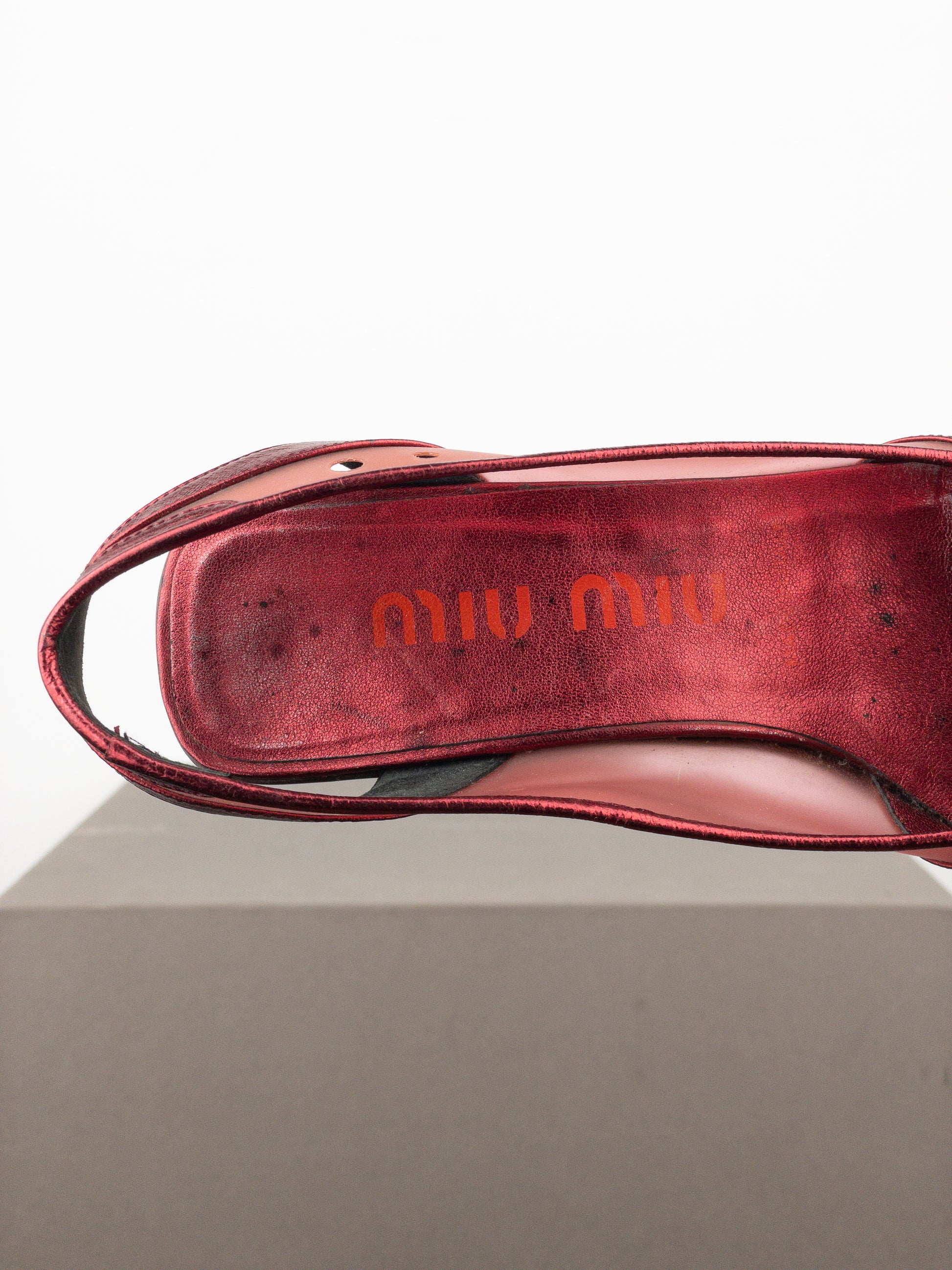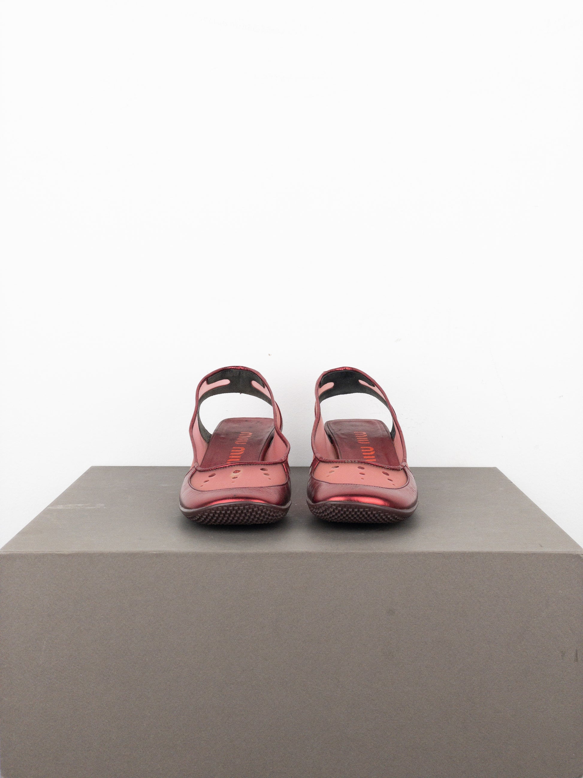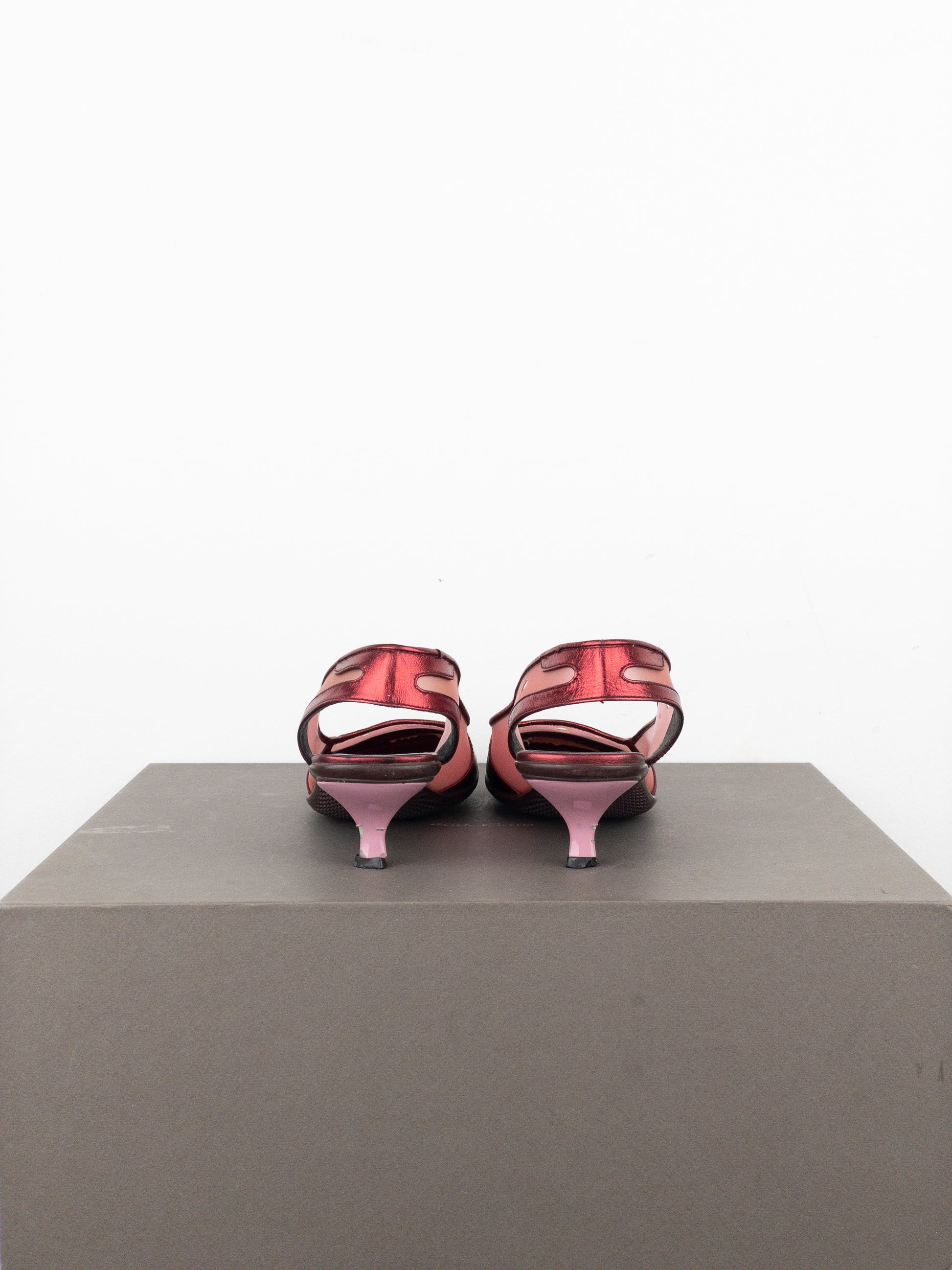 Square toe slingbacks in dark metallic red leather and transparent plastic, featuring bubbles on the toebox, a pink kitten heel, and a ripple sole, from the spring-summer 2000 collection.