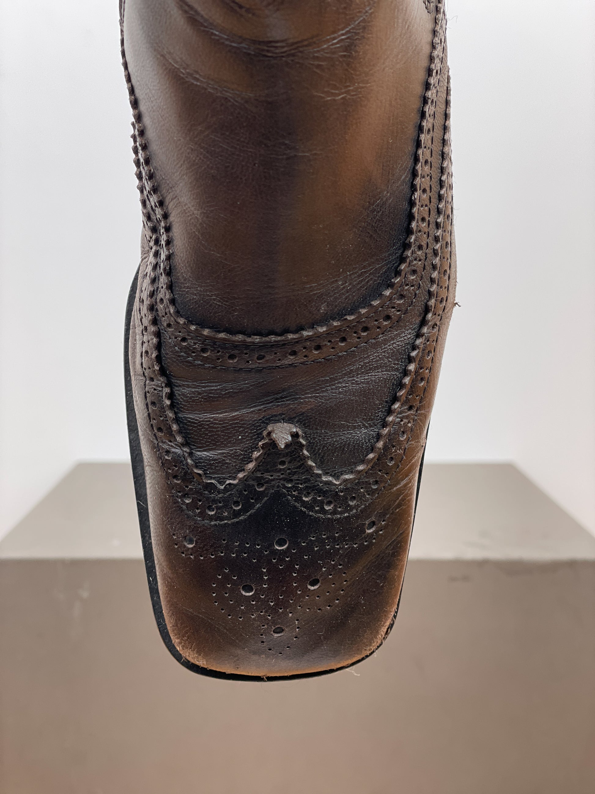 Dark brown leather chelsea ankle boots with decorative seams and brogueing throughout, featuring a cleated spike sole, from the spring-summer 1999 collection.