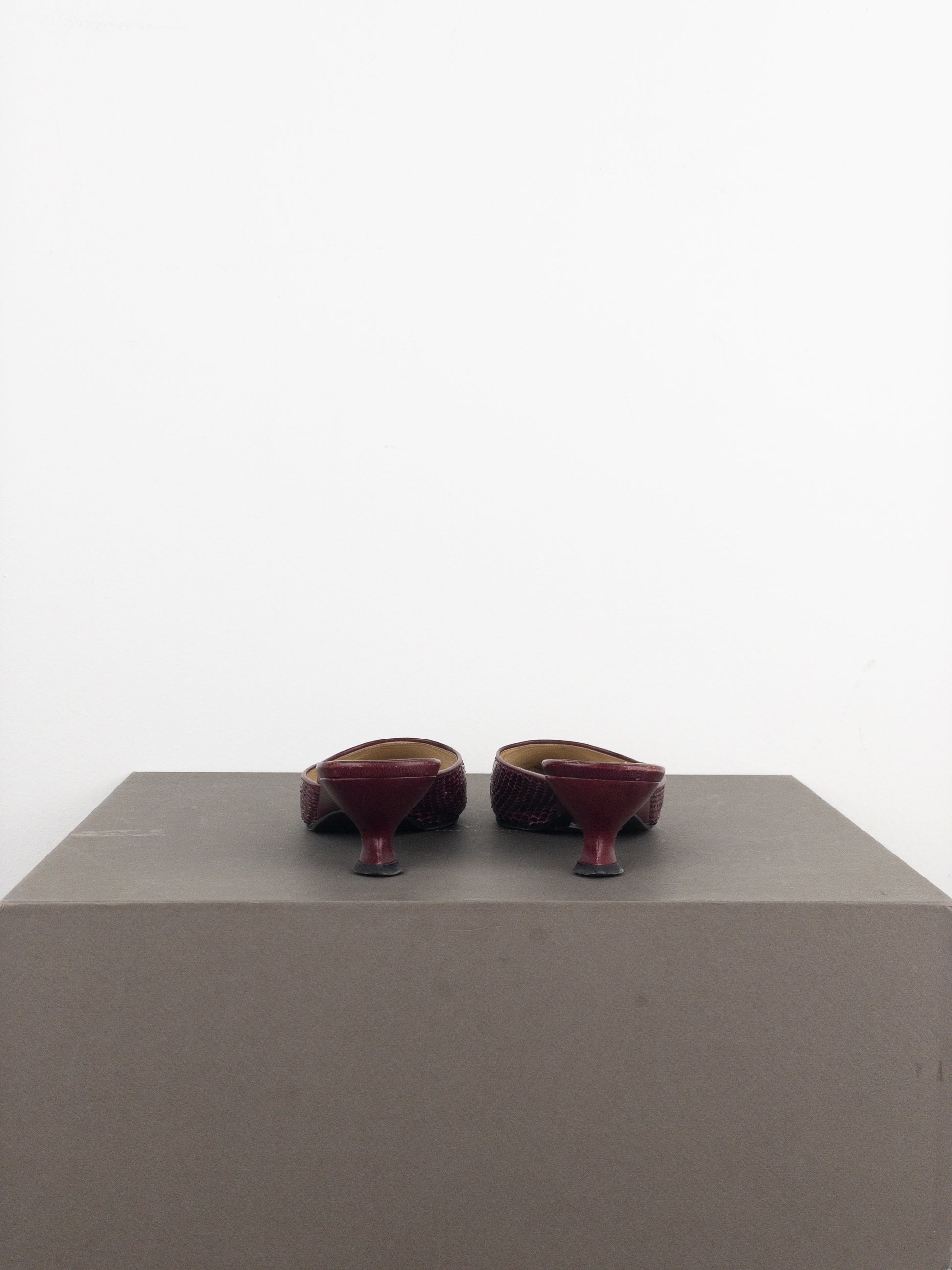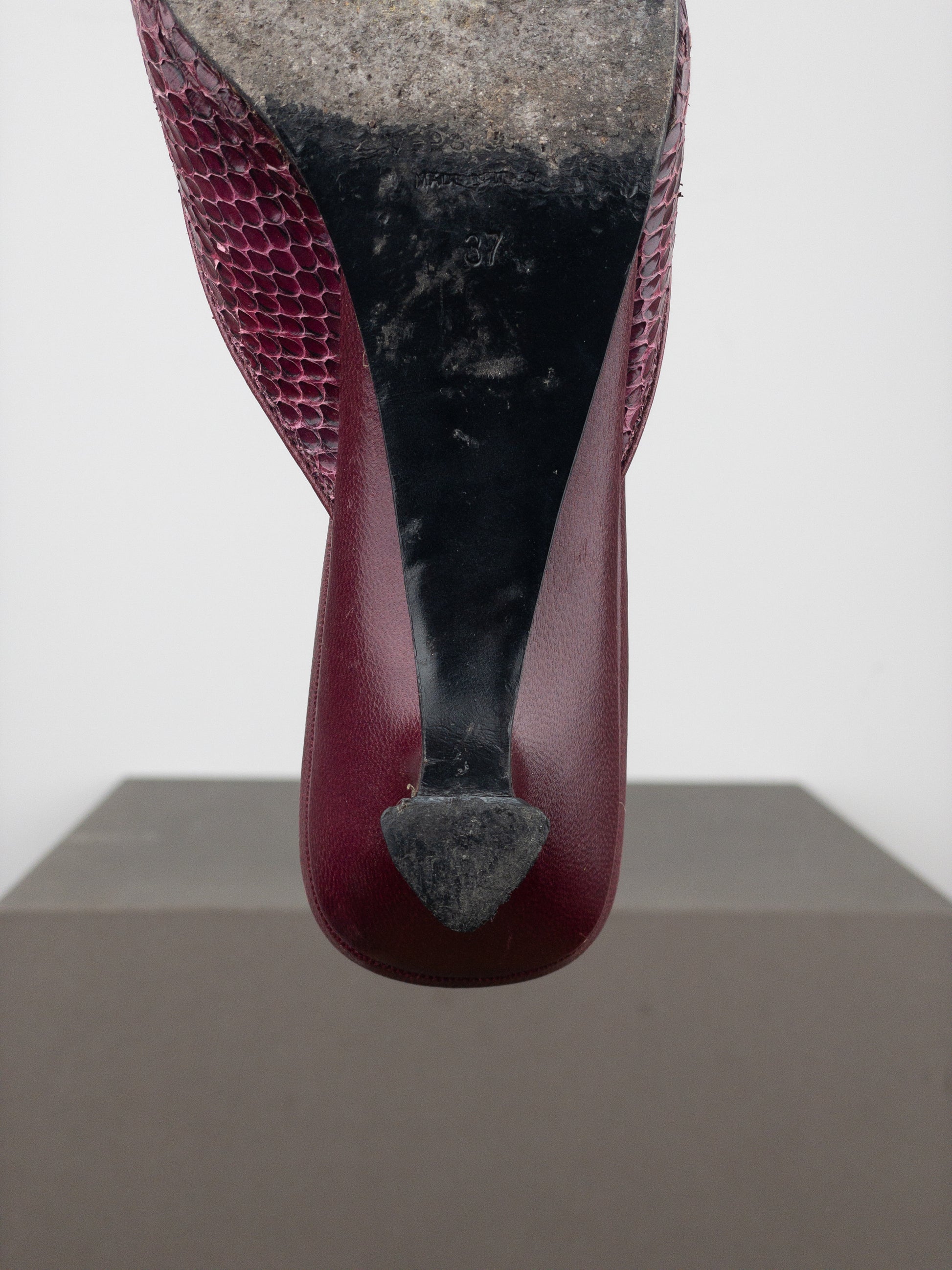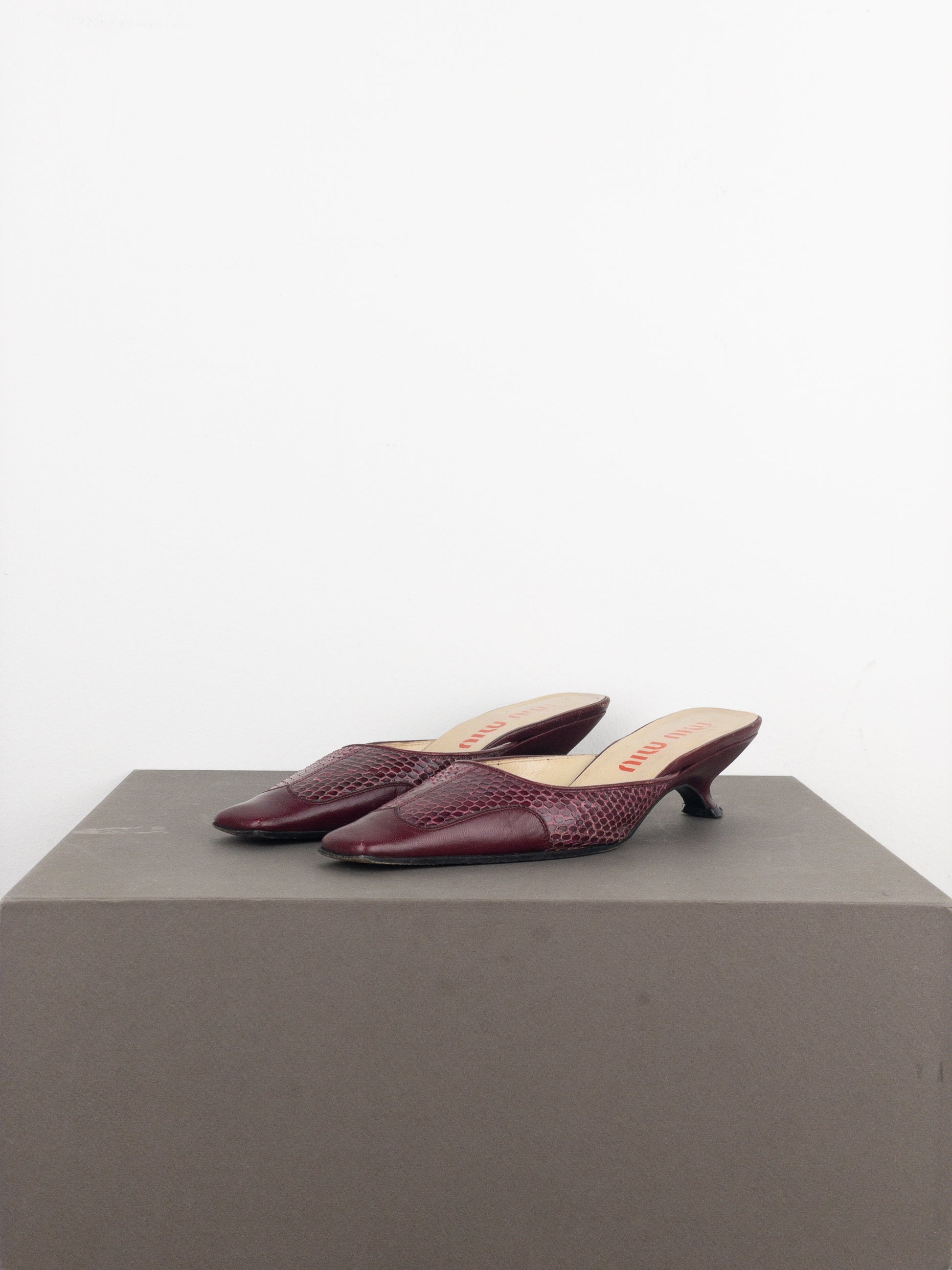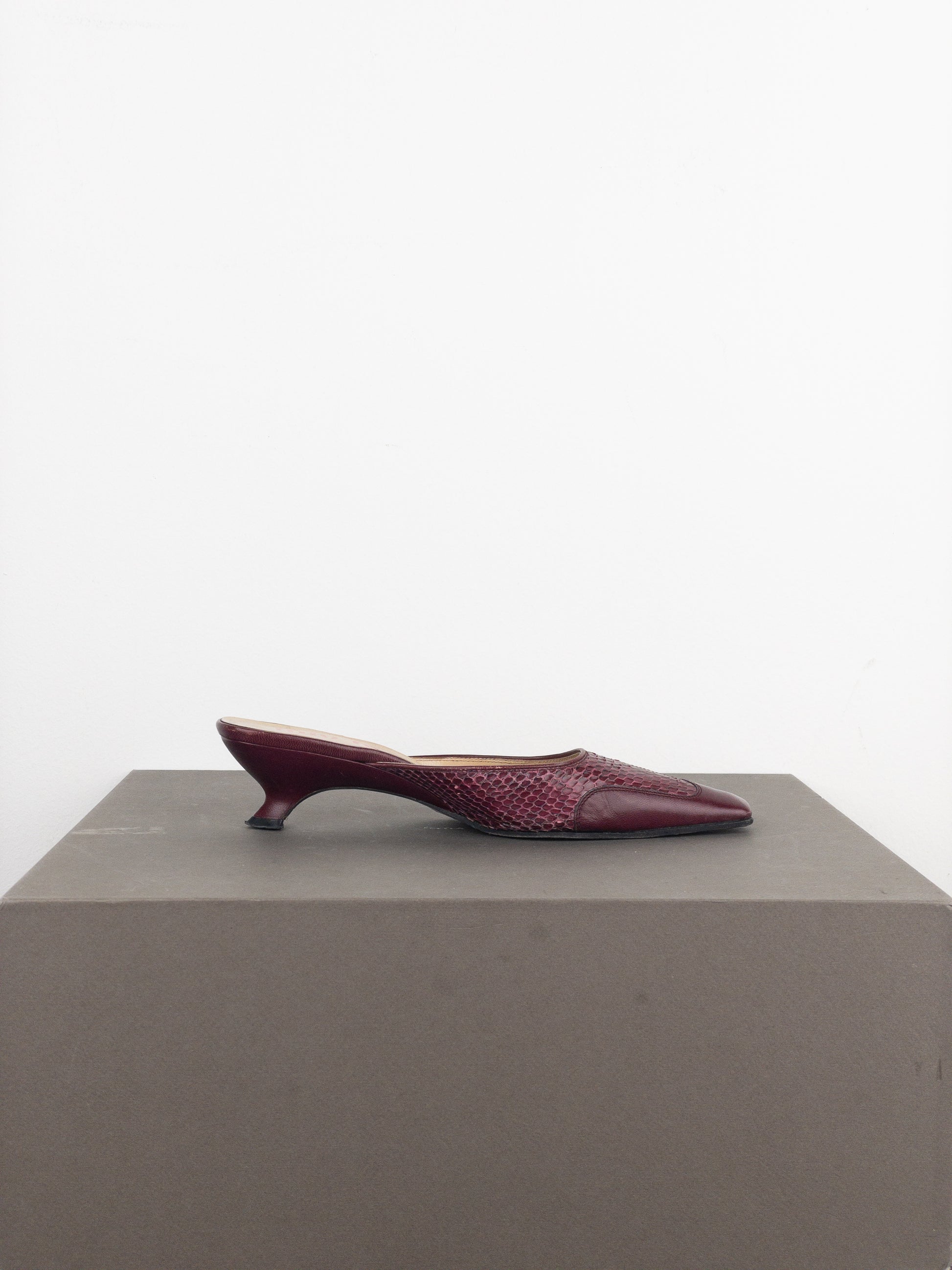 Plum colored mules in snakeskin with a slight square toe and a kitten heel, from the spring-summer 1999 collection.
