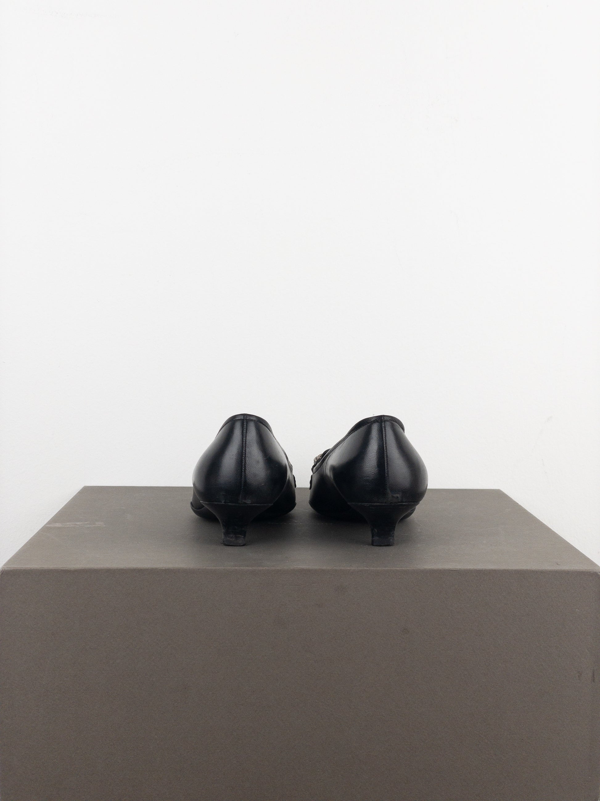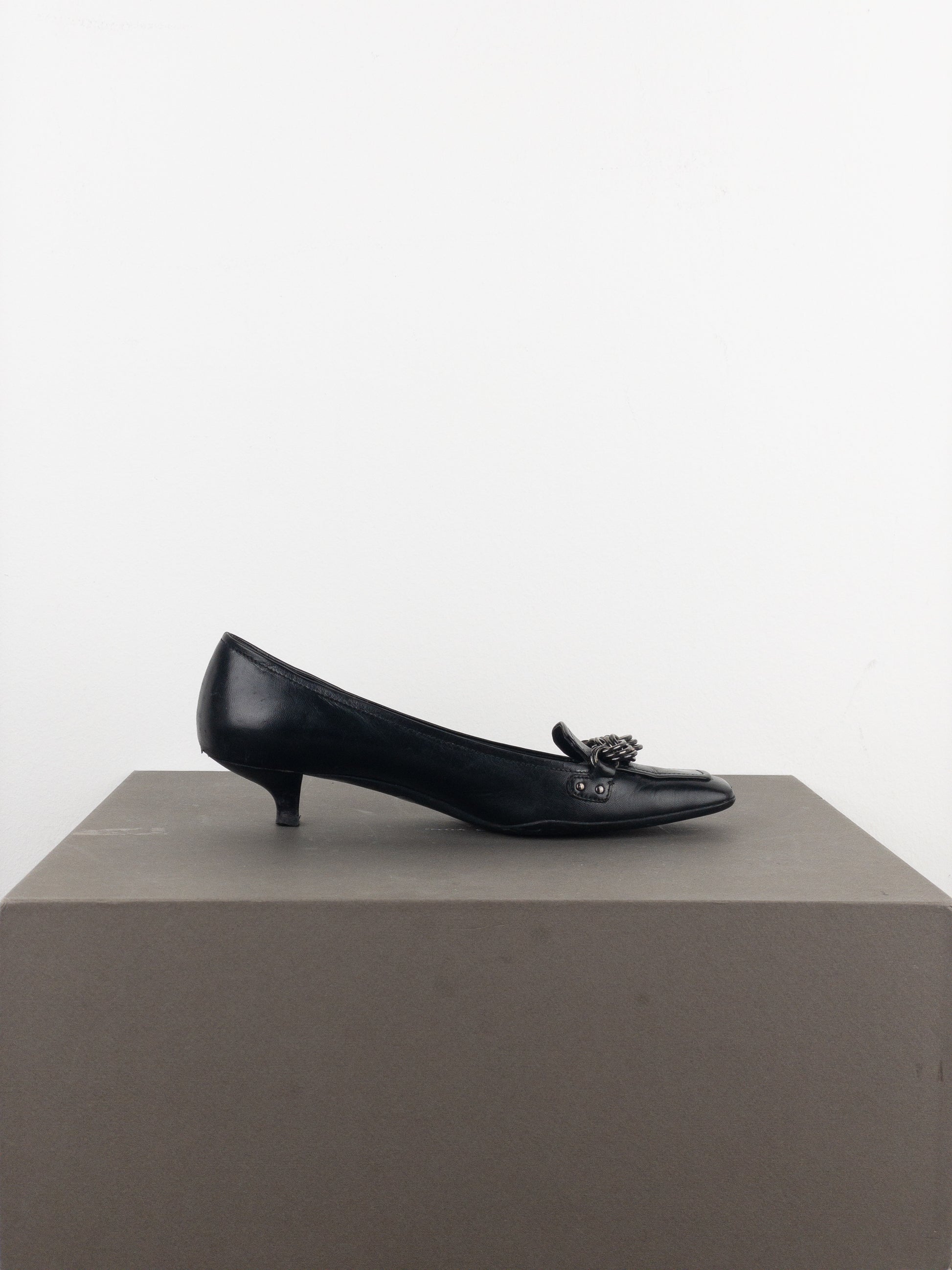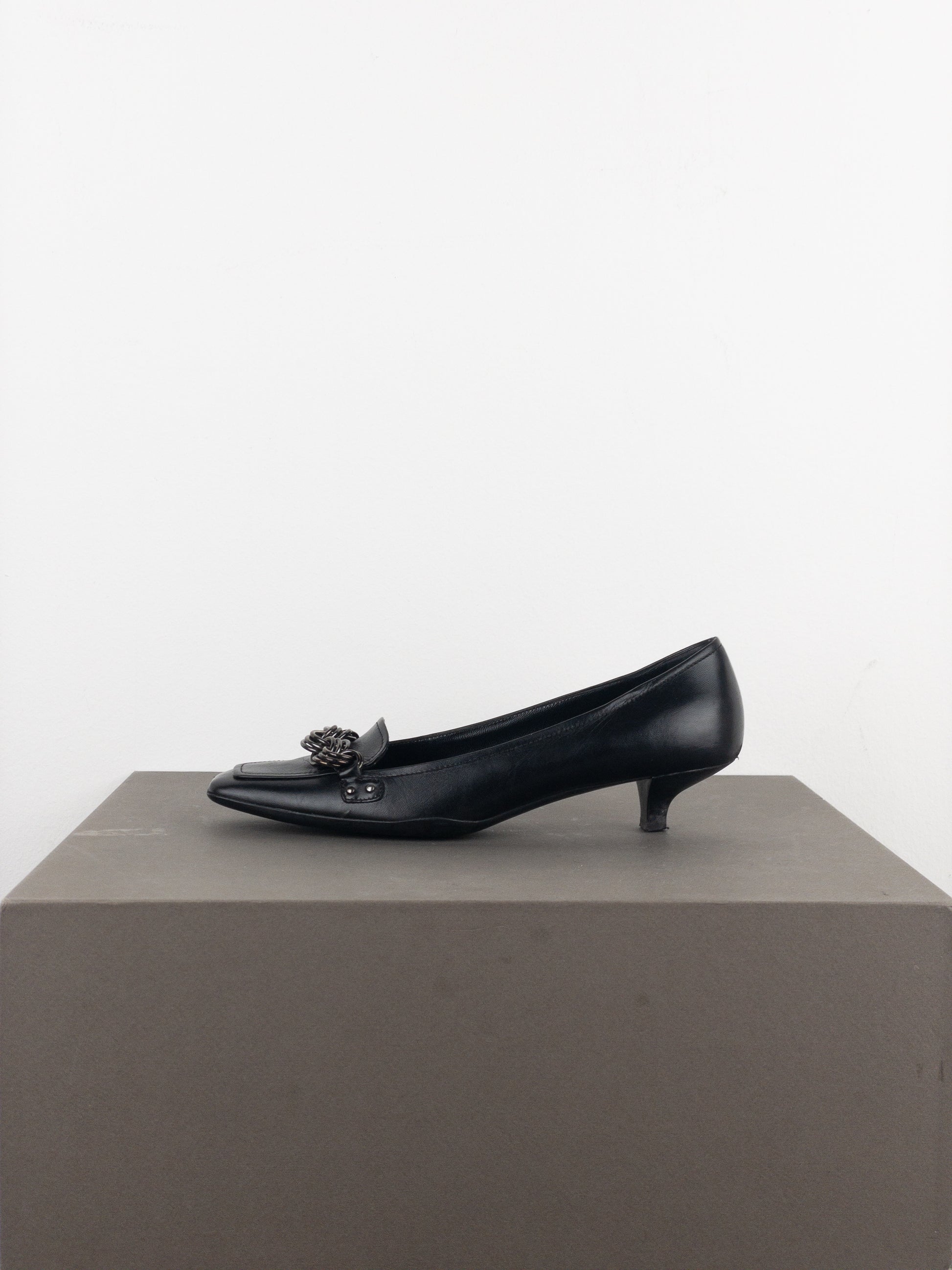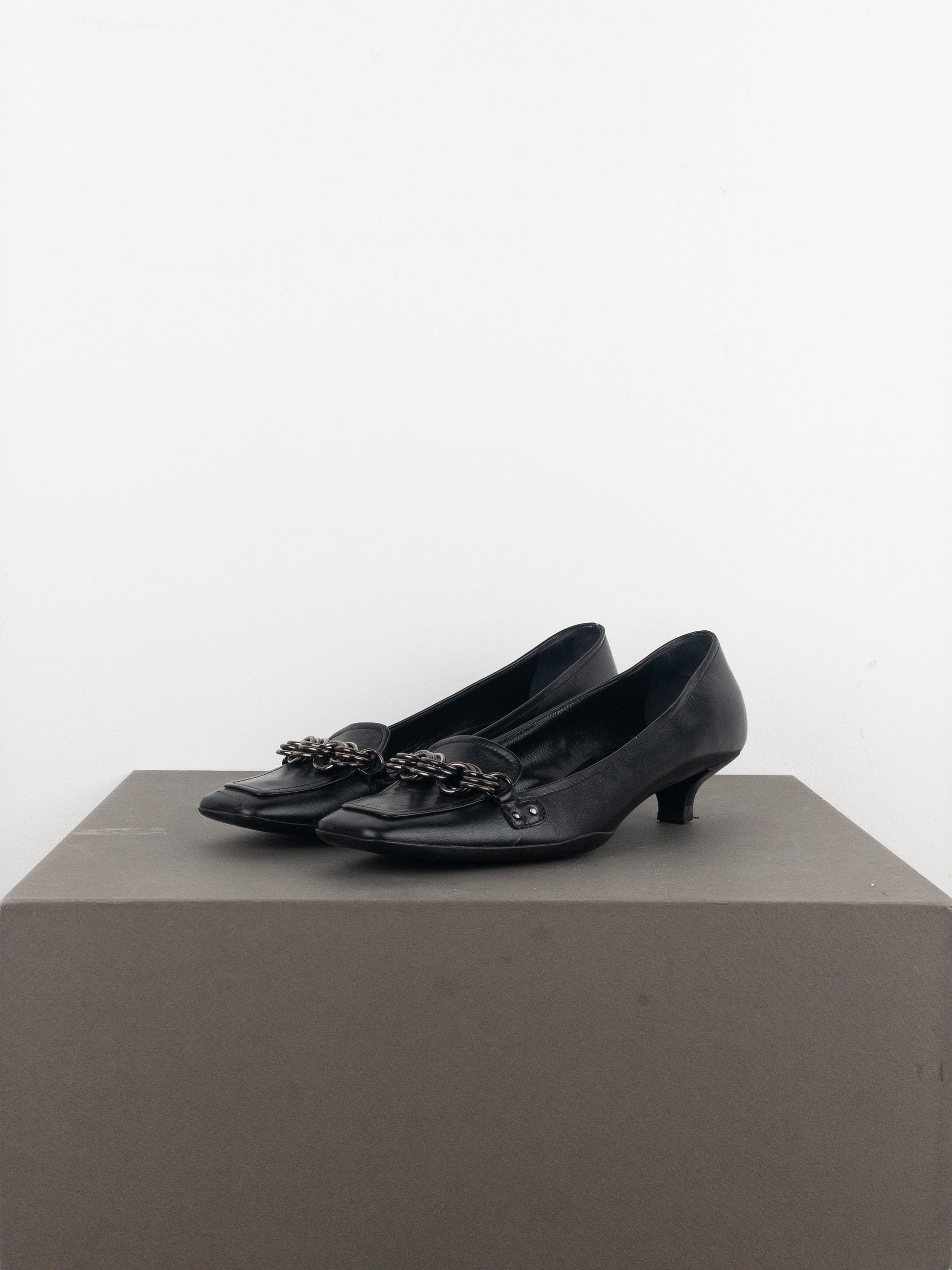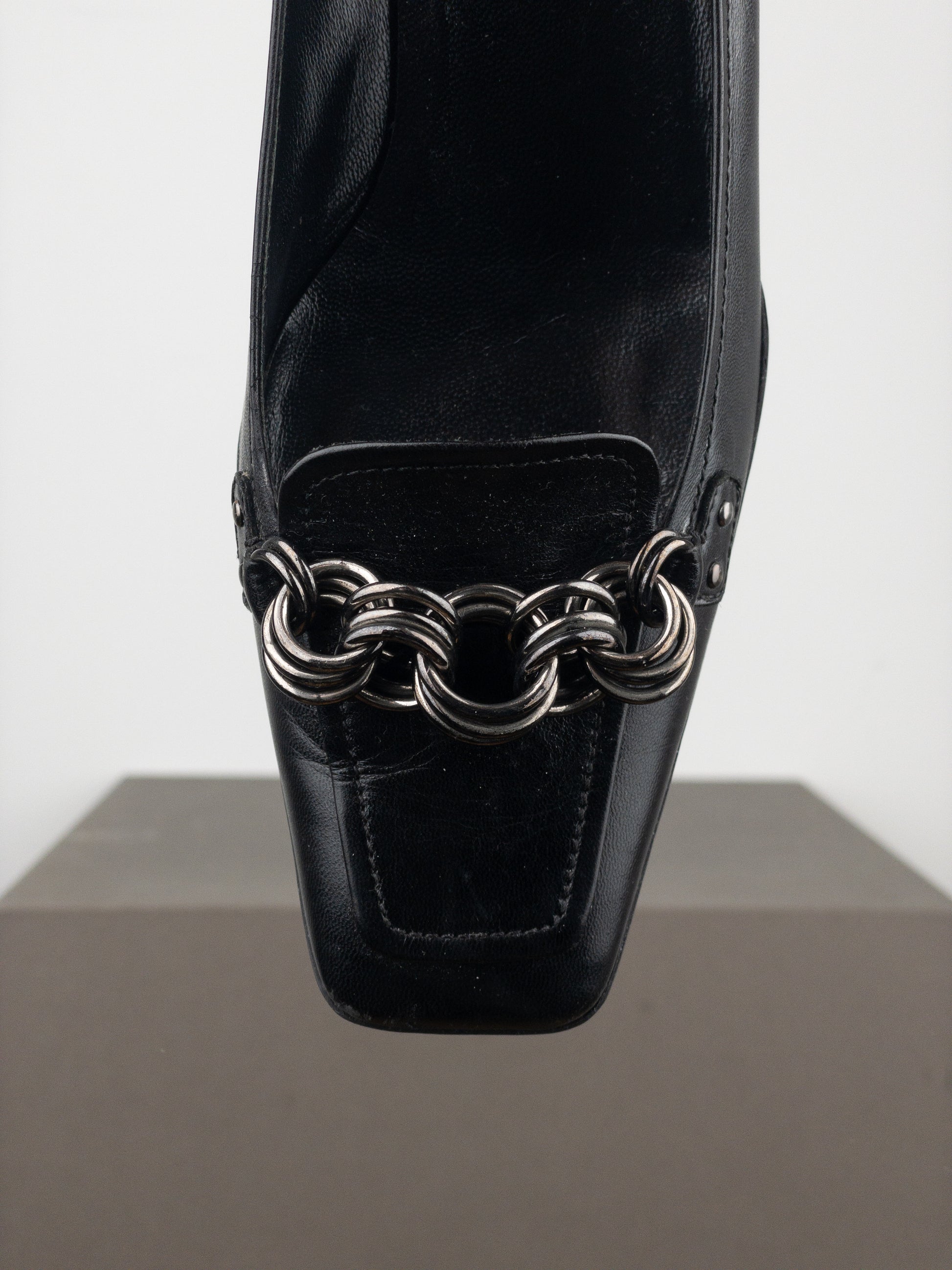 Black leather pumps with a slight square toe, featuring a kitten heel, decorative seam on the toebox, and metal ring chain on the forefoot, from the 2000s.