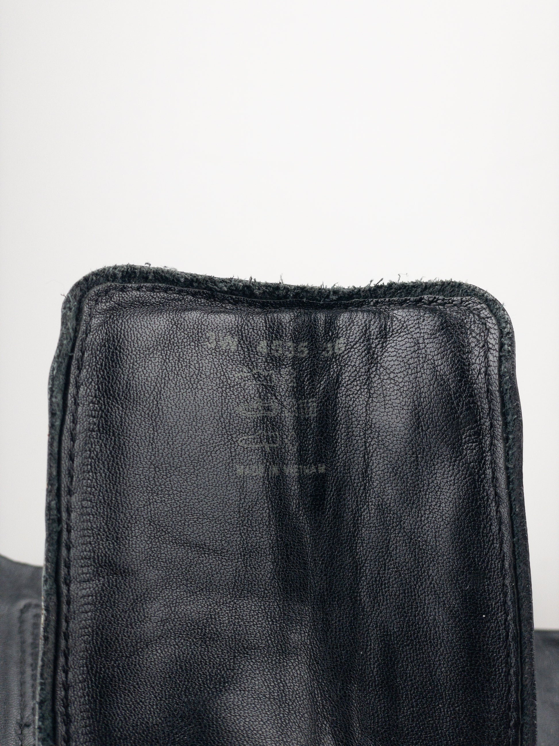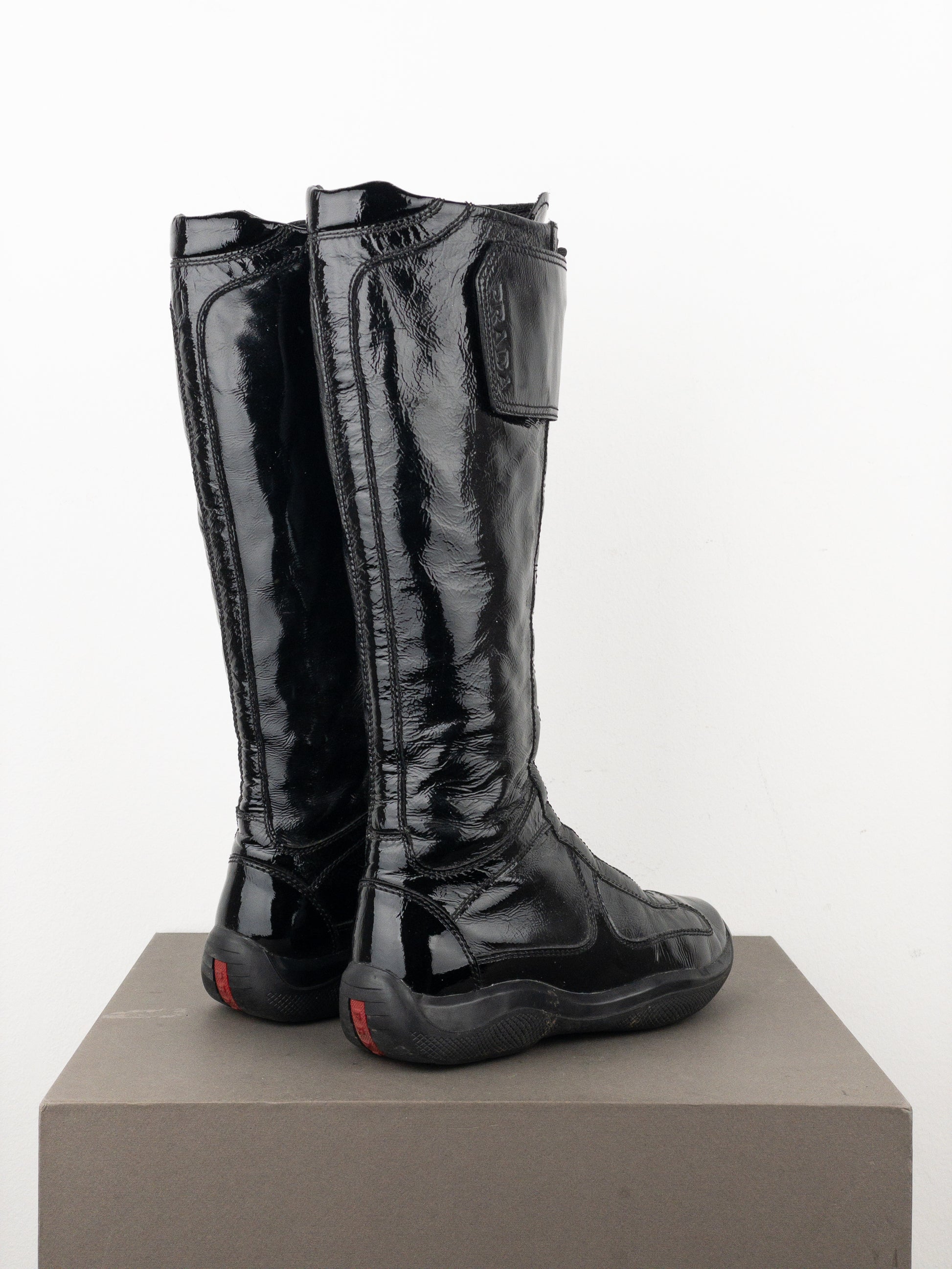 Knee-high lace-up sneaker boots in black patent leather, featuring a chunky rubber sports sole, rounded toe, and velcro clasp at the top of the shaft, from the 2000s.