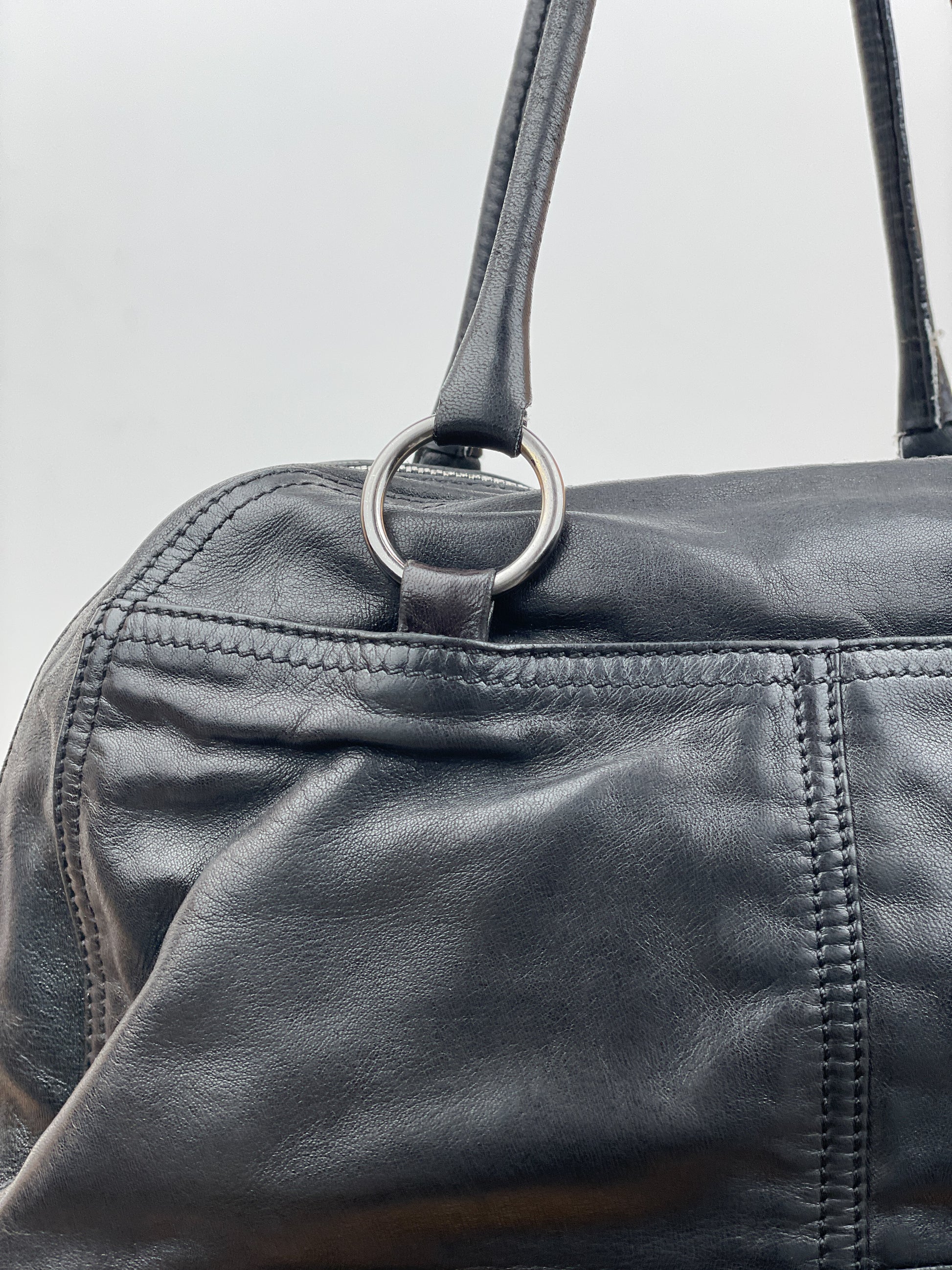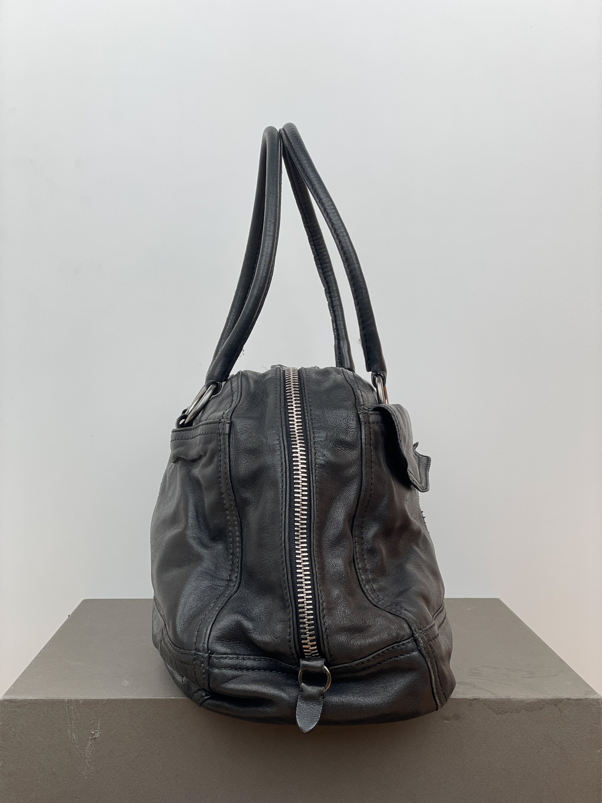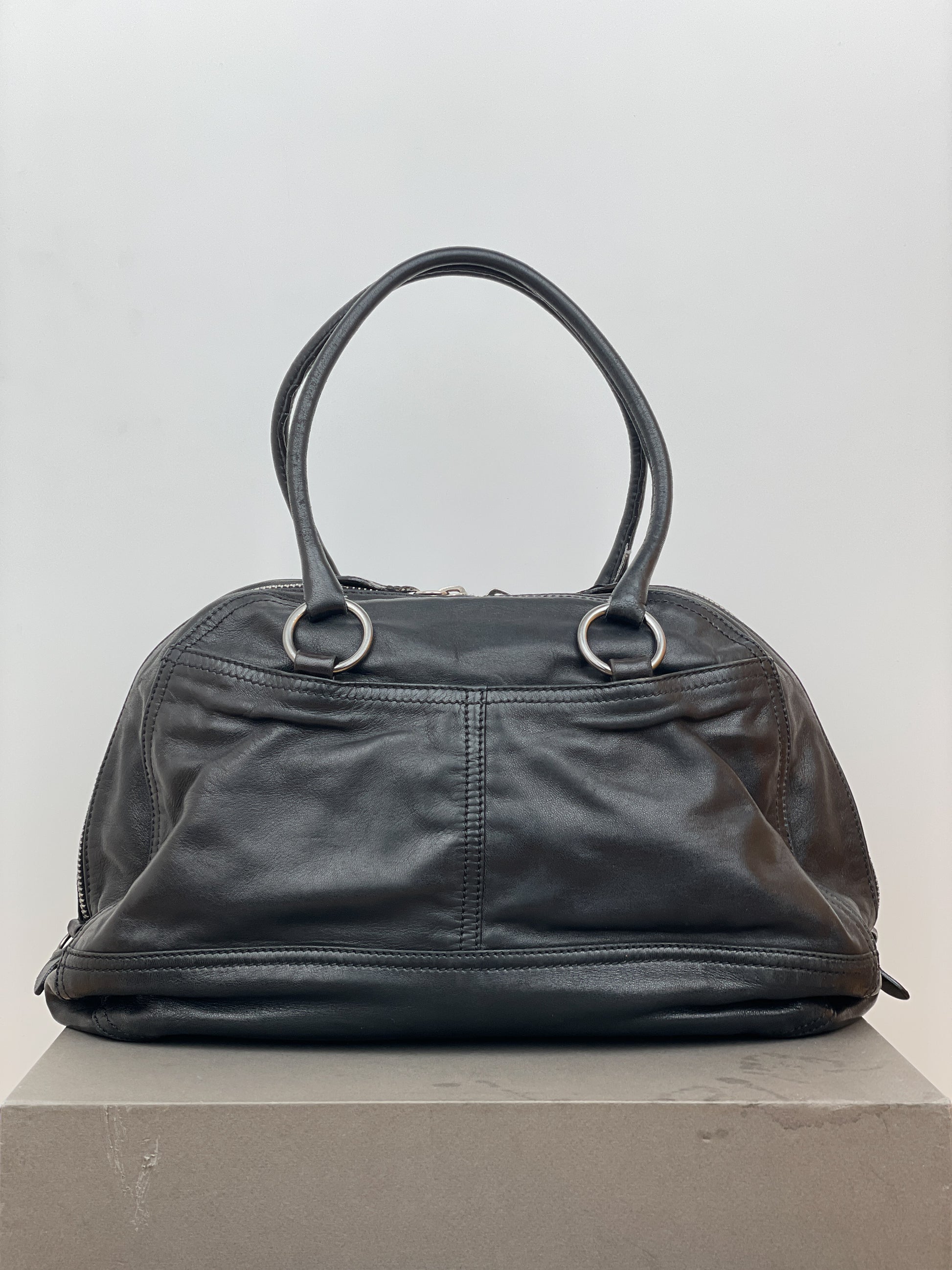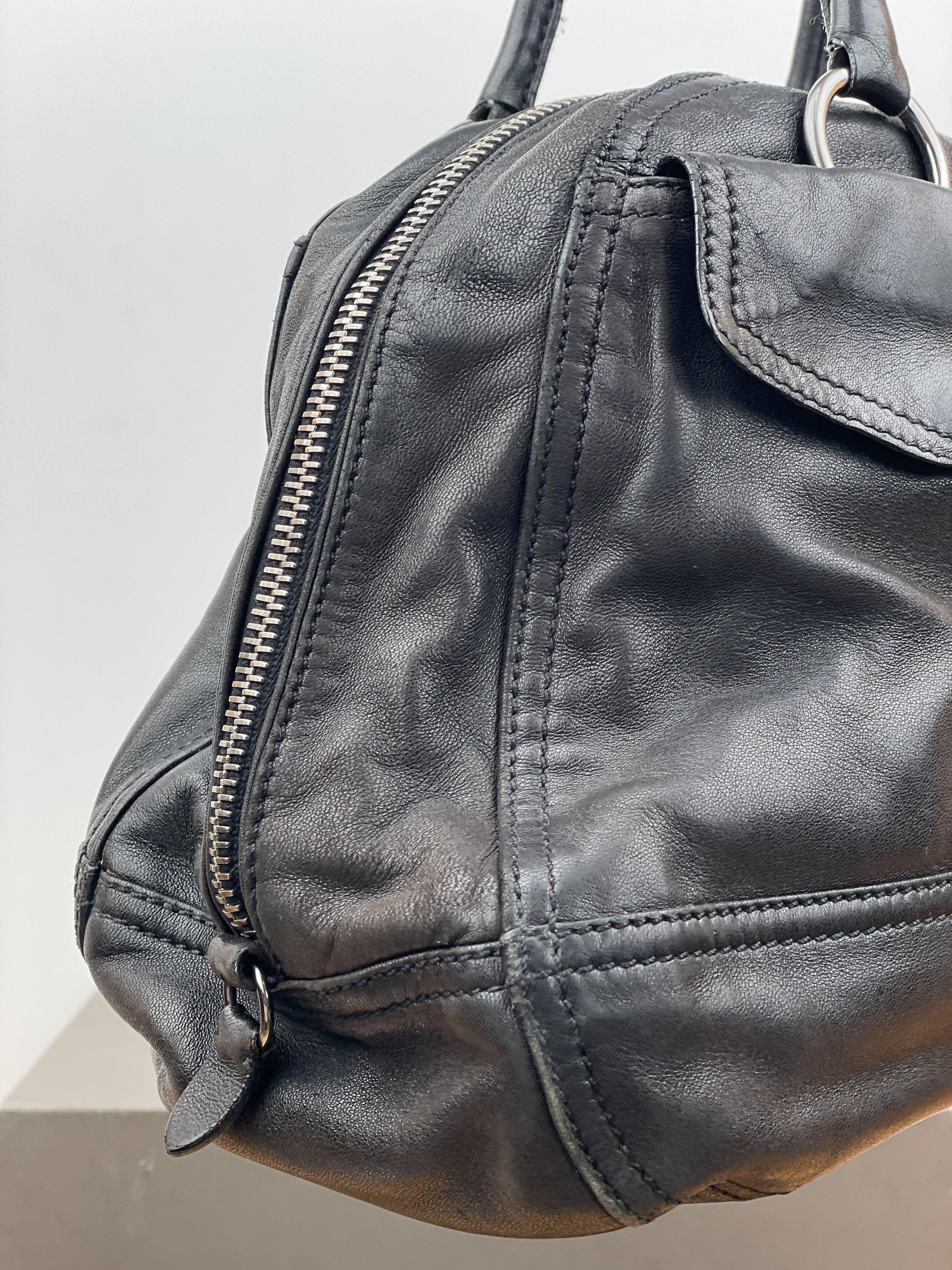 Black leather bowling handle bag, featuring the signature triangle logo plaque and 2 angular zipper-pockets on the front, from the 2000s.