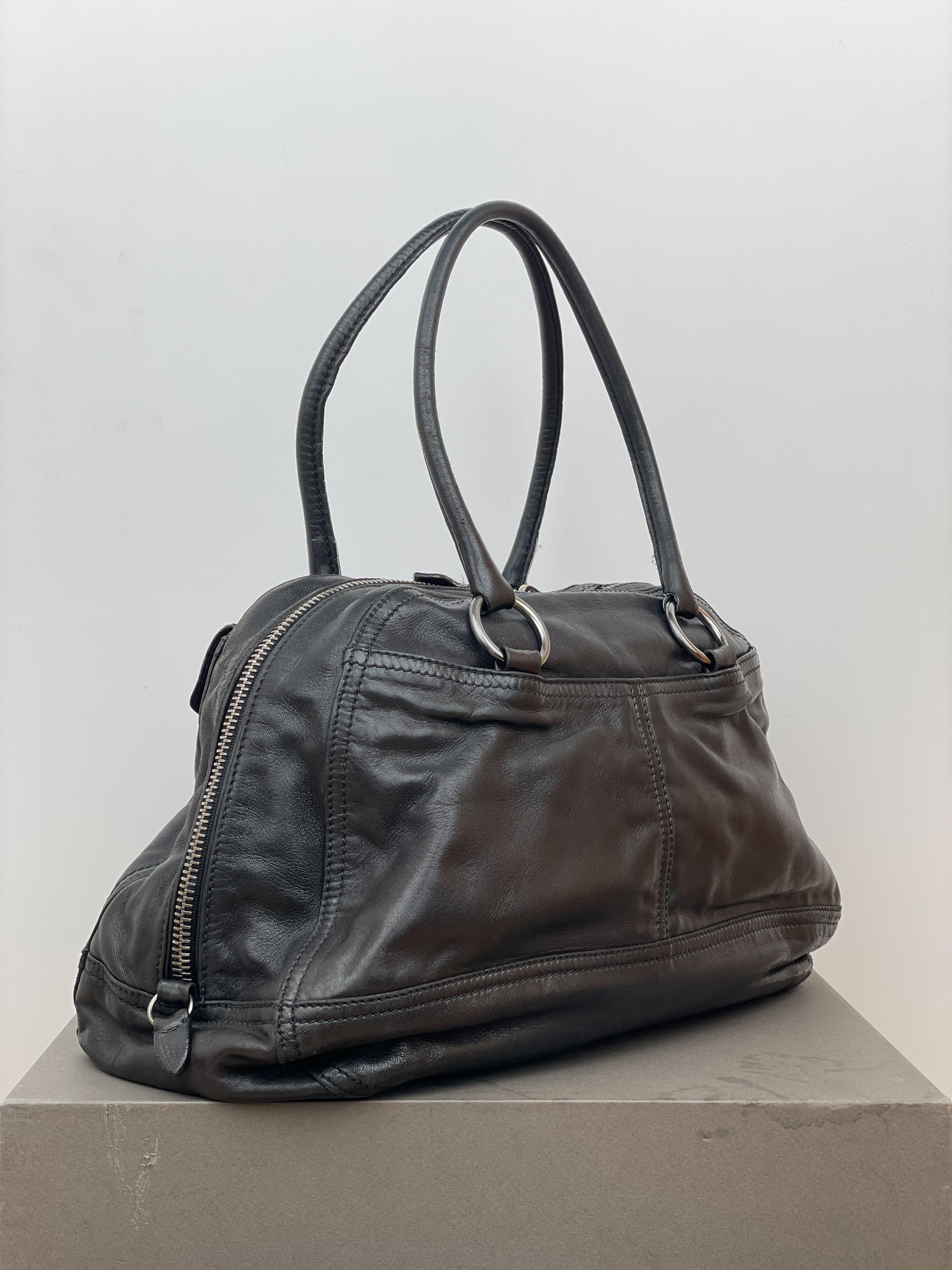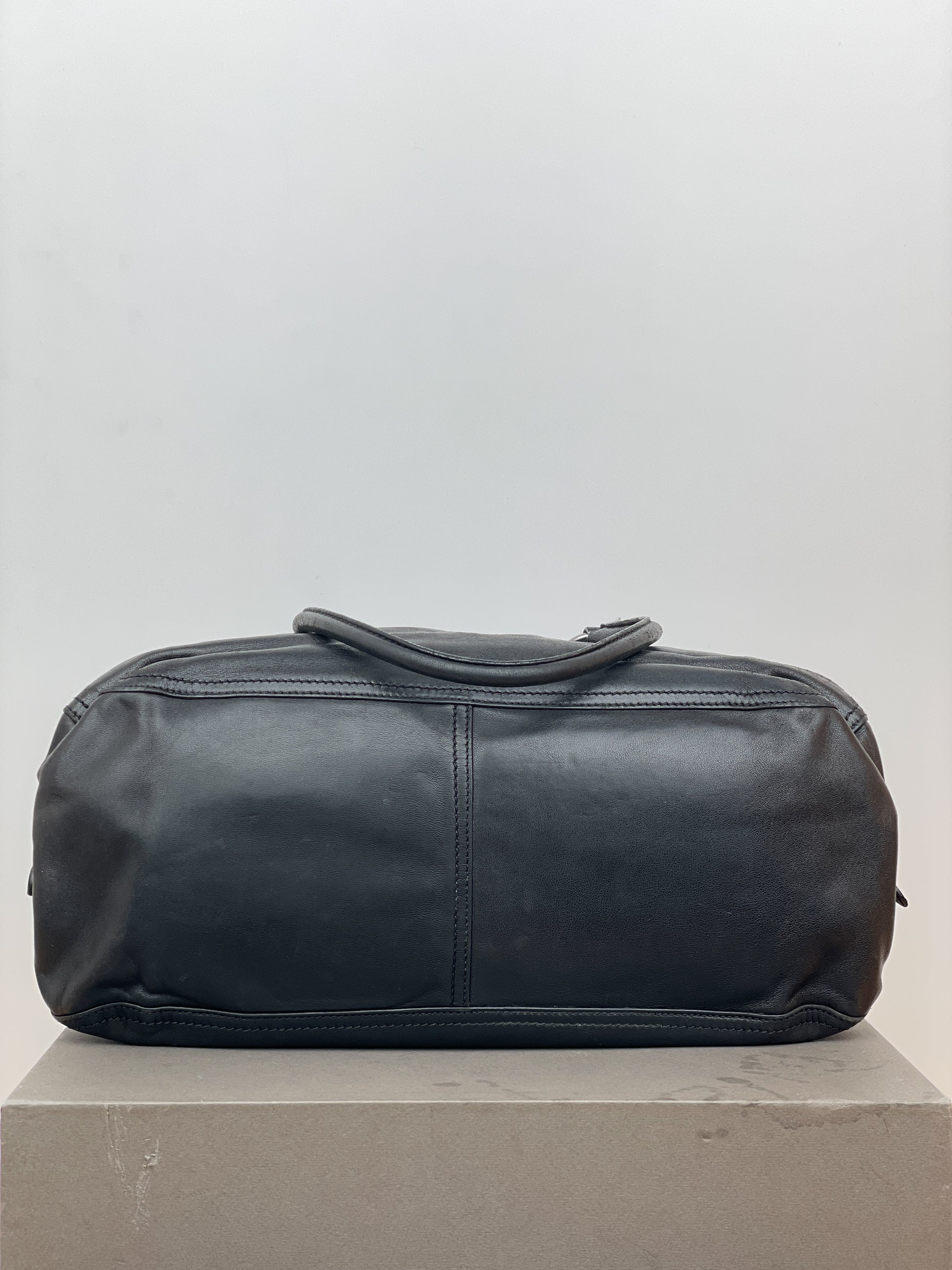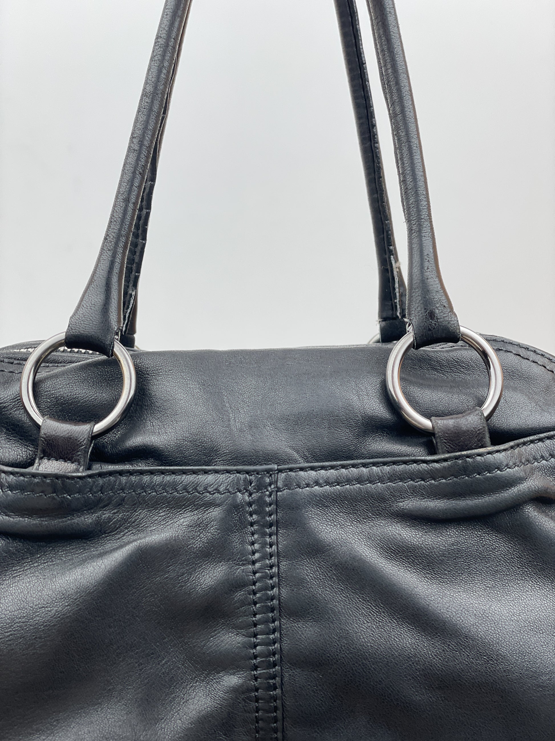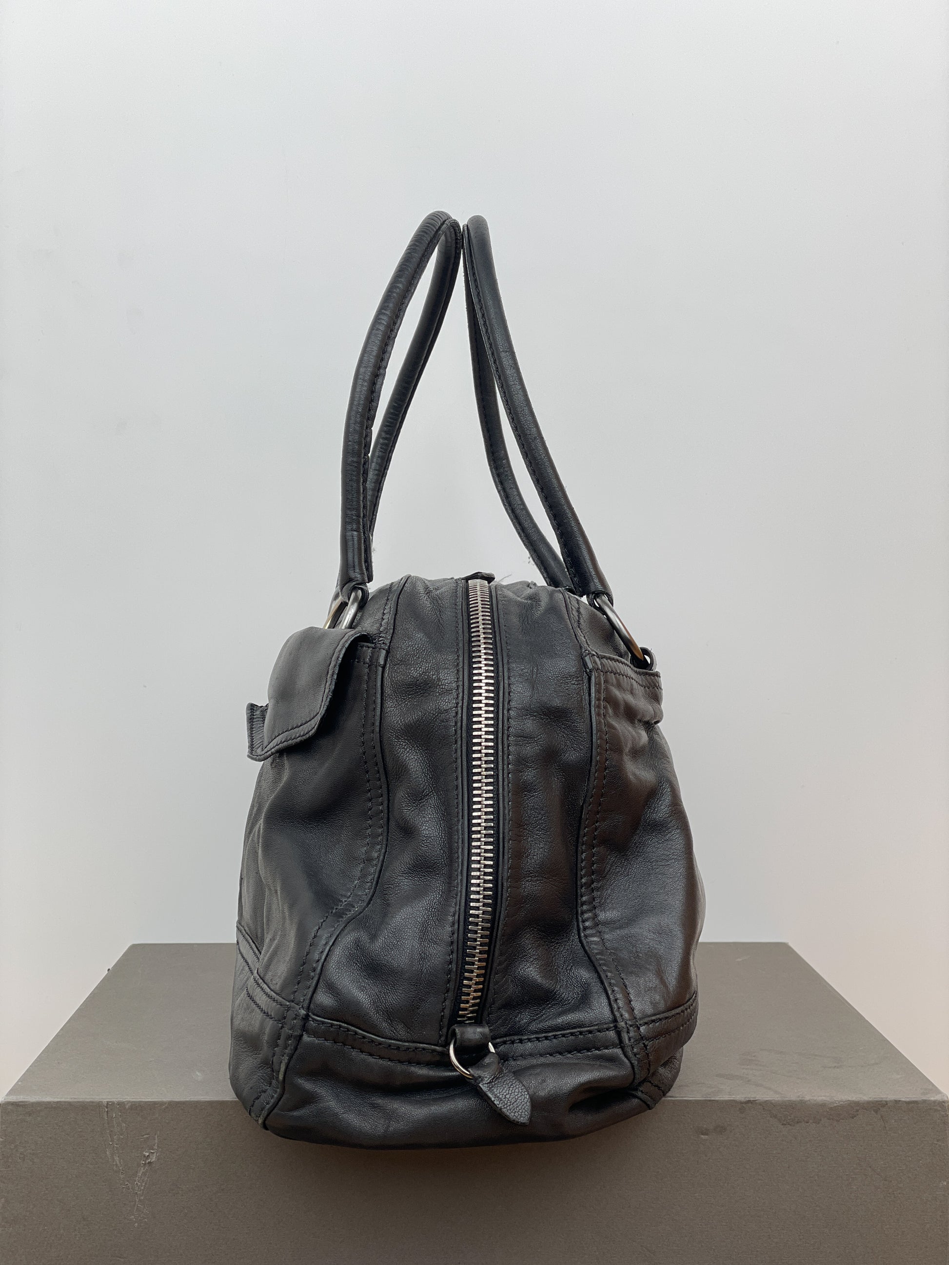 Black leather bowling handle bag, featuring the signature triangle logo plaque and 2 angular zipper-pockets on the front, from the 2000s.