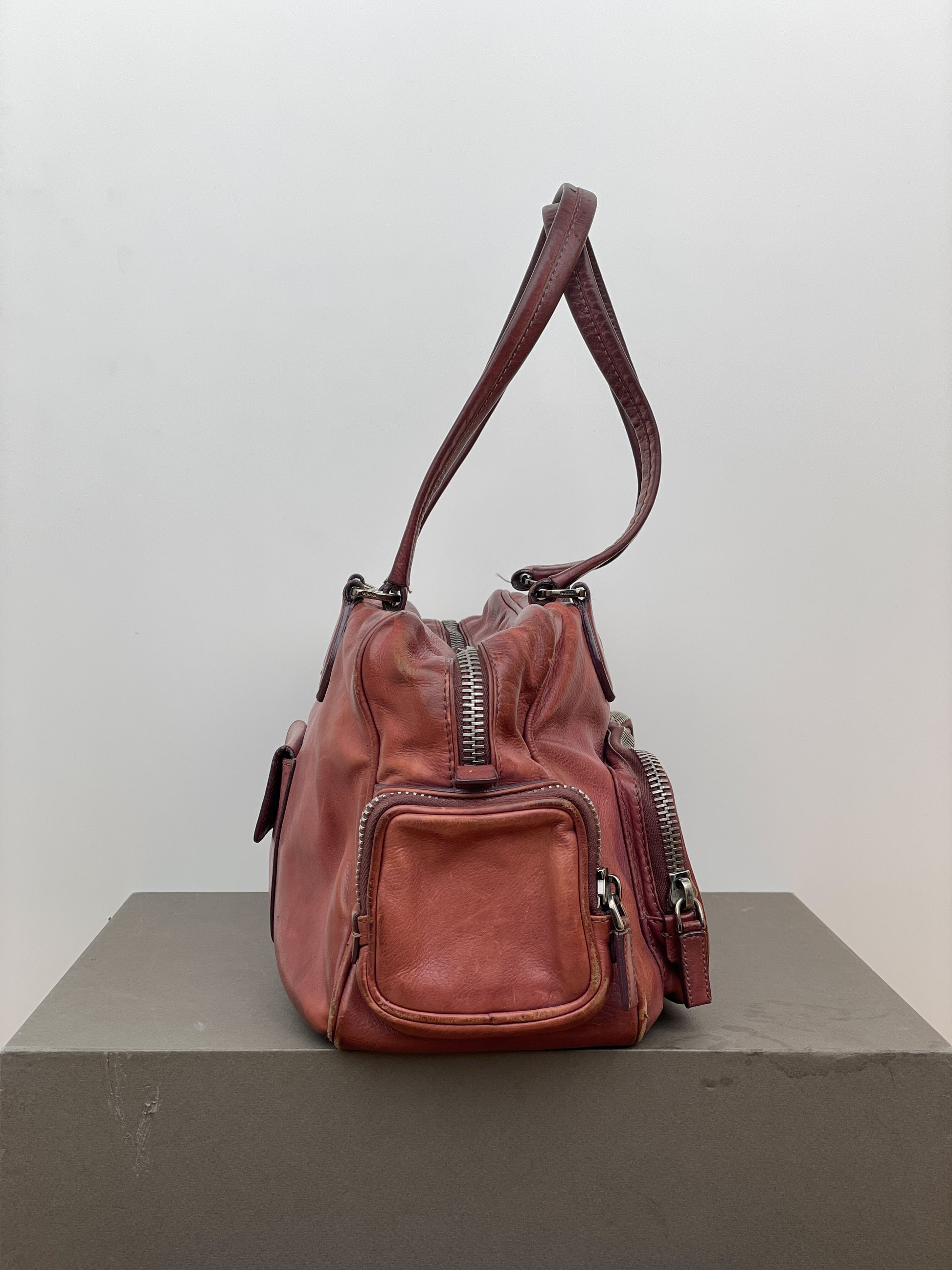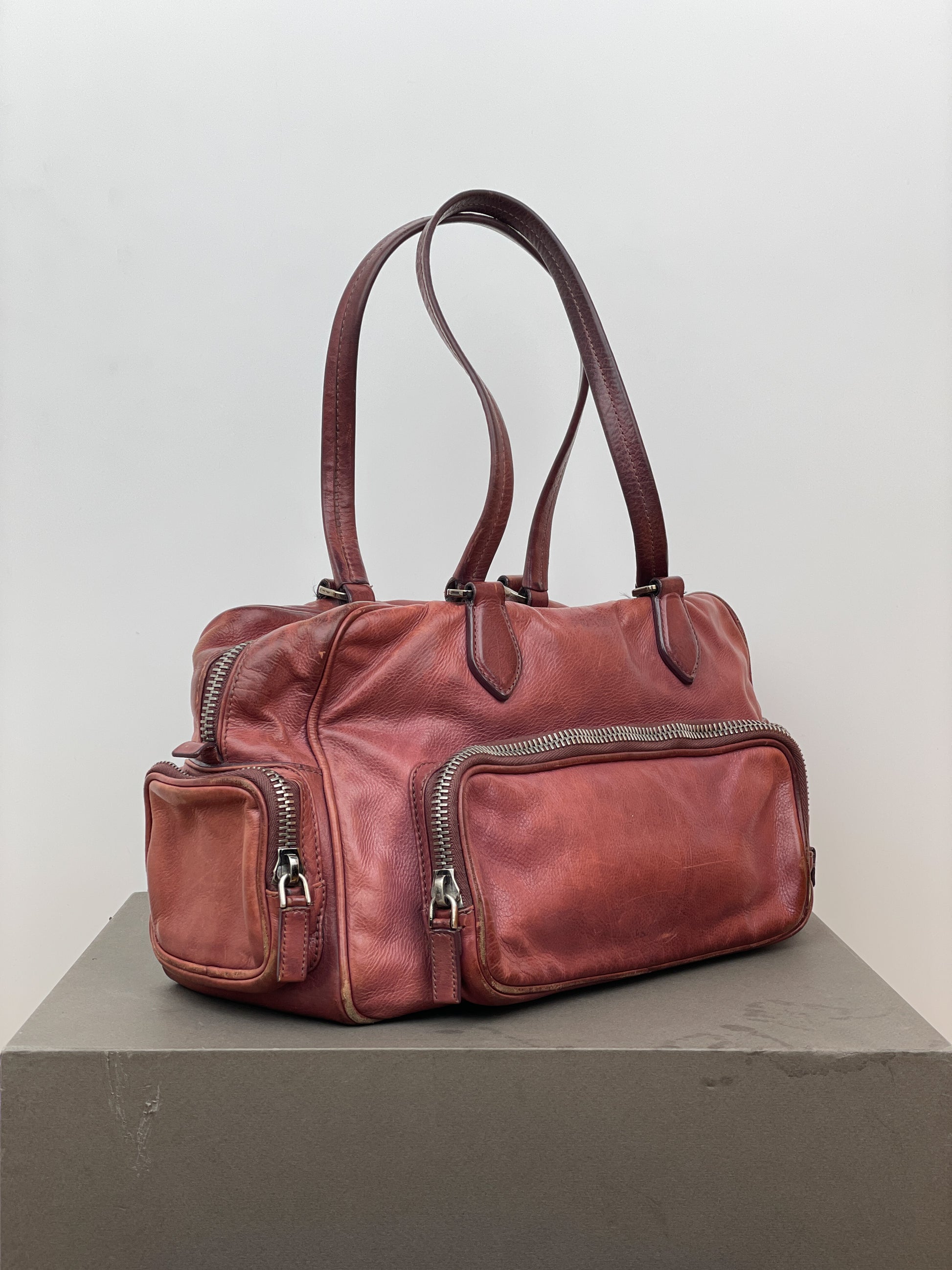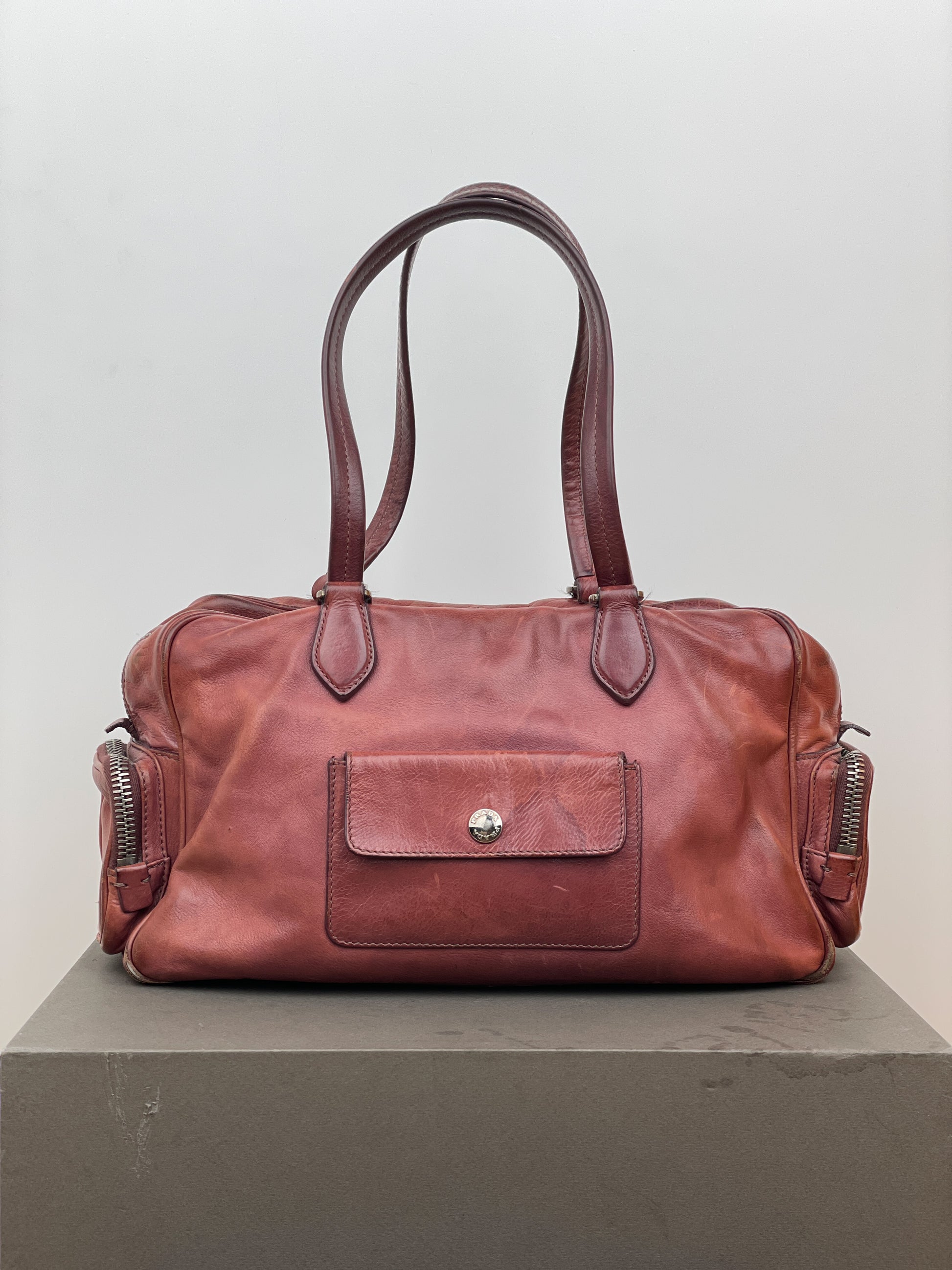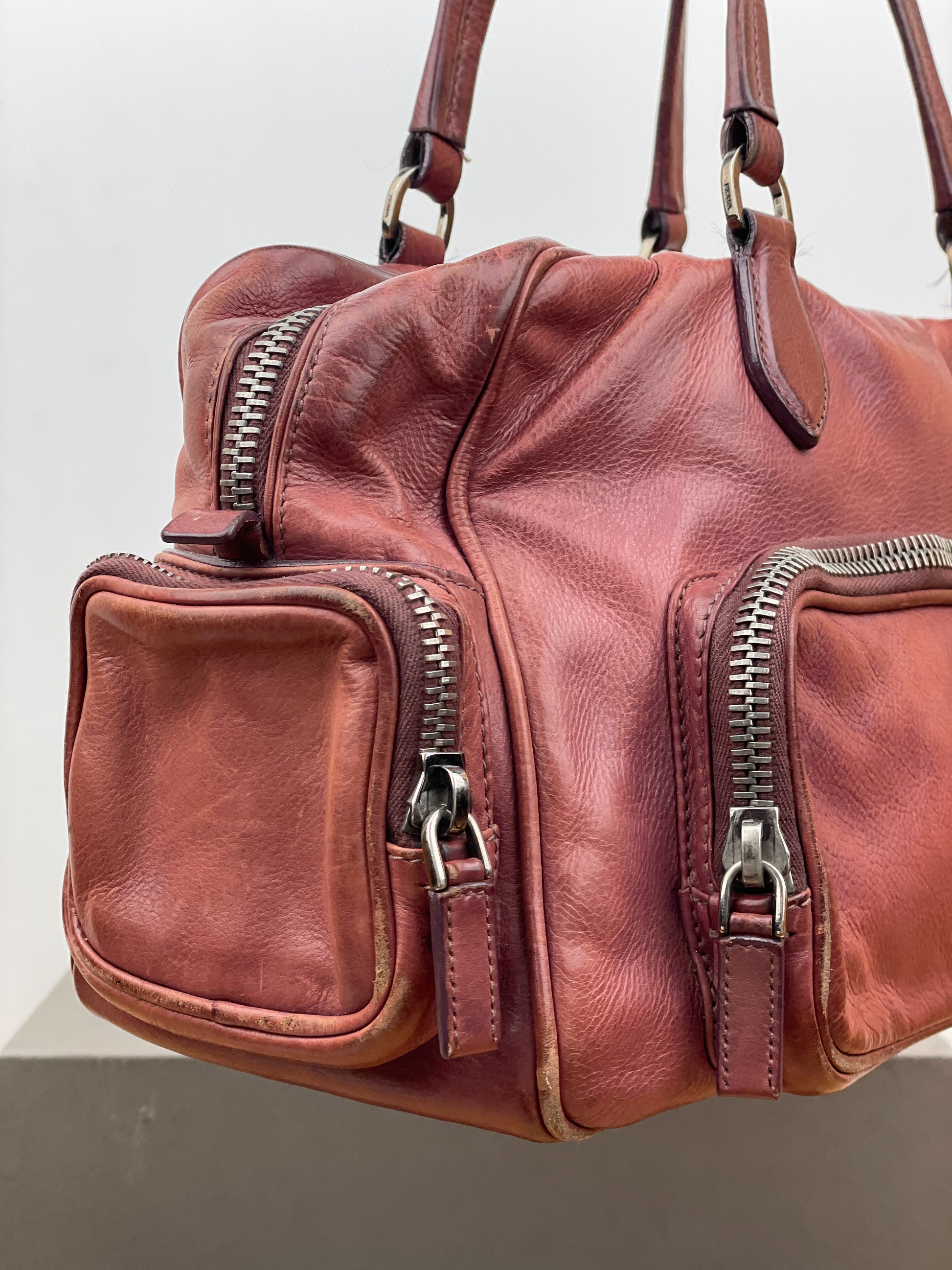 Bowling shoulder bag in dark dusty pink leather, with boxy shape and 3D cargo zipper-pockets on the front and sides, from the 2000s.