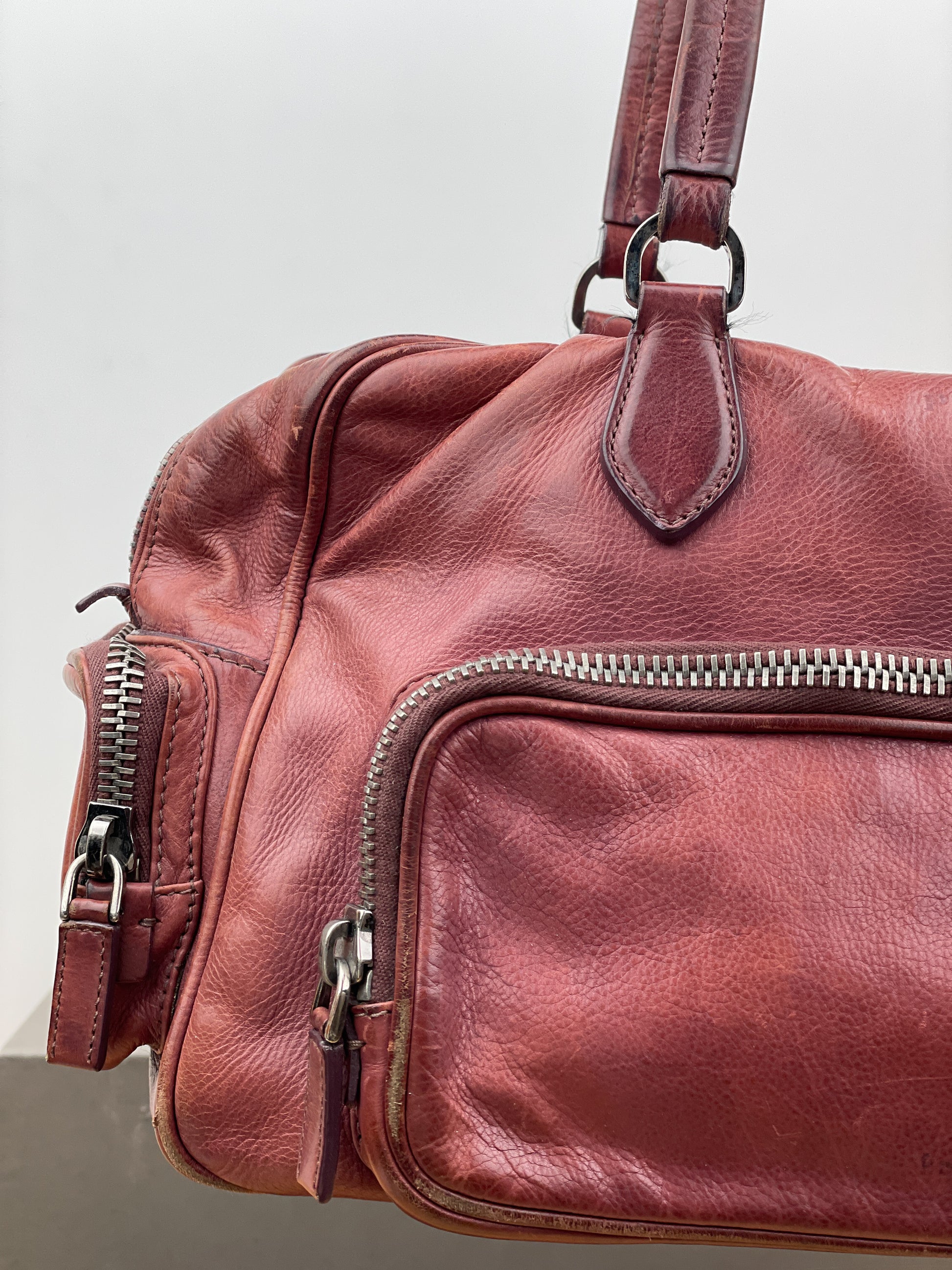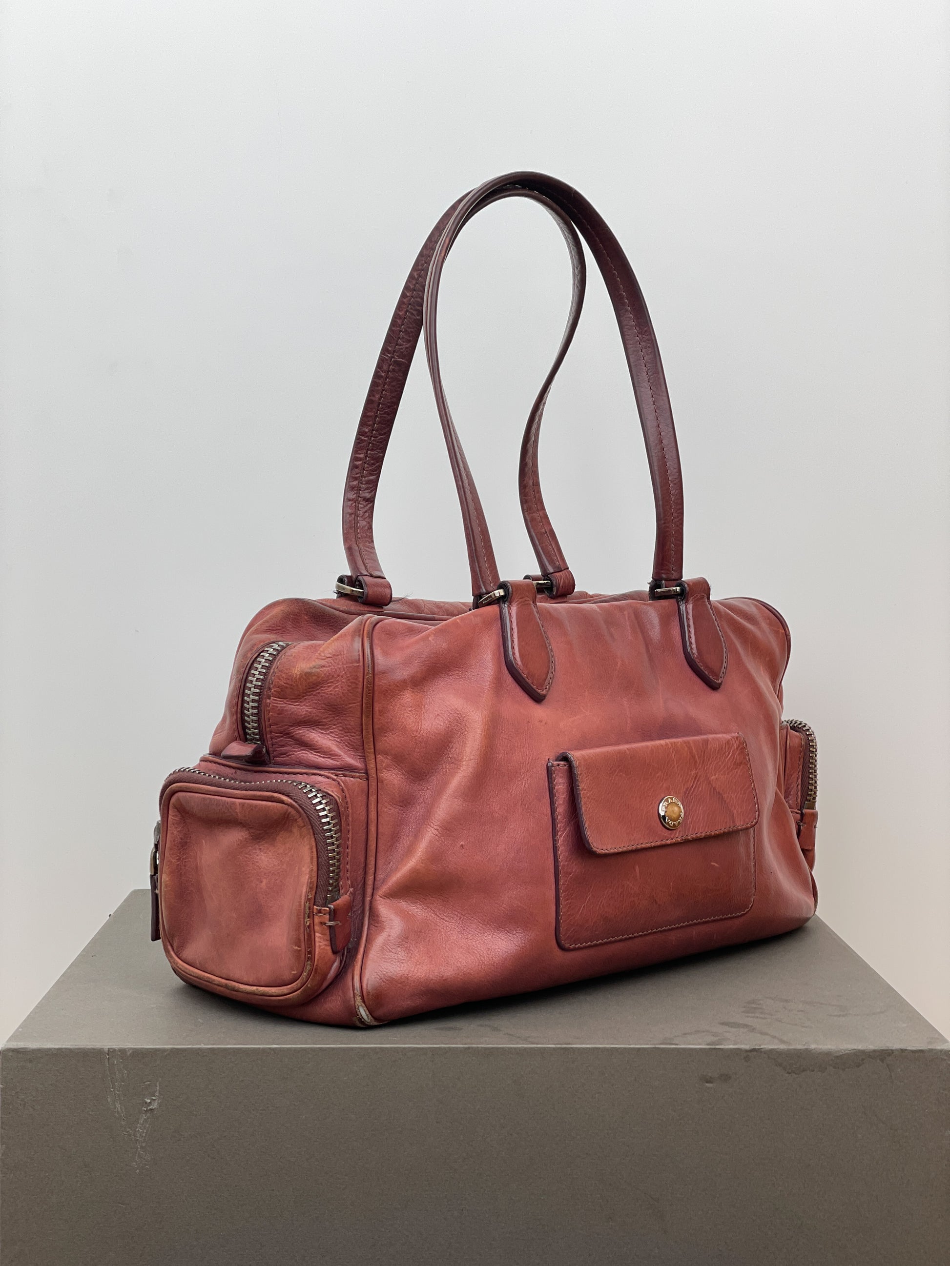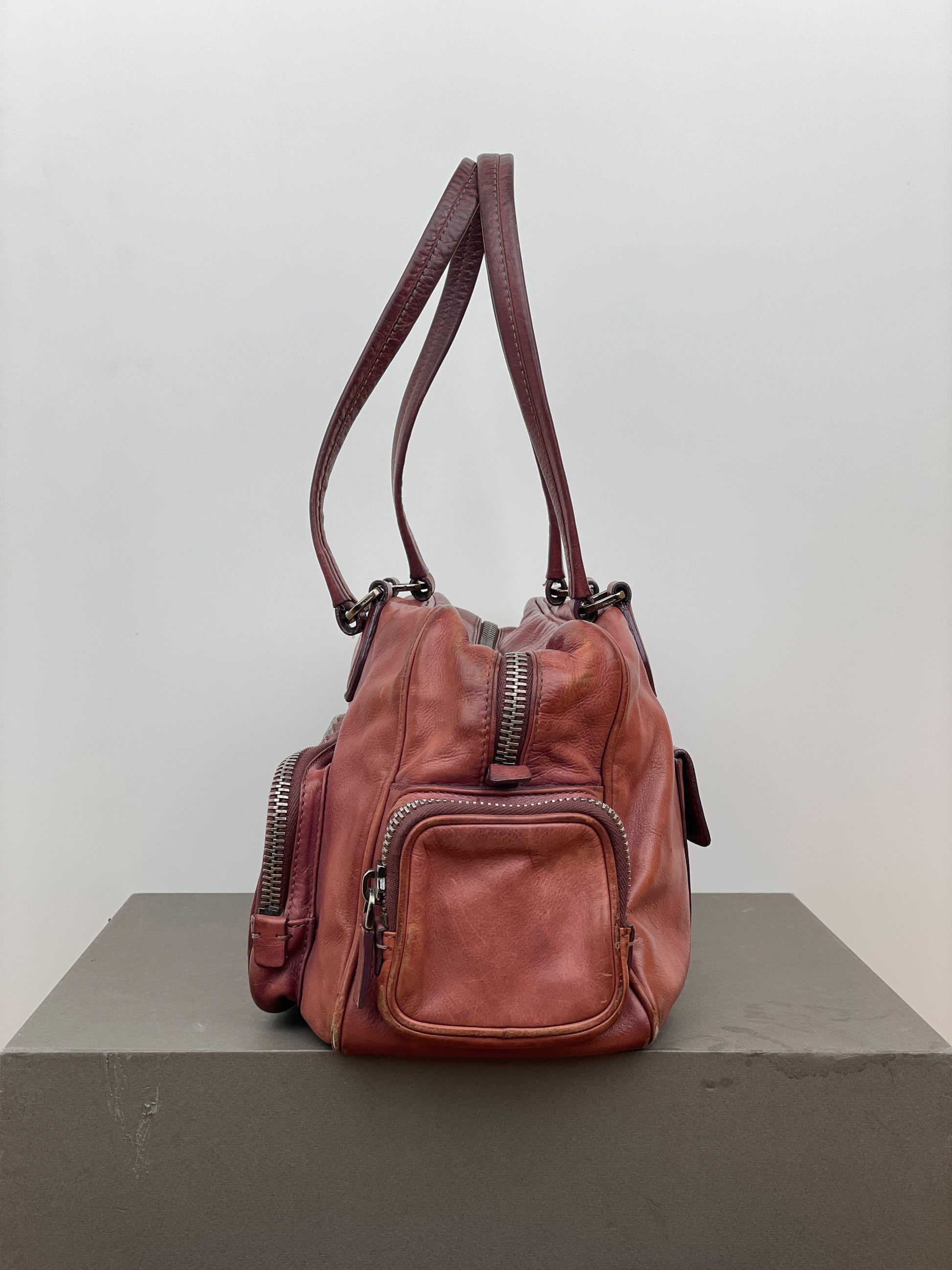 Bowling shoulder bag in dark dusty pink leather, with boxy shape and 3D cargo zipper-pockets on the front and sides, from the 2000s.