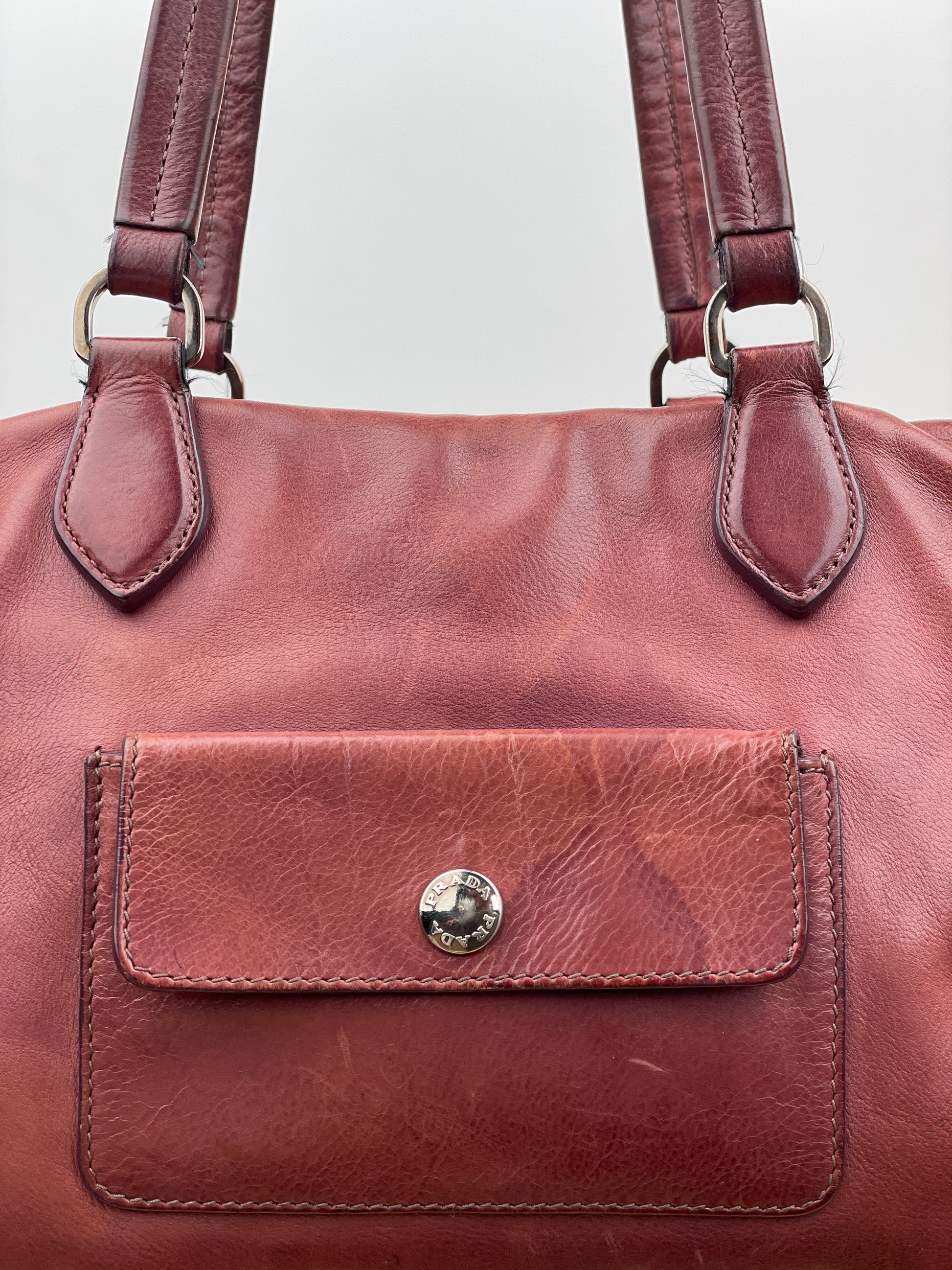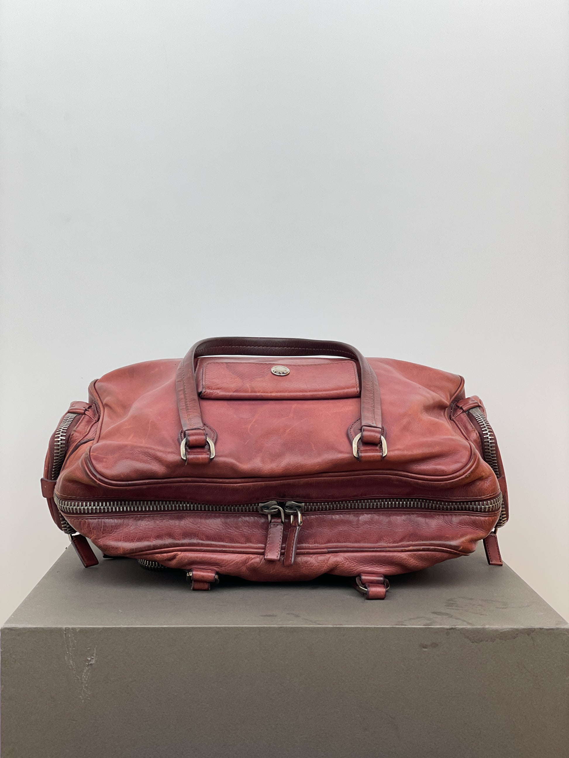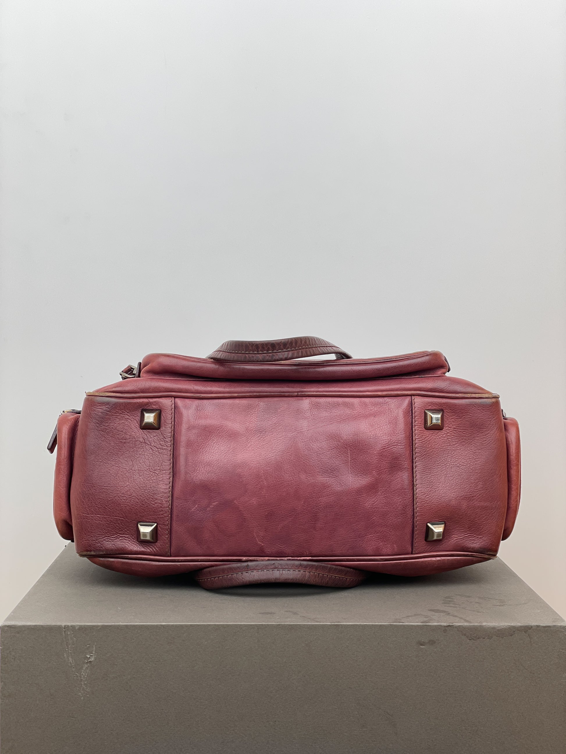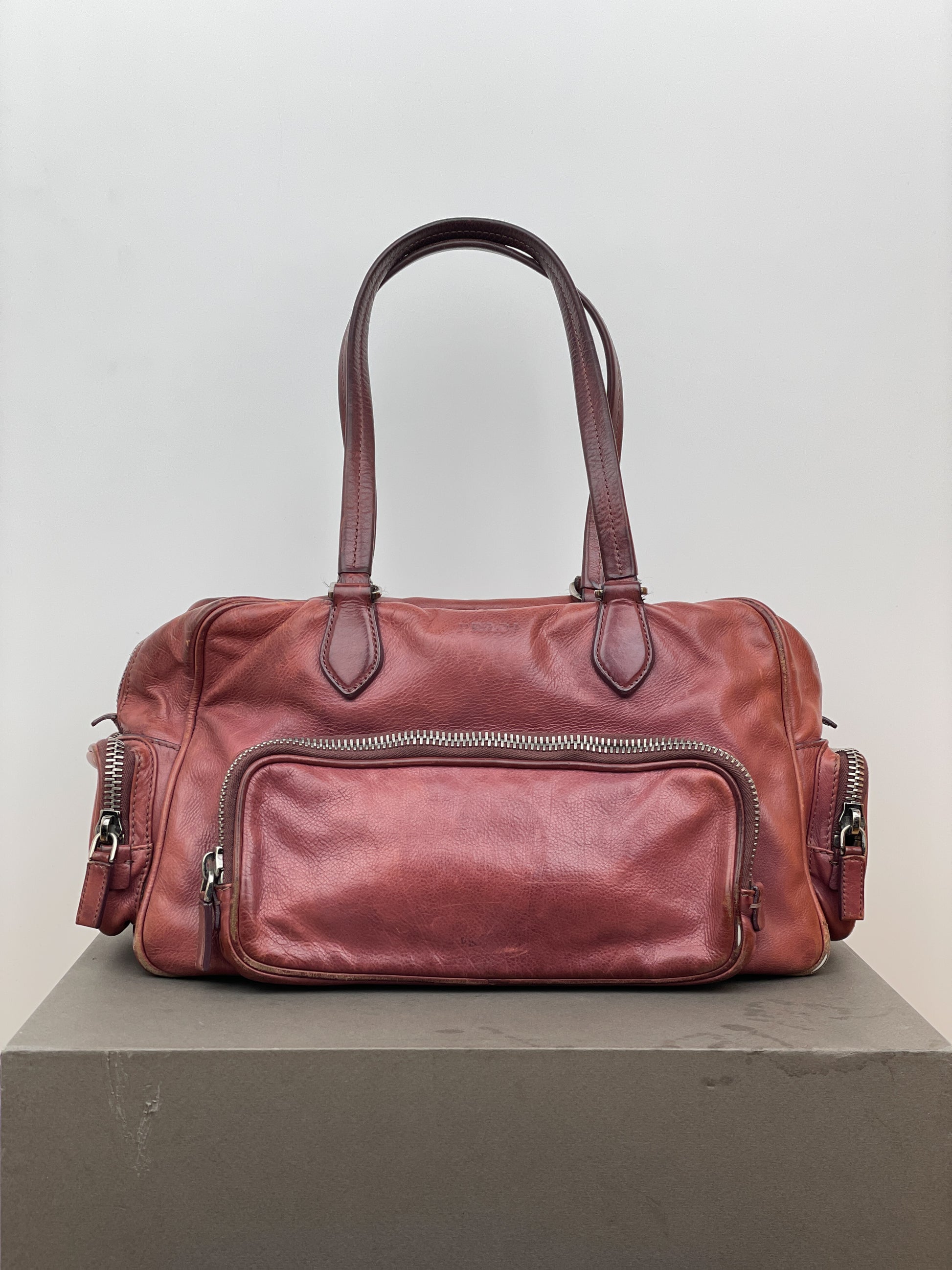 Bowling shoulder bag in dark dusty pink leather, with boxy shape and 3D cargo zipper-pockets on the front and sides, from the 2000s.