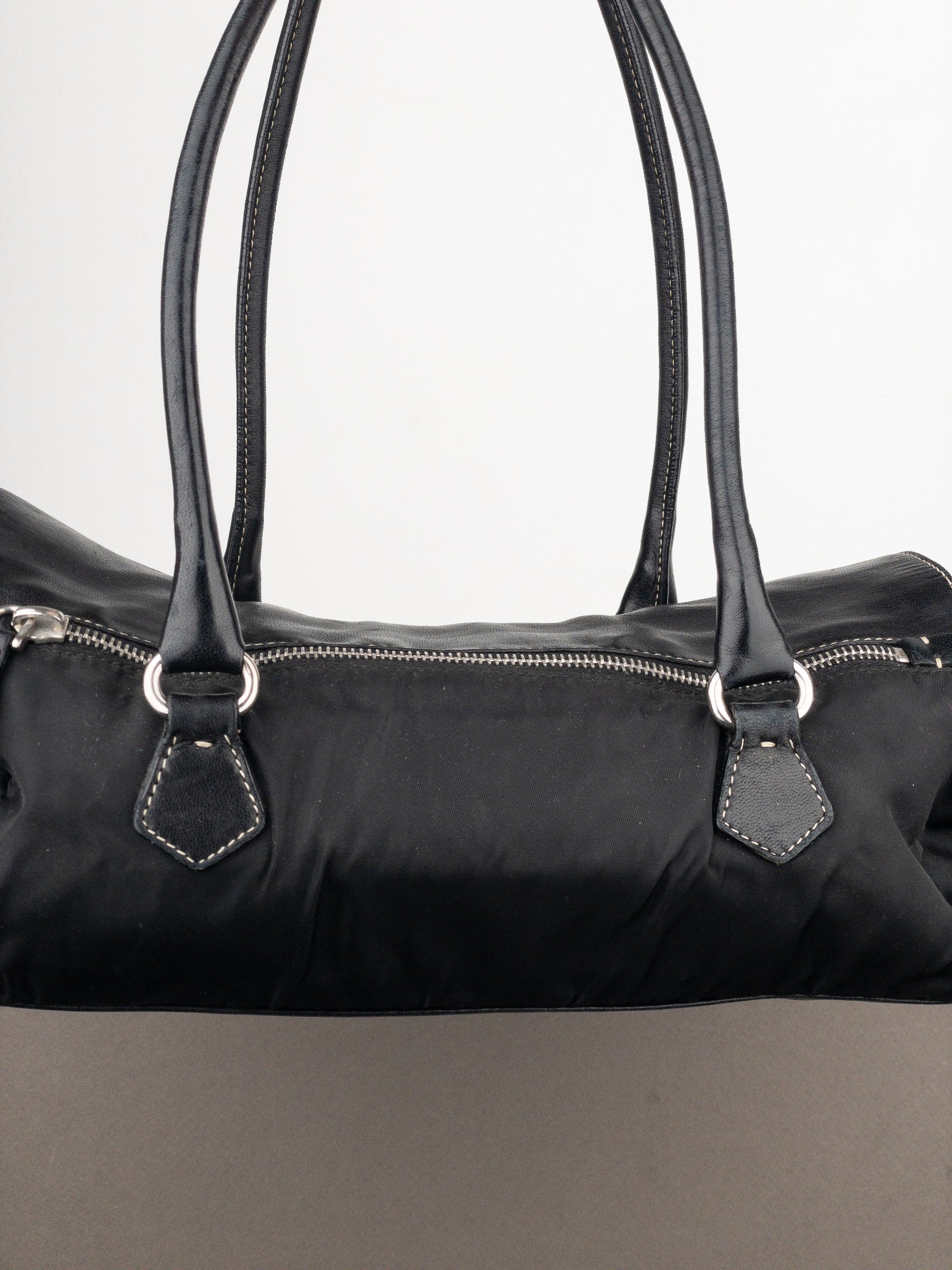 East-west baguette shoulder bag in black leather and nylon with a large silver-colored clasp, from the 2000s.
