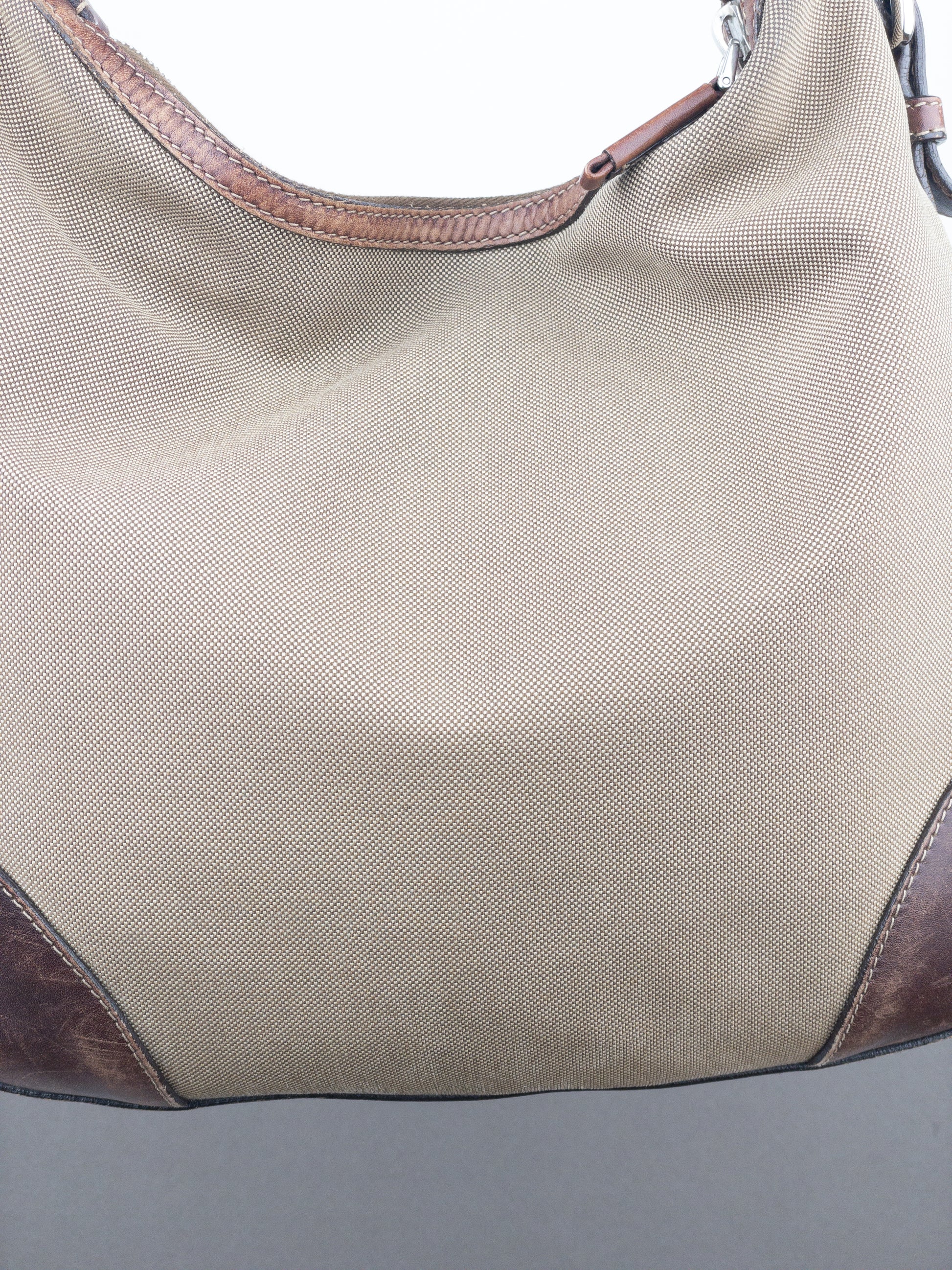 Crossbody bag in beige jacquard canvas and dark brown leather, featuring silver-colored hardware, an inner zip pocket, and a large embroidered logo in the front, from the 2000s.