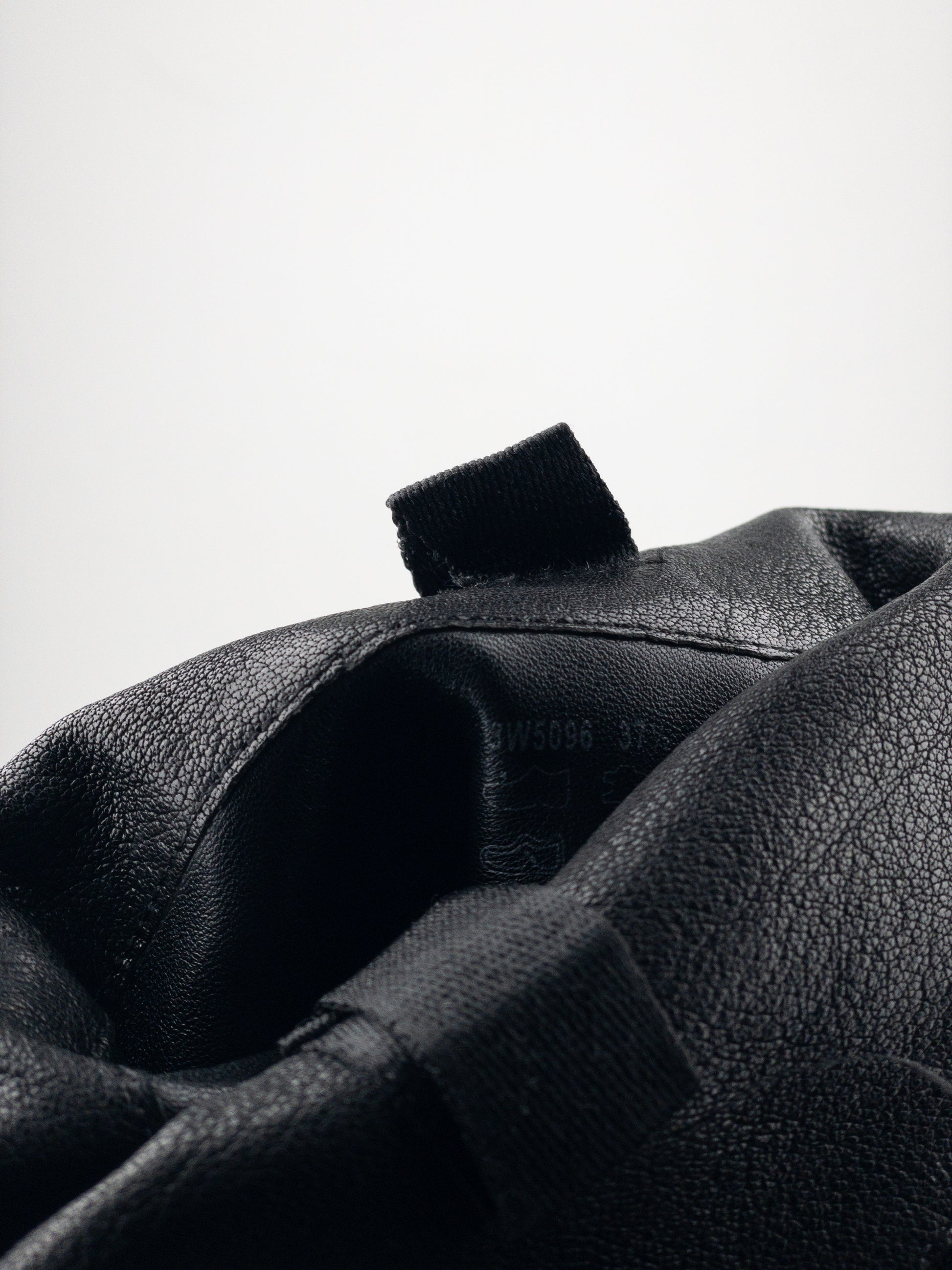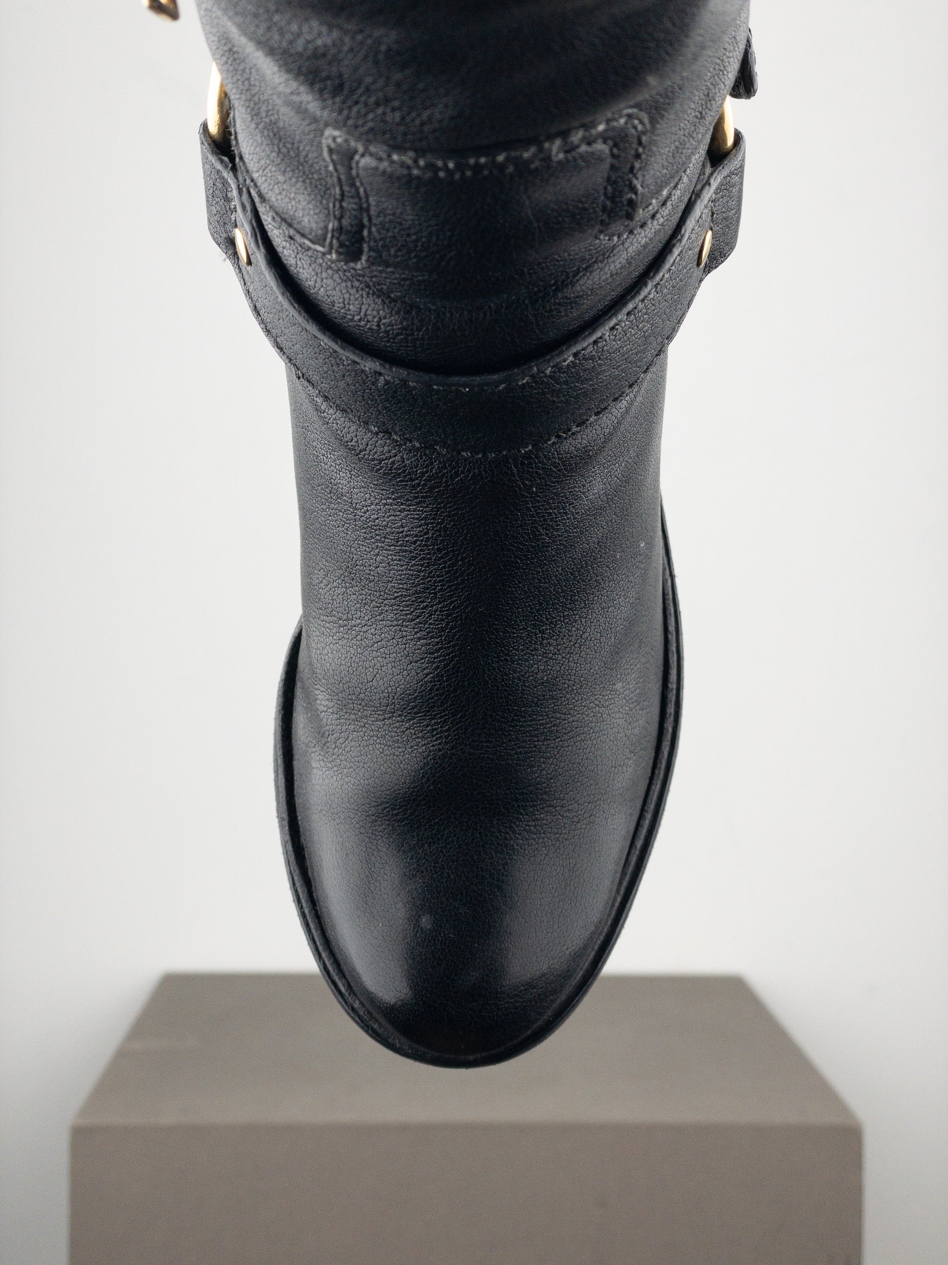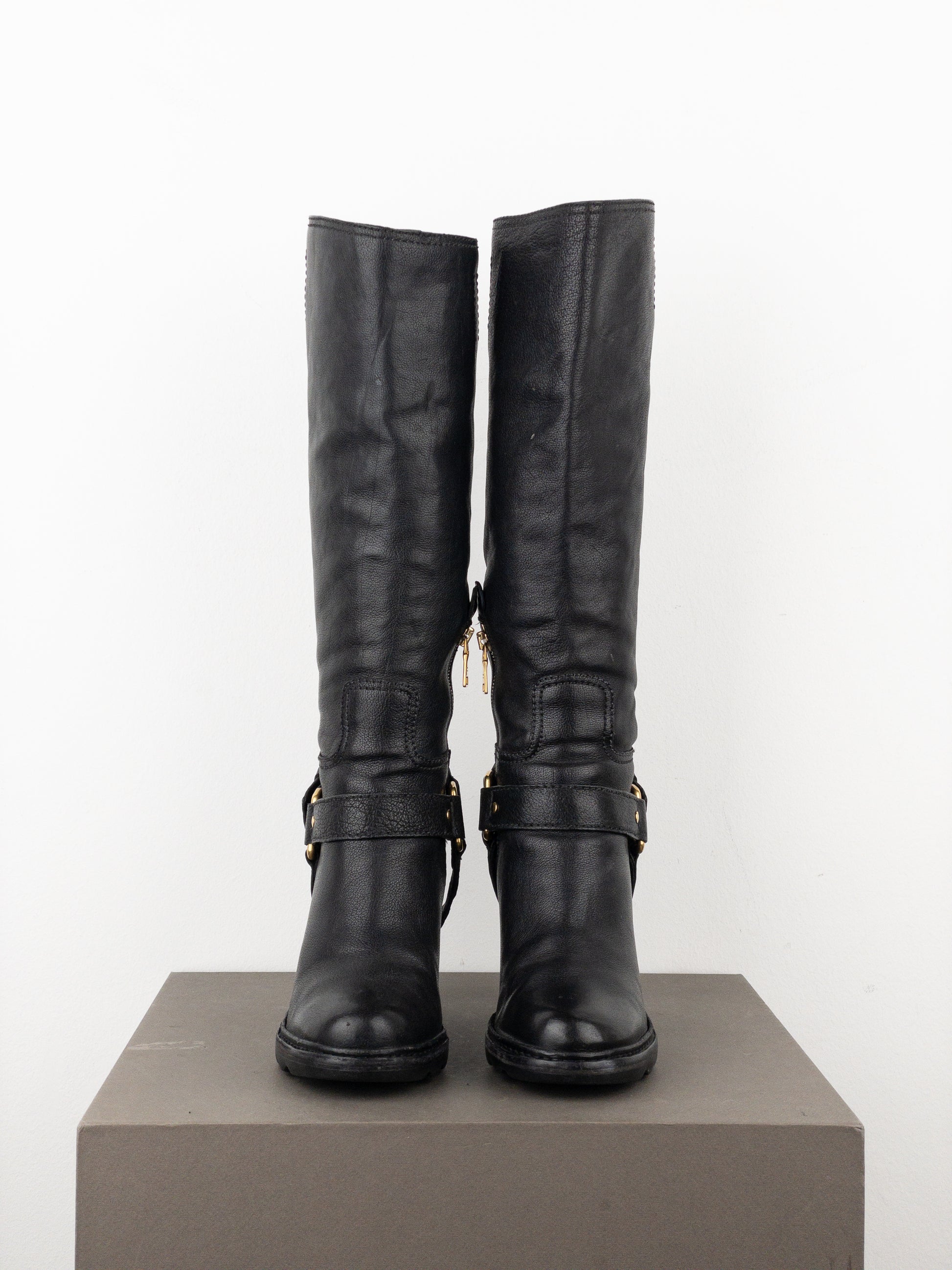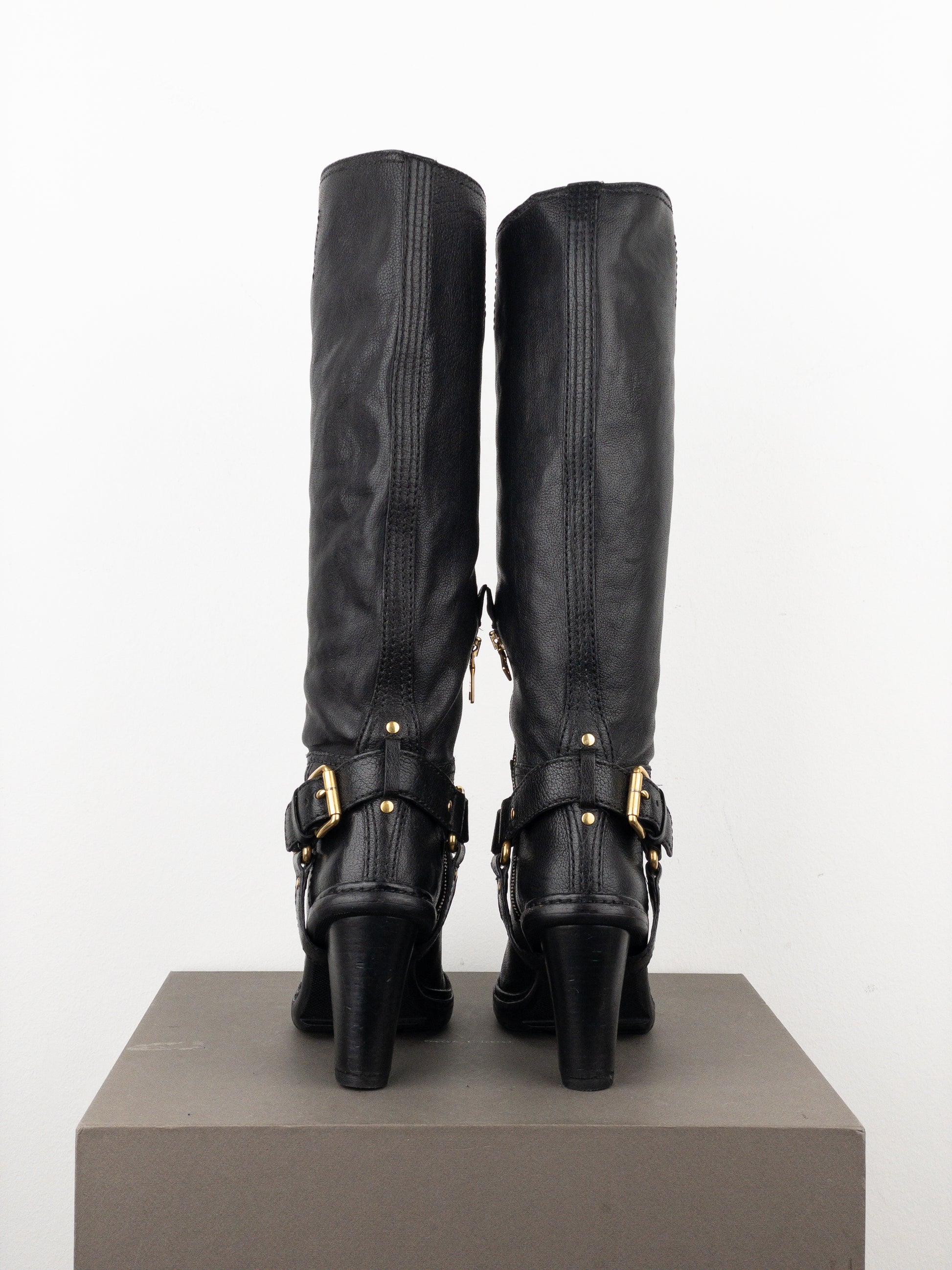 Knee-high black leather biker boots with a rounded toe, a rugged sole, and an angular heel, featuring a buckled biker strap around the ankle with gold-colored hardware, from the 2000s