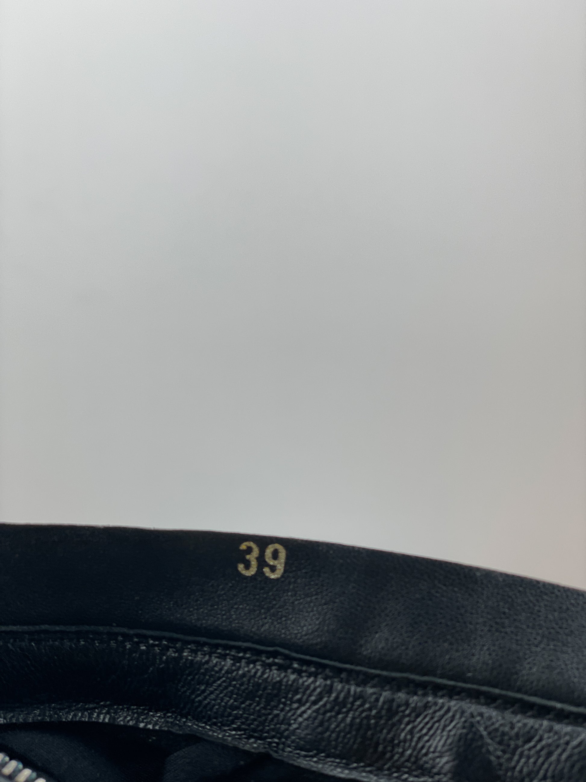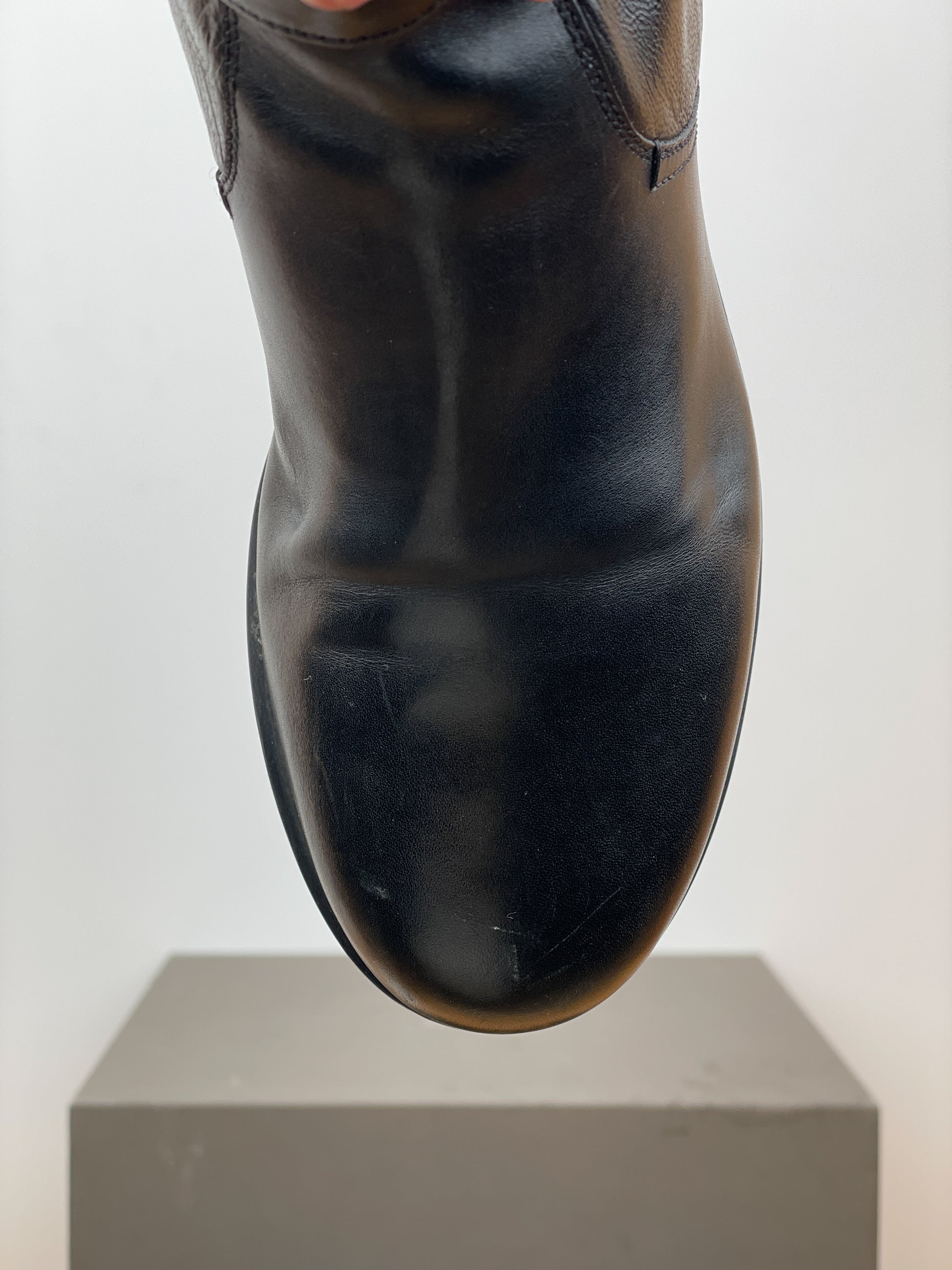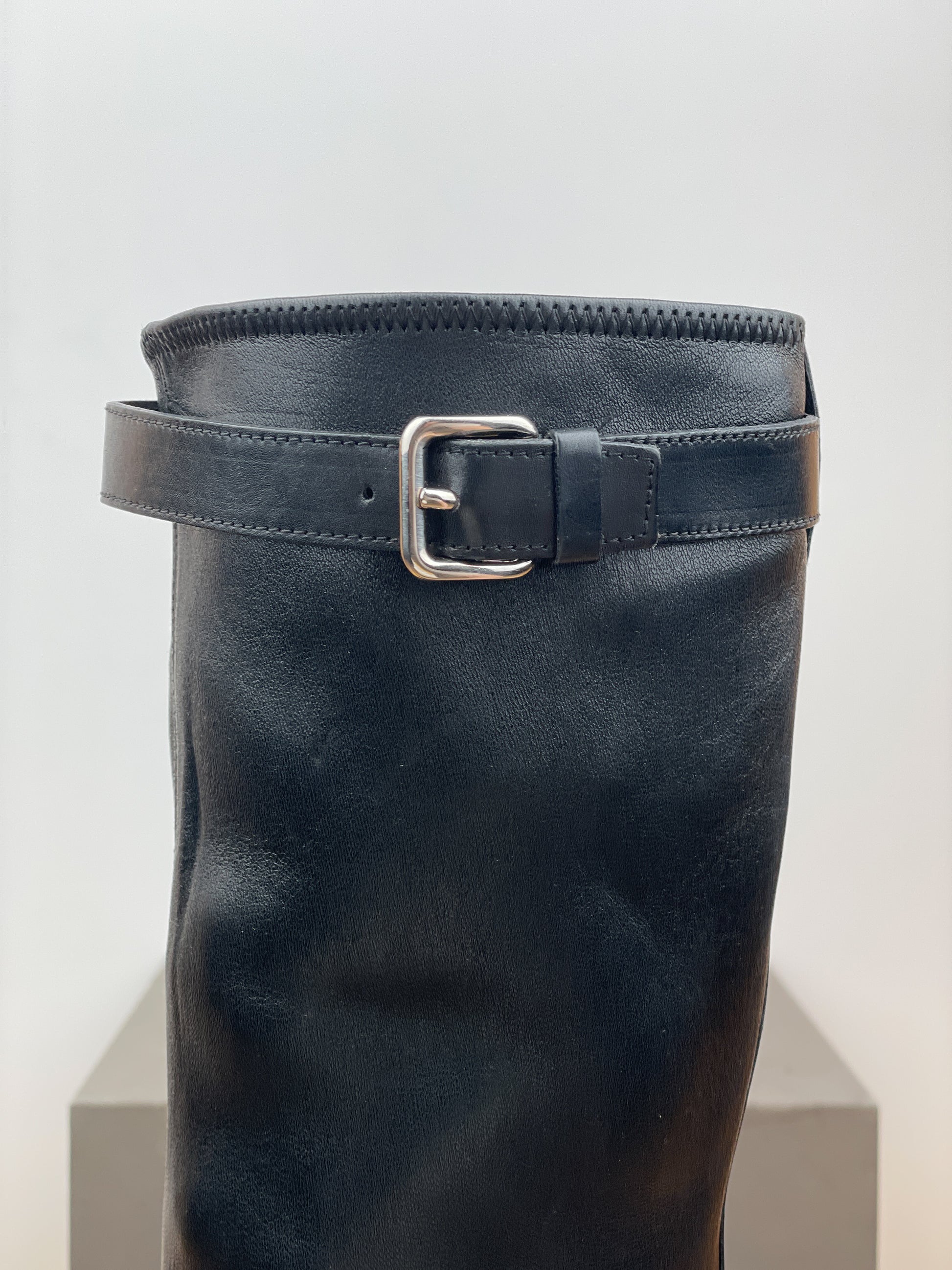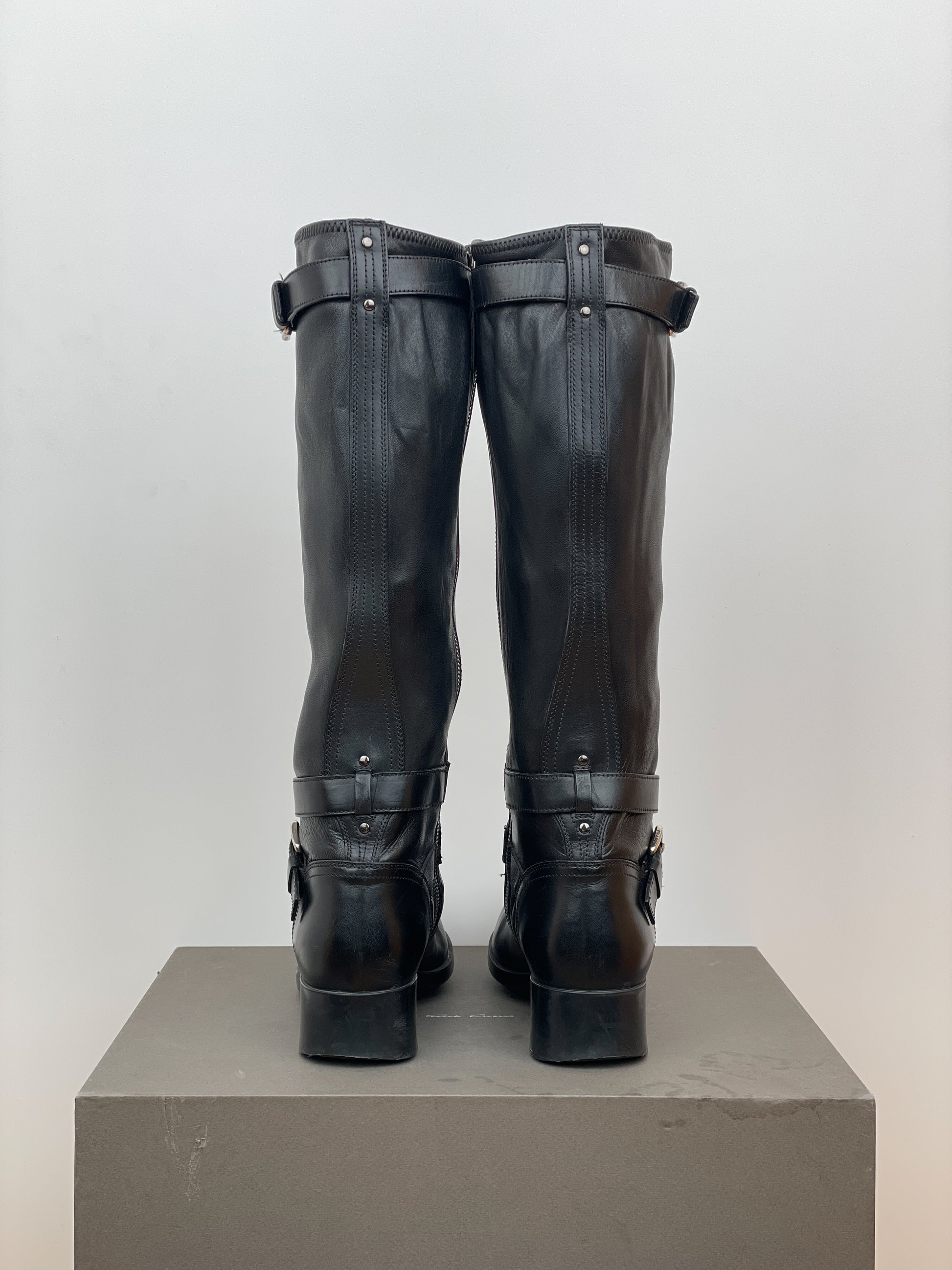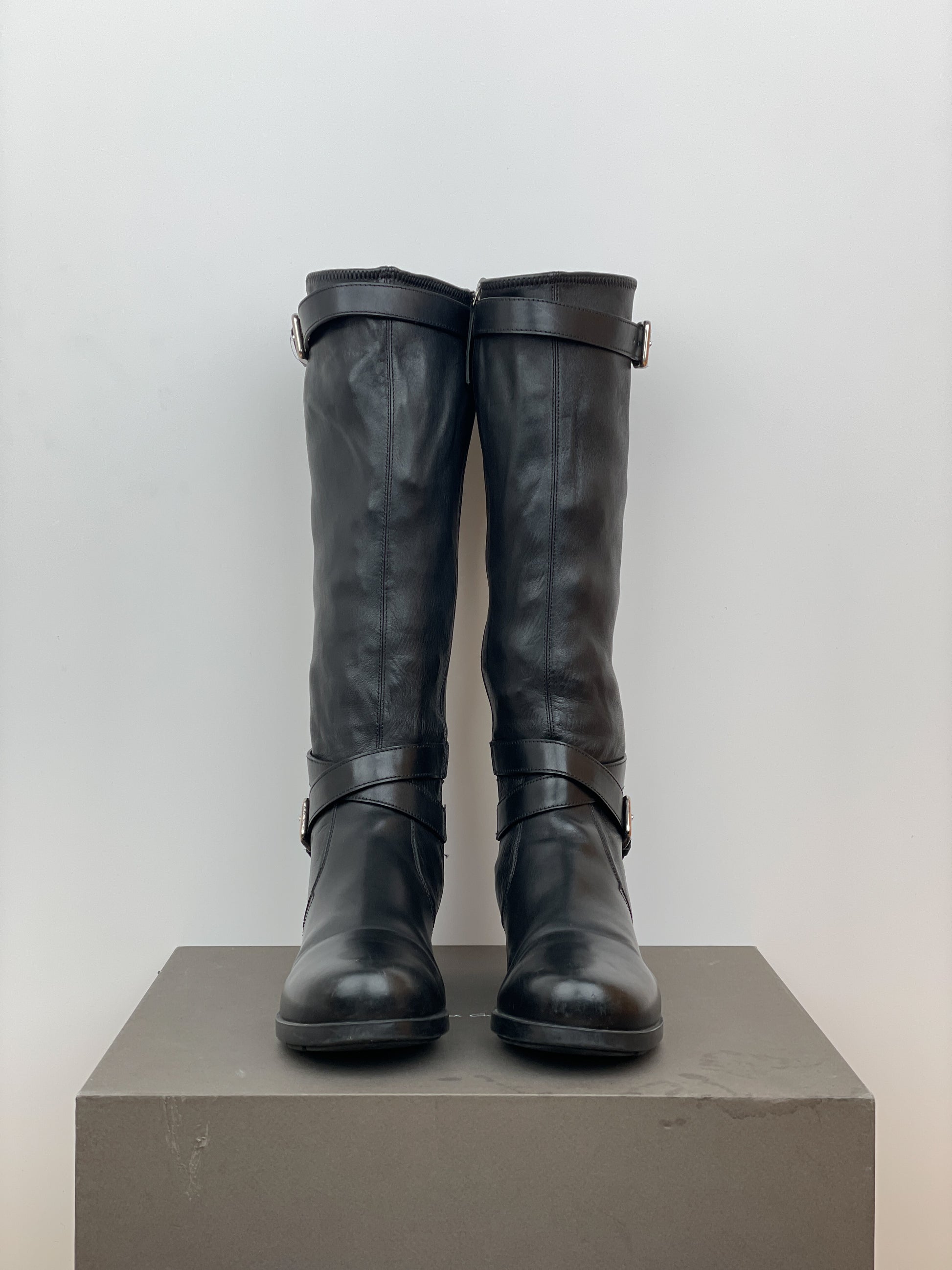 Knee-high riding boots in black leather, with buckled straps around the top of the shaft and the ankle, and a zipper along the inside of the shaft, from the 2000s.