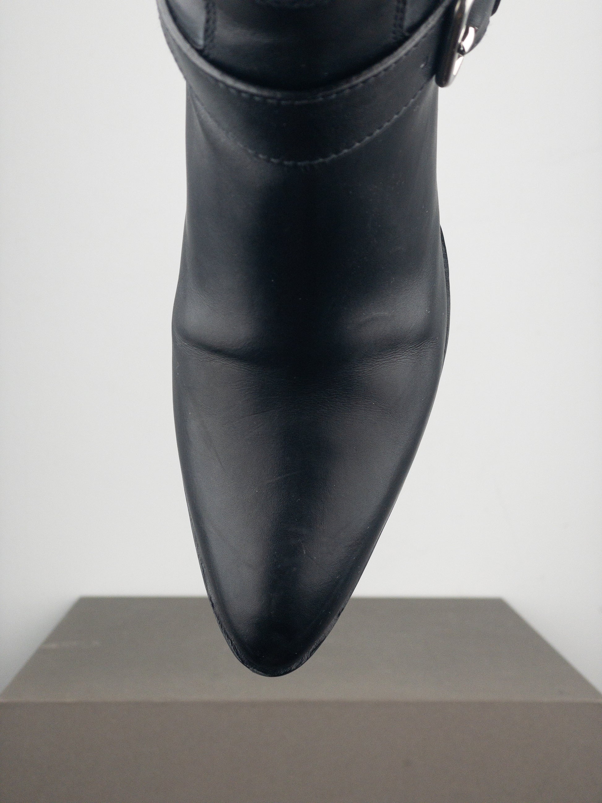 Knee-high black leather cowboy boots with a pointed toe and a slight cuban heel, featuring a biker harness around the ankle with silver-colored hardware, from the 2000s.