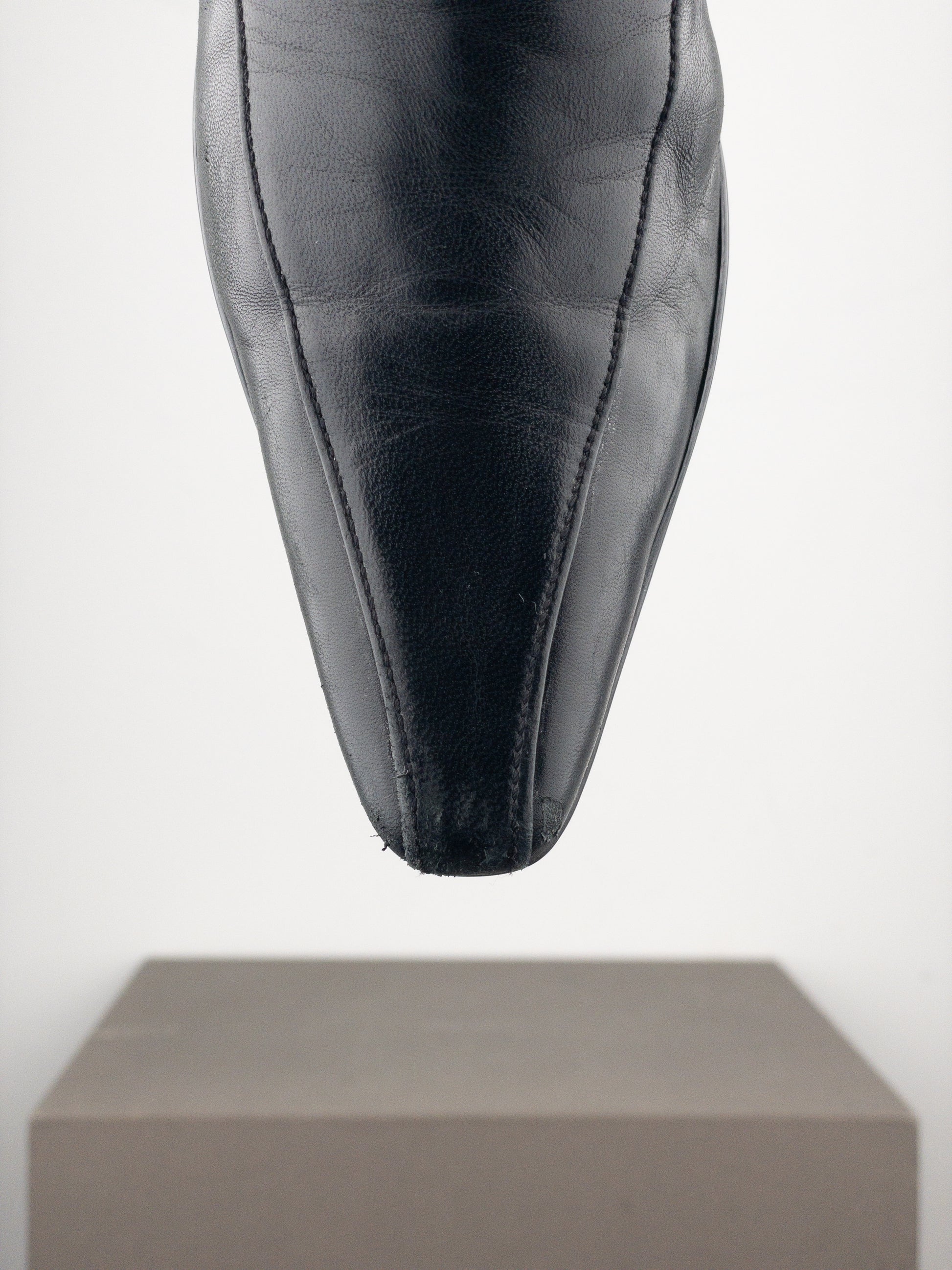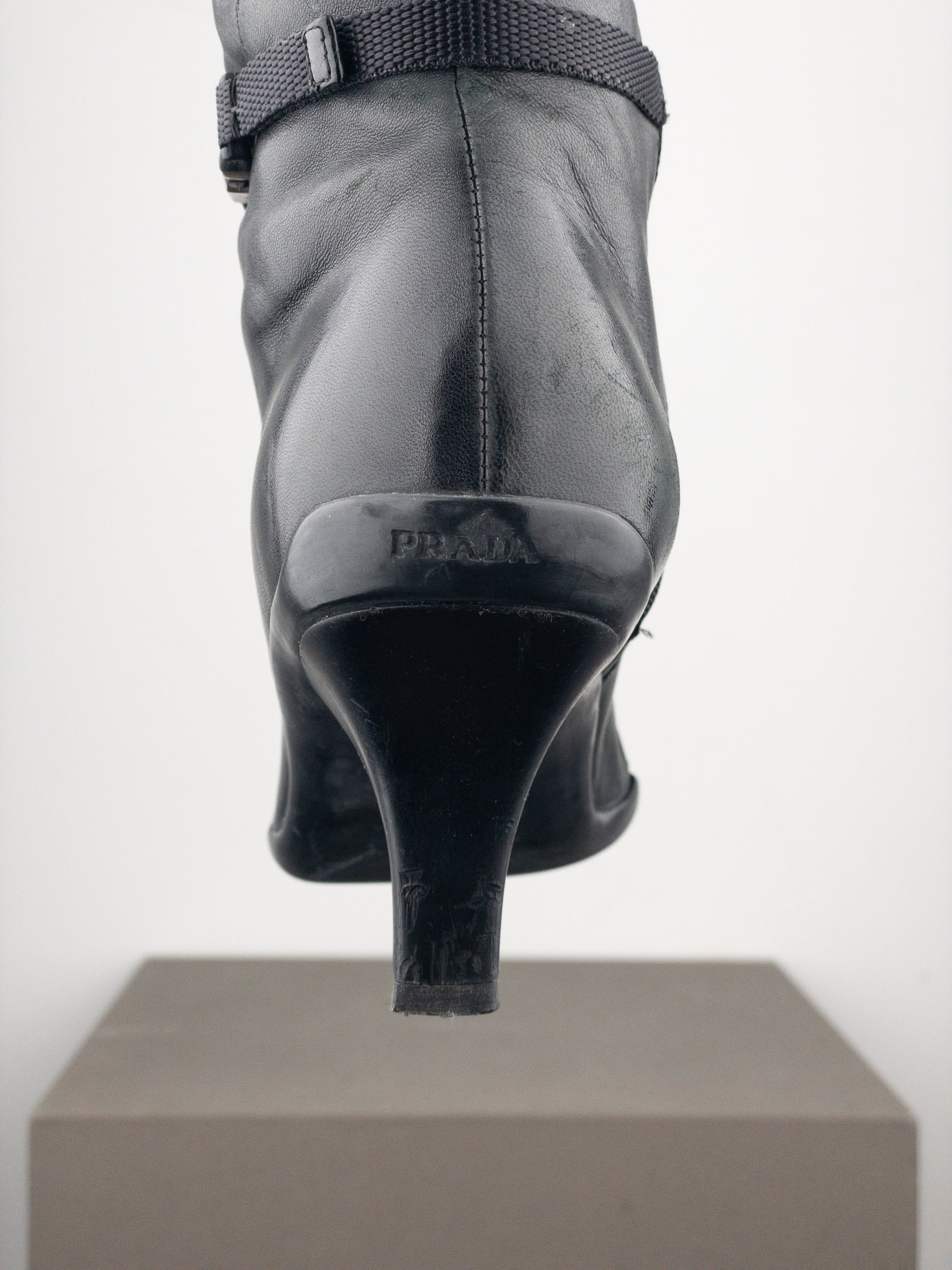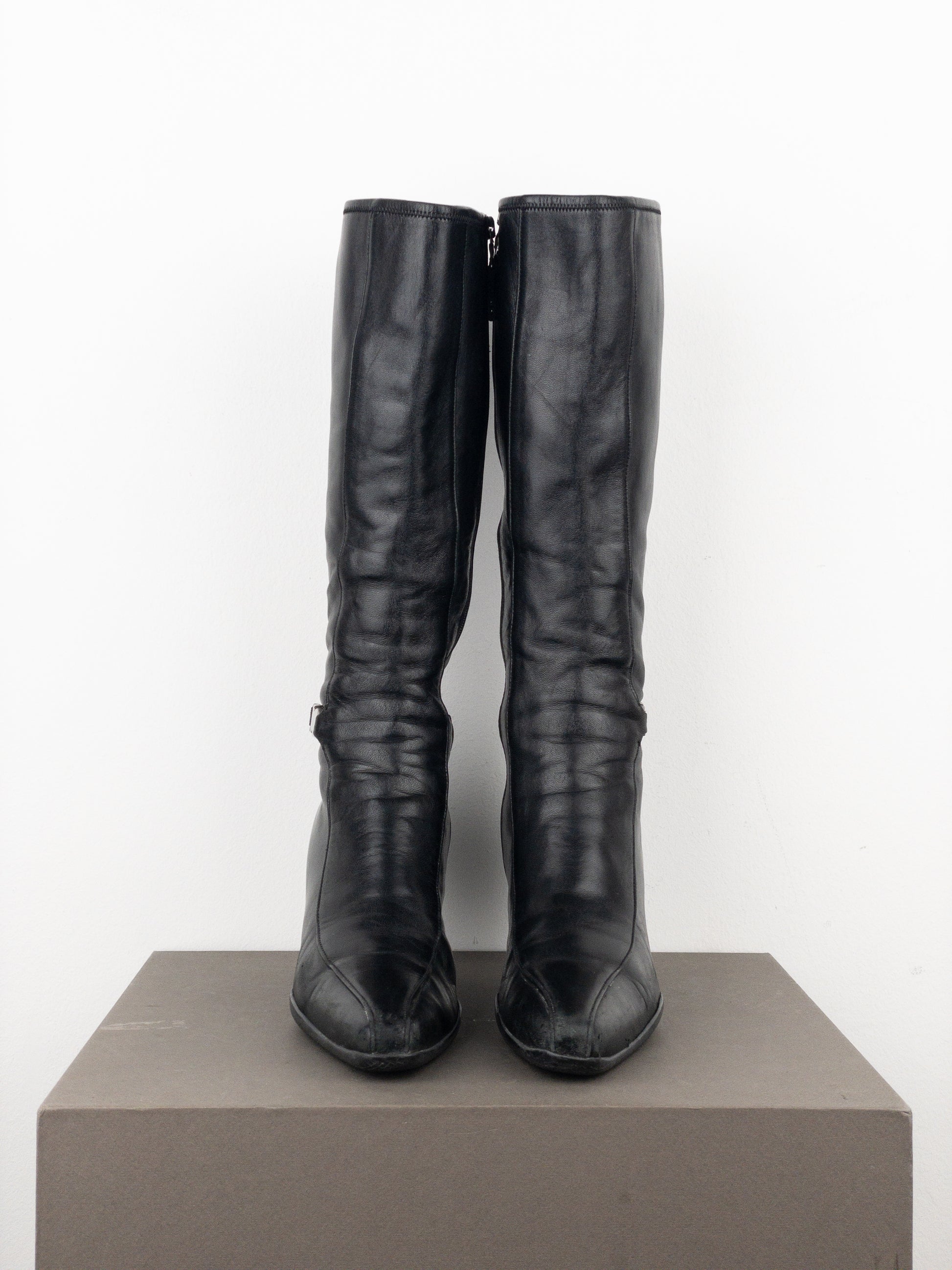 Knee high black leather boots with a kitten heel, featuring a decorative panel down the shin and forefoot, a buckled strap around the ankle, and a zipper on the inside of the shaft, from the 2000s.