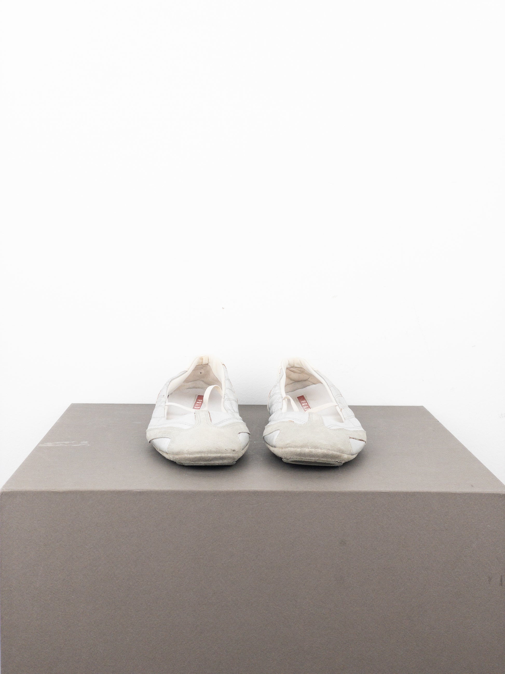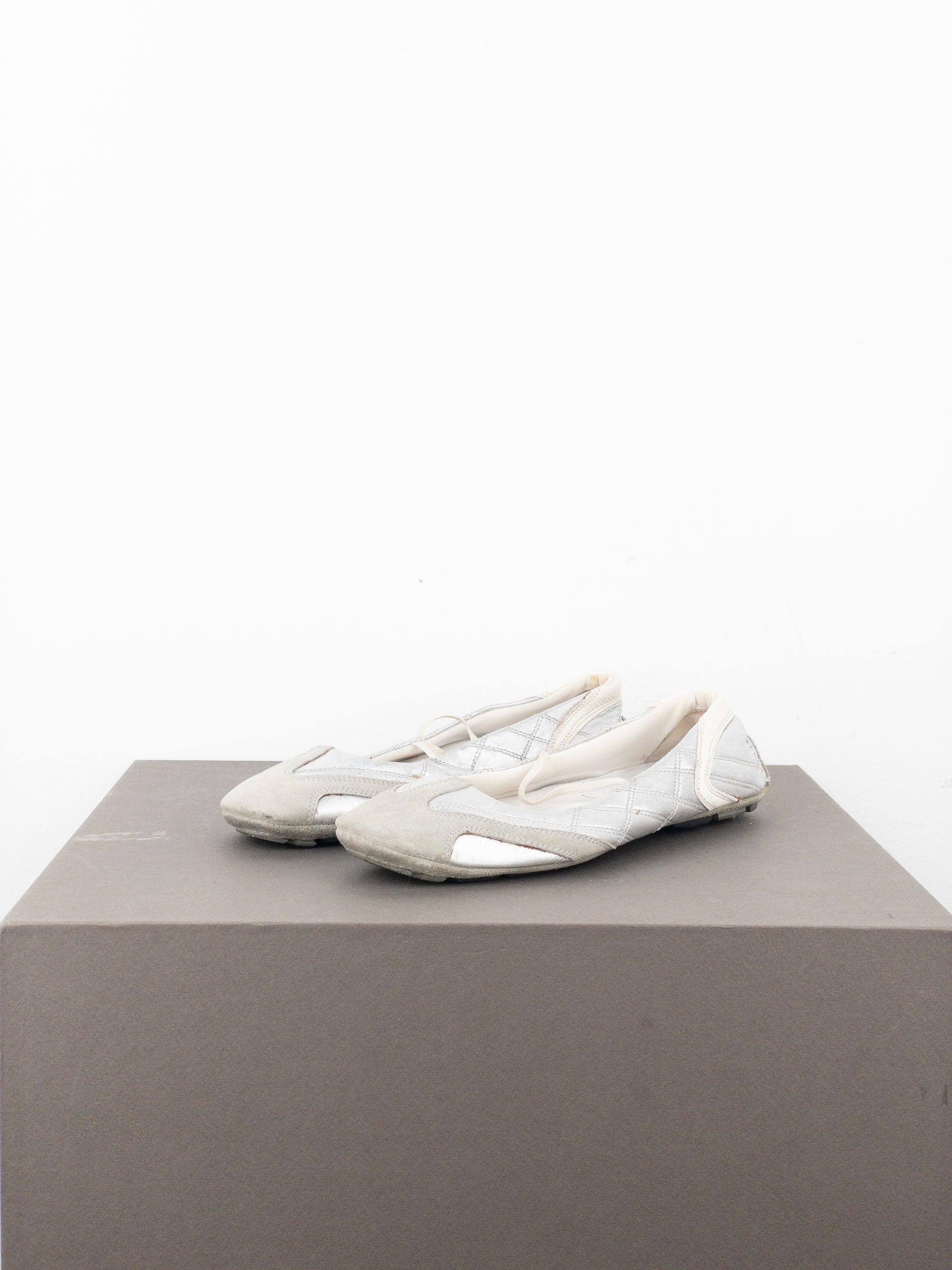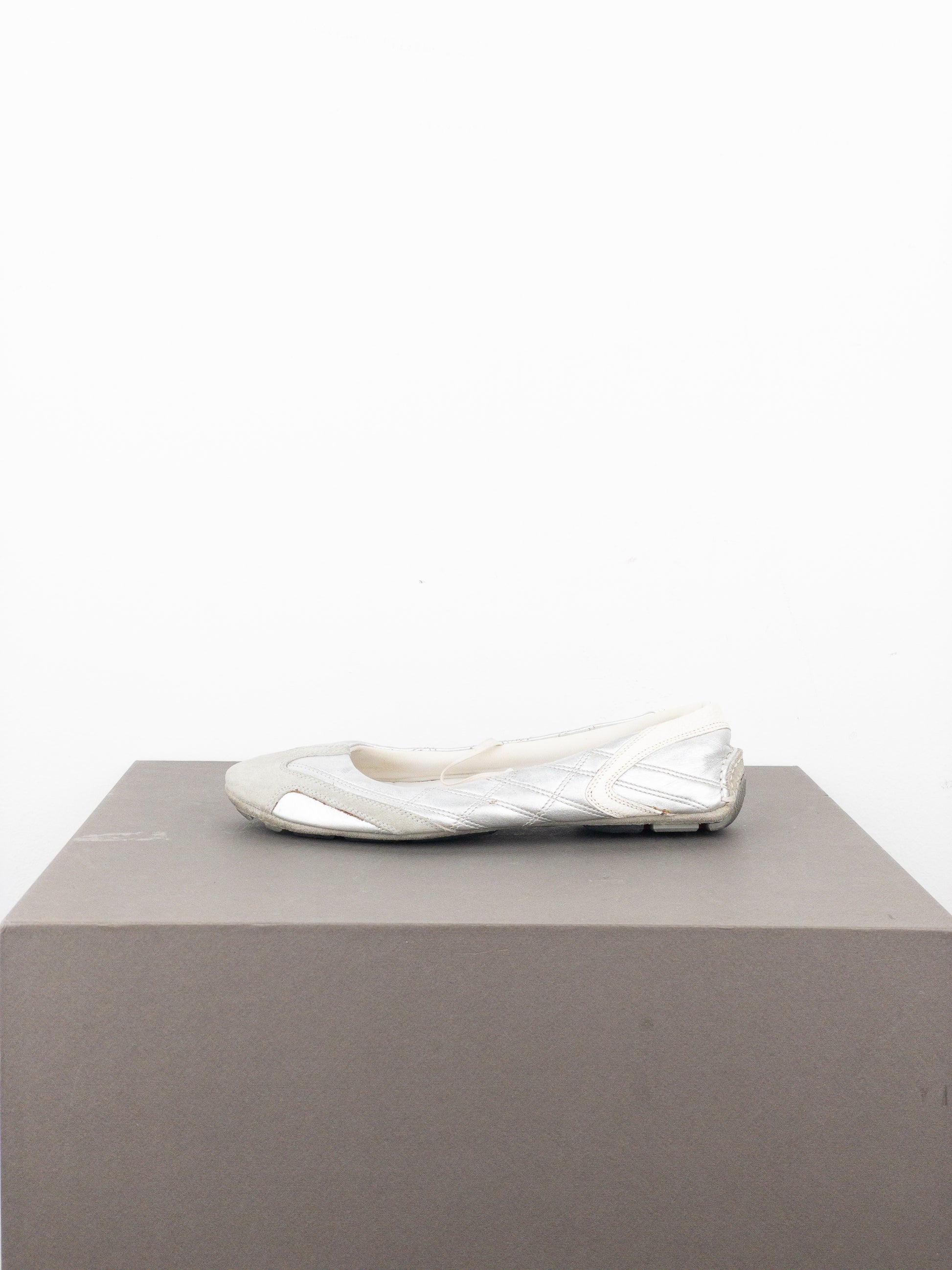 Ballet flats in white and silver-colored leather with grey suede panels, featuring decorative quilting, an elastic mary jane strap across the forefoot, and a flat sole reminiscent of racing shoes used in motorsports, from the 2000s.