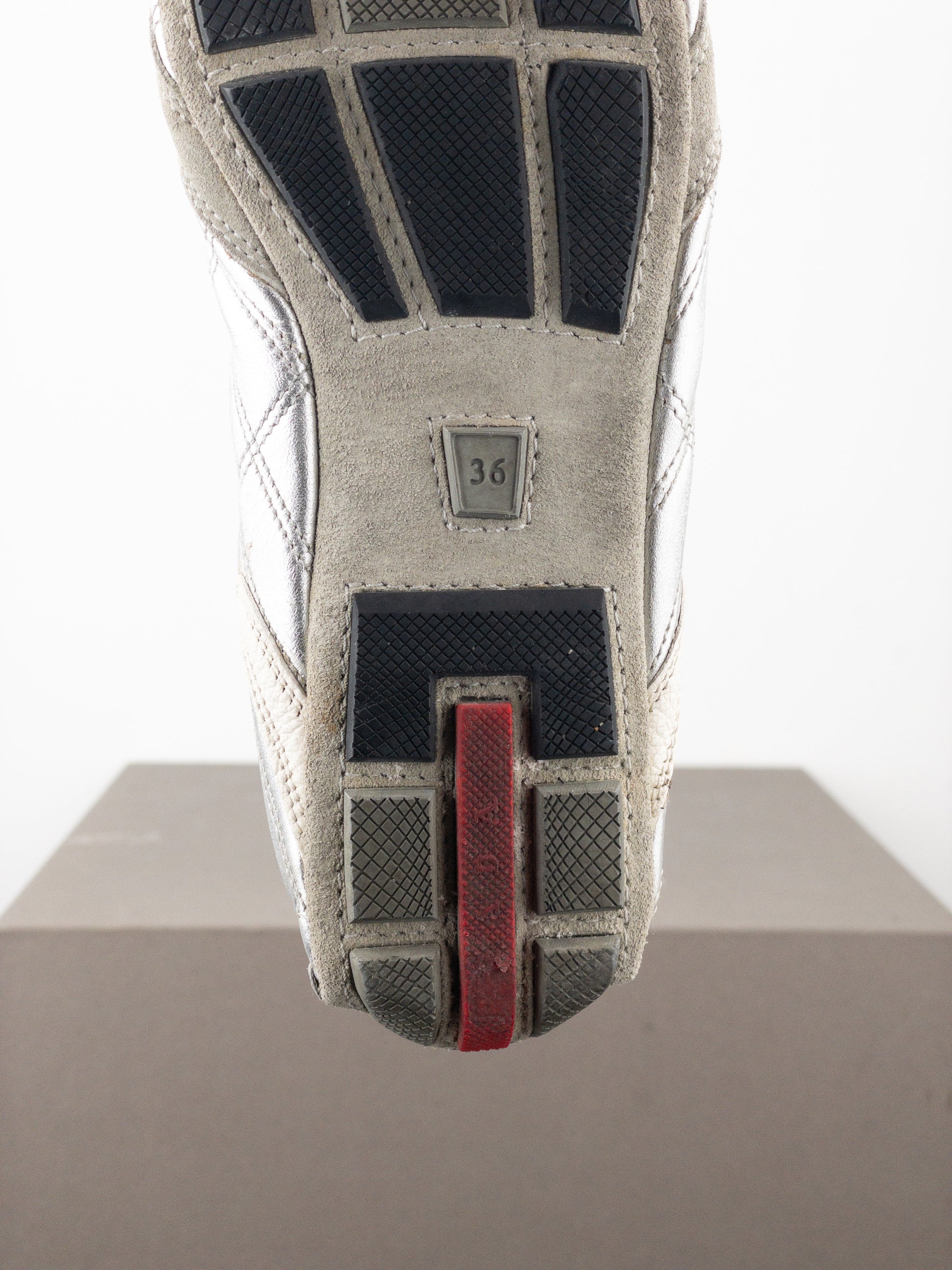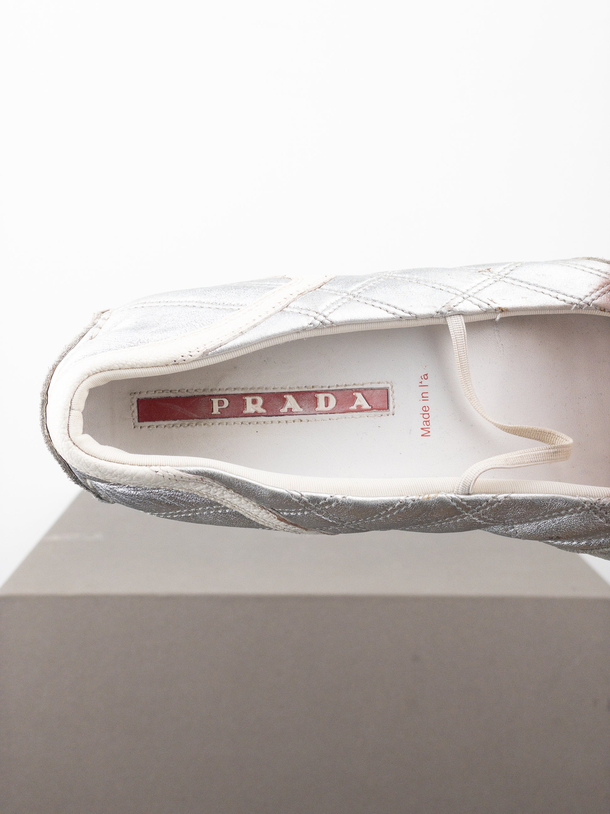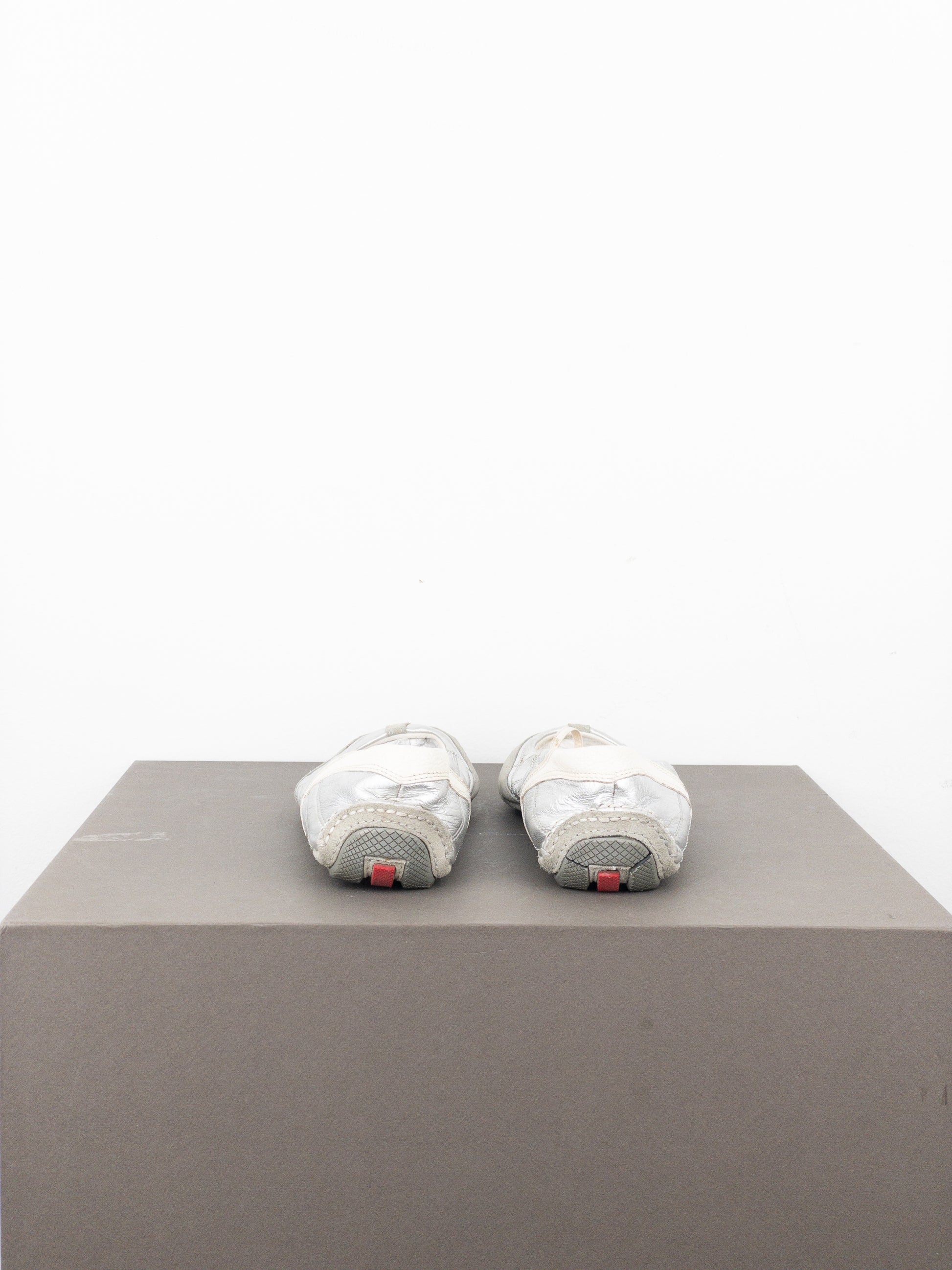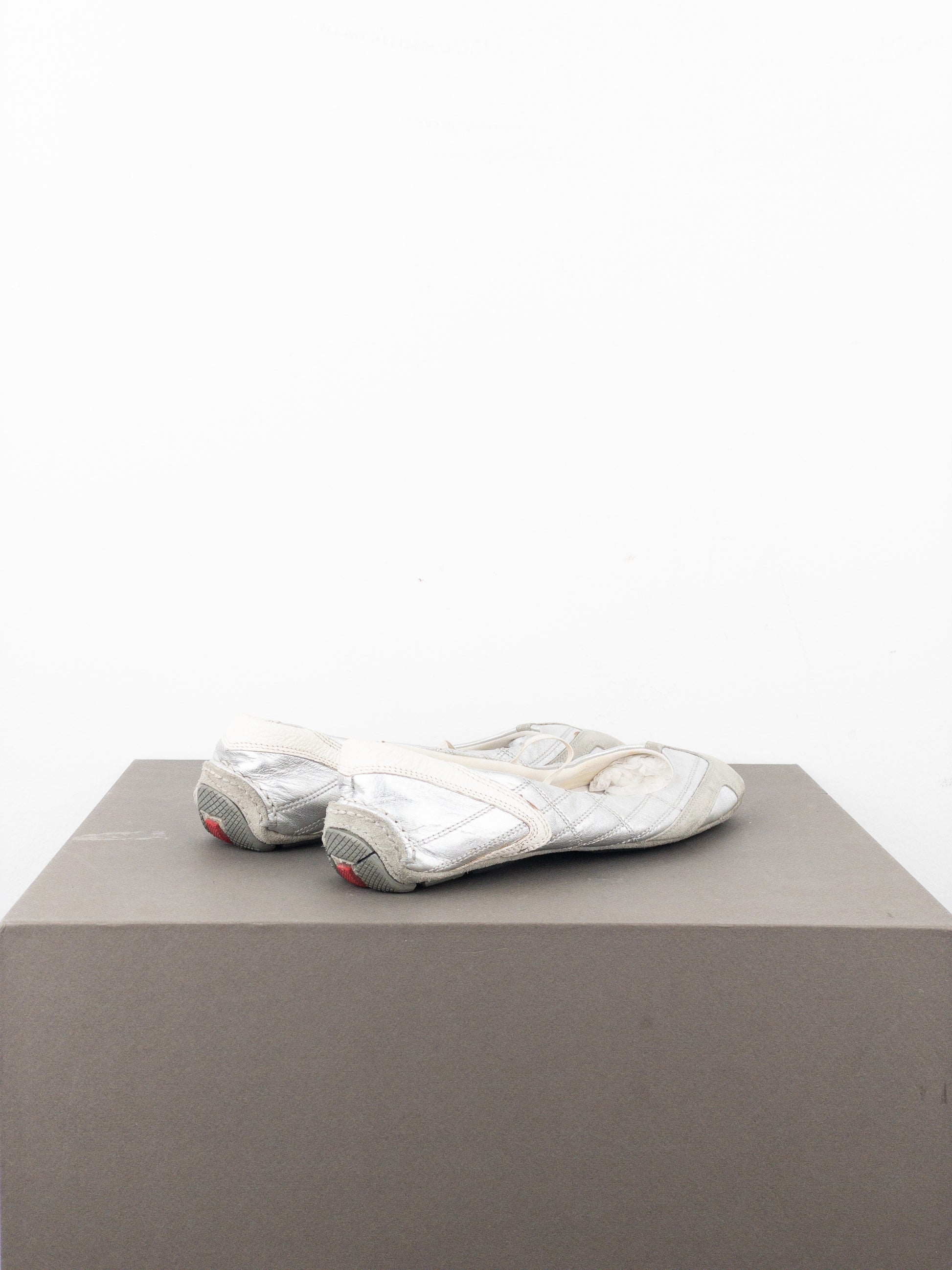 Ballet flats in white and silver-colored leather with grey suede panels, featuring decorative quilting, an elastic mary jane strap across the forefoot, and a flat sole reminiscent of racing shoes used in motorsports, from the 2000s.