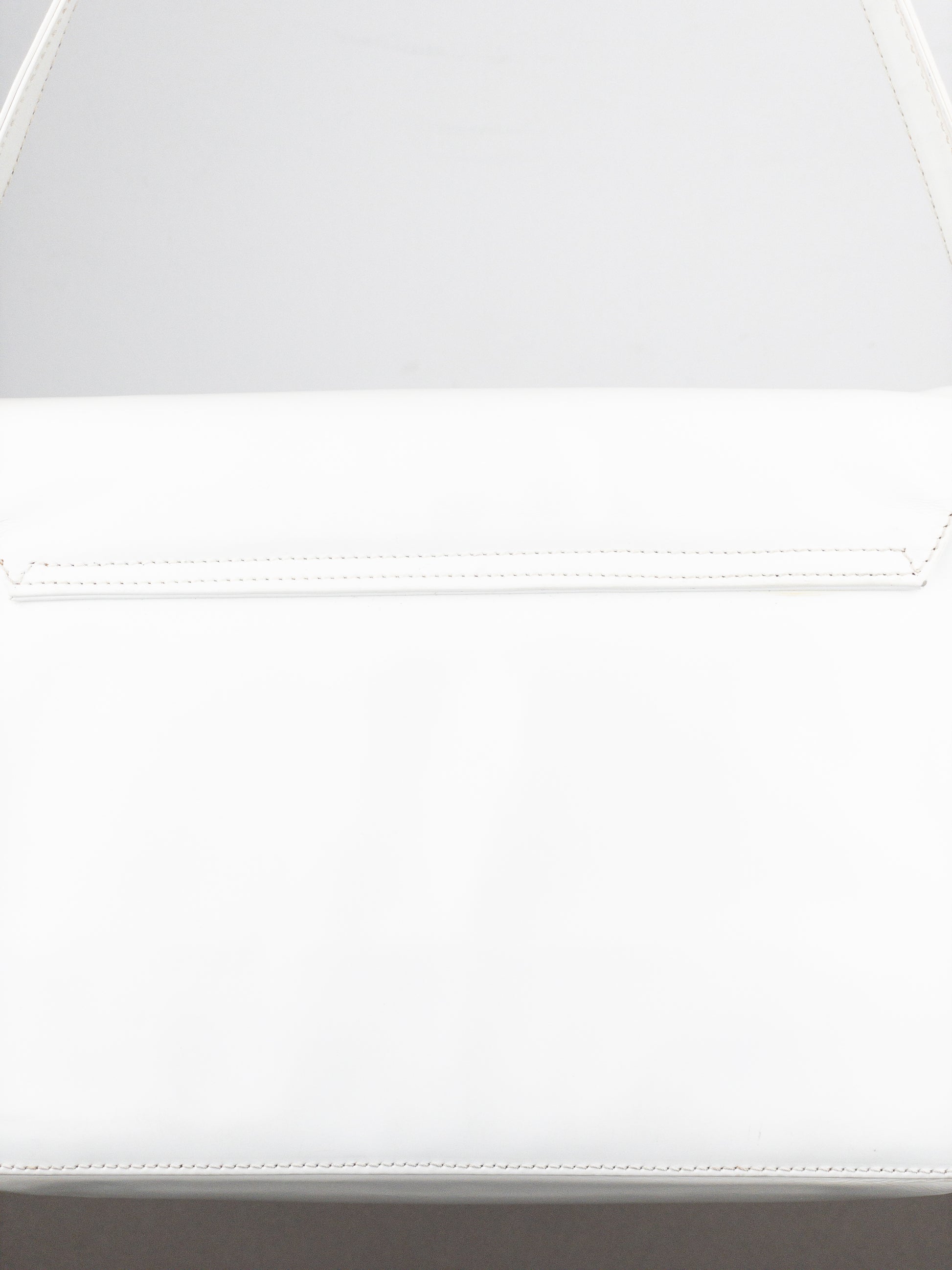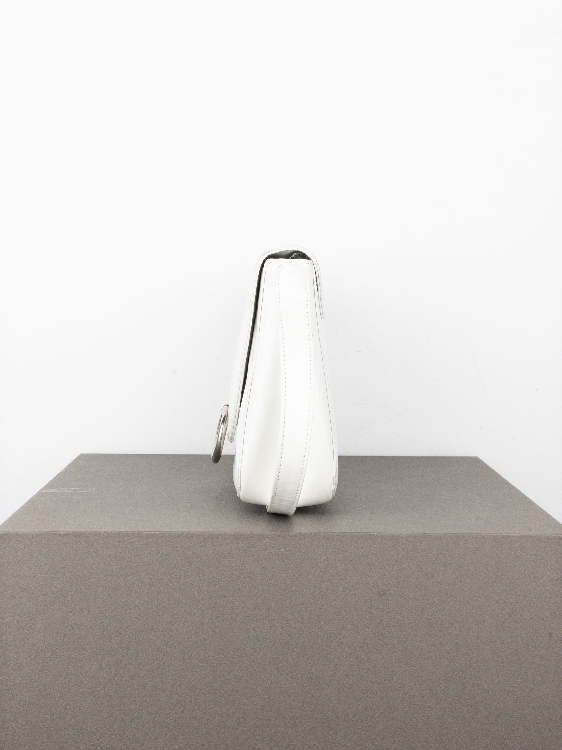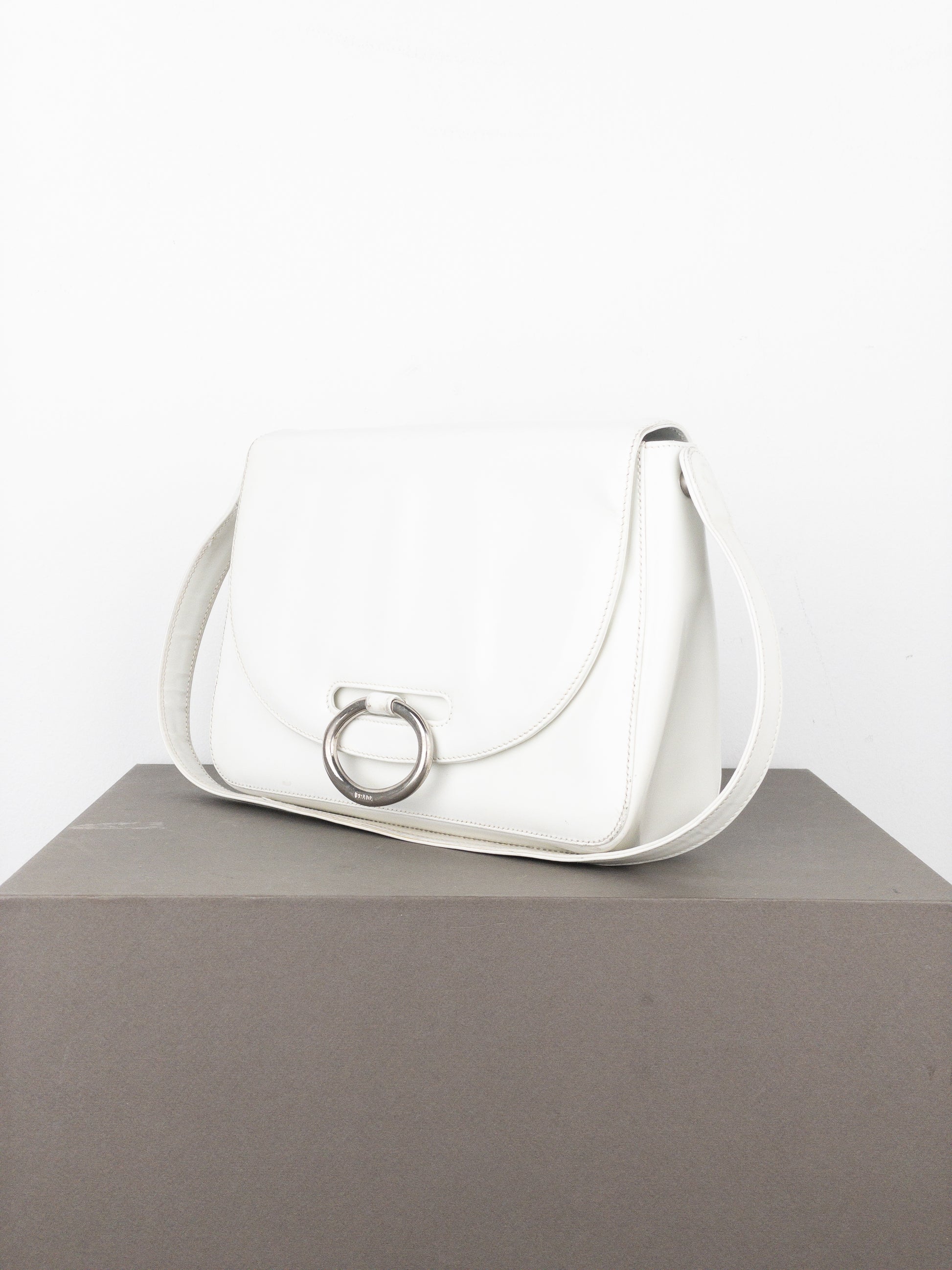 Structured shoulder bag in patent white leather with a logo branded silver-colored metal ring for closure, from the 2000s.