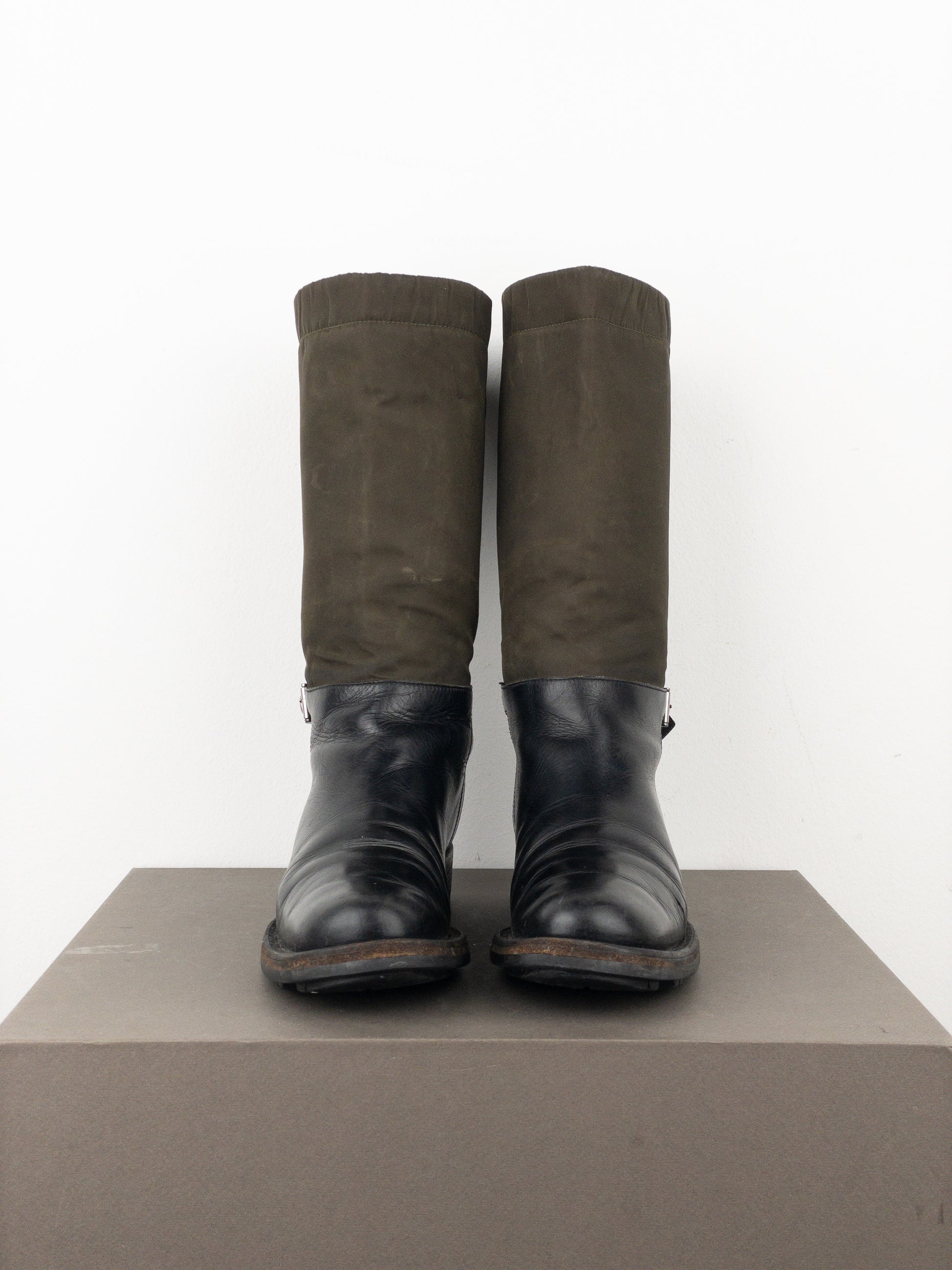 Mid-calf riding boots in black leather and dark grey canvas, featuring a rounded toe and a buckled strap around the the ankle, from the 2000s.