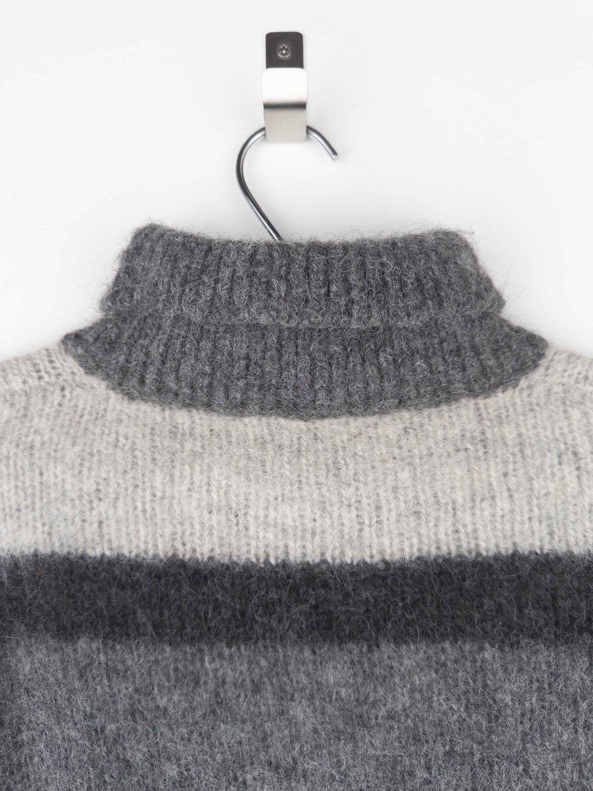 Beige knit turtleneck sweater in fuzzy fabric with a geometric grey and dark brown pattern, from the 2000s.