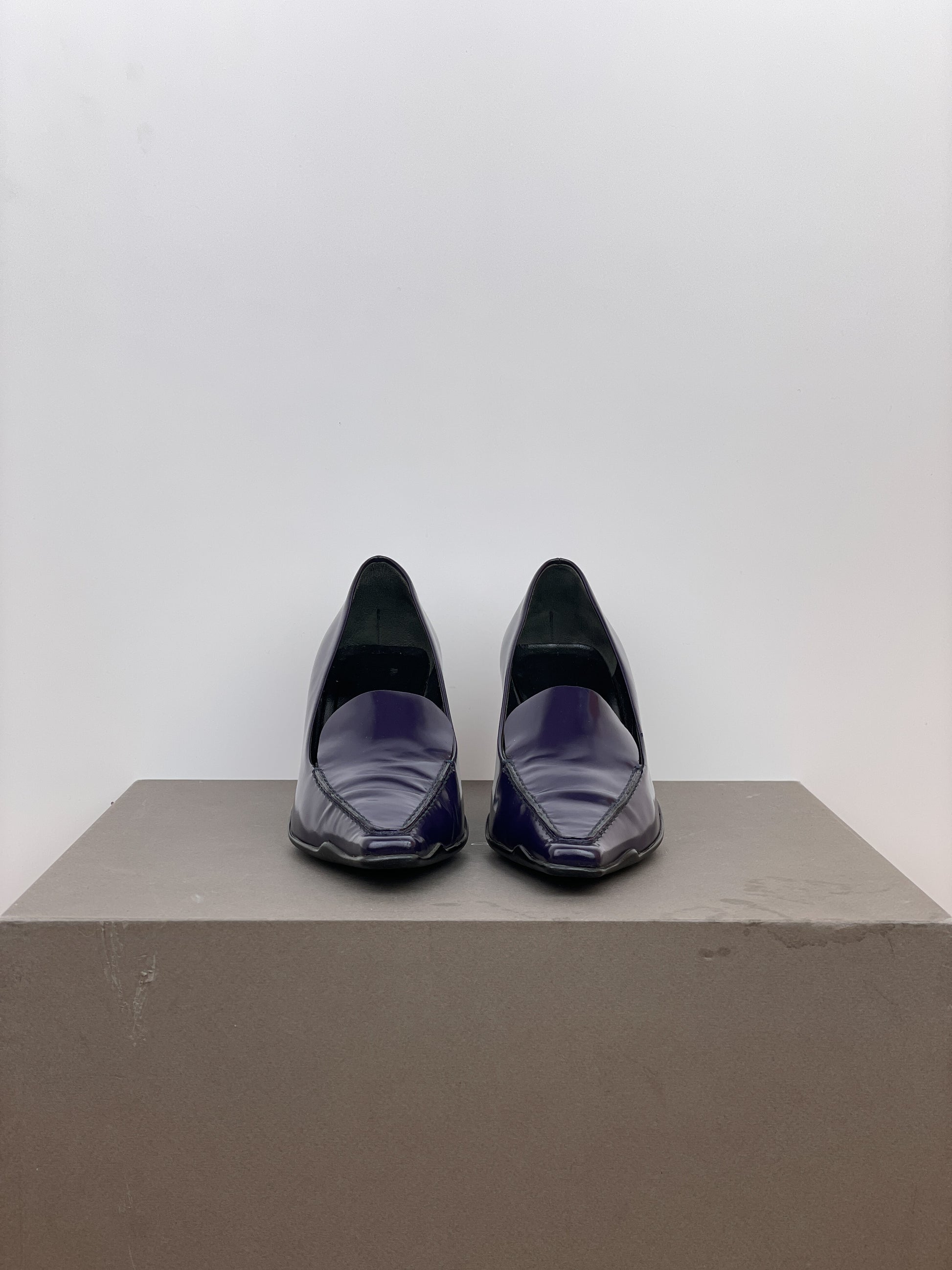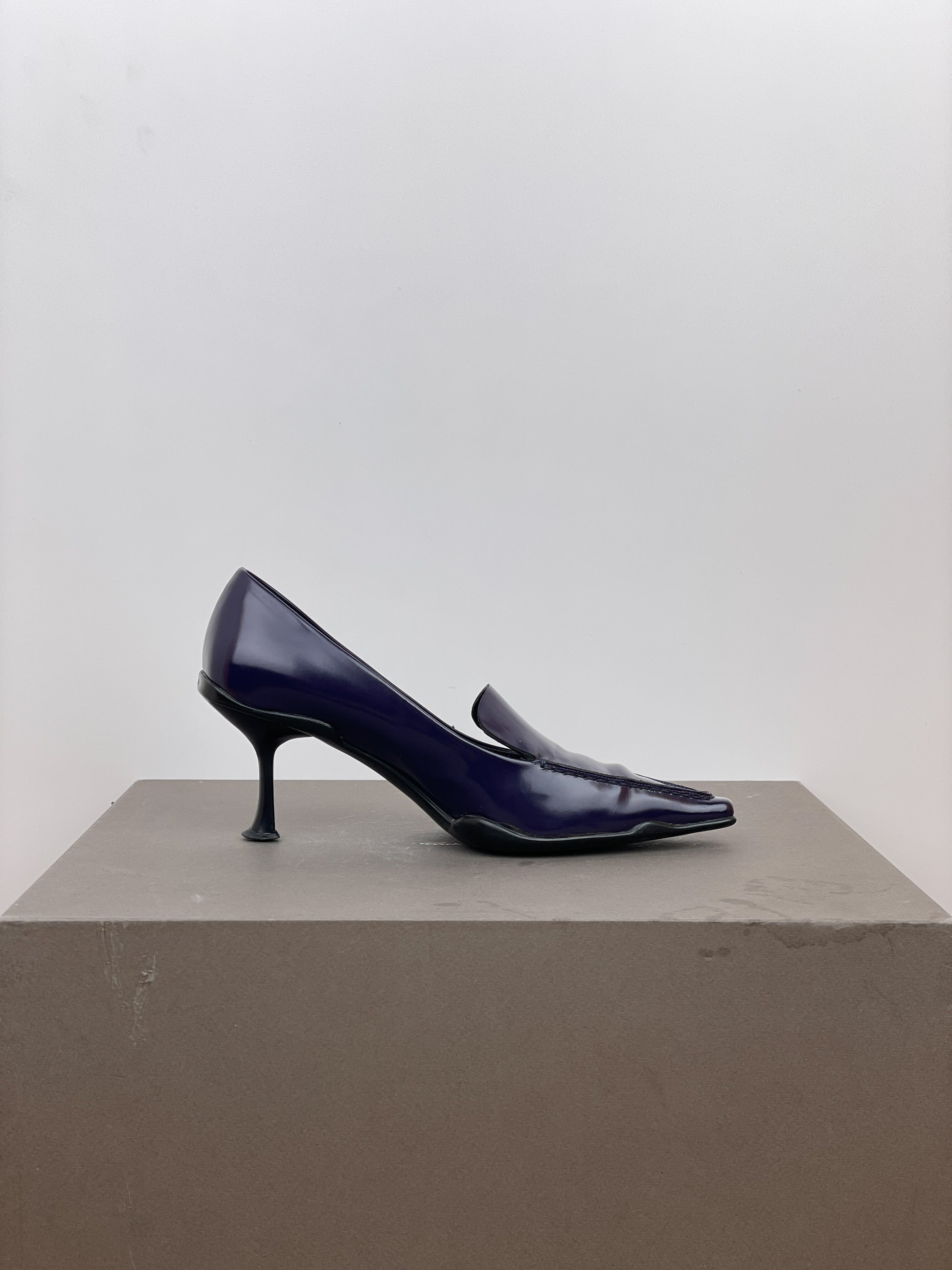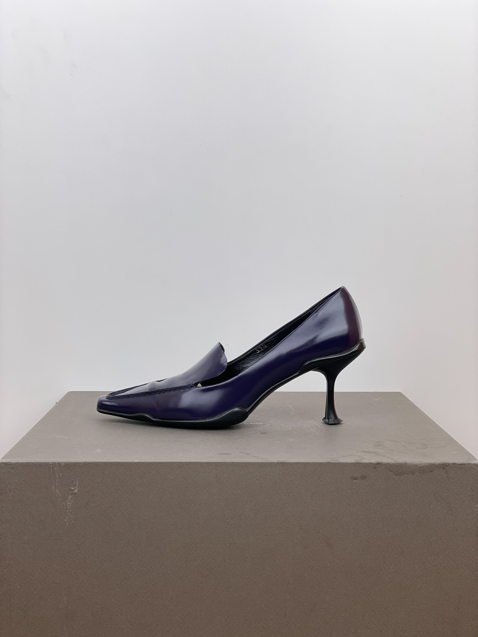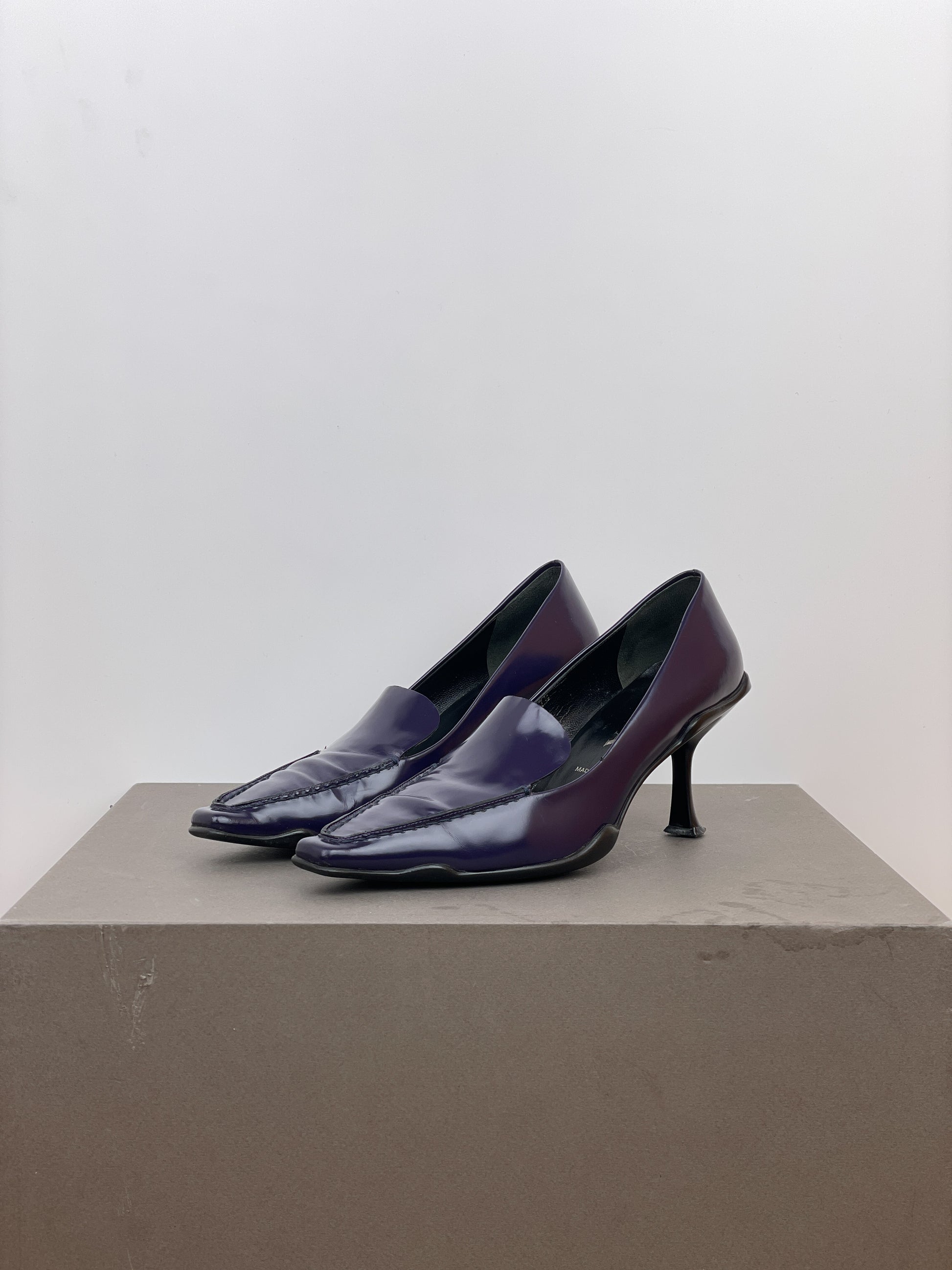 Pump heels in purple leather with a slight square toe, featuring a flared kitten heel and the sculptural sports sole, from the autumn-winter 1999 collection.