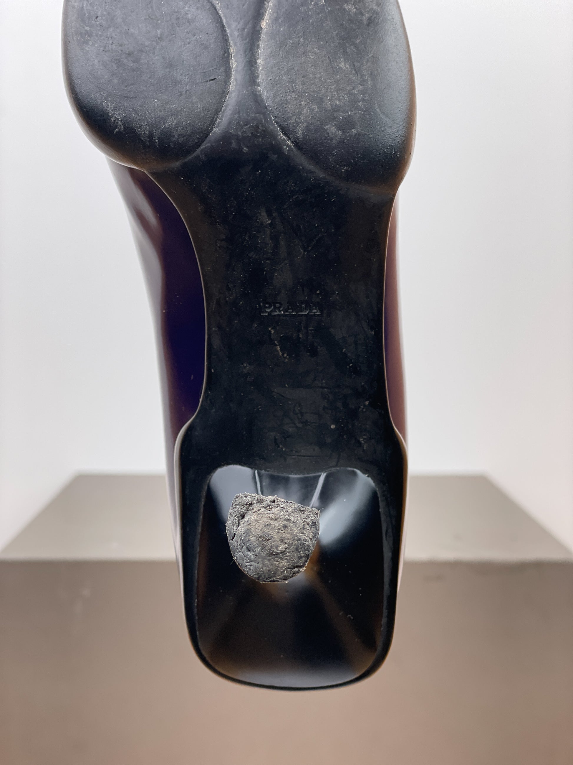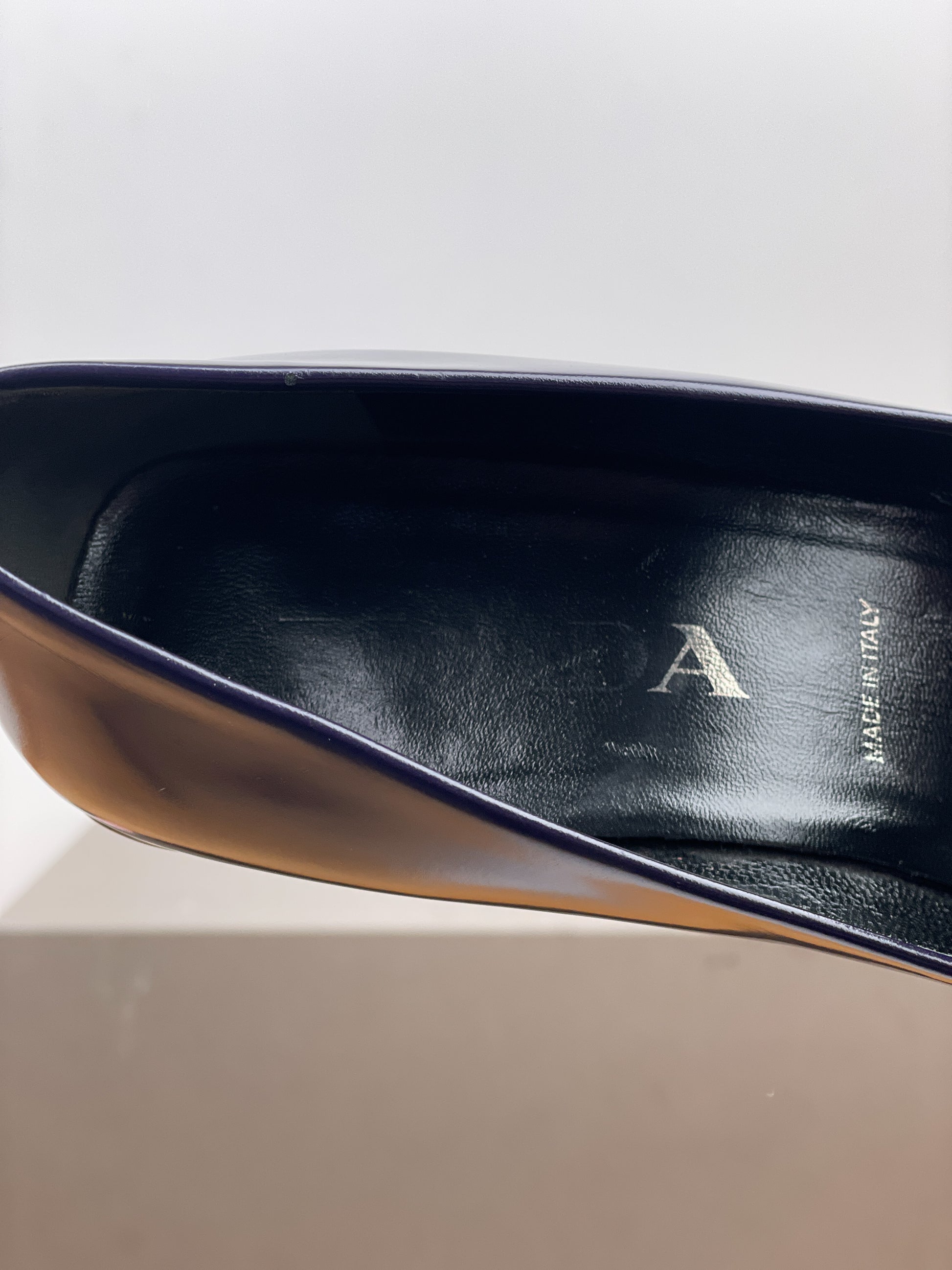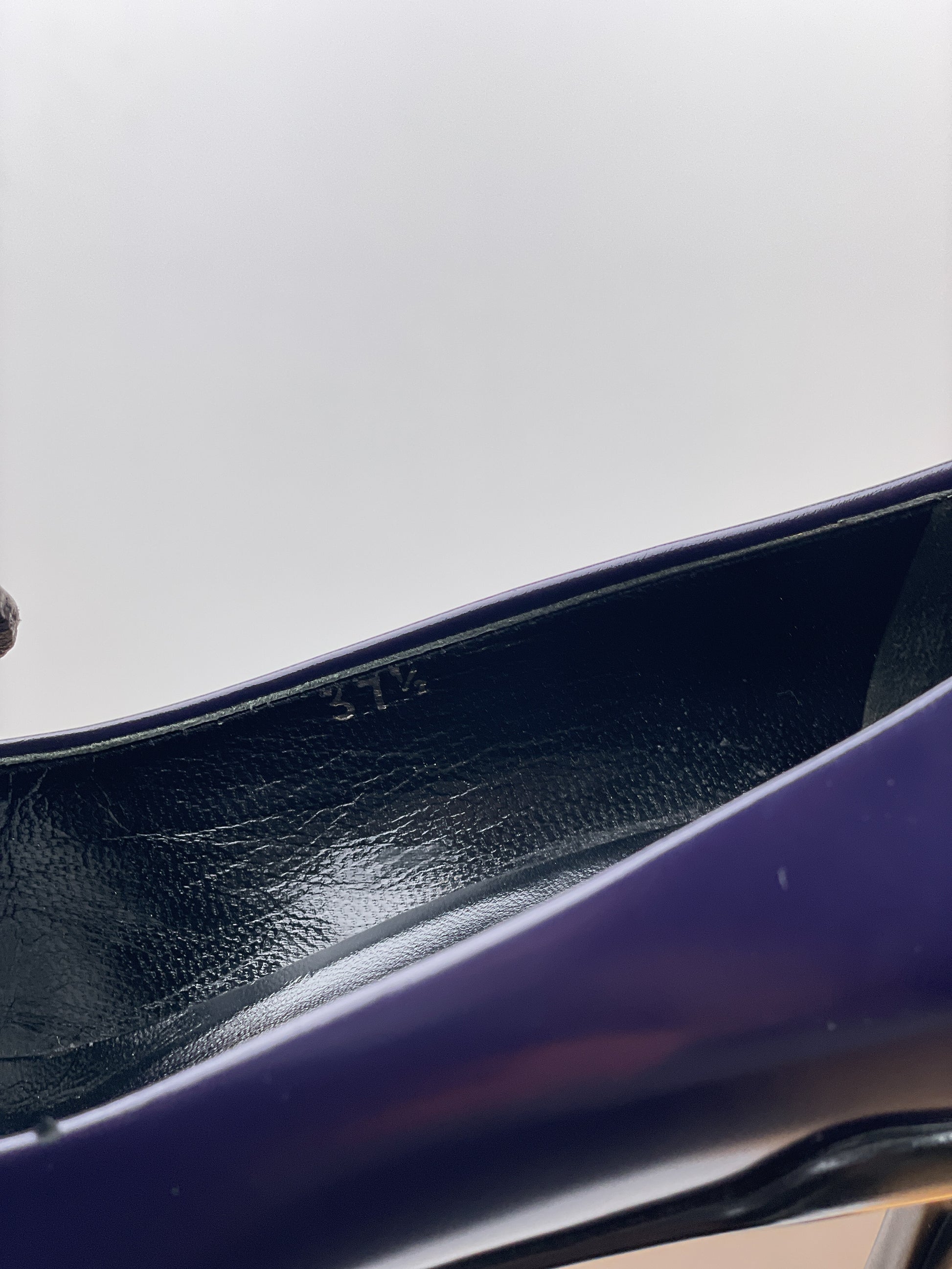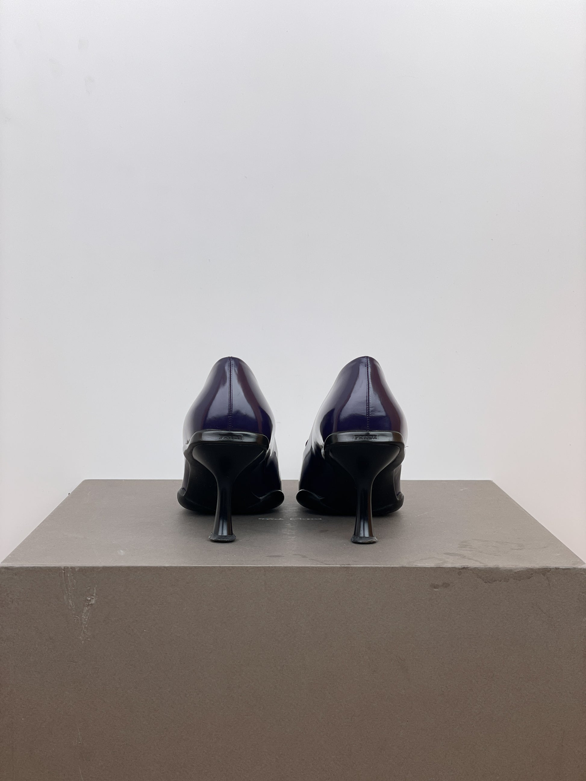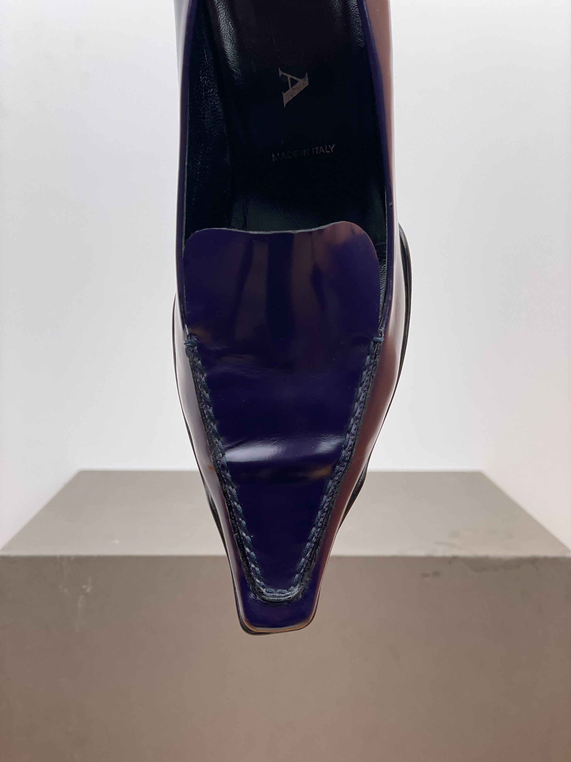 Pump heels in purple leather with a slight square toe, featuring a flared kitten heel and the sculptural sports sole, from the autumn-winter 1999 collection.