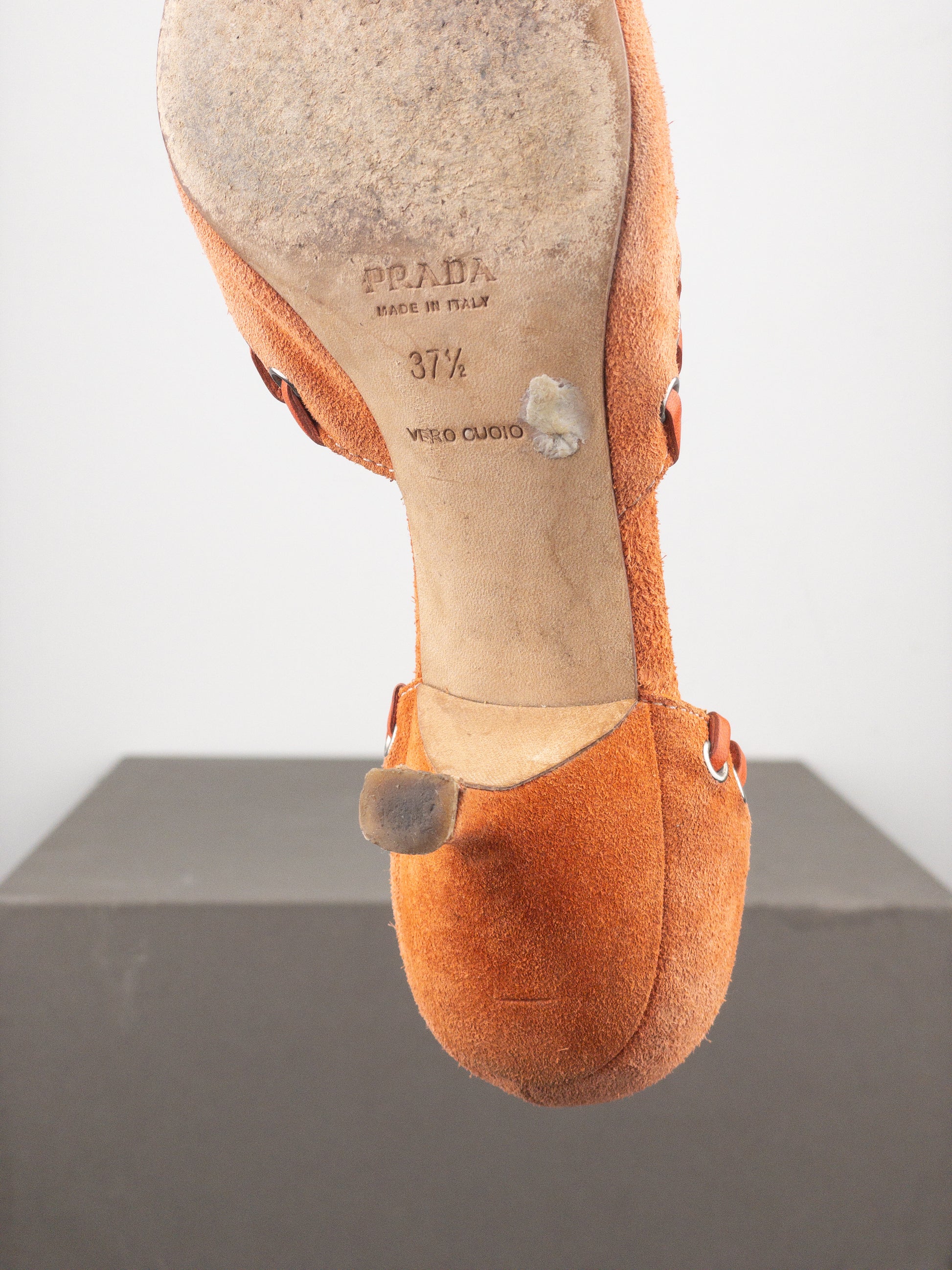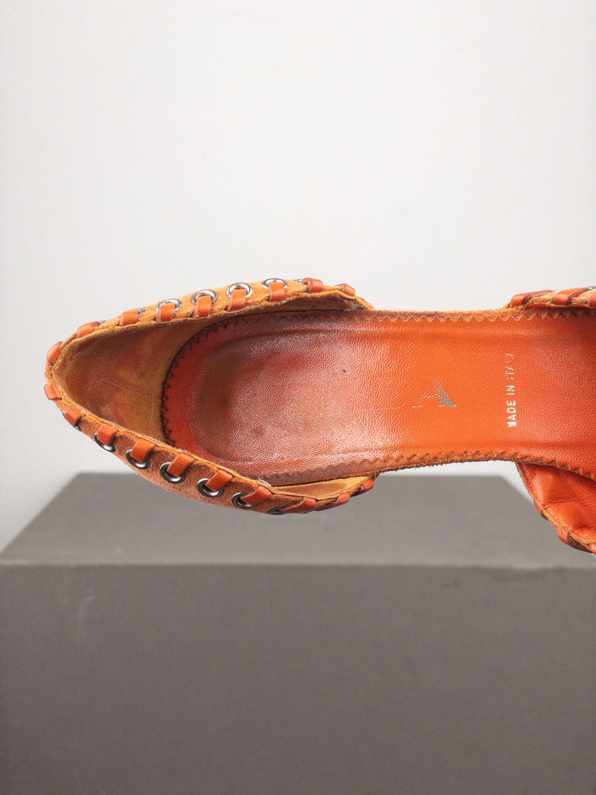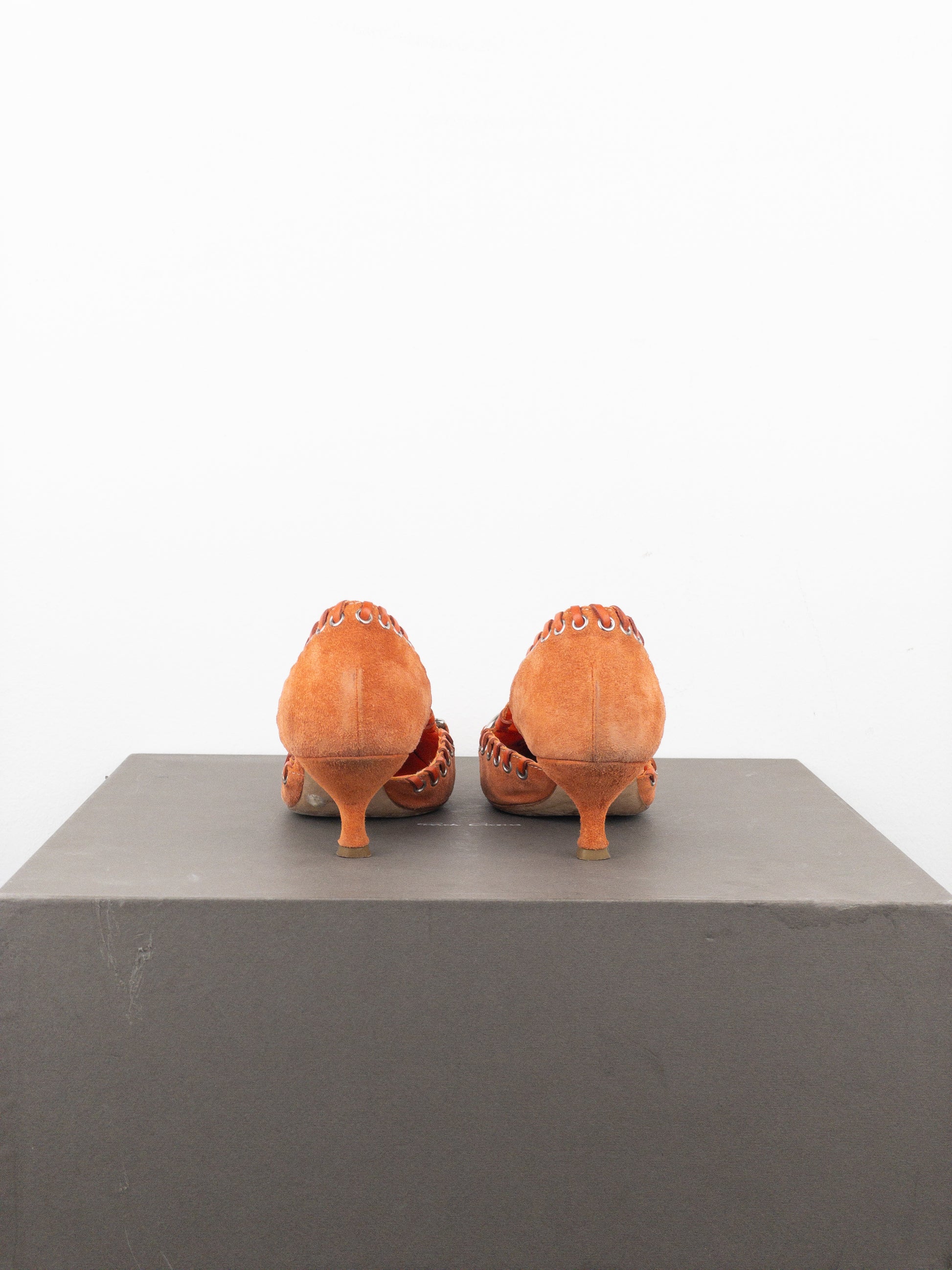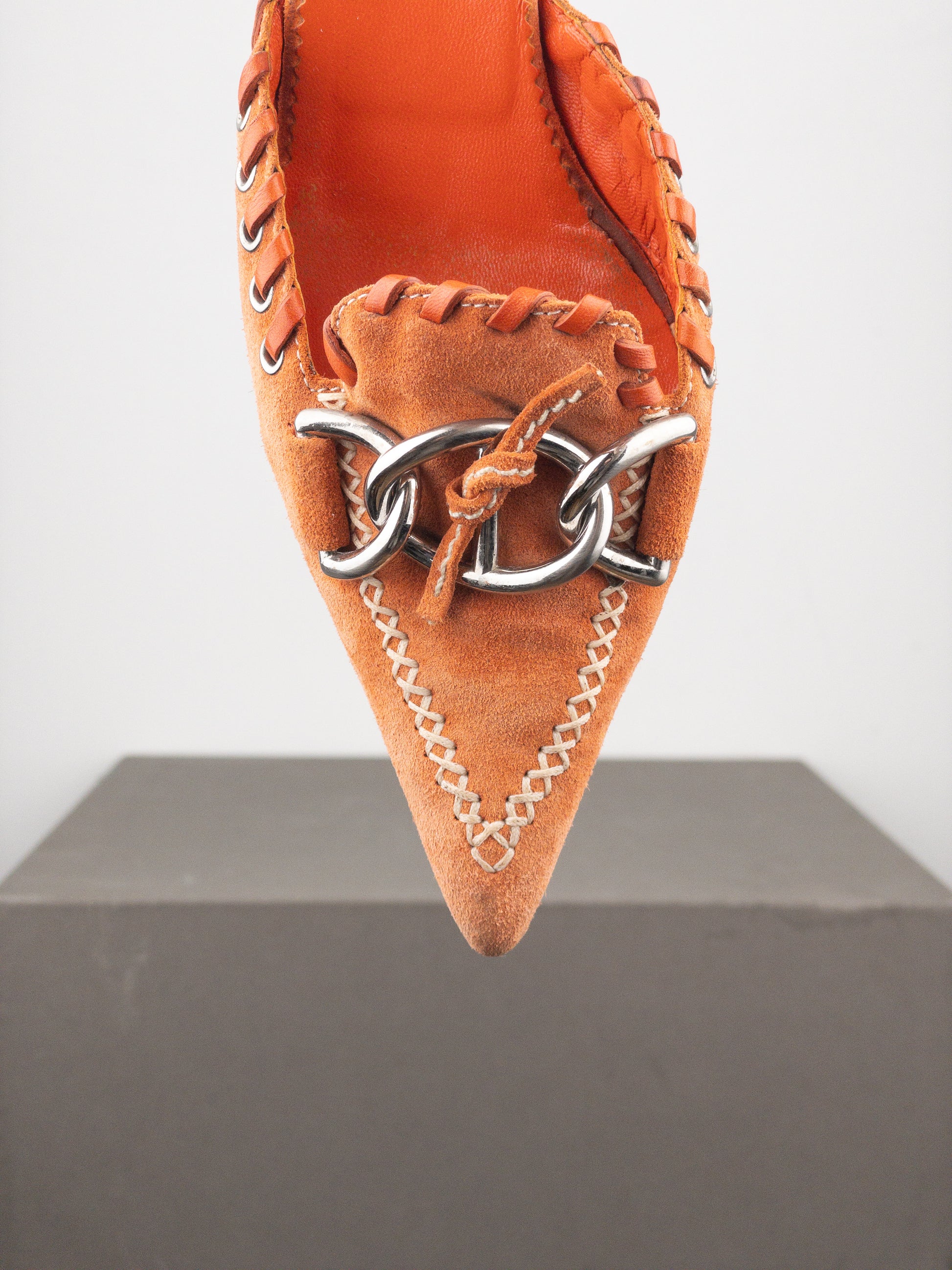 Pumps in orange suede with a pointed toe and a kitten heel, featuring decorative white contrast cross-stitching around the toebox, orange lacing around the openings, and a silver-colored buckle across the toebox, from the 2000s.