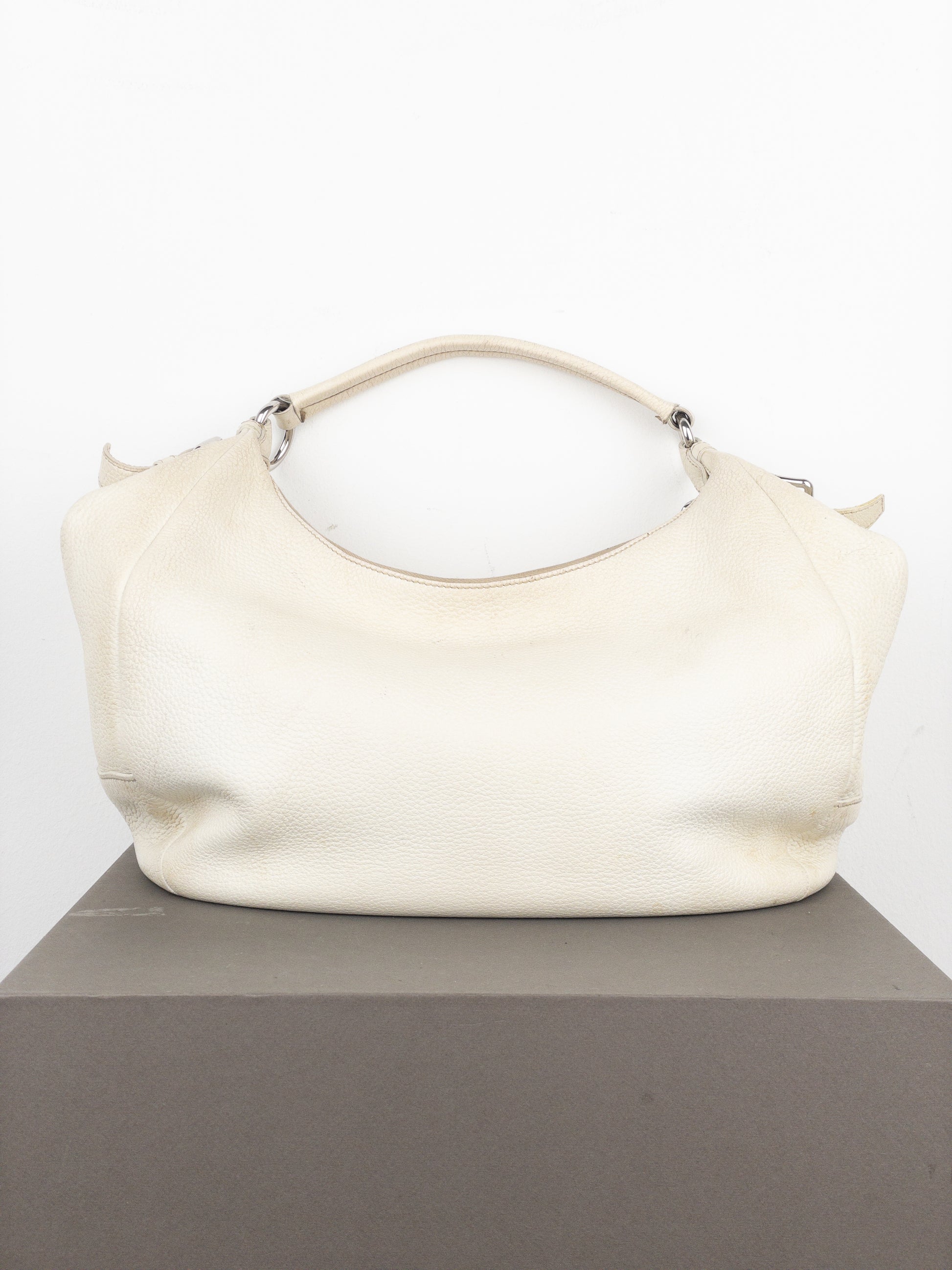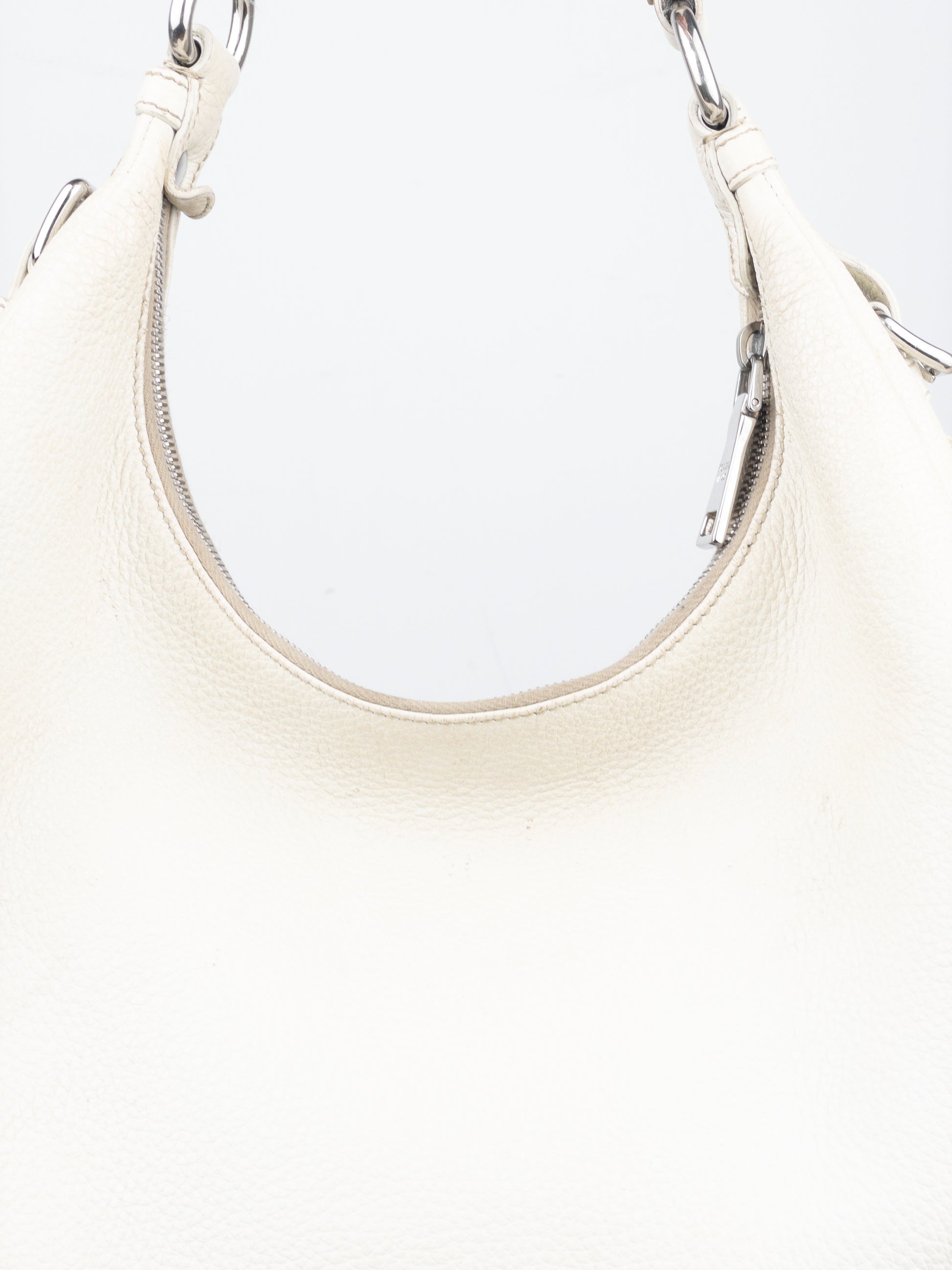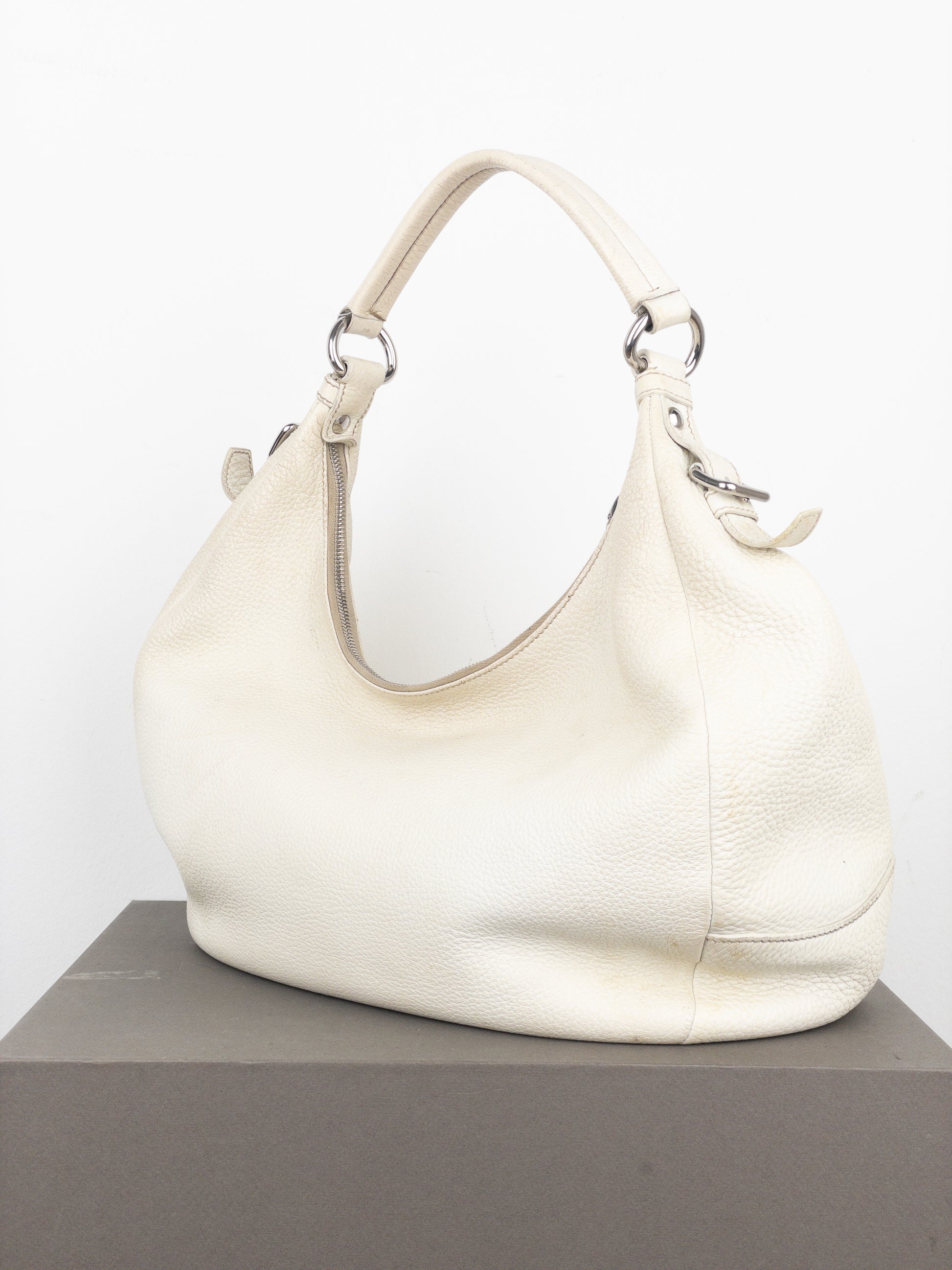 ‘Daino’ hobo shoulder bag in white pebbled leather with a small silver-colored logo plaque, from the 2000s.