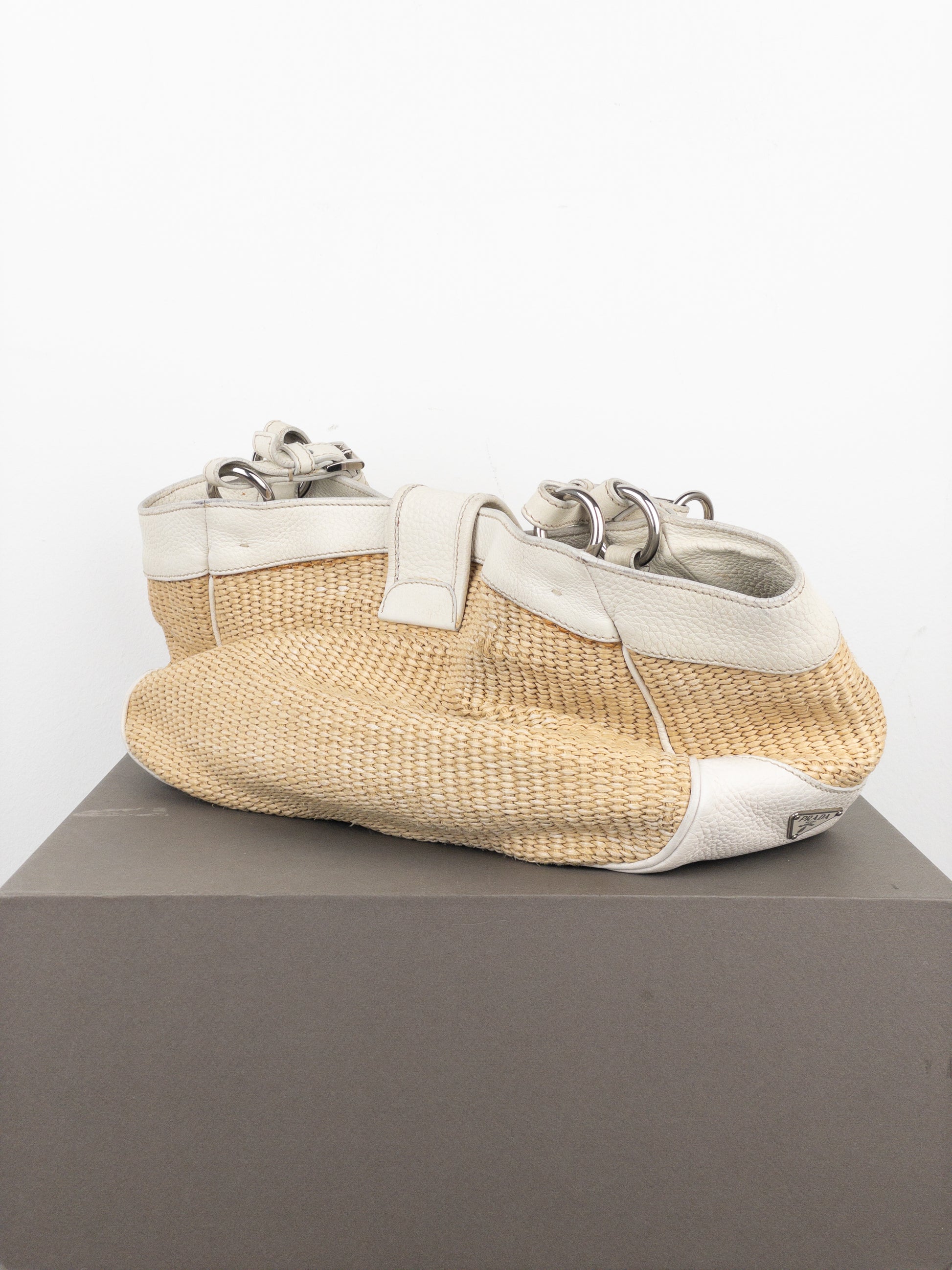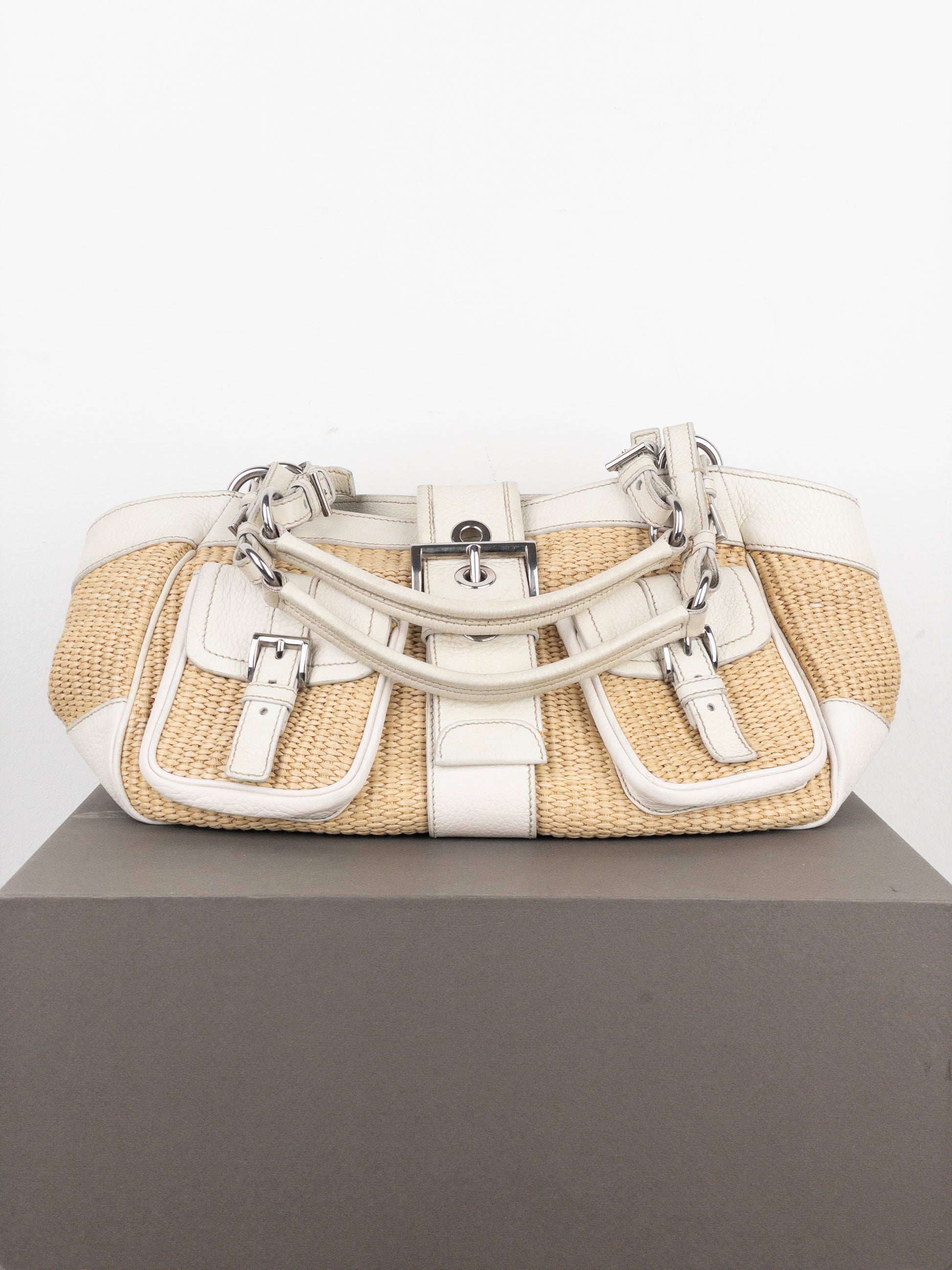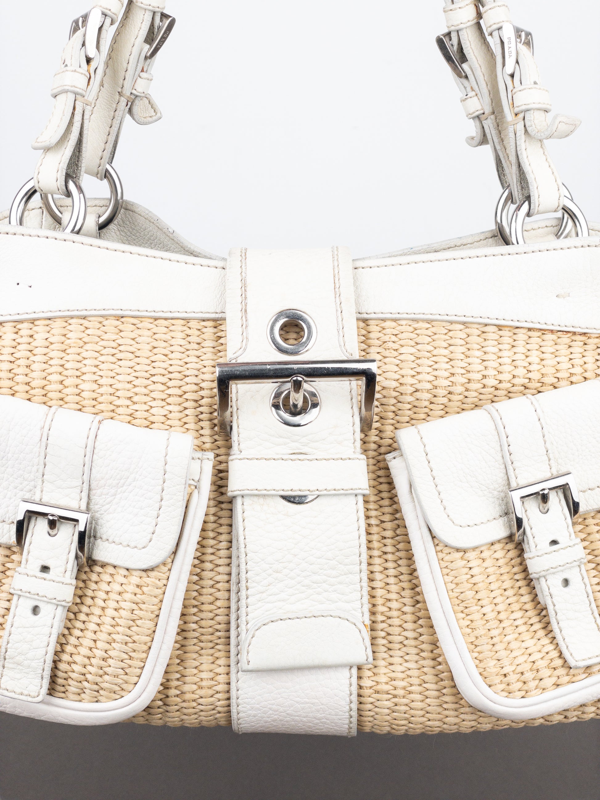 Handbag in wicker and white leather, featuring two front pockets, a buckled belt across the top, and the signature triangle logo plaque in the front, from the 2000s.