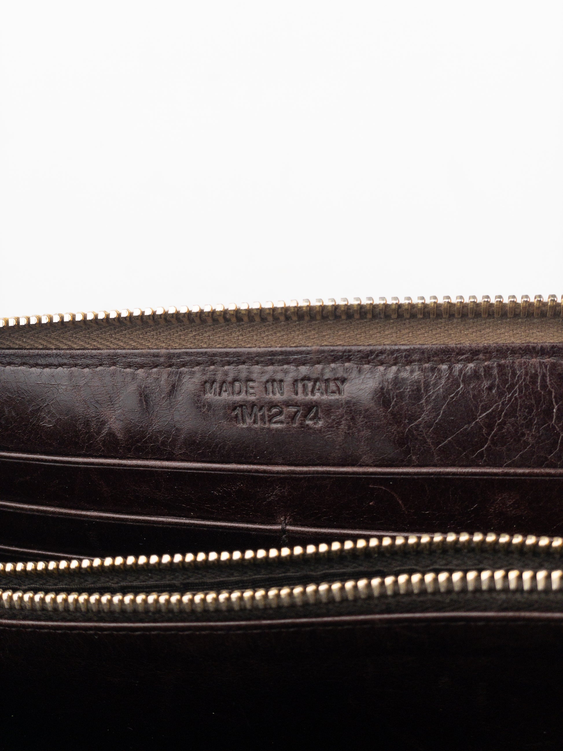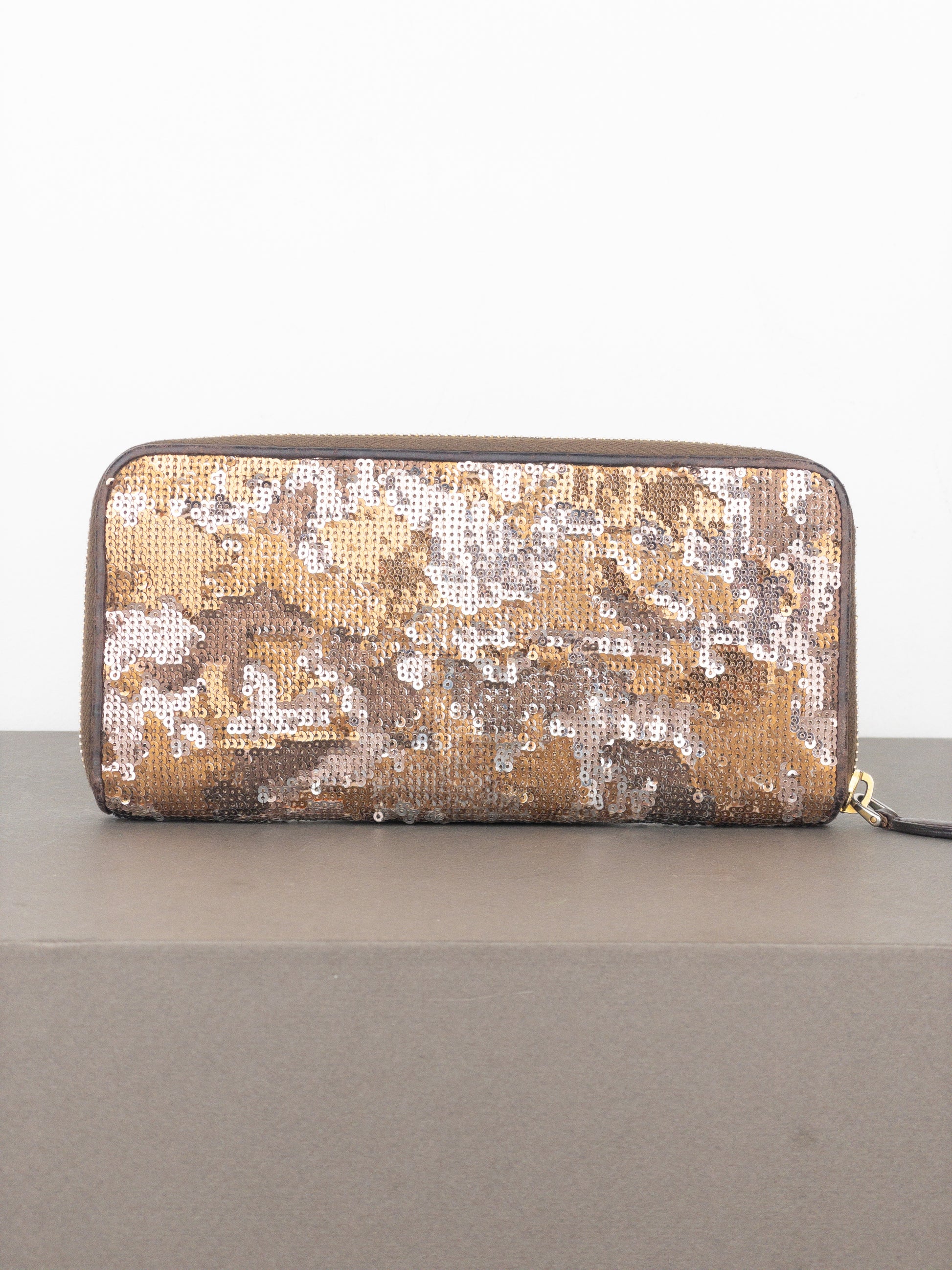 Long zipper wallet in brown leather covered with gold, silver and brown sequins in a camouflage pattern, featuring a gold-colored metal logo in the front, from the 2010s.