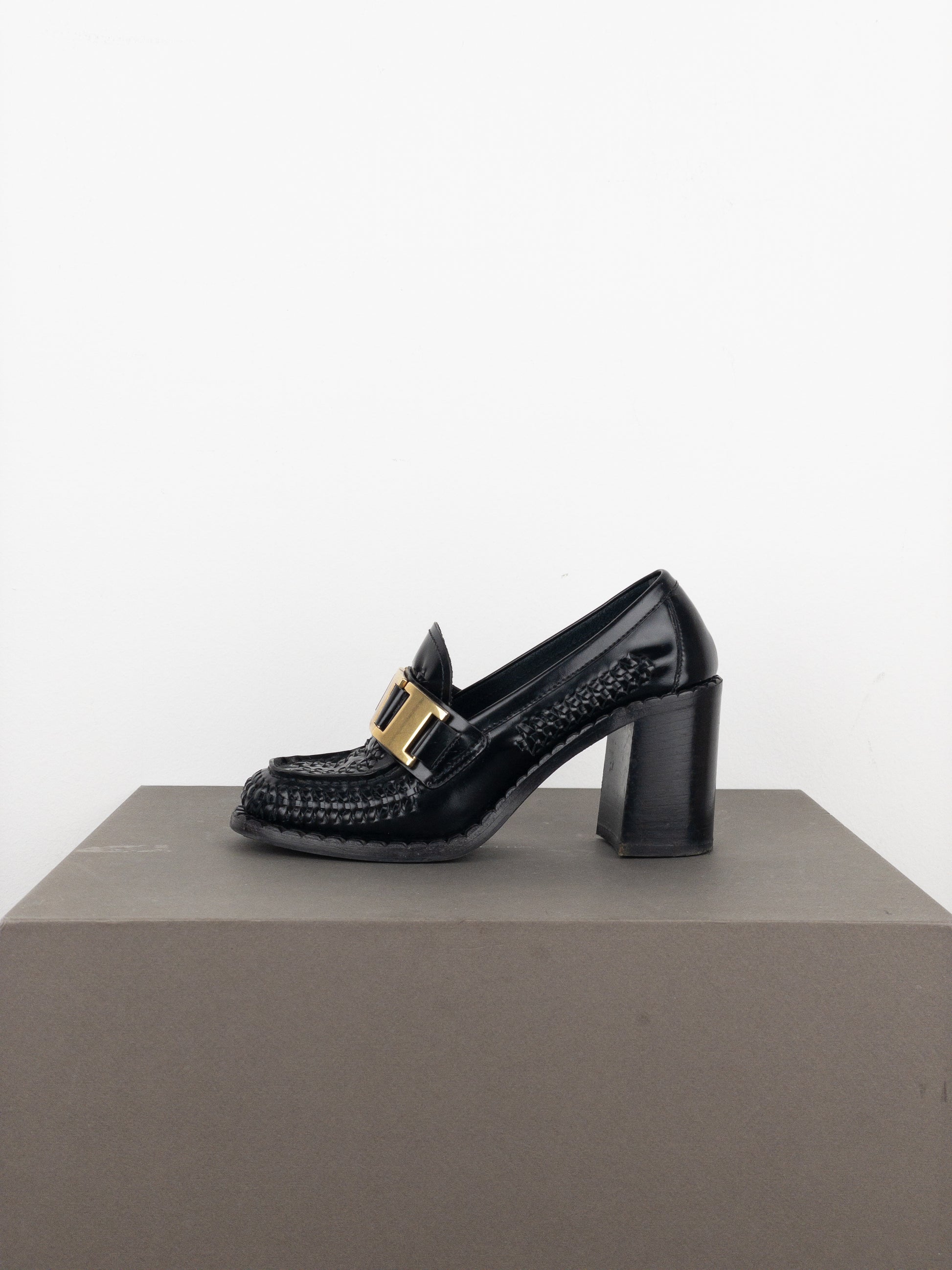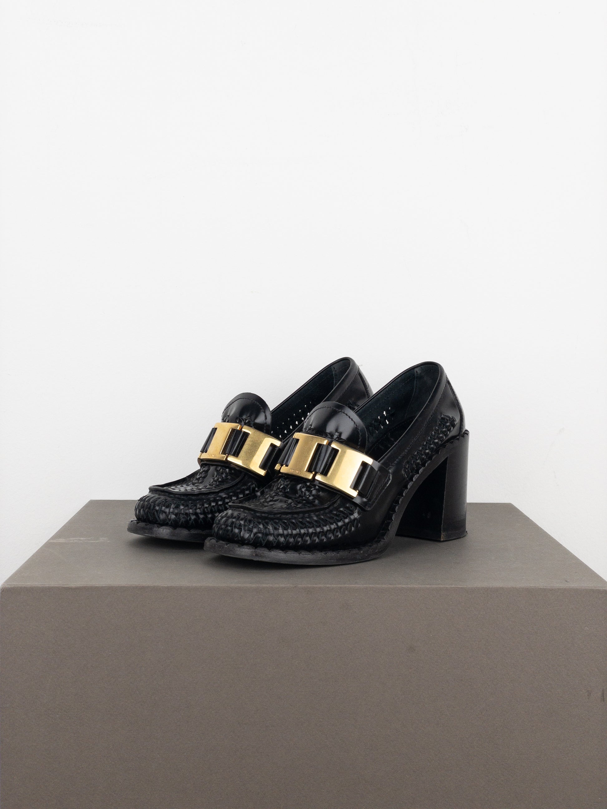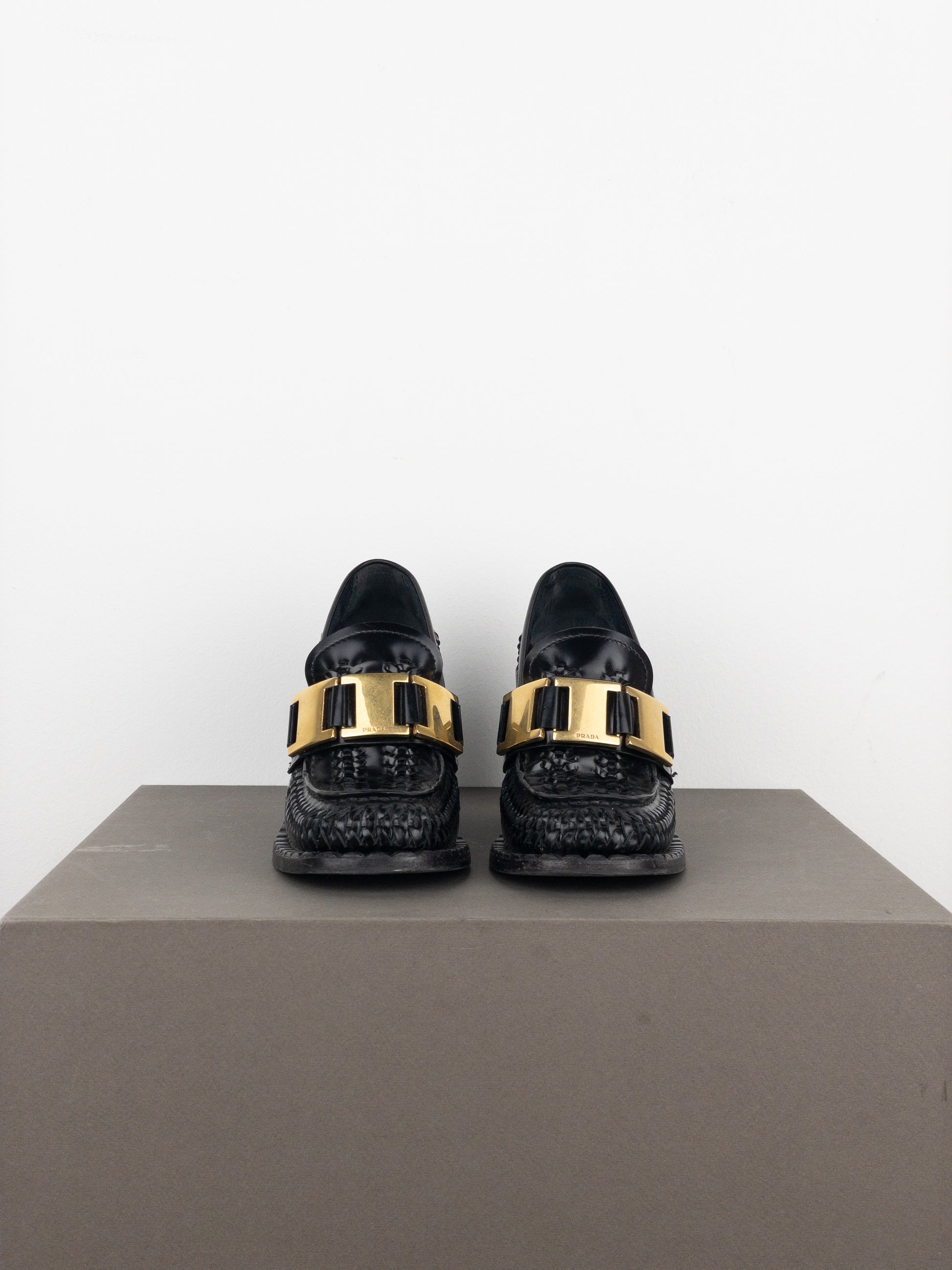Prada Square Toe Buckle Loafer Pump Heels