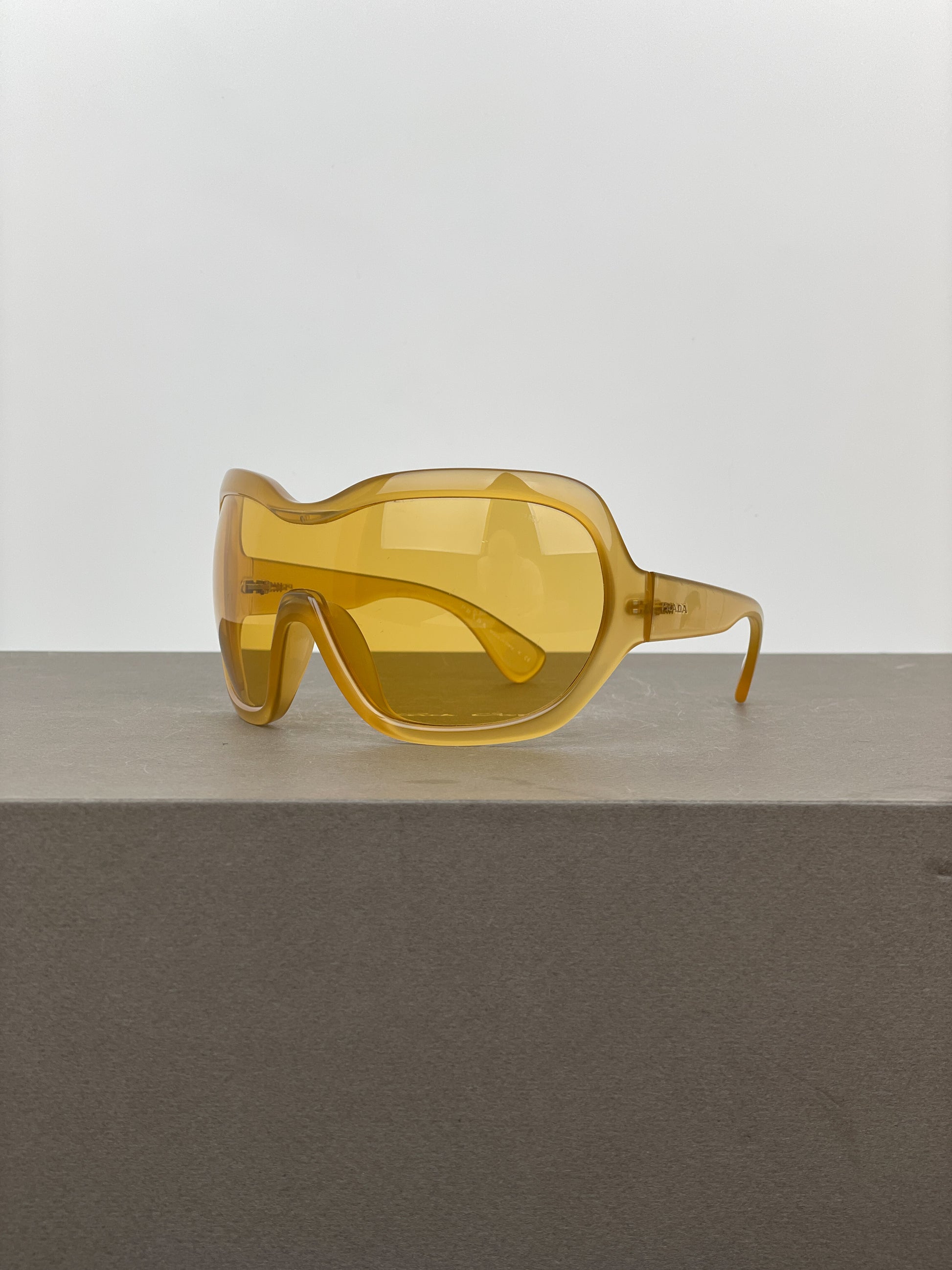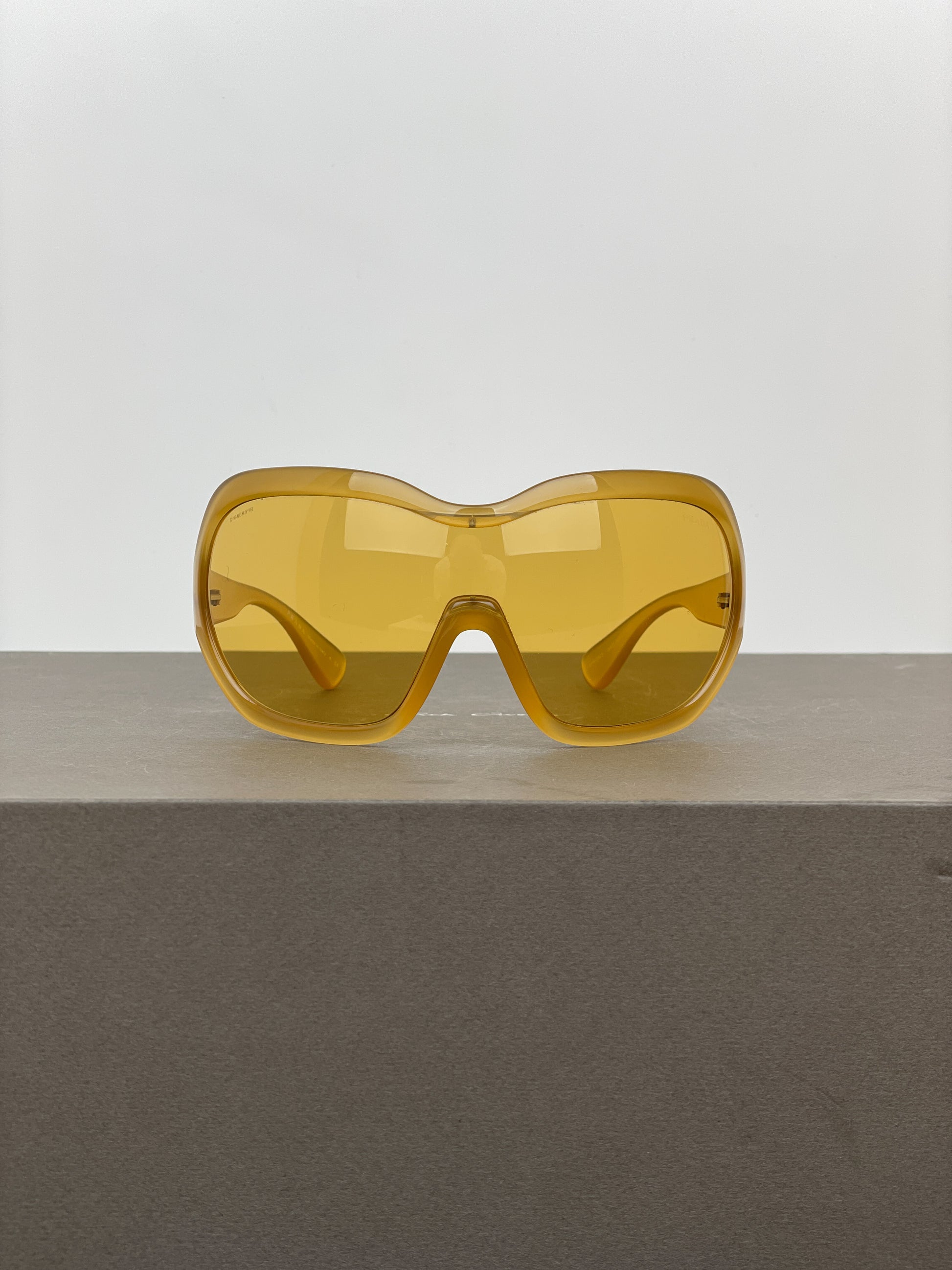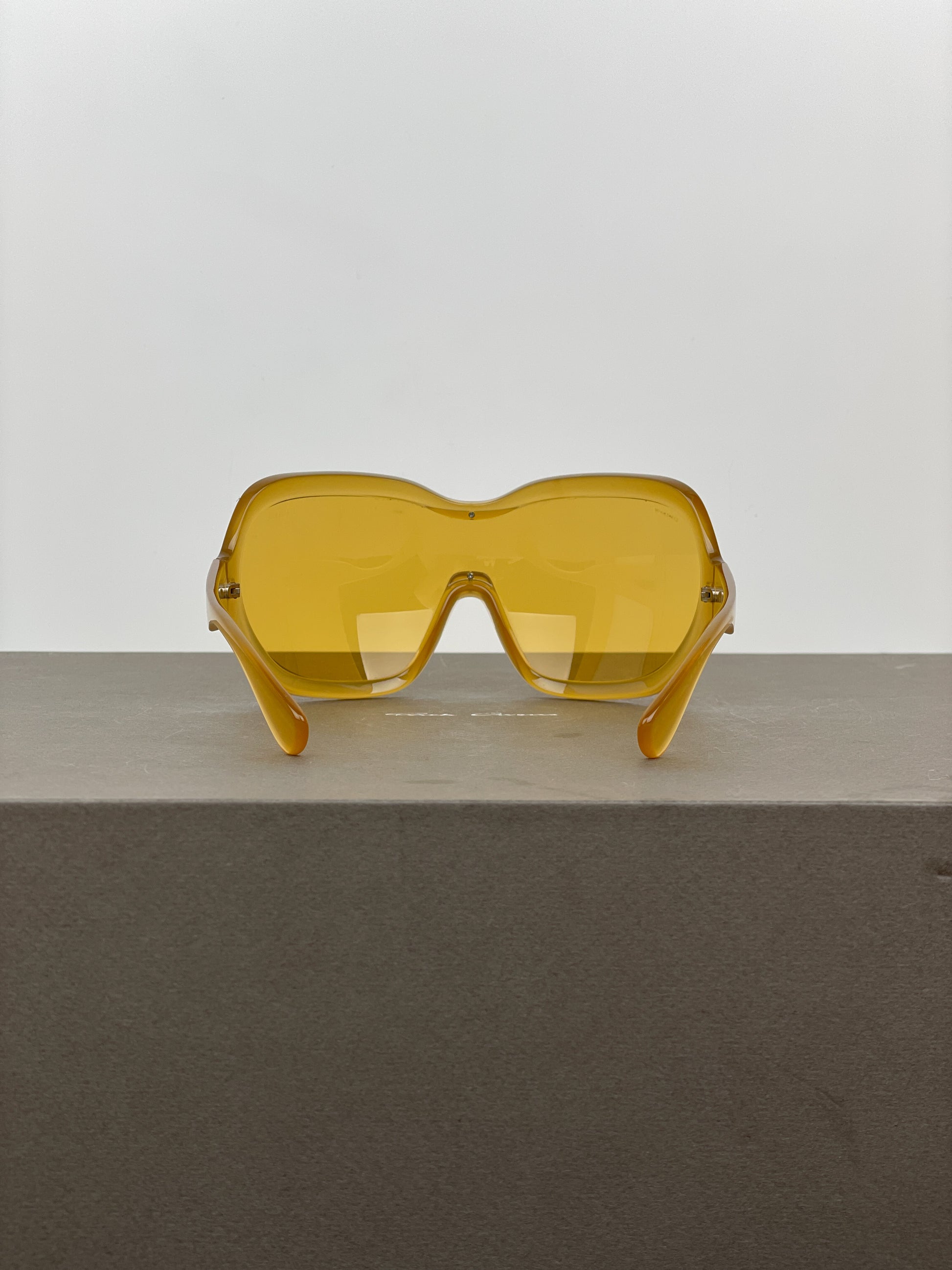 Oversized shield sunglasses with a translucent yellow frame and a wrapped unilens, reaching above the brow-level, from the autumn-winter 2011 collection.