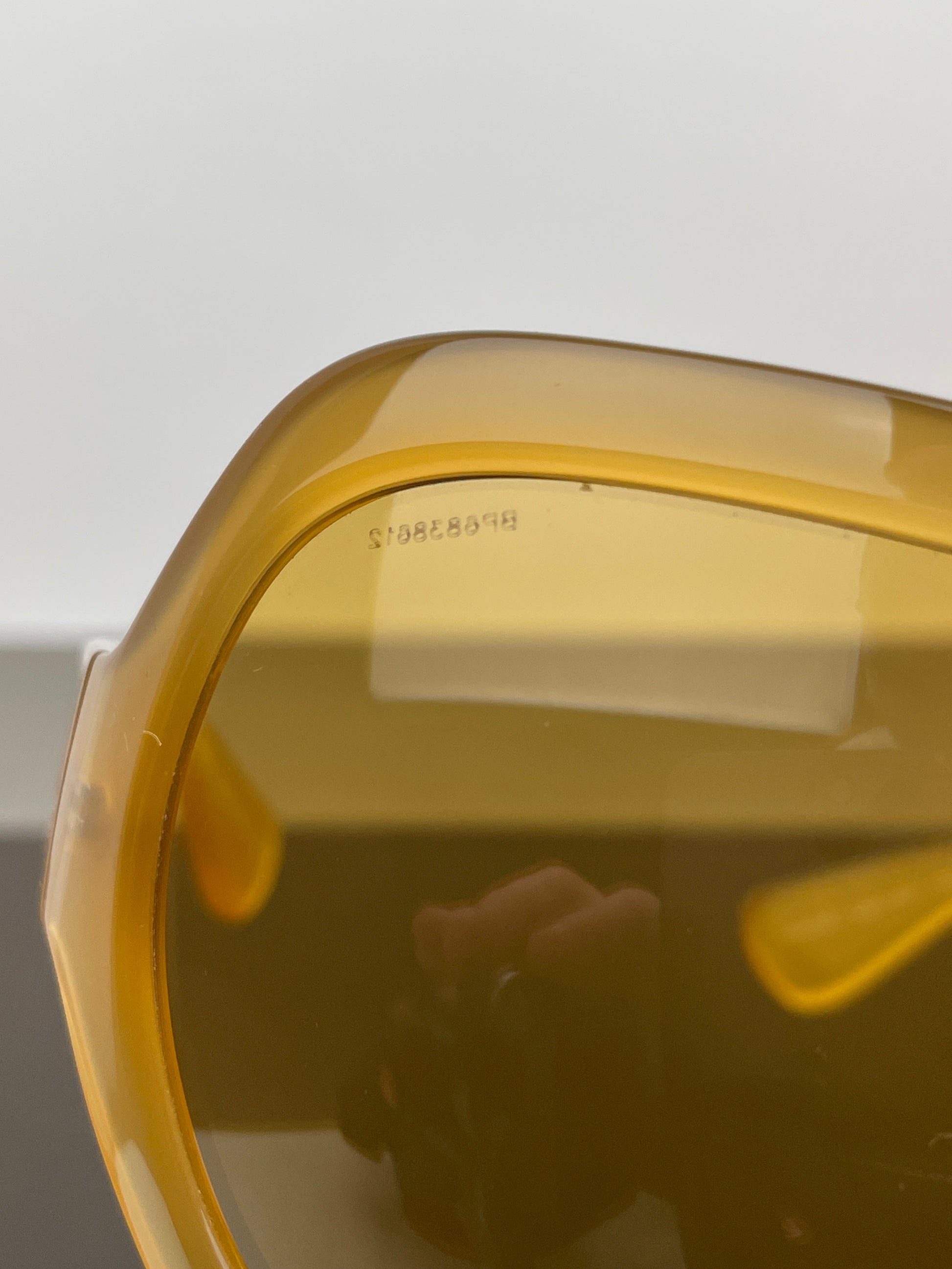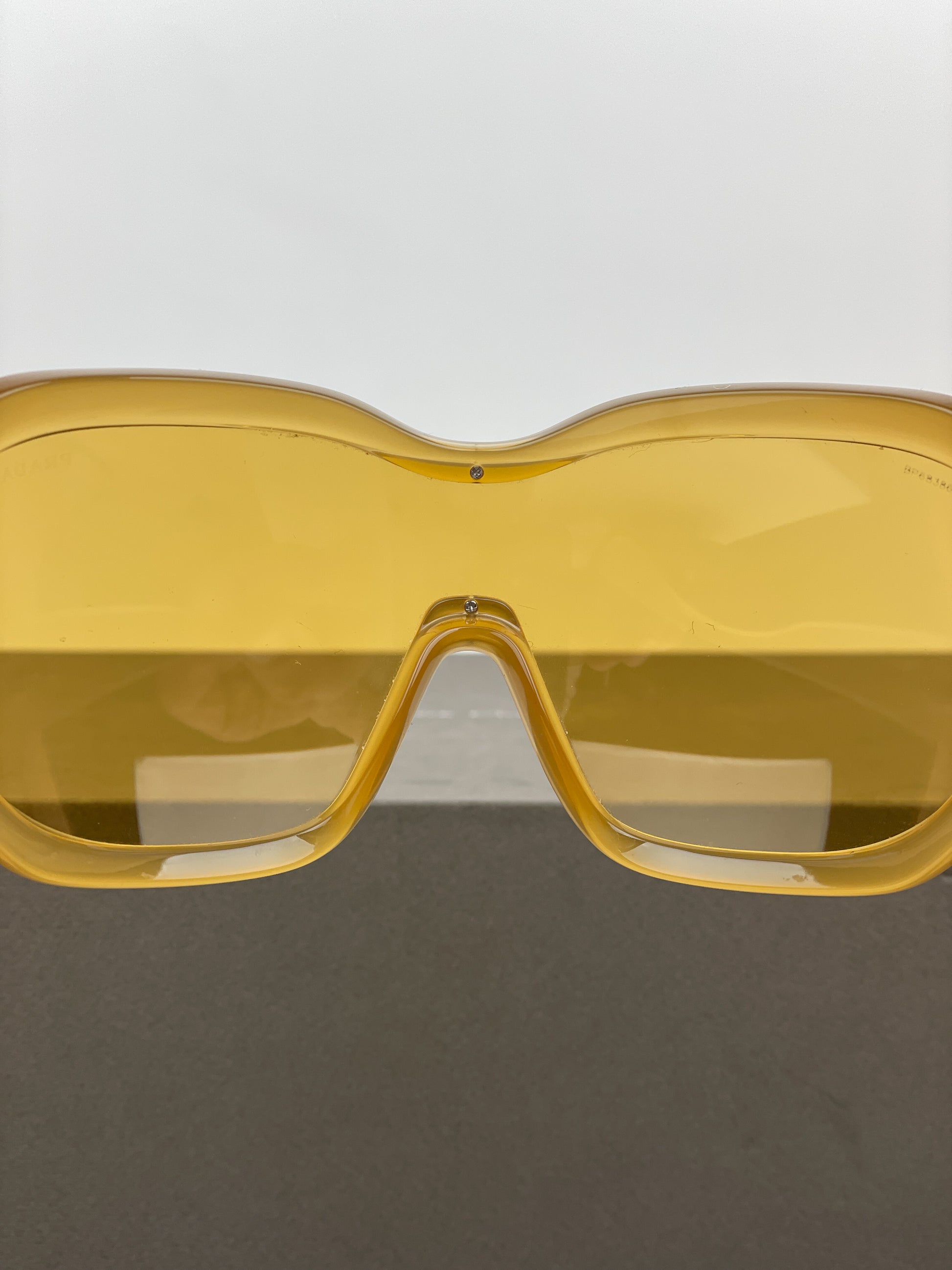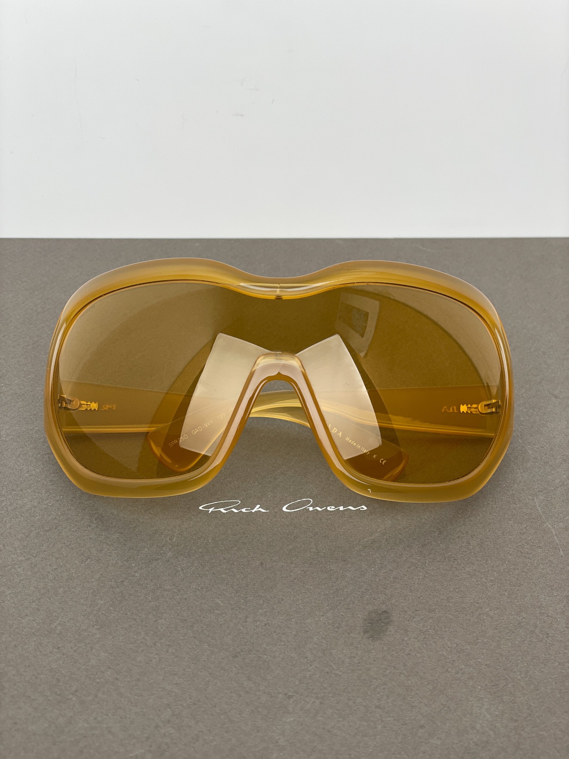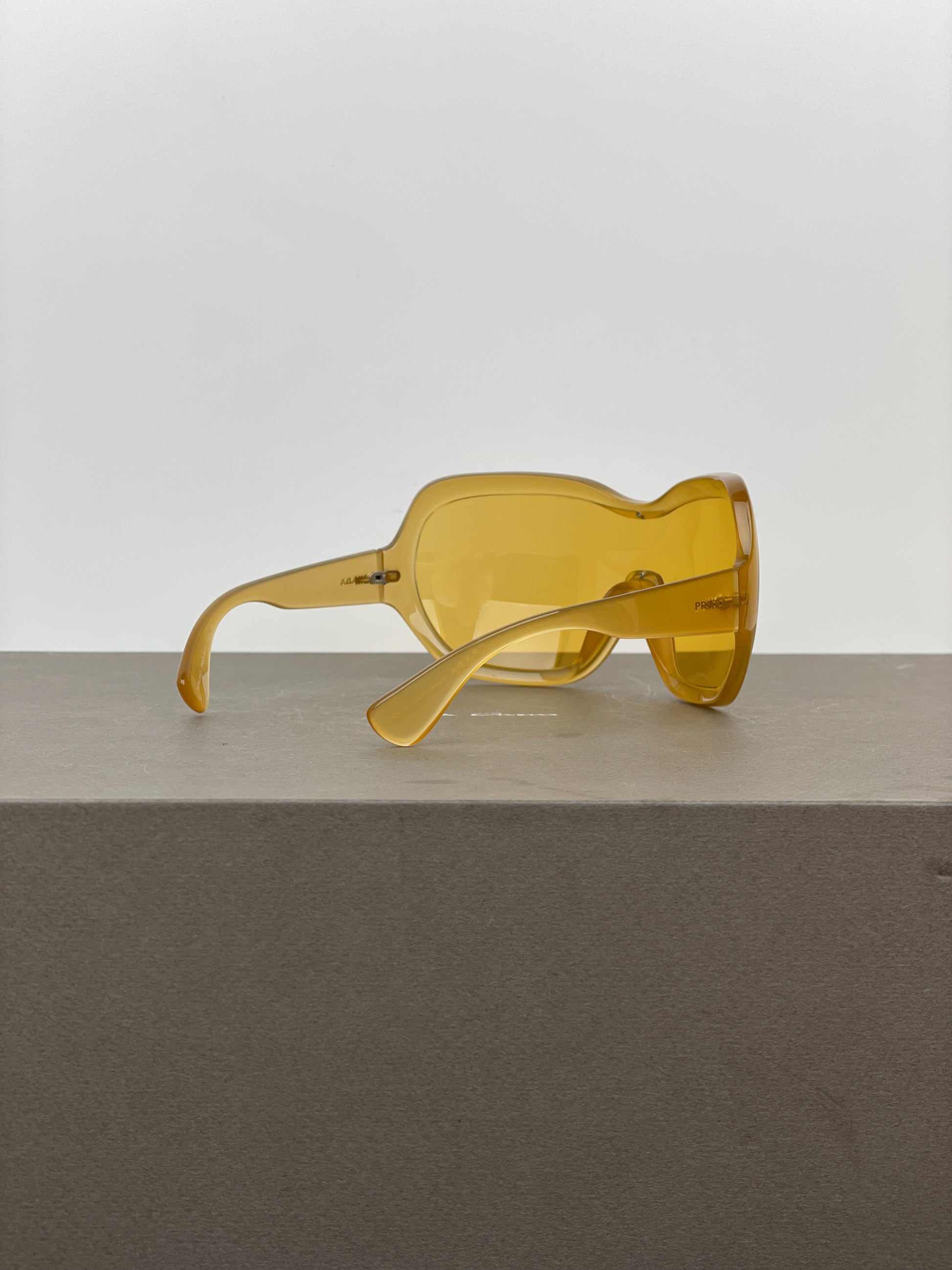 Oversized shield sunglasses with a translucent yellow frame and a wrapped unilens, reaching above the brow-level, from the autumn-winter 2011 collection.