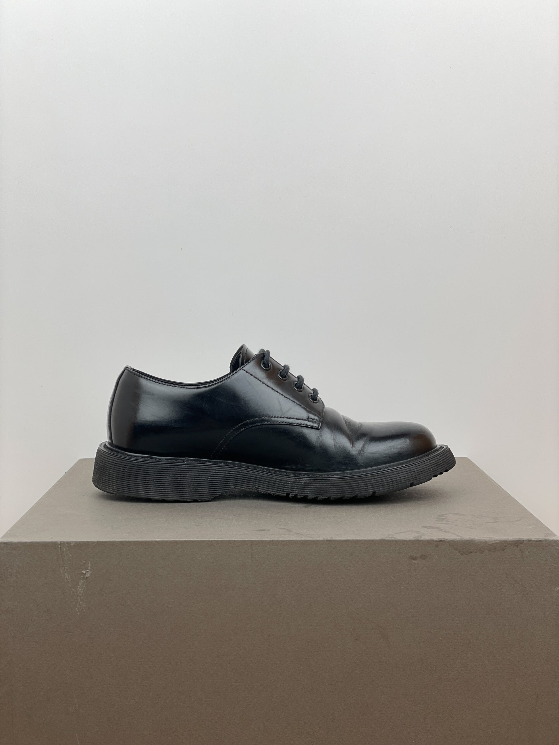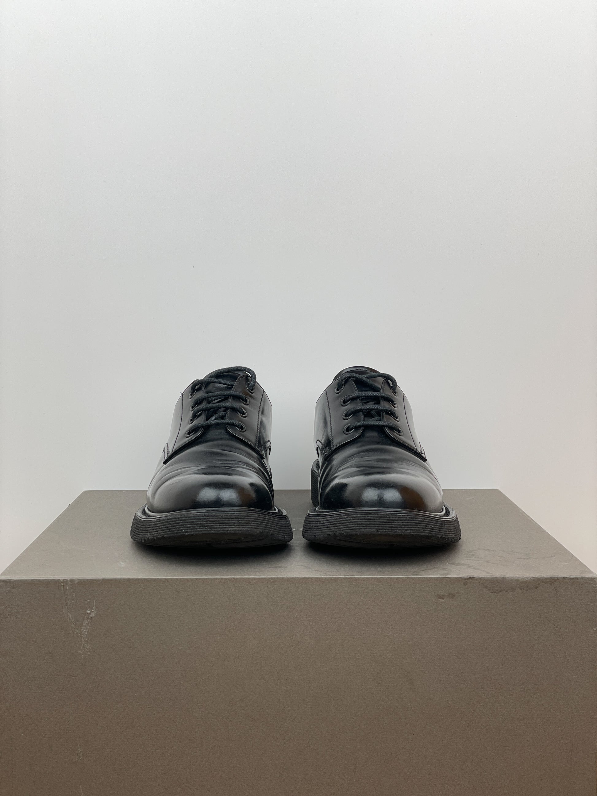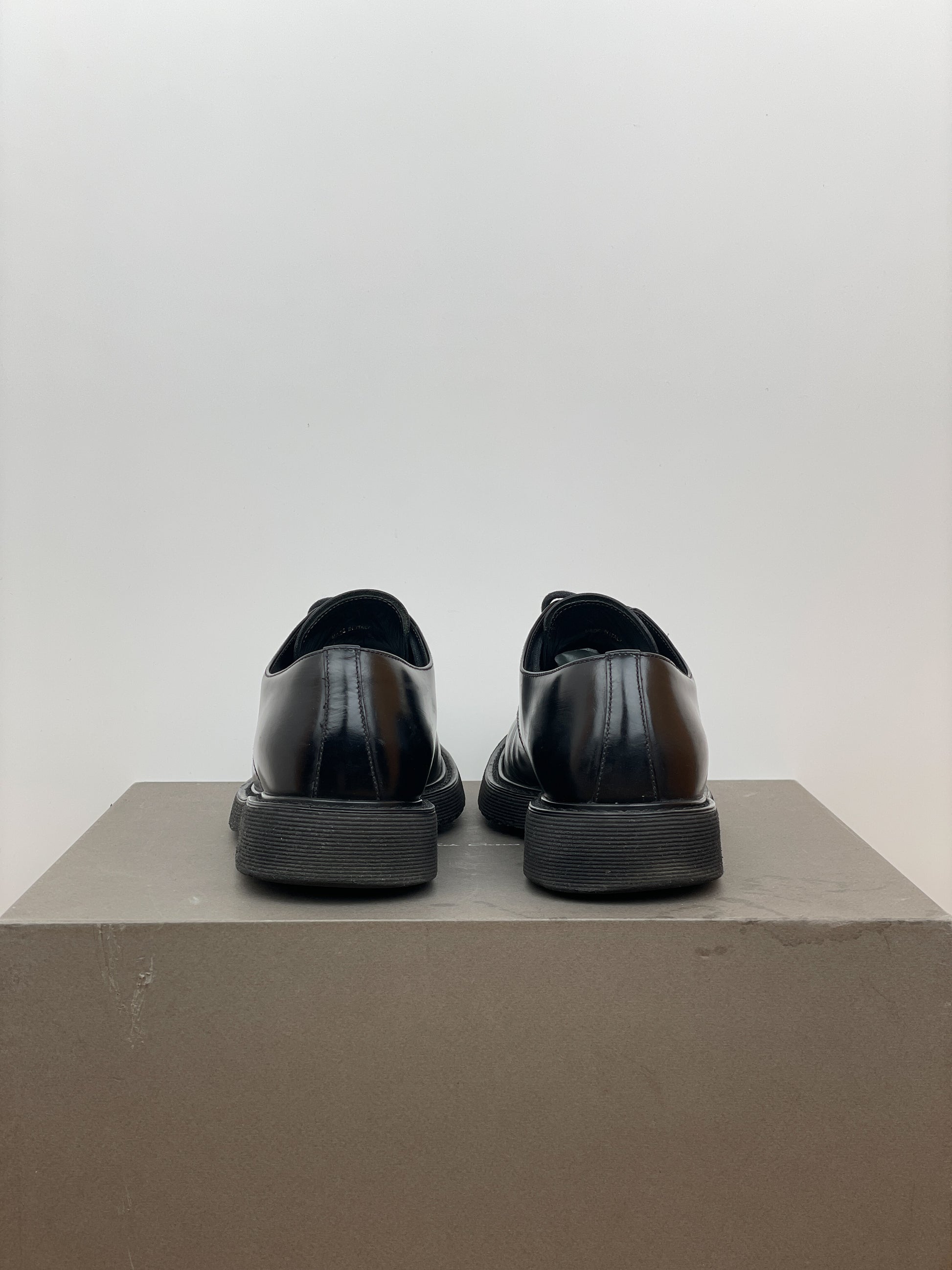 Black leather derby shoes with black metal eyelets and a chunky rubber sole, from the autumn-winter 2021 collection.